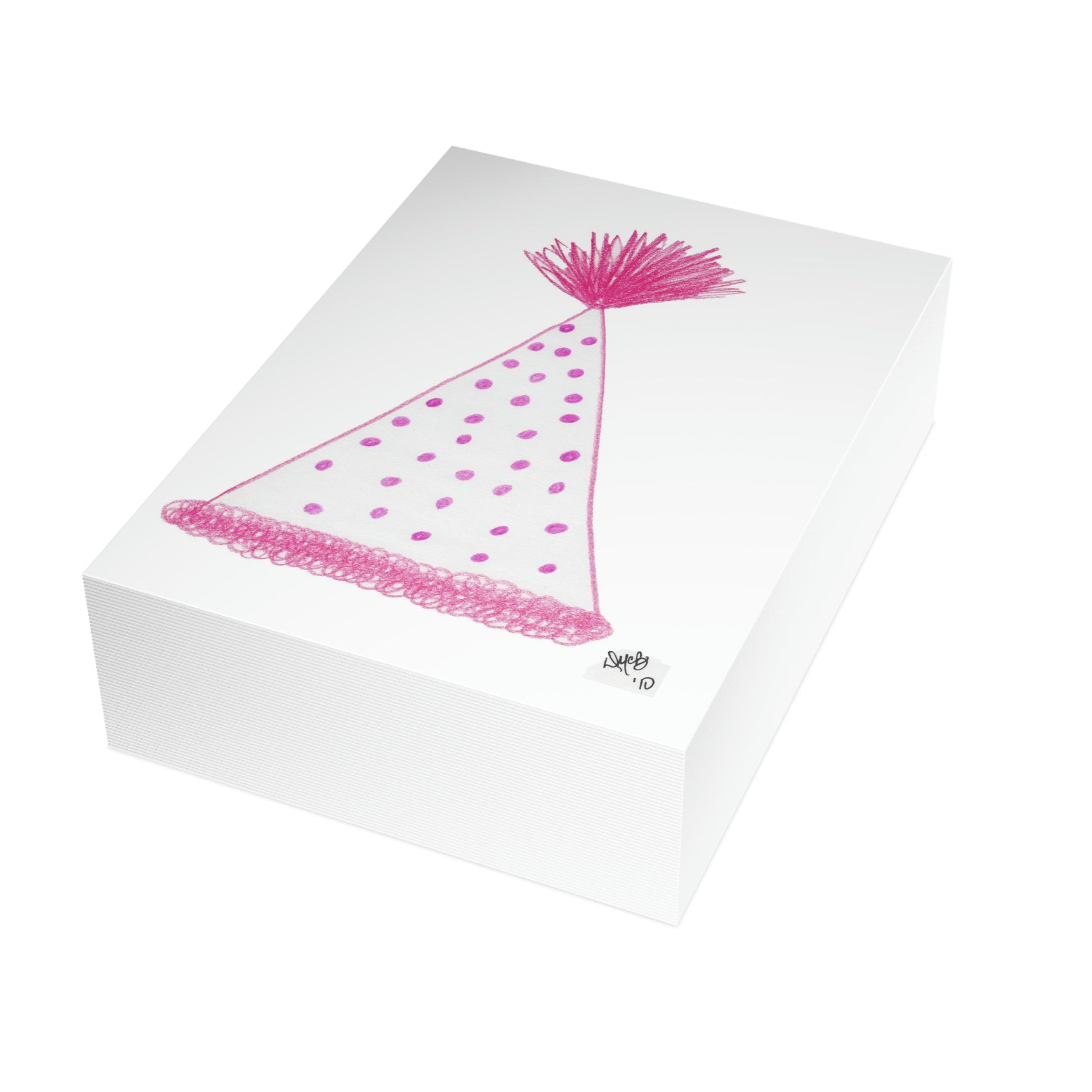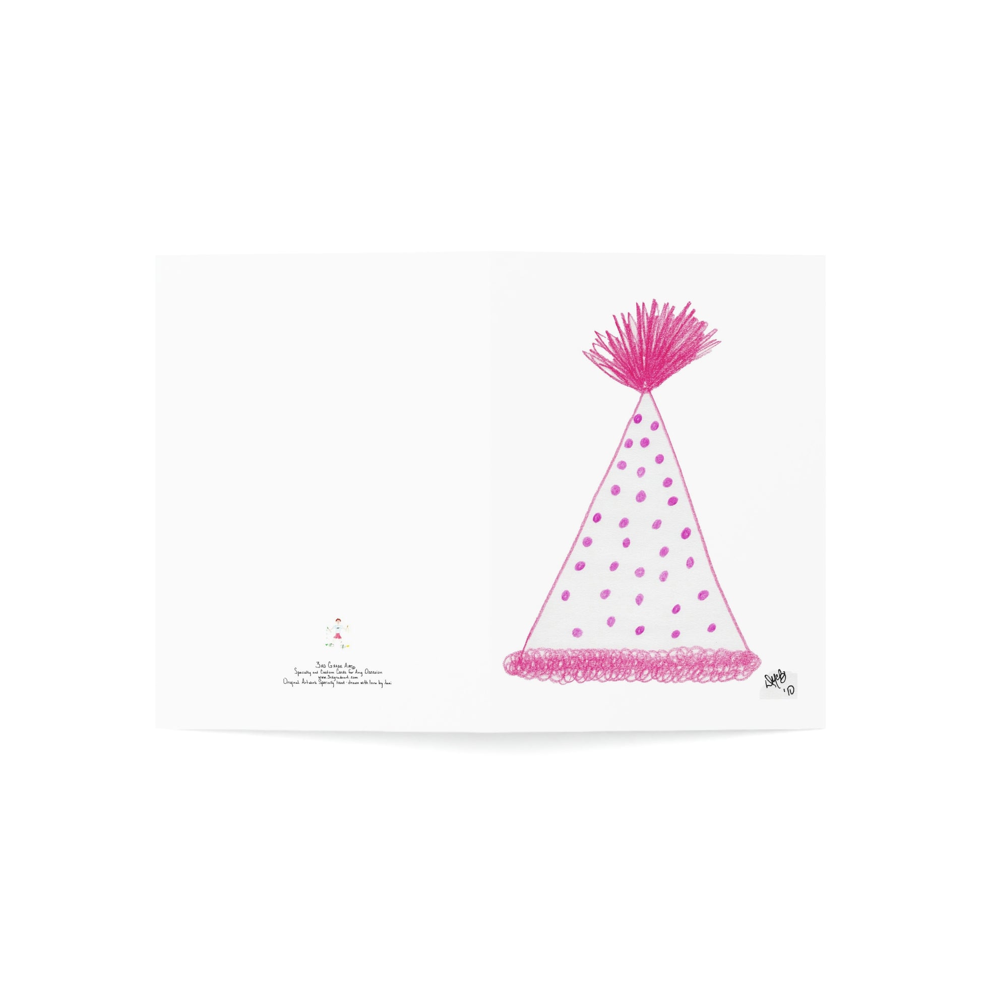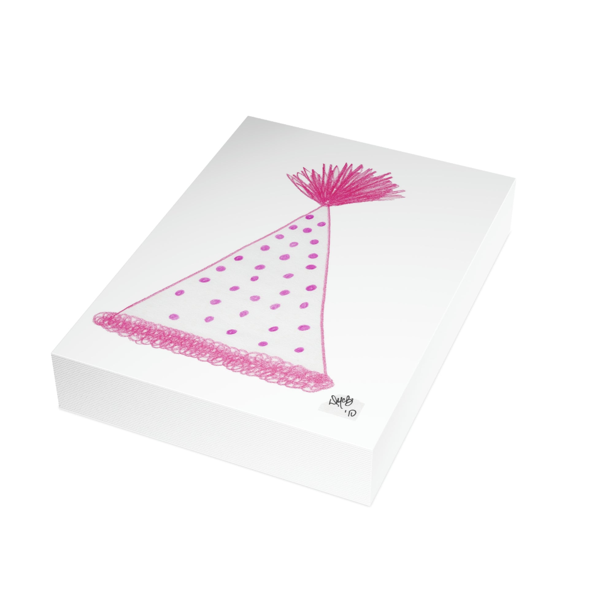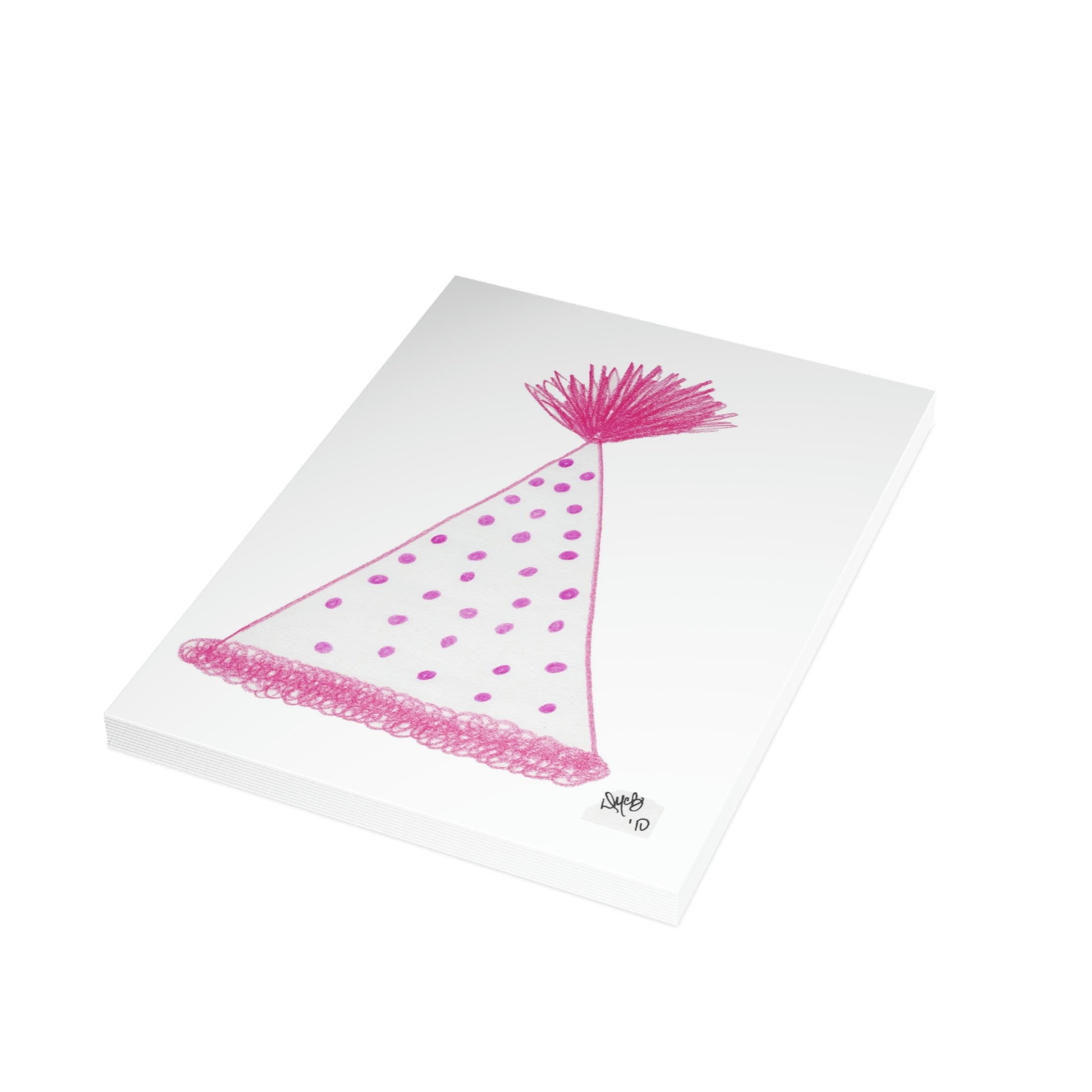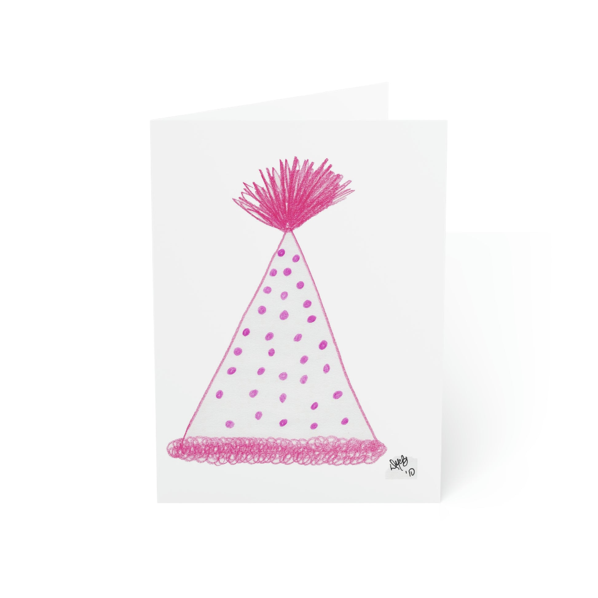 5x7 portrait greeting card – Happy Birthday - A pink polka dot conical birthday hat with fringe and a pom-pom. A simple drawing to go with a simple sentiment. Sometimes just a straight "happy birthday" will cover the bill. It's also very safe - where some may be offensive to that person, or they may not "get" the gag, or you don't know them well, this one can be your go-to. Unless they hate pink. Then may want to go with something else. Original drawing is colored pencil on paper, scanned in and placed on the card.