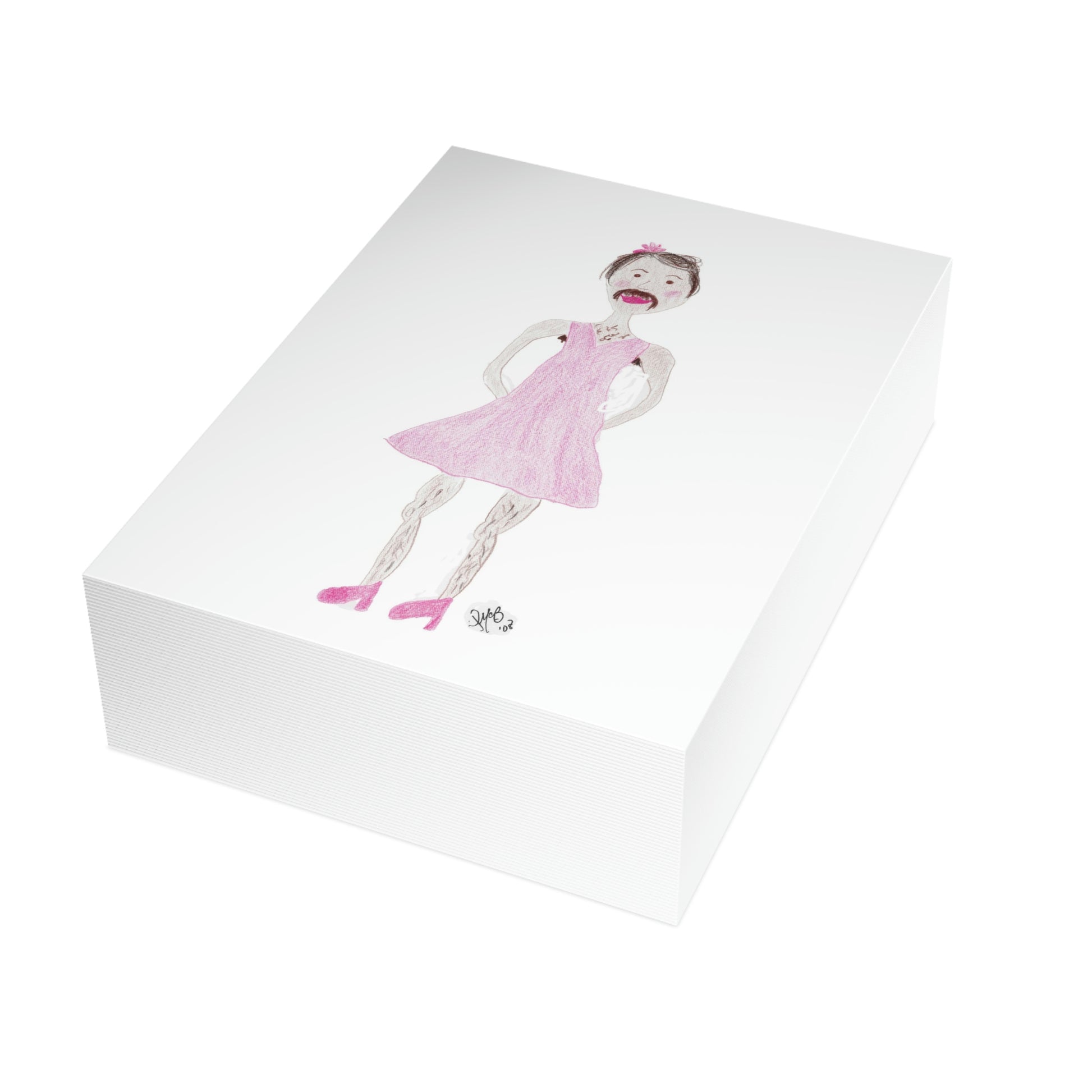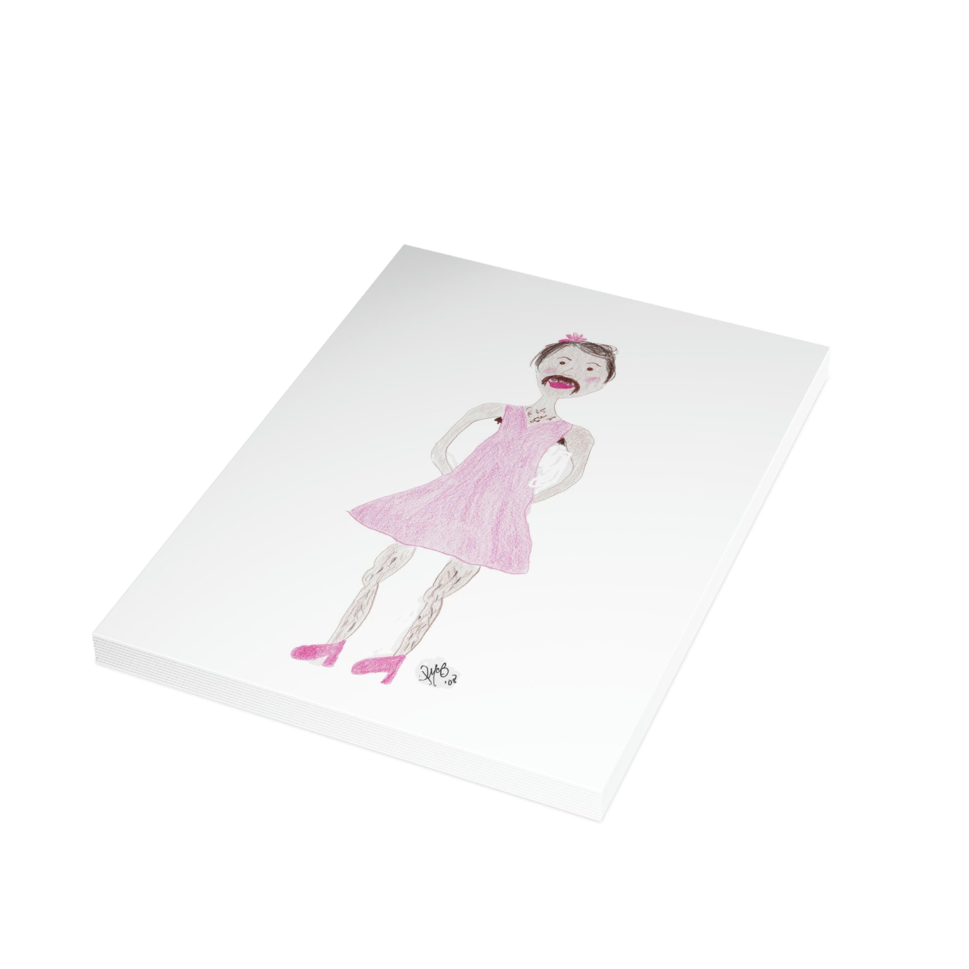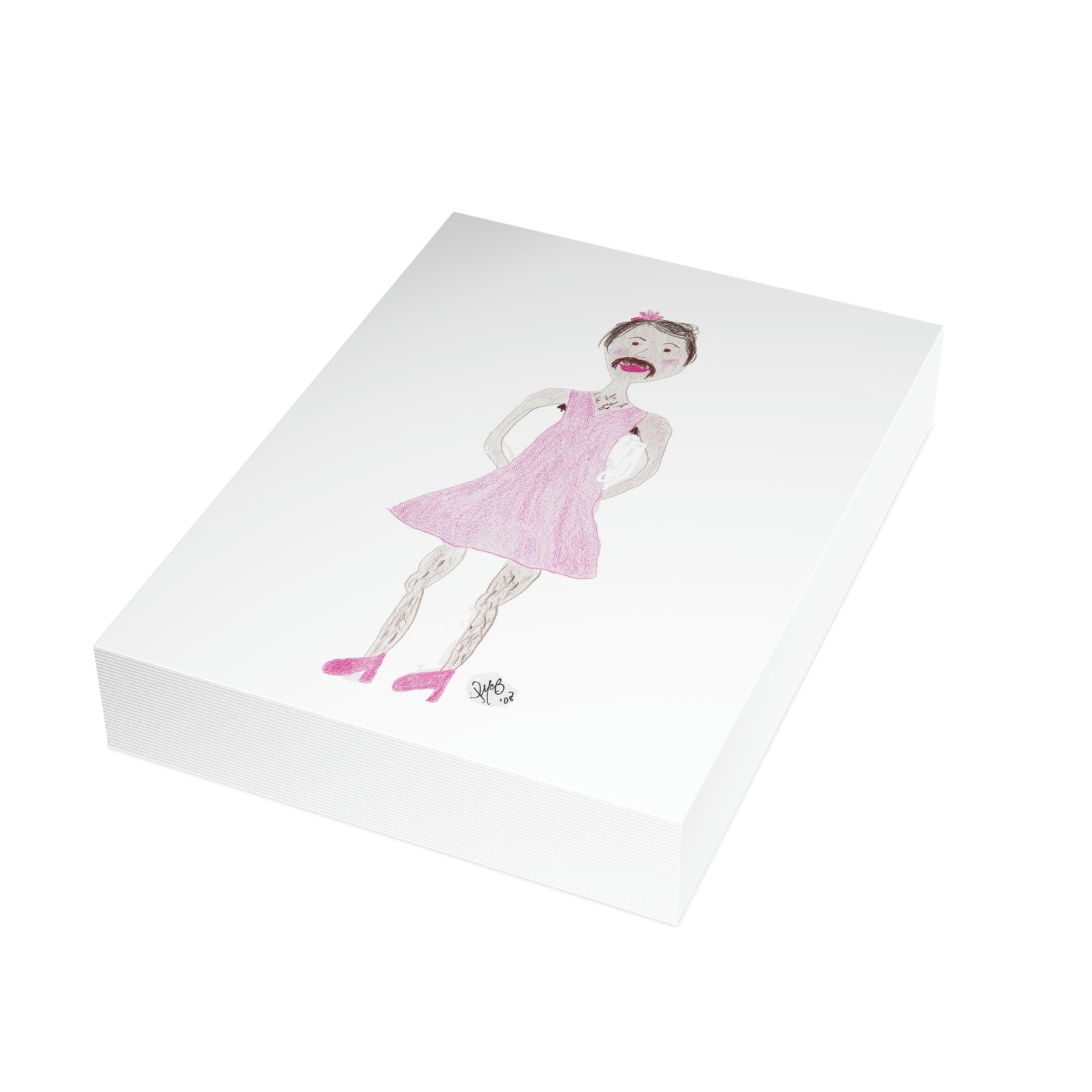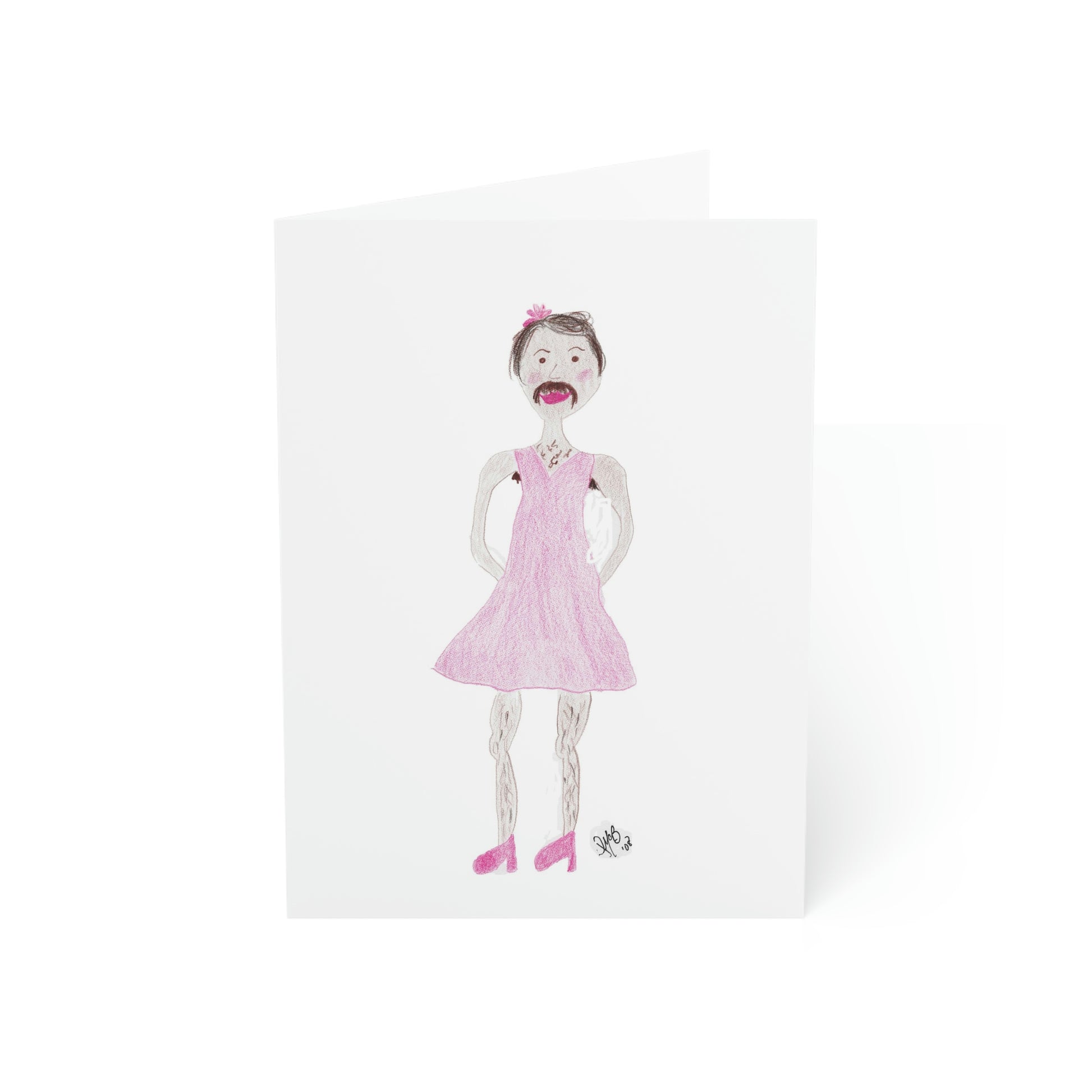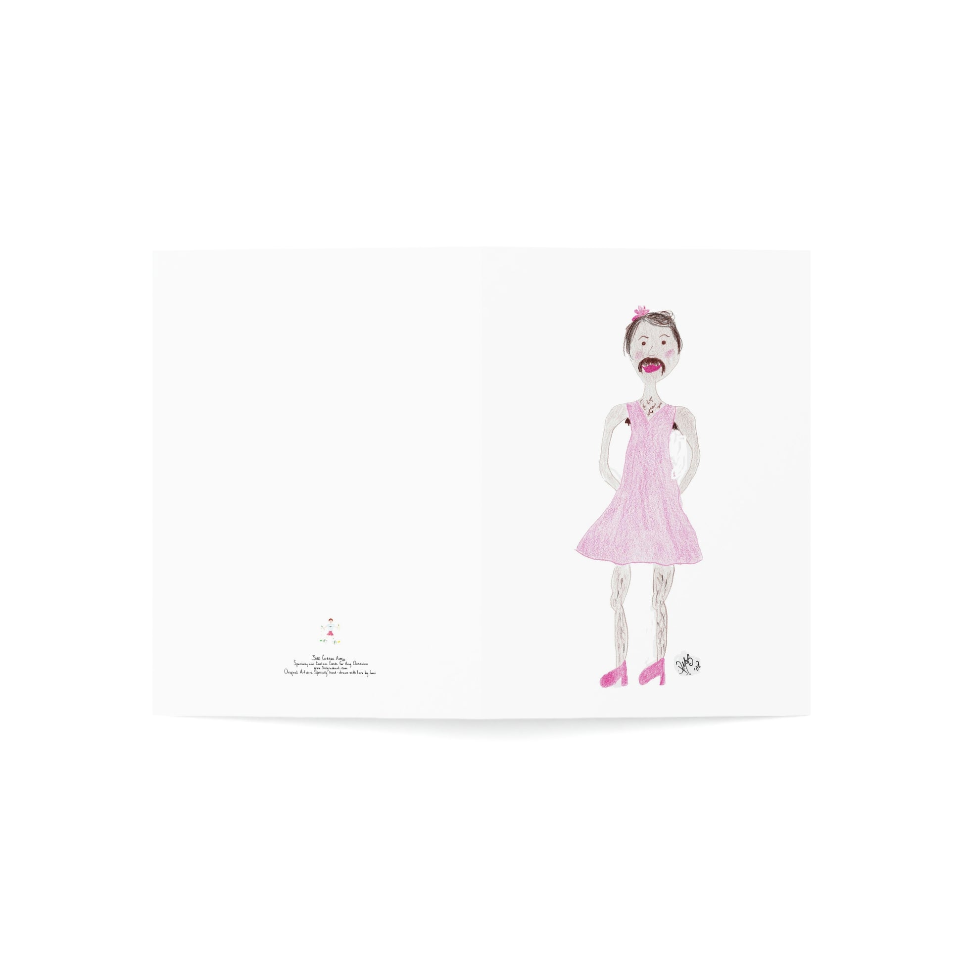 5x7 portrait greeting card – Senor Rita Says: Birthdays are a Drag - A cross-dressed gentleman complete with mustache in a pink dress is on the front. Sometimes birthdays can be a drag - send a little humor and incongruity to someone who is not easily offended and is also lamenting getting a little older. Original drawing is colored pencil on paper, scanned in and placed on the card.