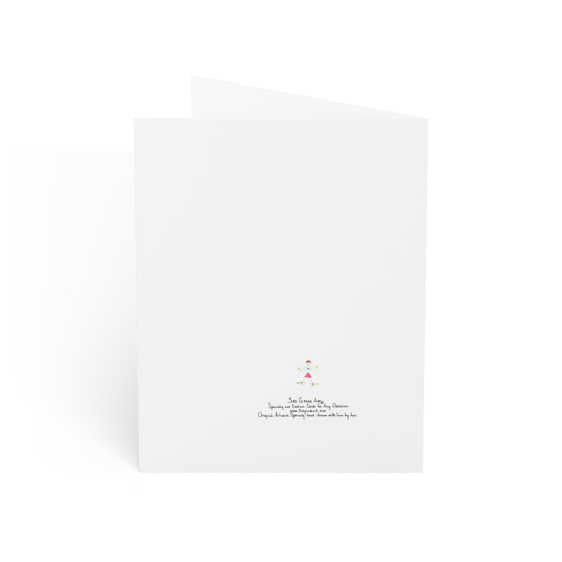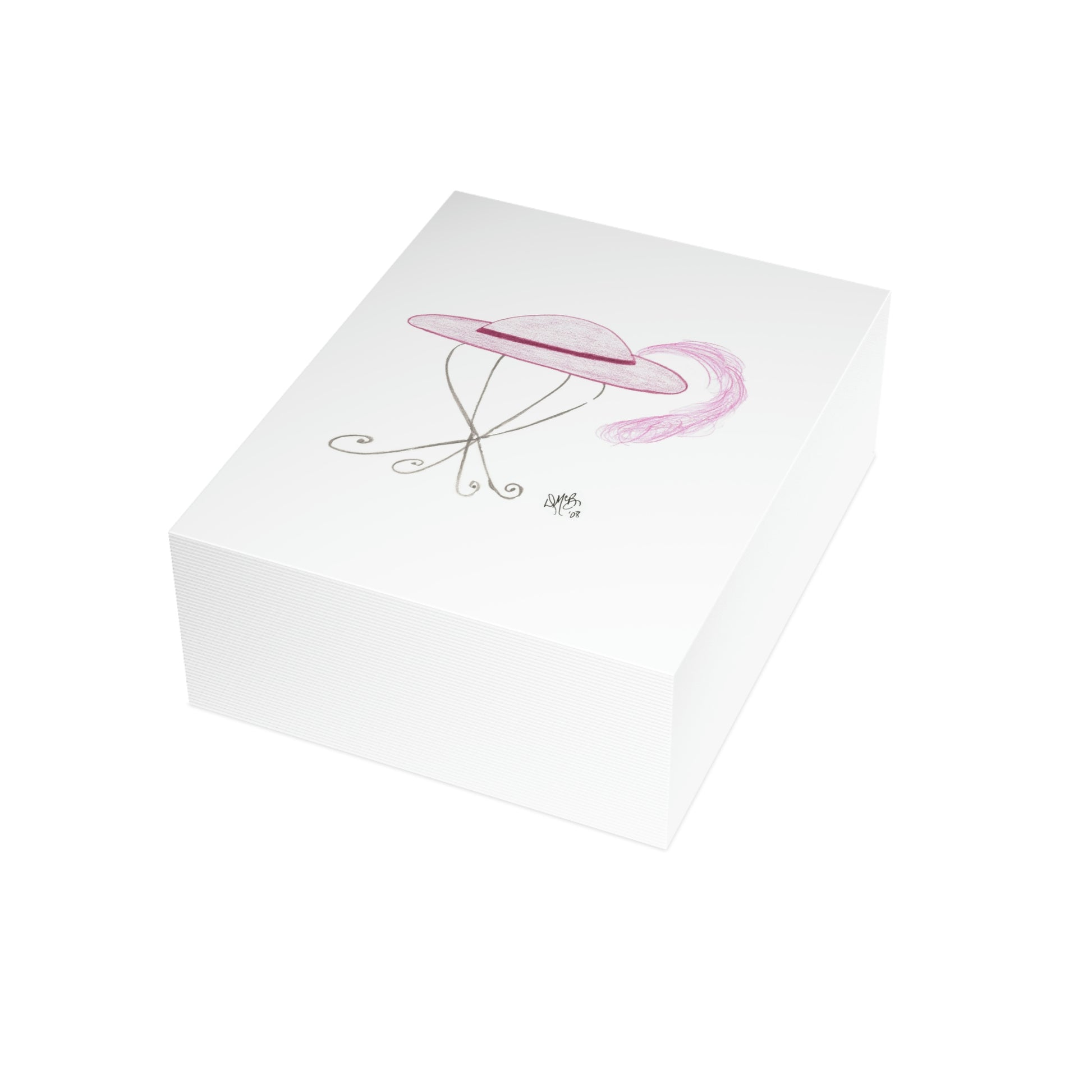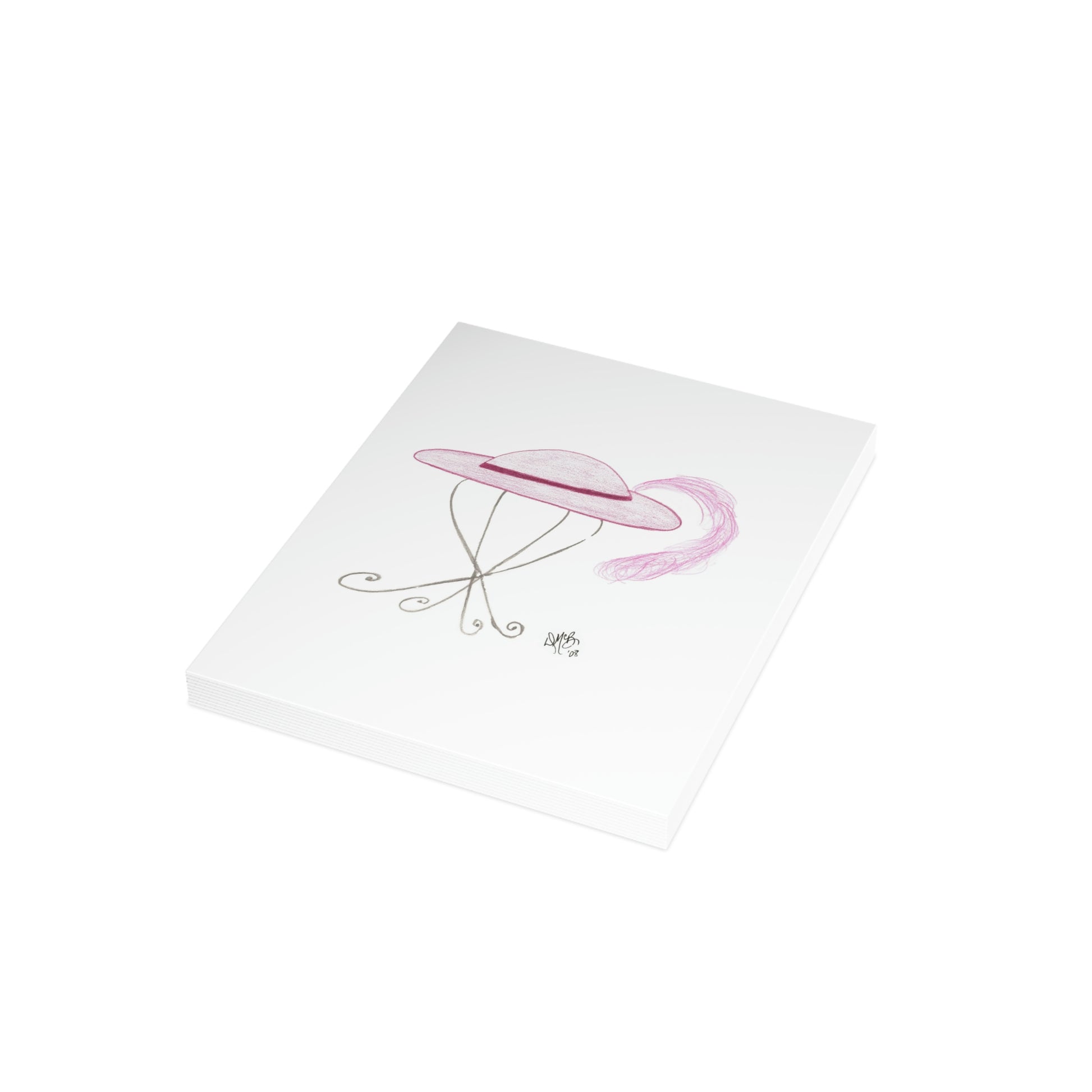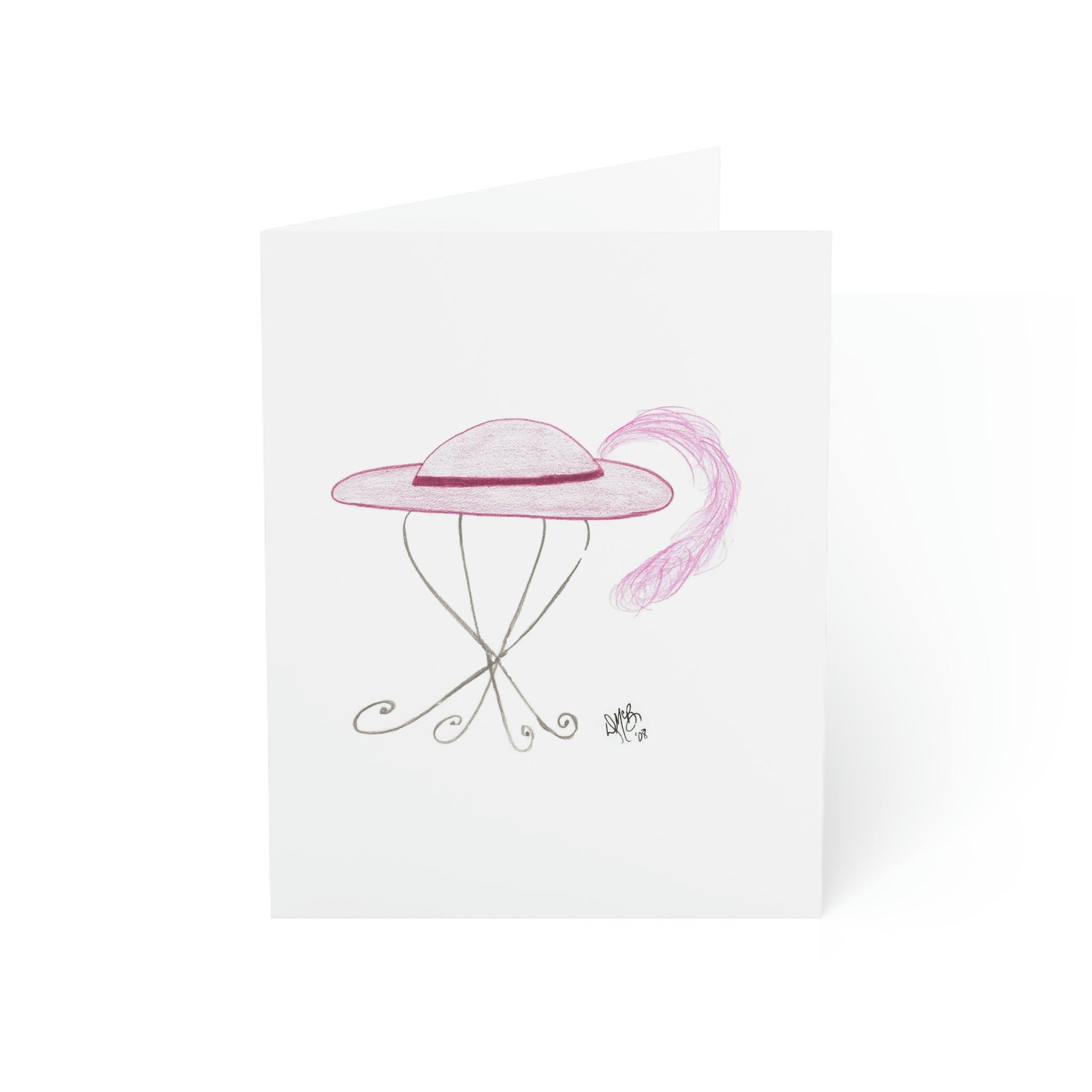 5"x7" portrait greeting card – Blank Notecard featuring a magenta hat with a feather on a hat stand. This is part of my blank "hat" series - just the drawing - your sentiments/personal notes can be added to the inside. Original drawing is colored pencil on paper, scanned in and placed on the card.