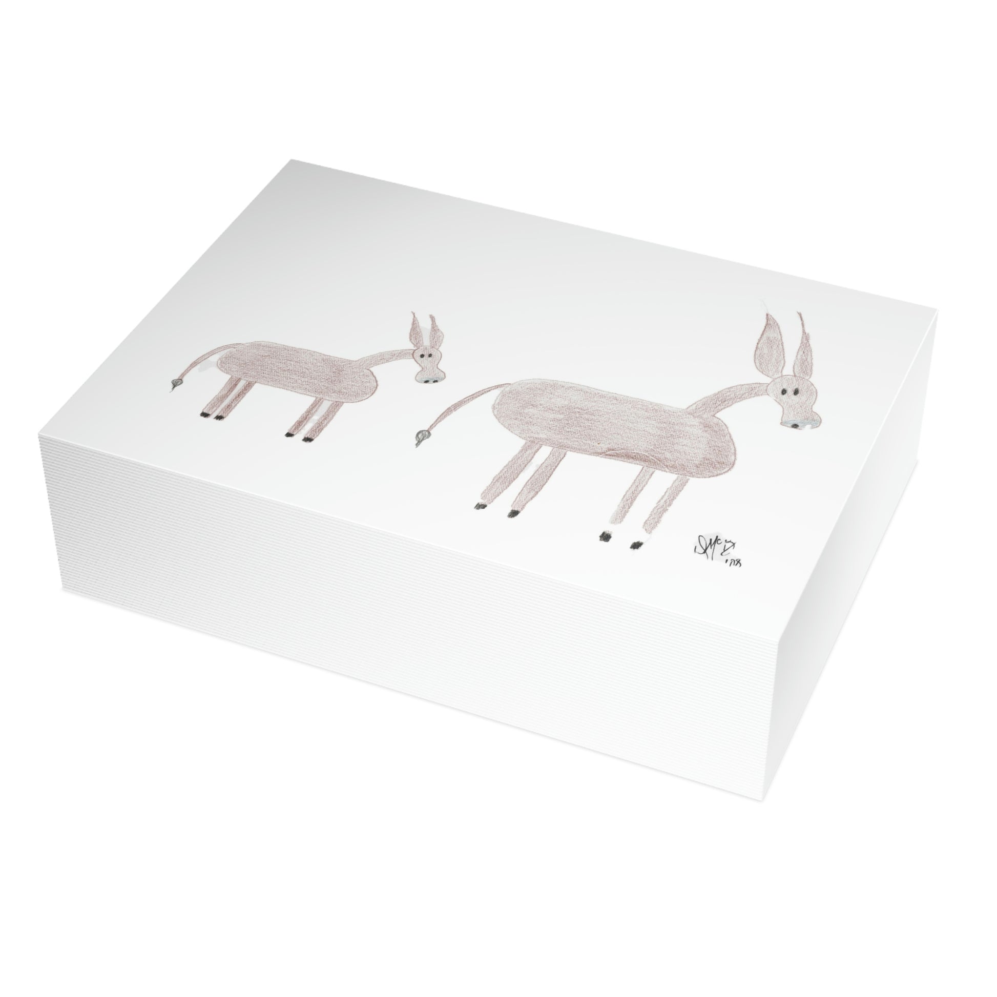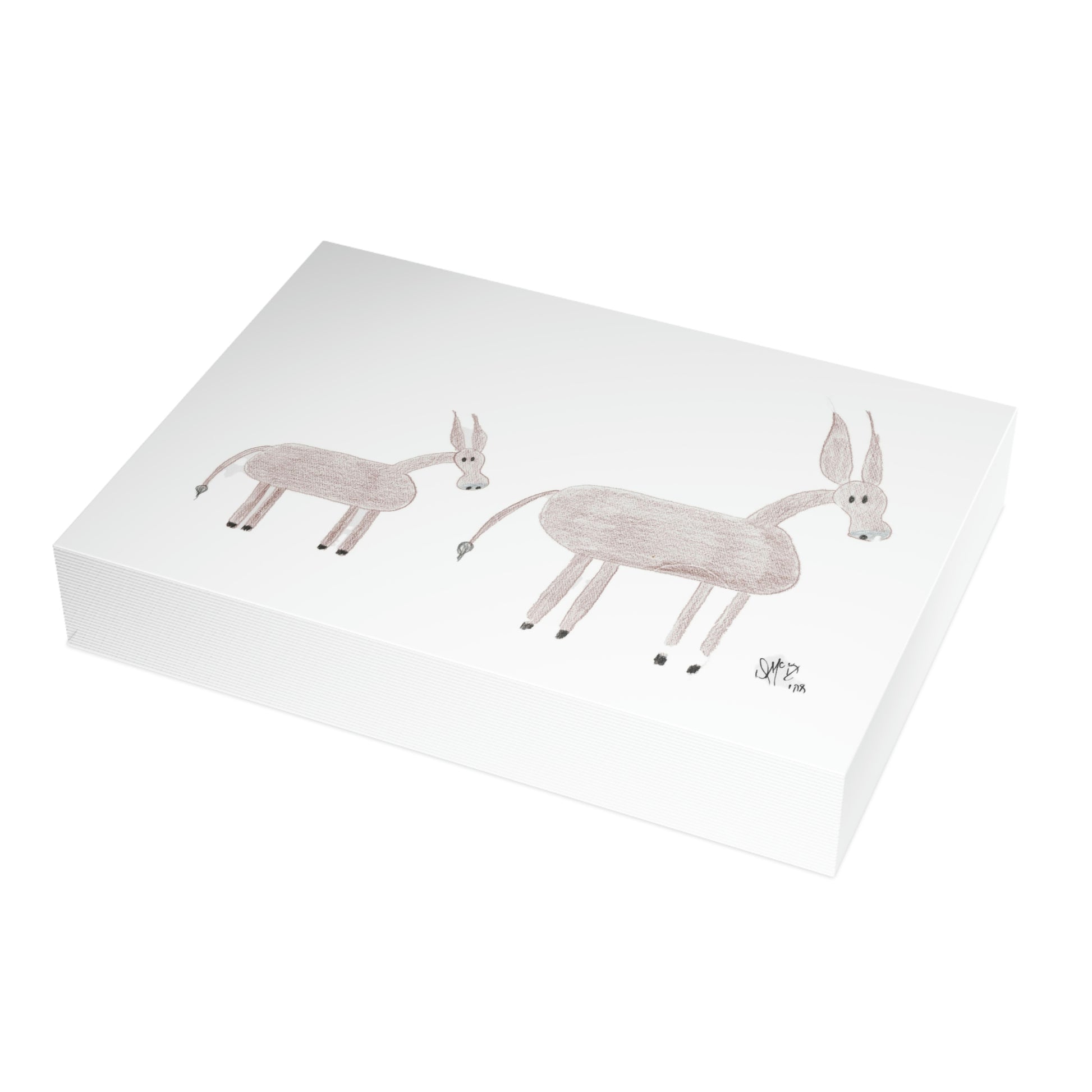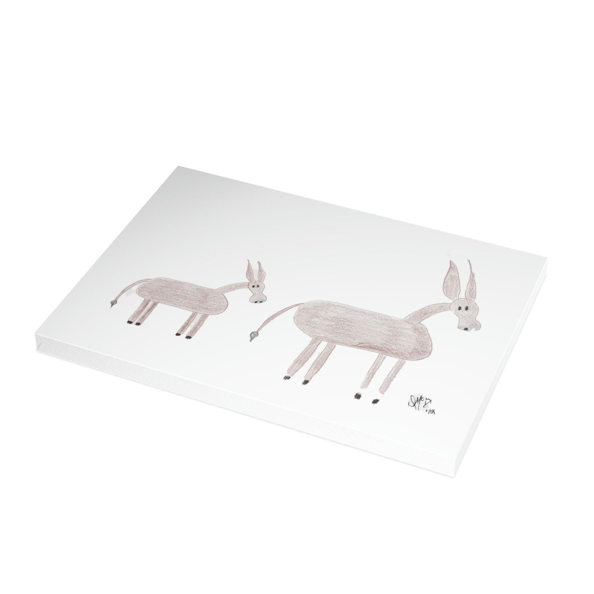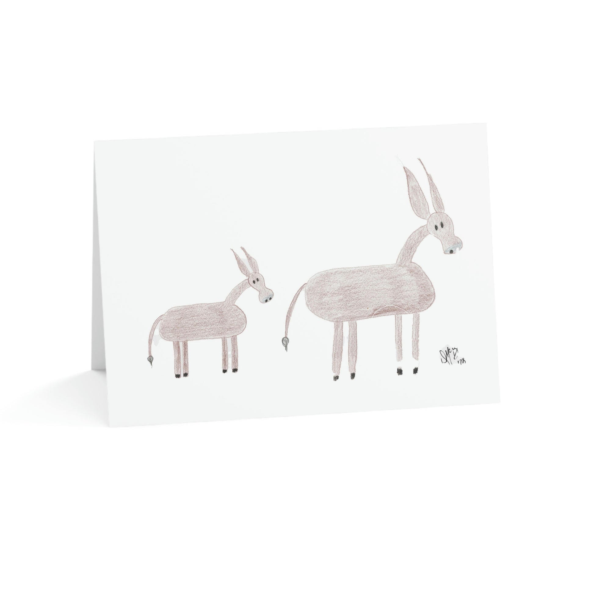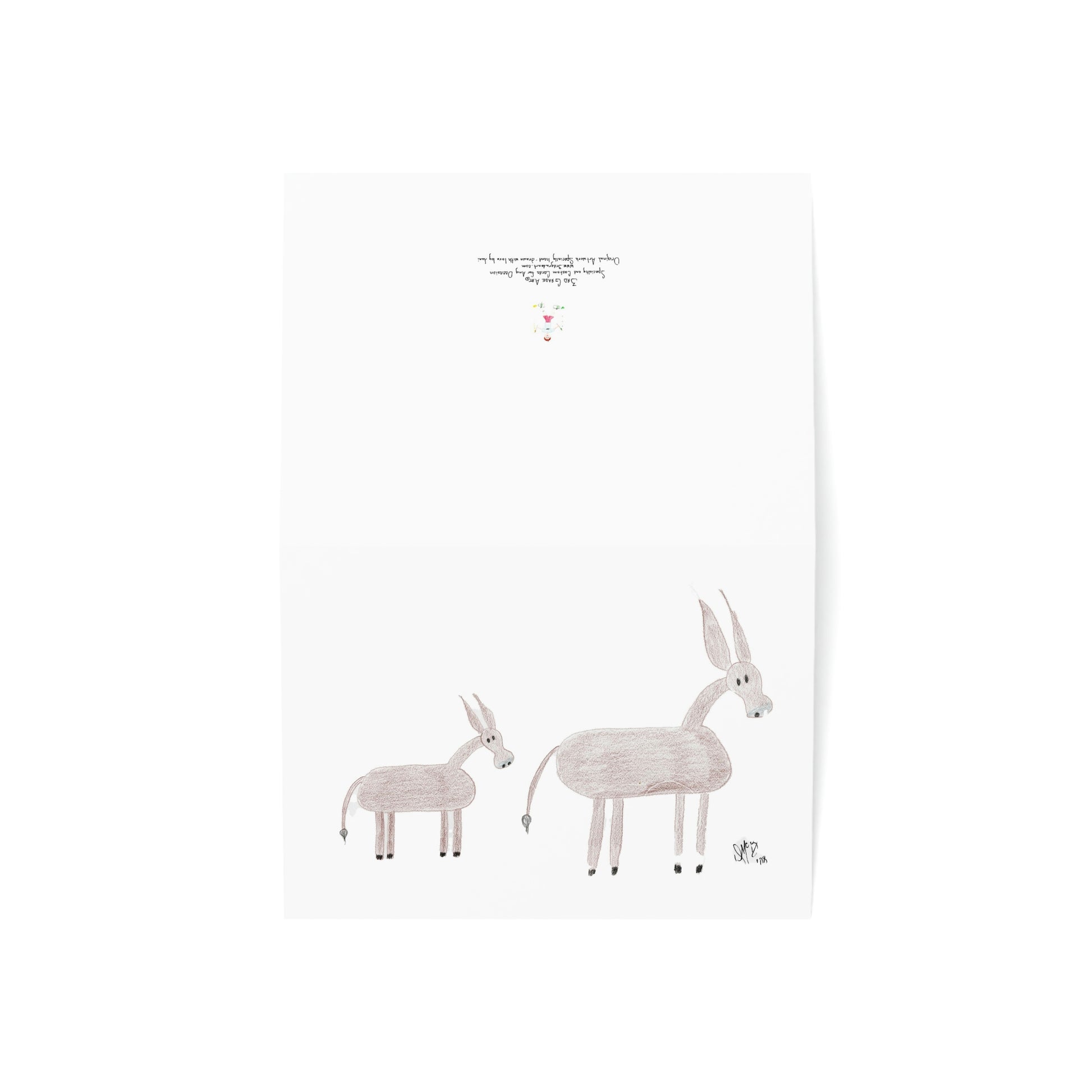 5x7 landscape greeting card – Don't You Hate it When Your Ass Gets Bigger After the Holidays? - A small donkey turns into a larger donkey - the ass gets bigger. I hate when that happens! I know most people do. They prefer a smaller, cuter donkey. For some reason the holidays seem to be the catalyst for this growth spurt. Original drawing is colored pencil on paper, scanned in and placed on the card.
