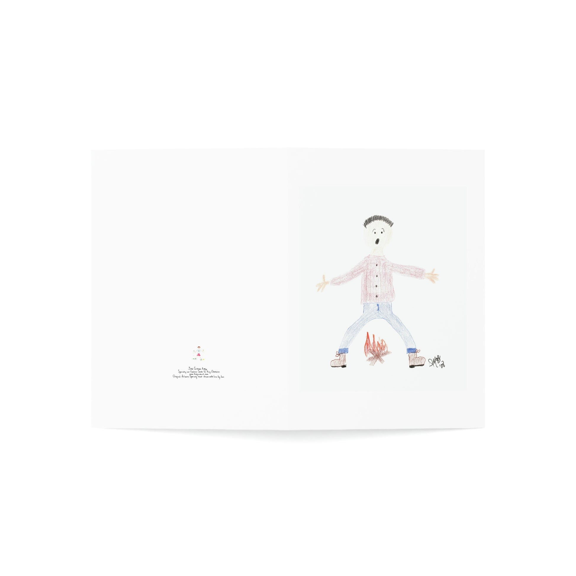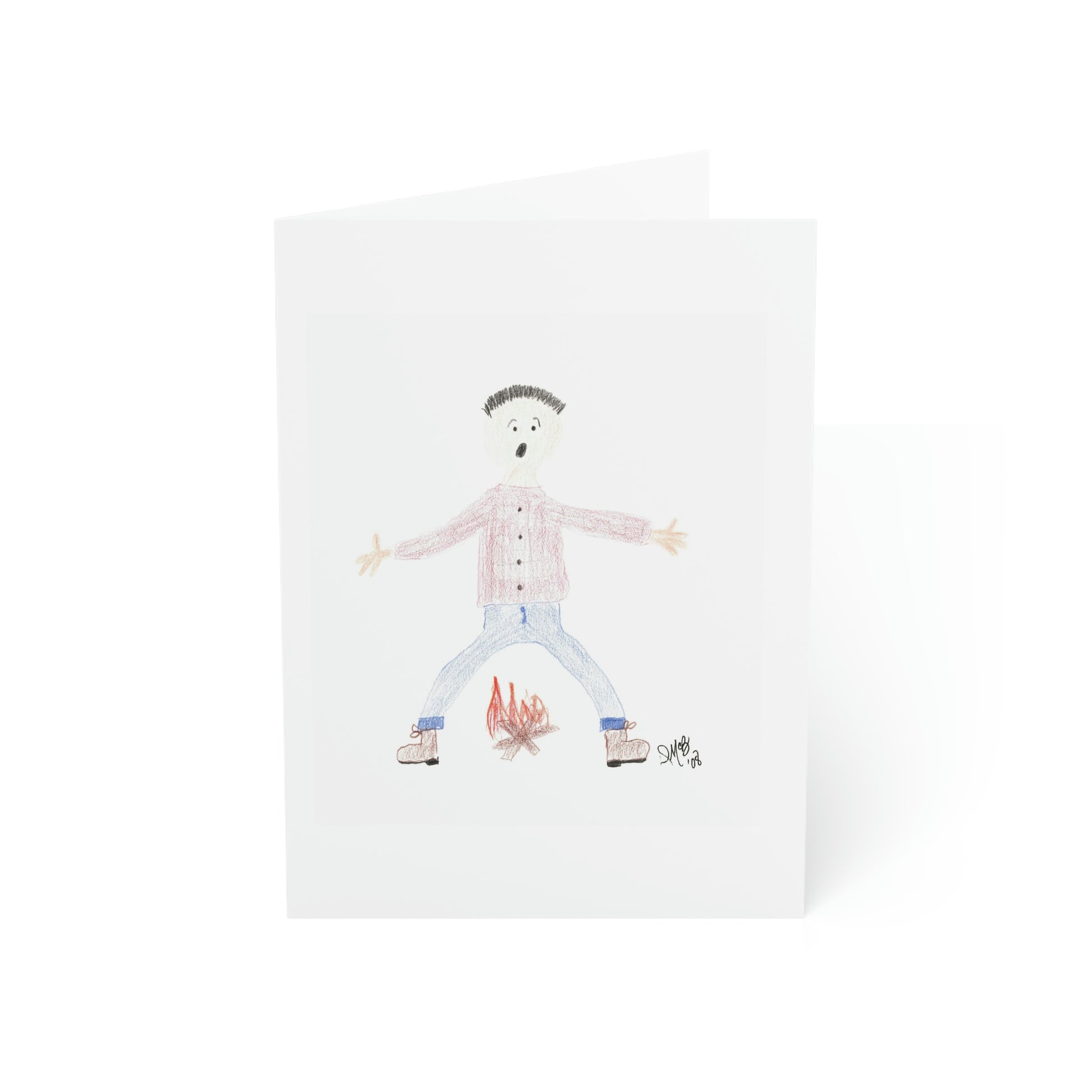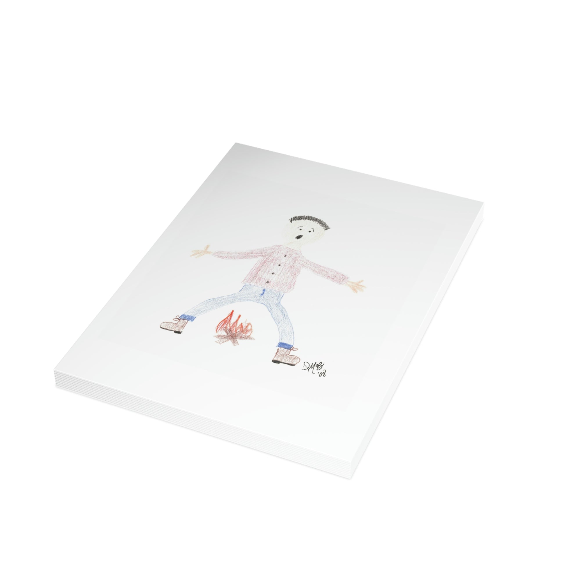 5x7 portrait greeting card – Chet's Nuts Roasting on an Open Fire - Poor Chet decided to try "Jack be Nimble, Jack be Quick" with a campfire. Bad idea. Camping and alcohol occasionally lead to unsafe shenanigans. It's all fun and games until someone's sack catches fire. Hope he has lots of ice in his cooler! Original drawing is colored pencil on paper, scanned in and placed on the card.