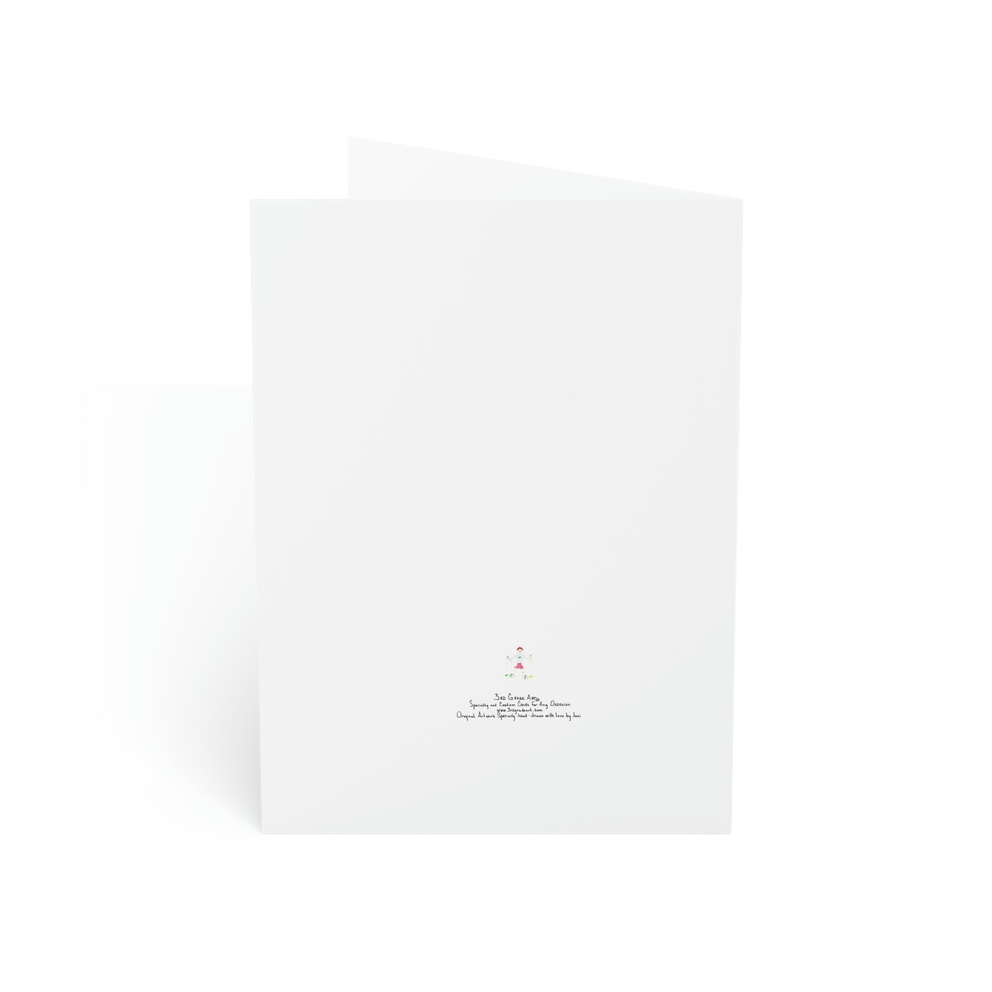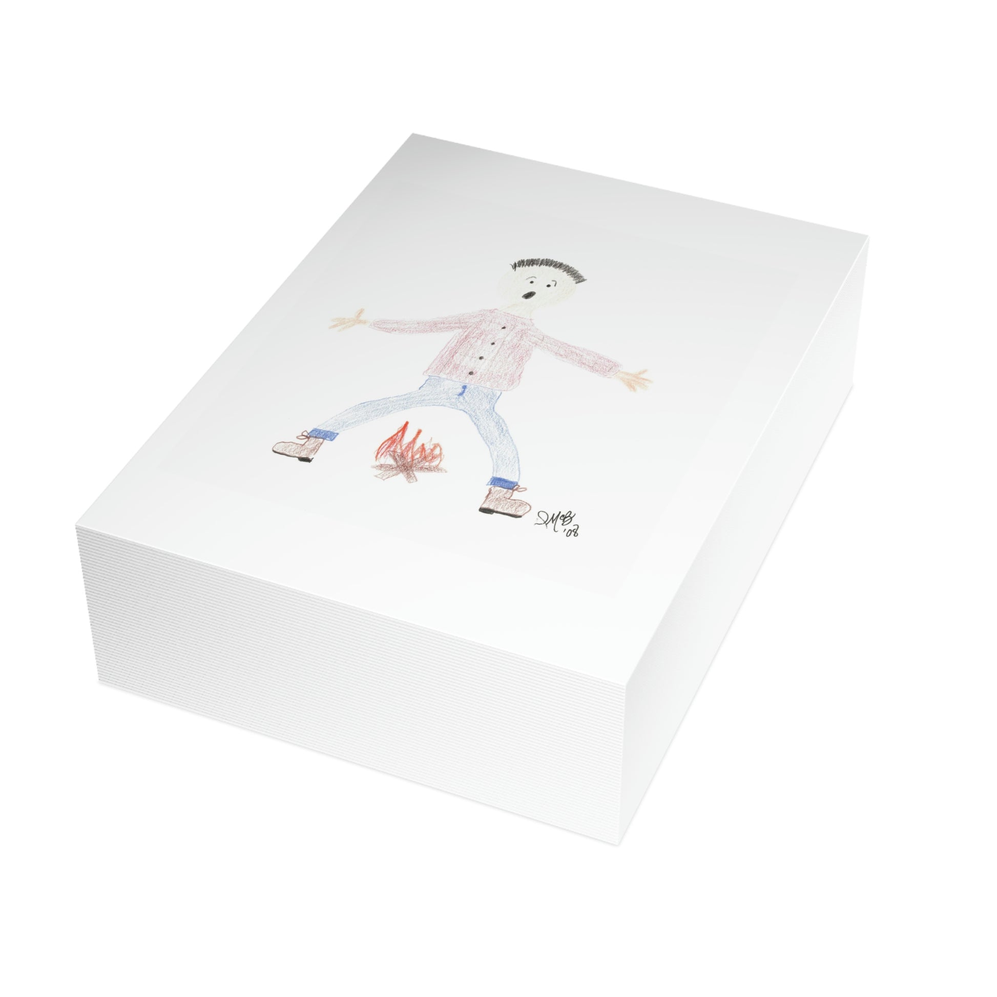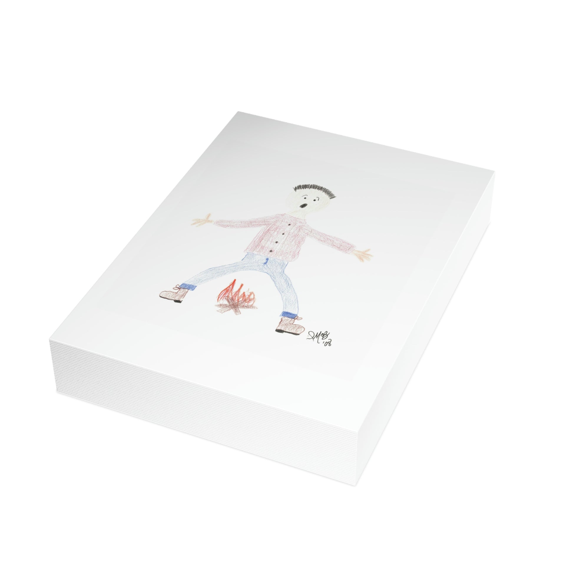 5x7 portrait greeting card – Chet's Nuts Roasting on an Open Fire - Poor Chet decided to try "Jack be Nimble, Jack be Quick" with a campfire. Bad idea. Camping and alcohol occasionally lead to unsafe shenanigans. It's all fun and games until someone's sack catches fire. Hope he has lots of ice in his cooler! Original drawing is colored pencil on paper, scanned in and placed on the card.