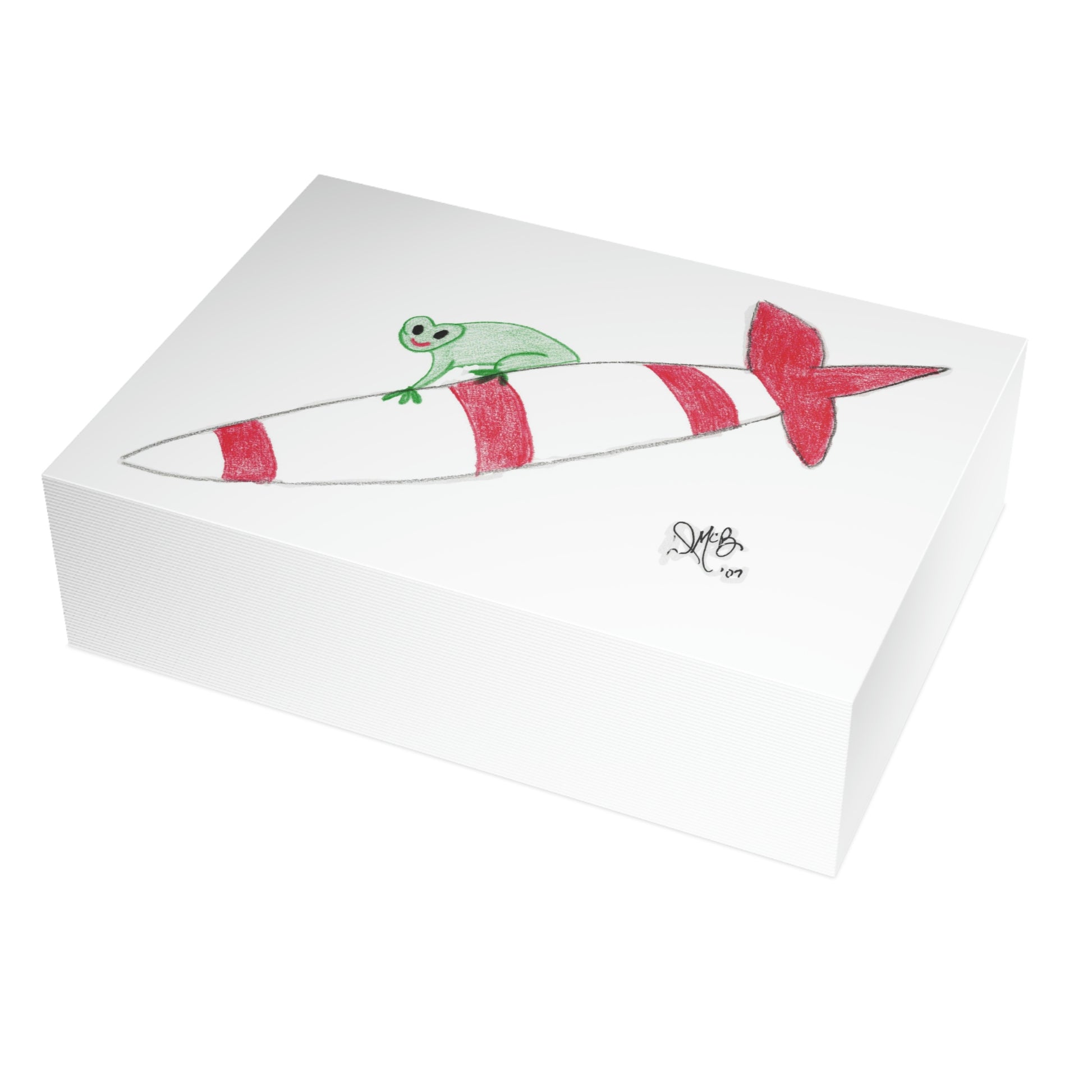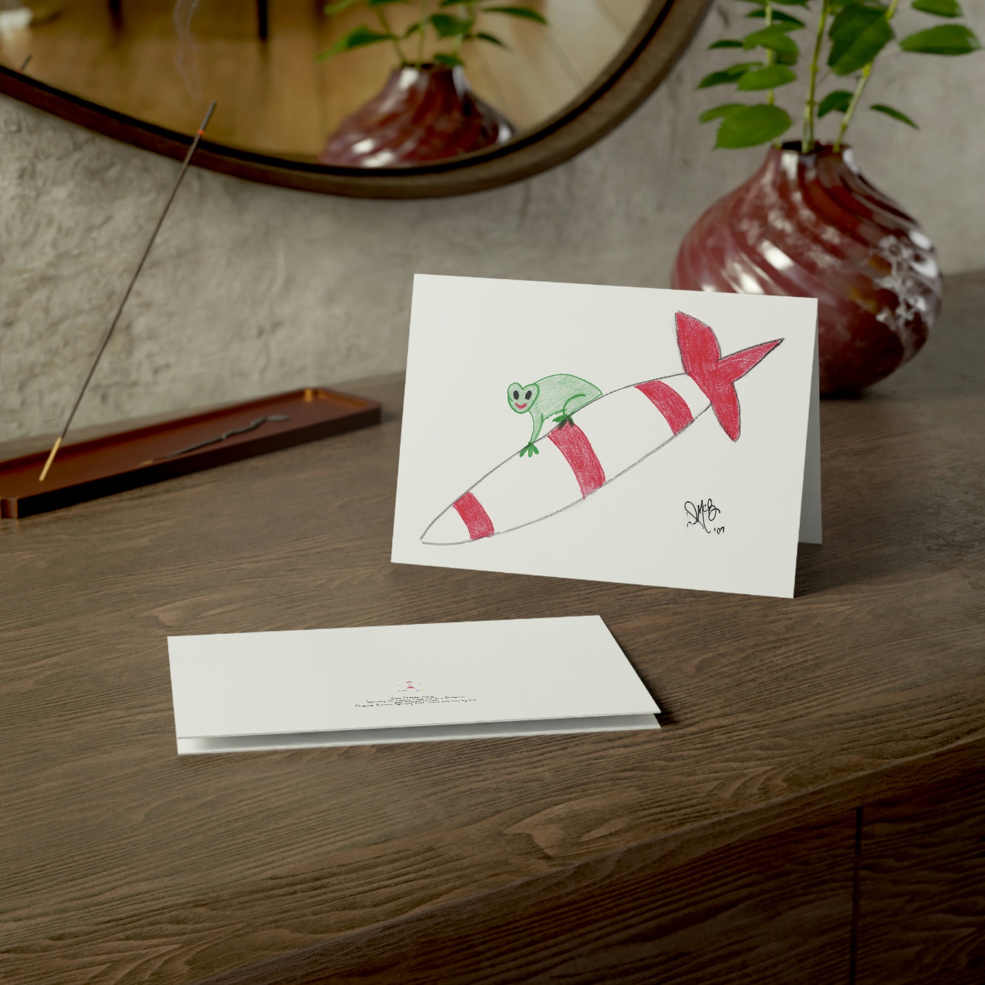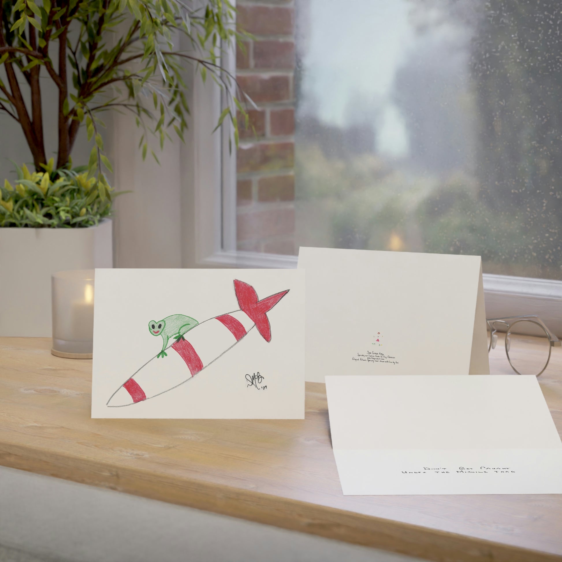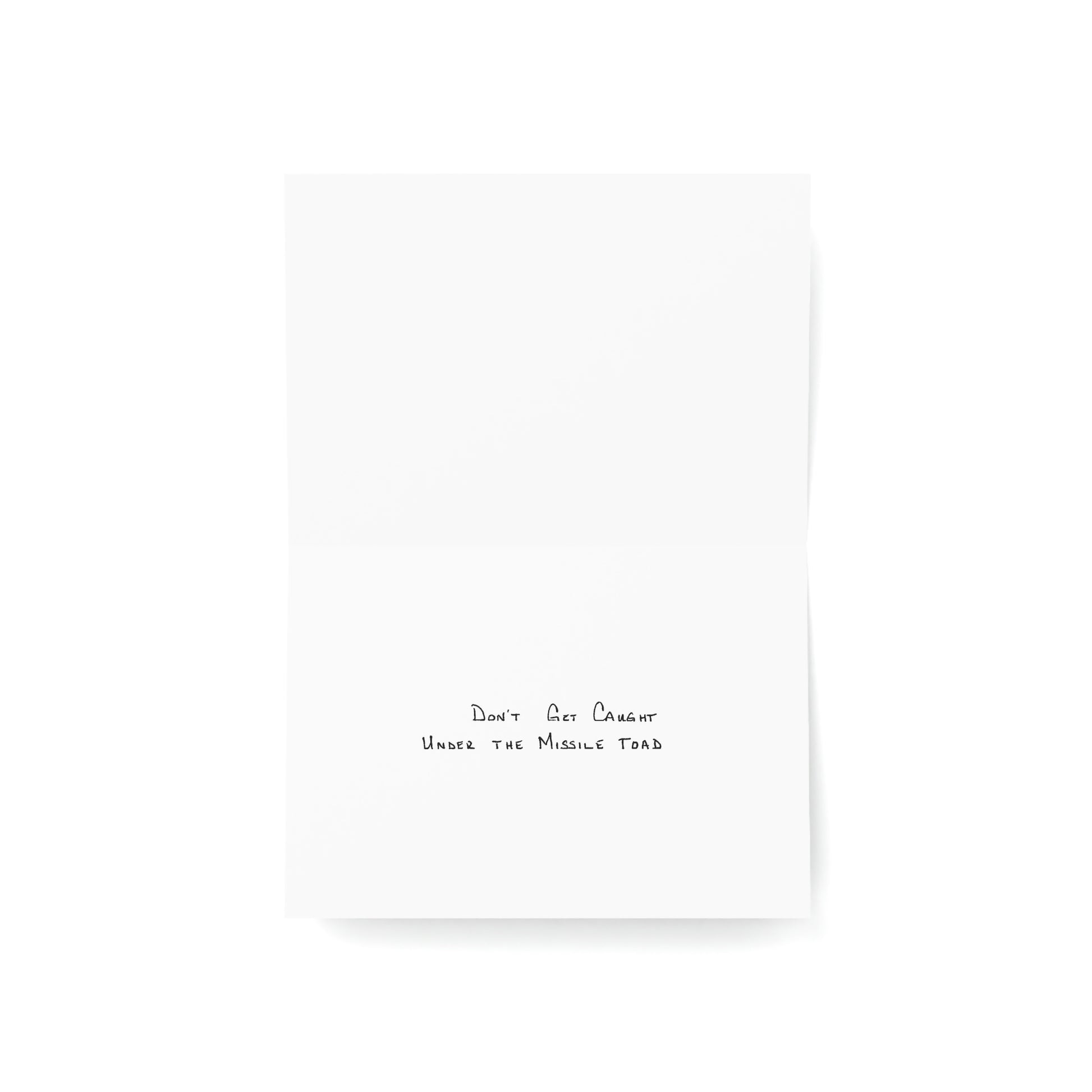 5x7 landscape greeting card – Don't Get Caught Under the Missile Toad - A toad riding on a missile - clearly enjoying the ride. Definitely something you don't want to be caught under - you may have better luck under the mistletoe! The puns and twisted sayings abound on these cards! Original drawing is colored pencil on paper, scanned in and placed on the card.