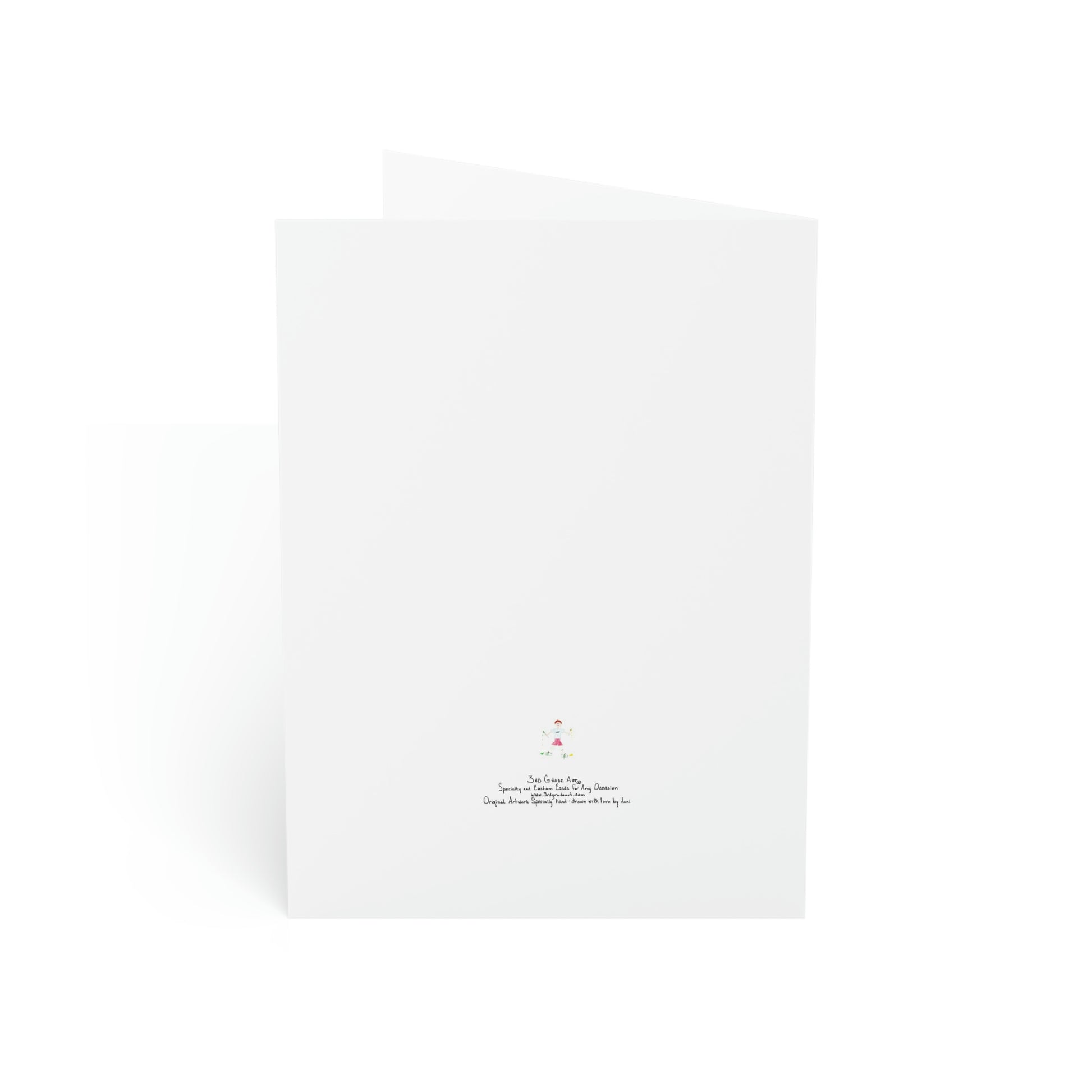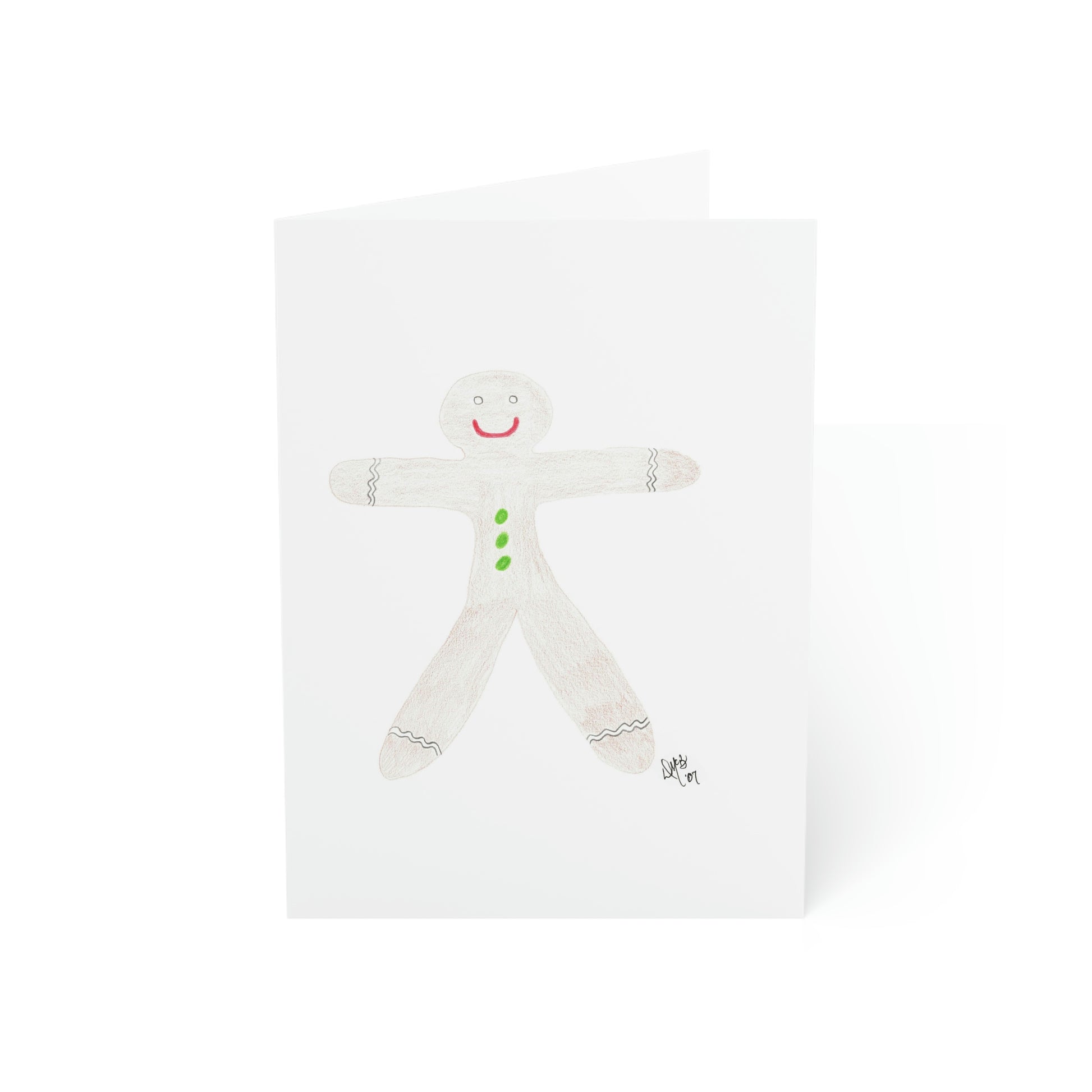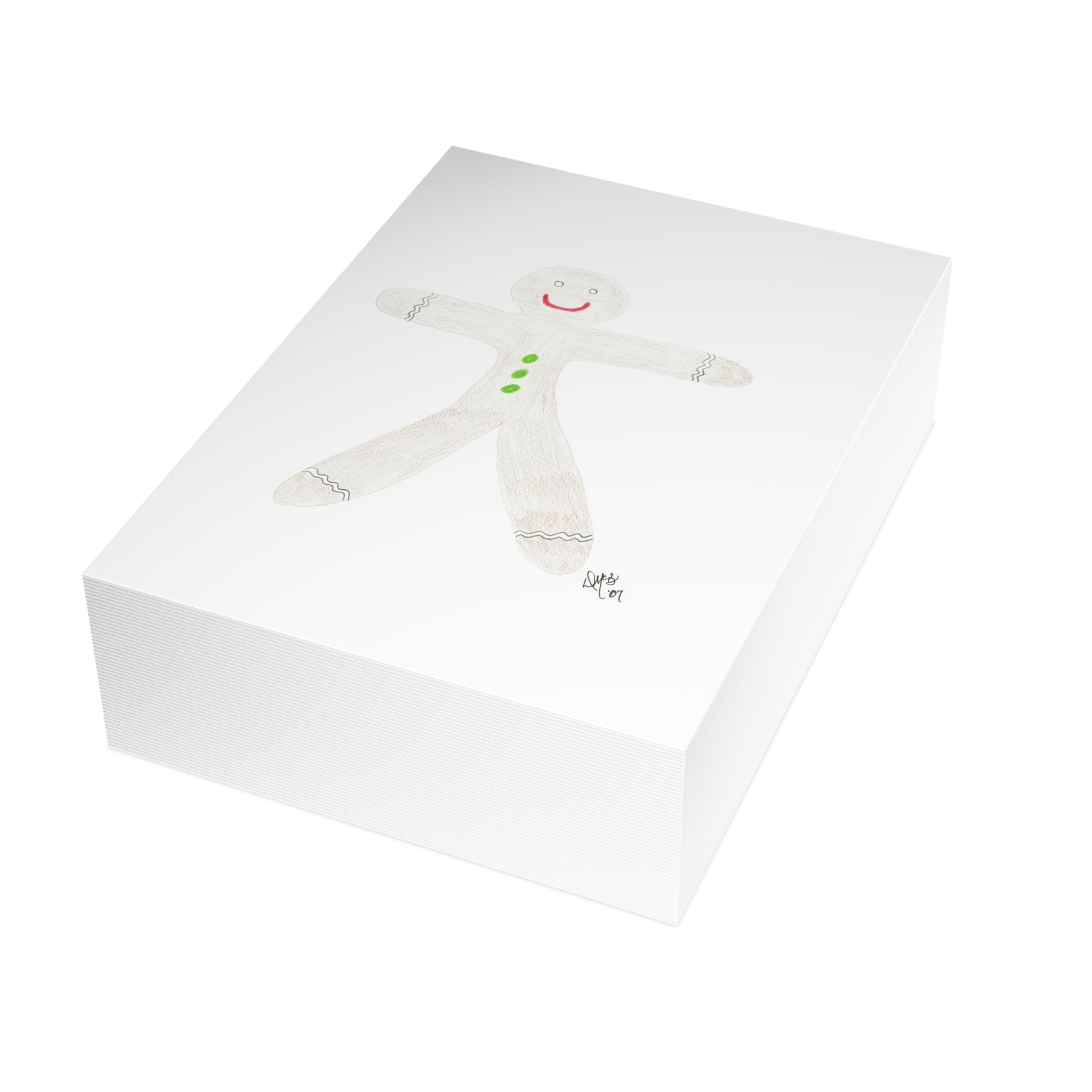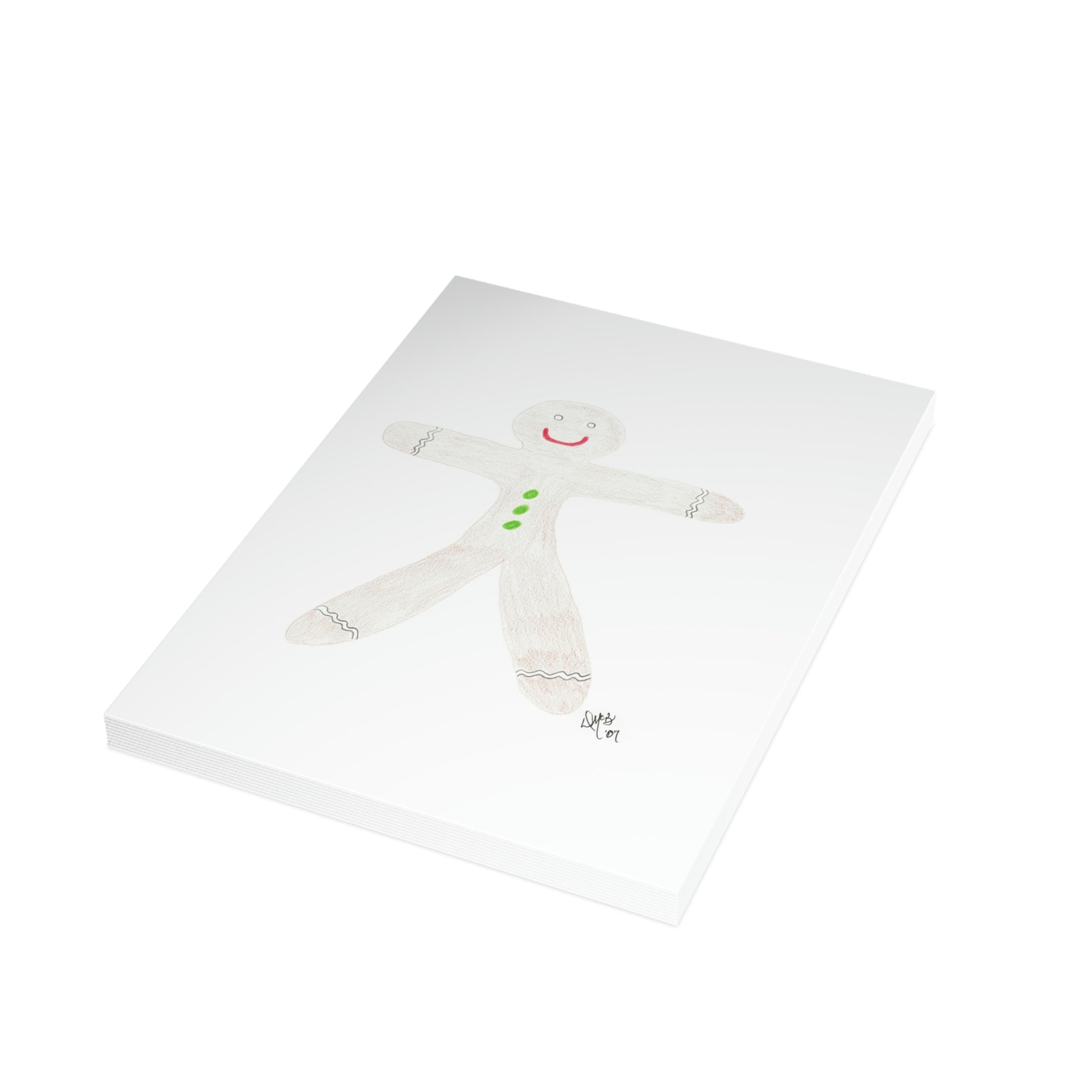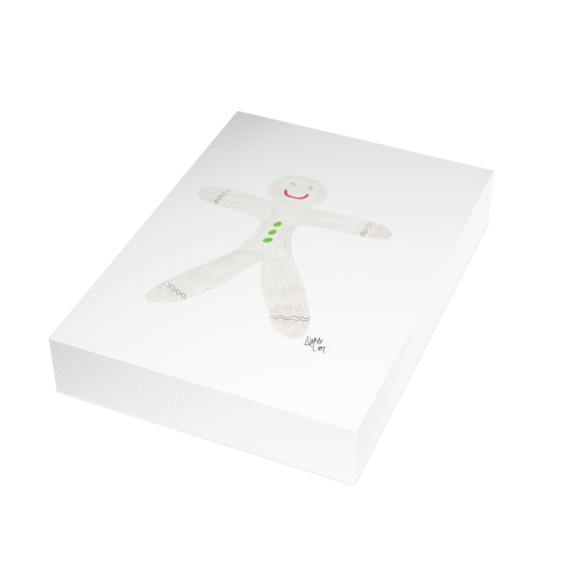 5x7 portrait greeting card – Have a Warm Holiday Season - A smiling gingerbread man smiles out, not realizing his fate. He's still fresh out of the oven, newly decorated, and warm. It's only a matter of time before he starts losing body parts. Before he does, he would like to make sure your holiday season gets off to a great start! Original drawing is colored pencil on paper, scanned in and placed on the card.