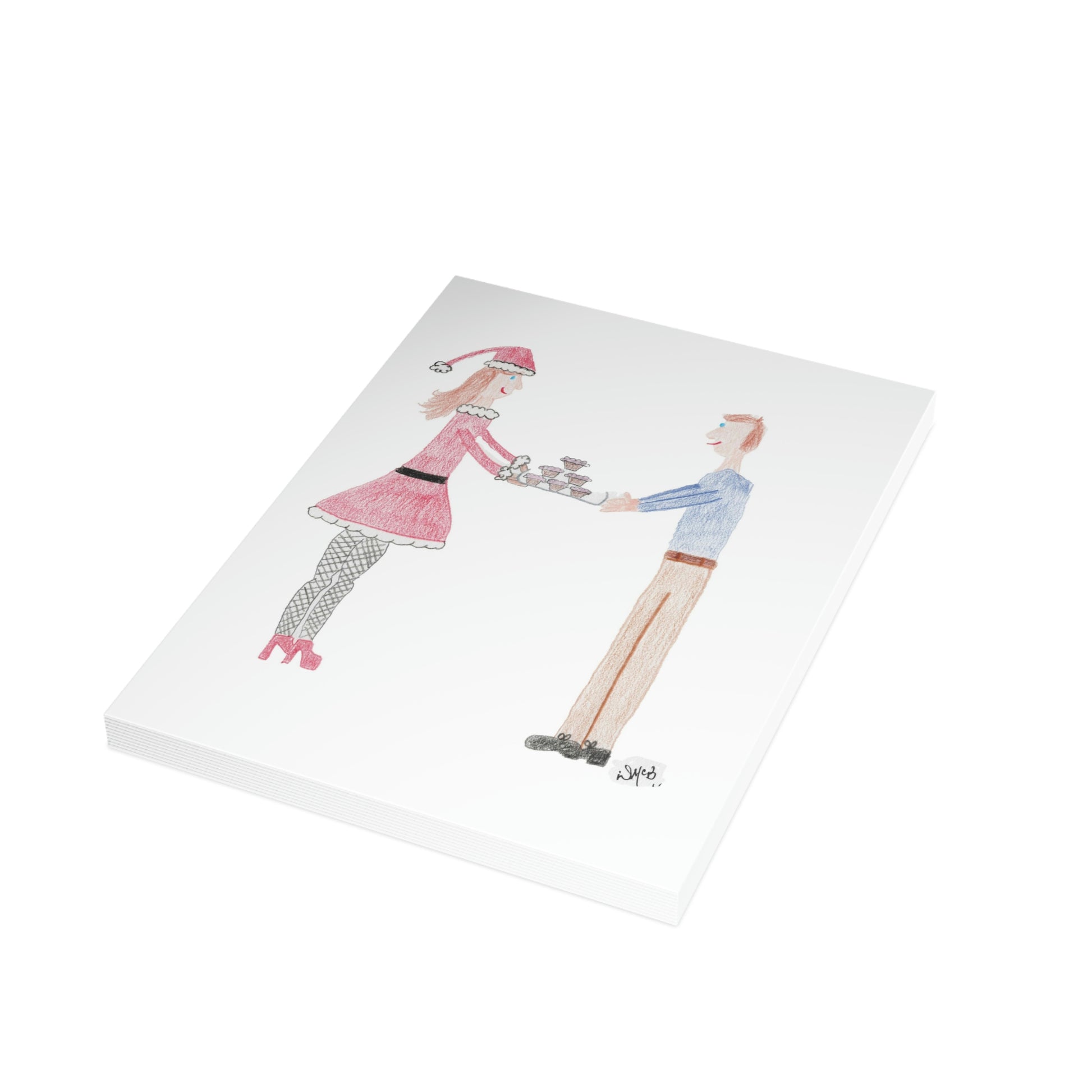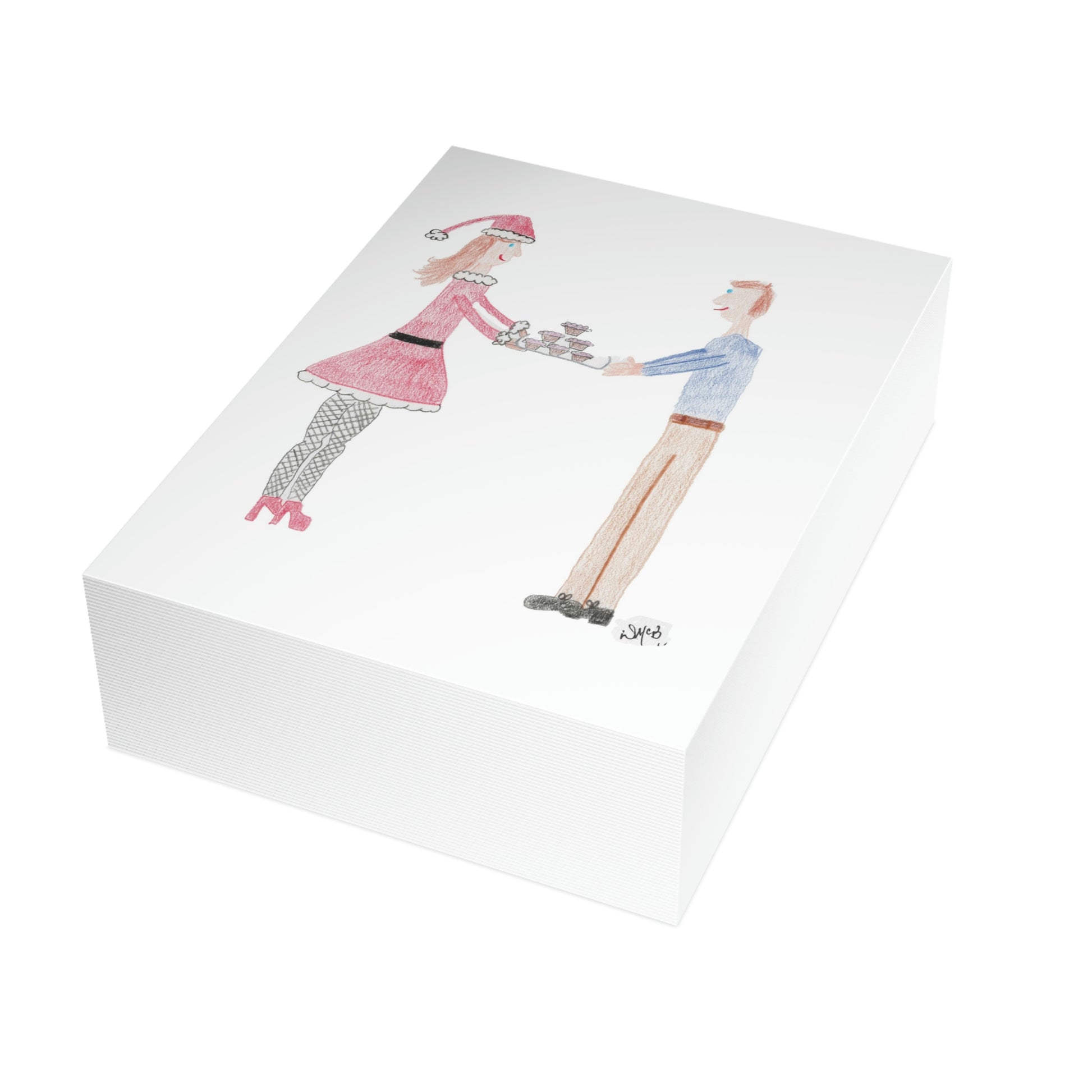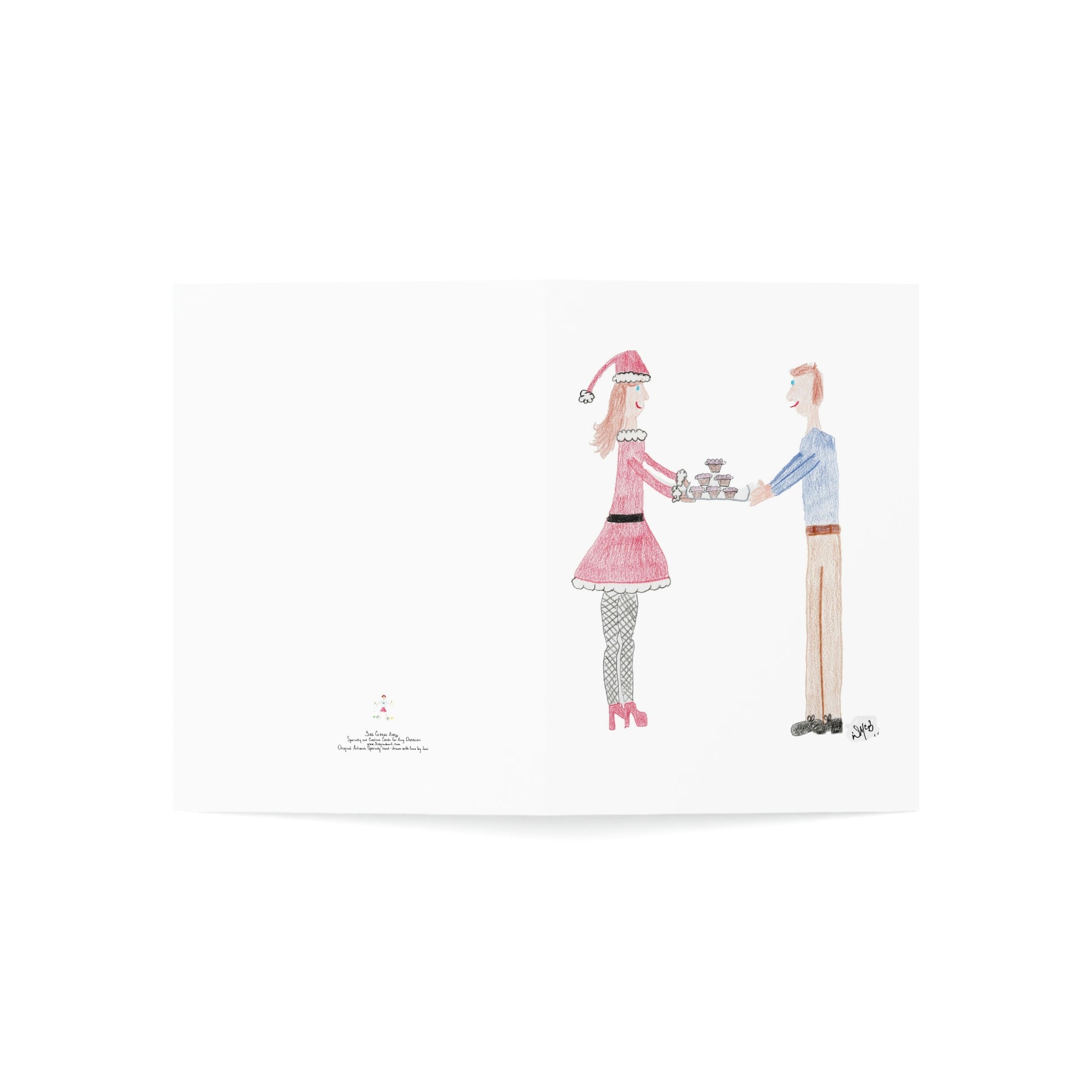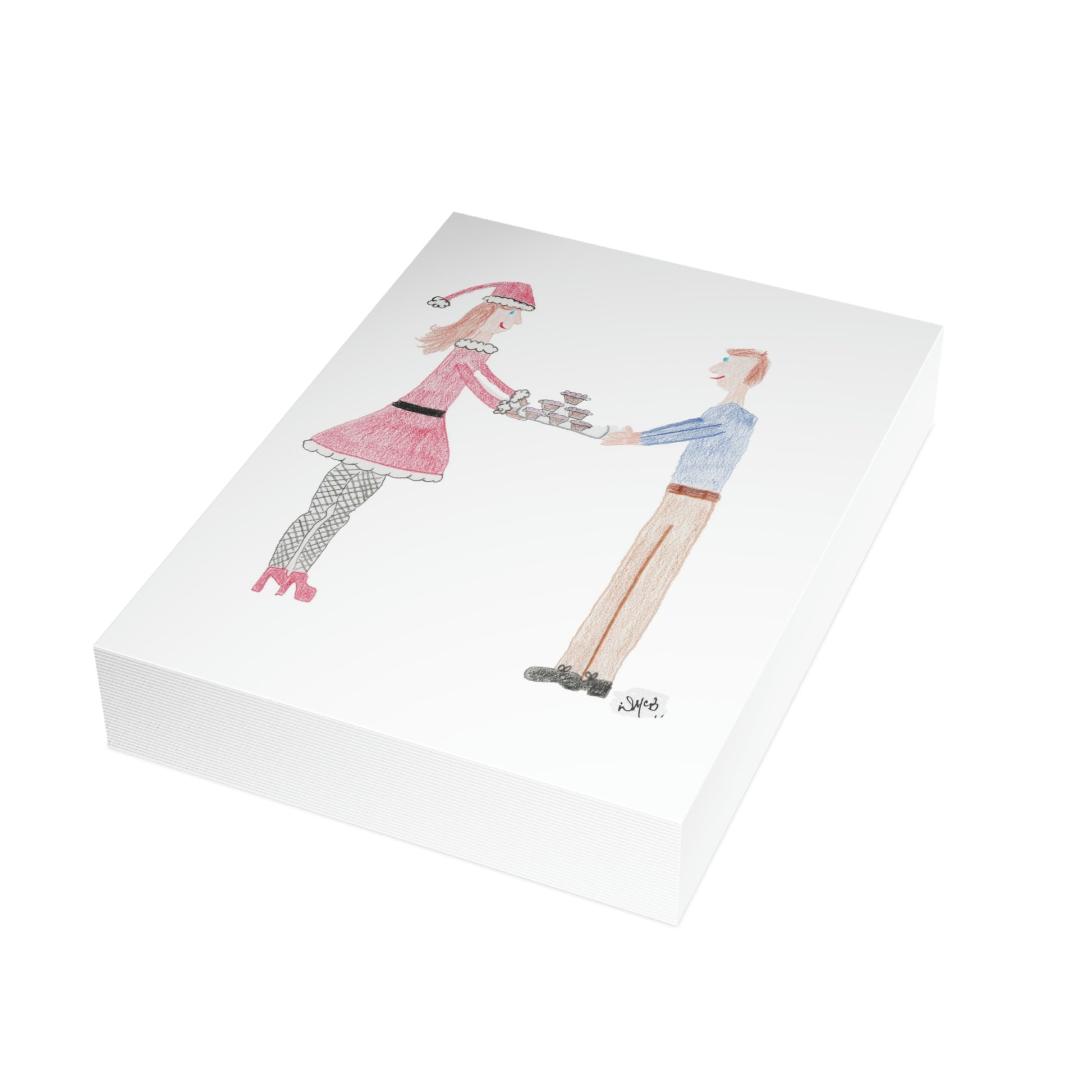 5x7 portrait greeting card – Hope All Your Holiday Interactions are Pleasant - A lovely lady dressed in a Santa-esque outfit hands a tray of baked goods to another person. I drew this card for my husband to give to his staff. He works in a customer service industry that can be pretty brutal. There is a corresponding/opposite card in the Naughty collection - because of its violent content. Either way, if you want to wish someone in the service industry a nice holiday season, this is the card for you. Original drawing is colored pencil on paper, scanned in and placed on the card.