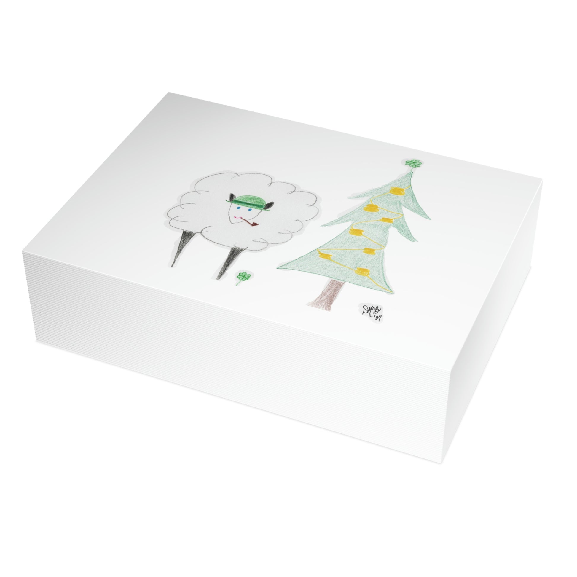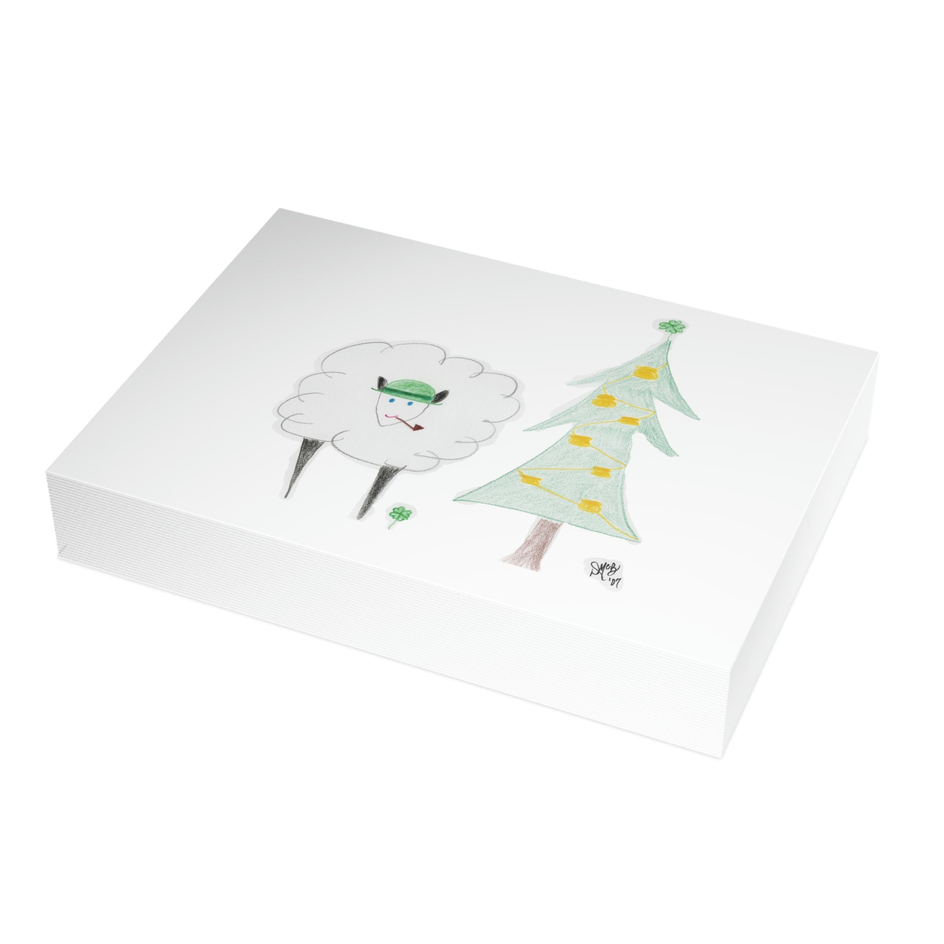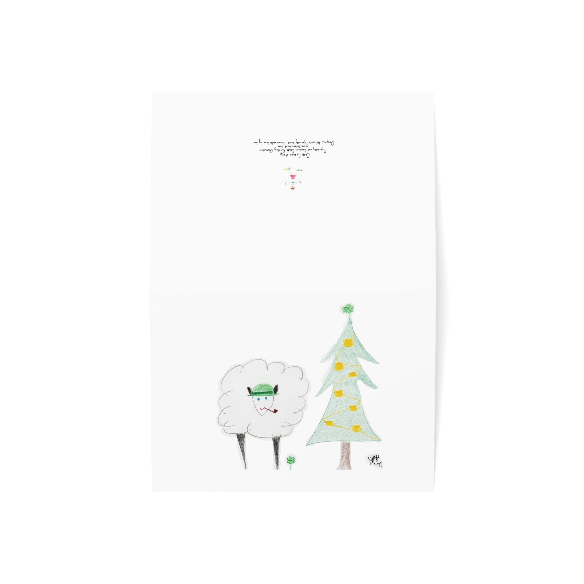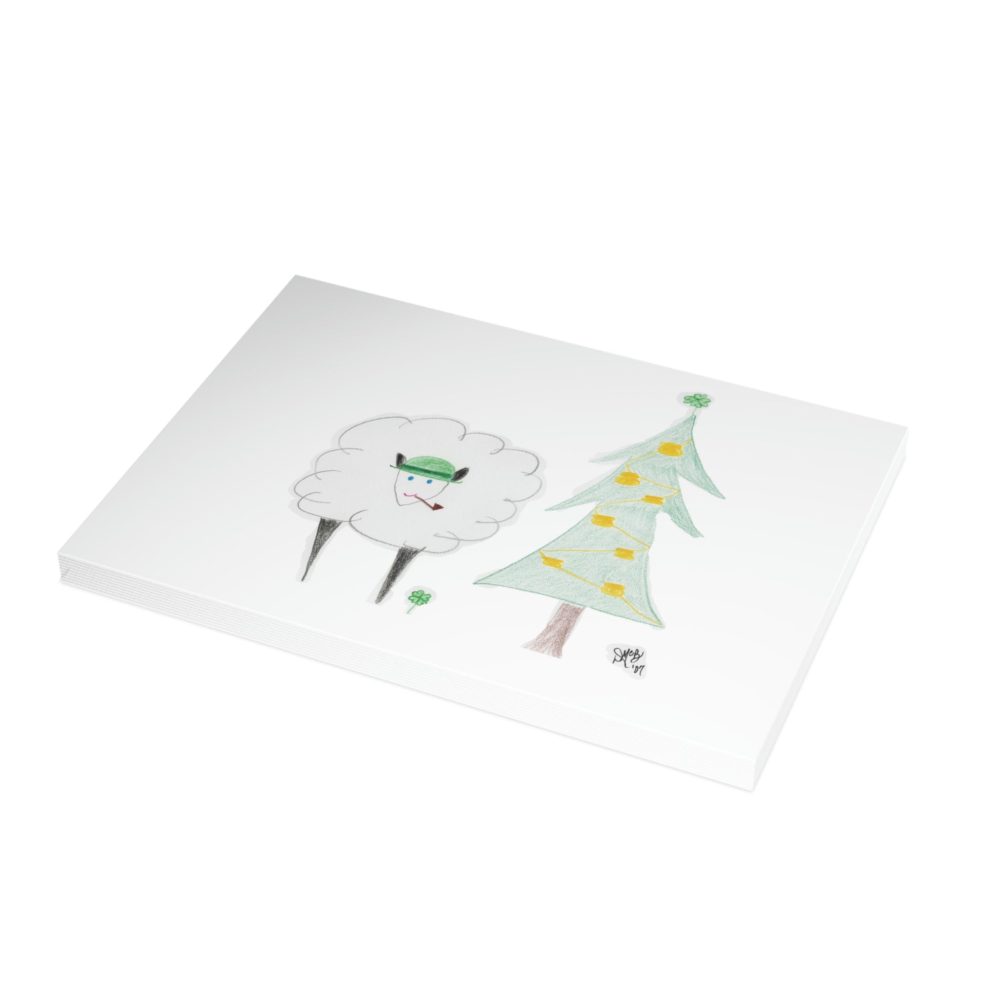 5x7 landscape greeting card – Irish Ewe a Merry Christmas - A cute little sheep wearing an Irish hat, and has a pipe. The Christmas tree is decorated with pots of gold and adorned with a shamrock for a star. I love using sheep/ewes for "you" and there are several cards in my collections that reflect that. For several years, I would hold back a design to use for myself. Once it was sent out to the recipients, I would post it for public consumption. These cards hold a special place in my heart, as each year a picture of all my "kids" would be sent with the cards, and they were often dressed/staged in the theme of the card. Original drawing is colored pencil on paper, scanned in and placed on the card.