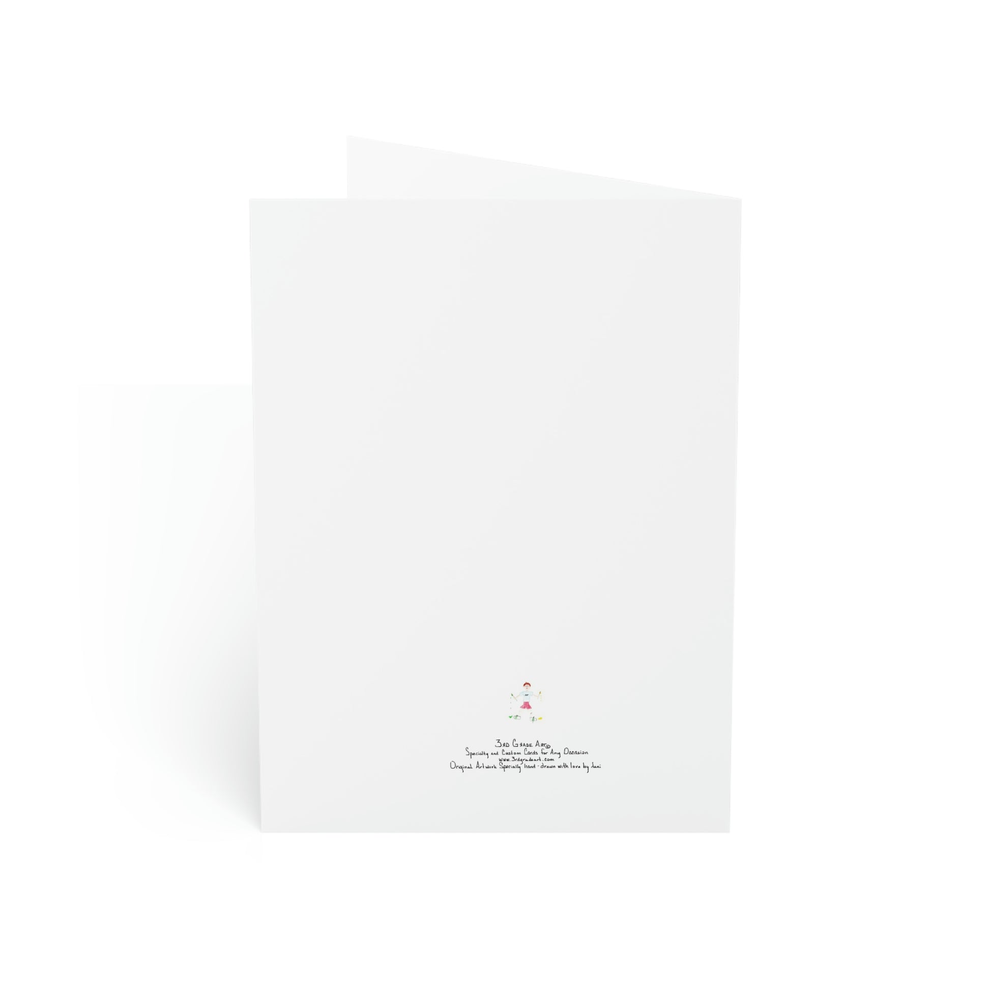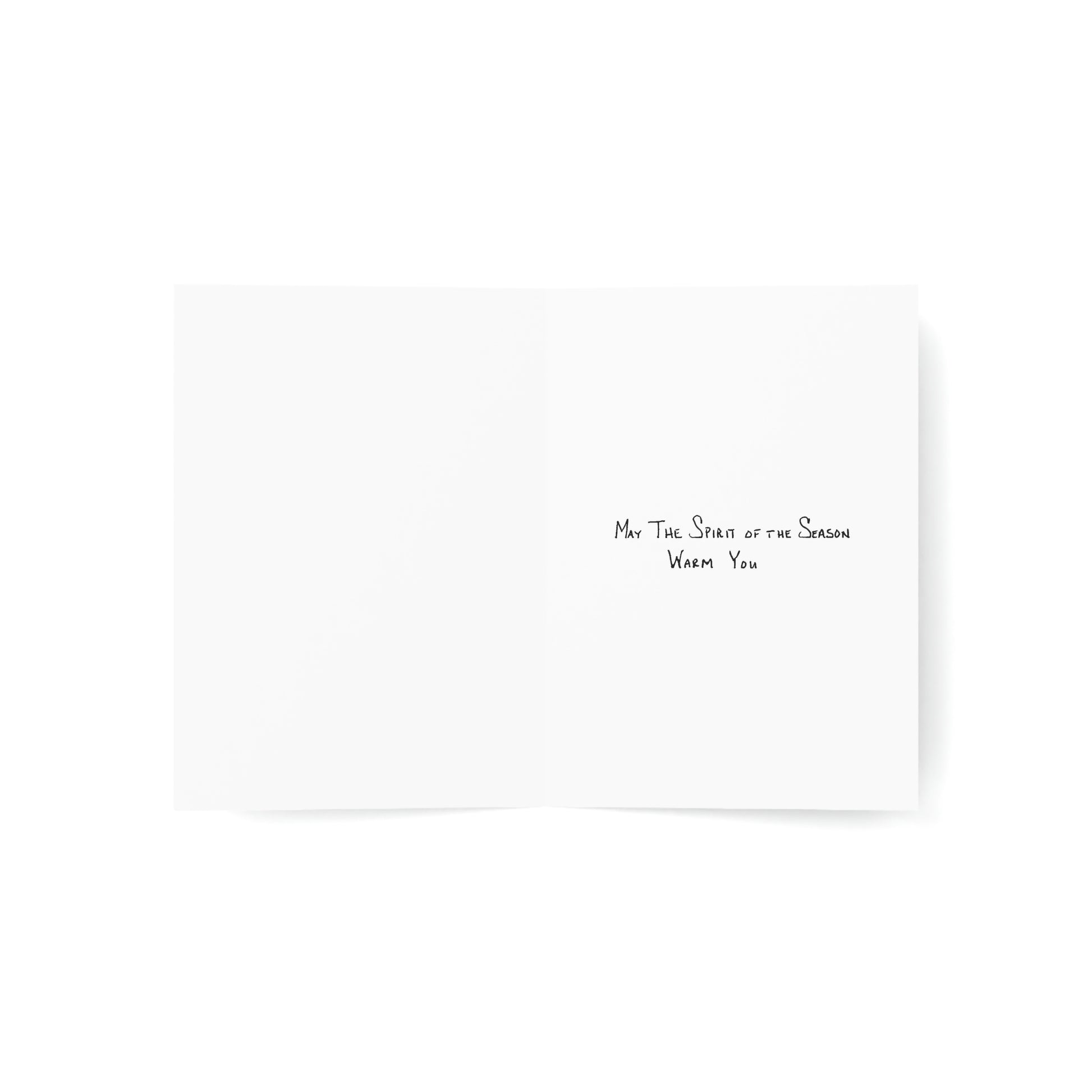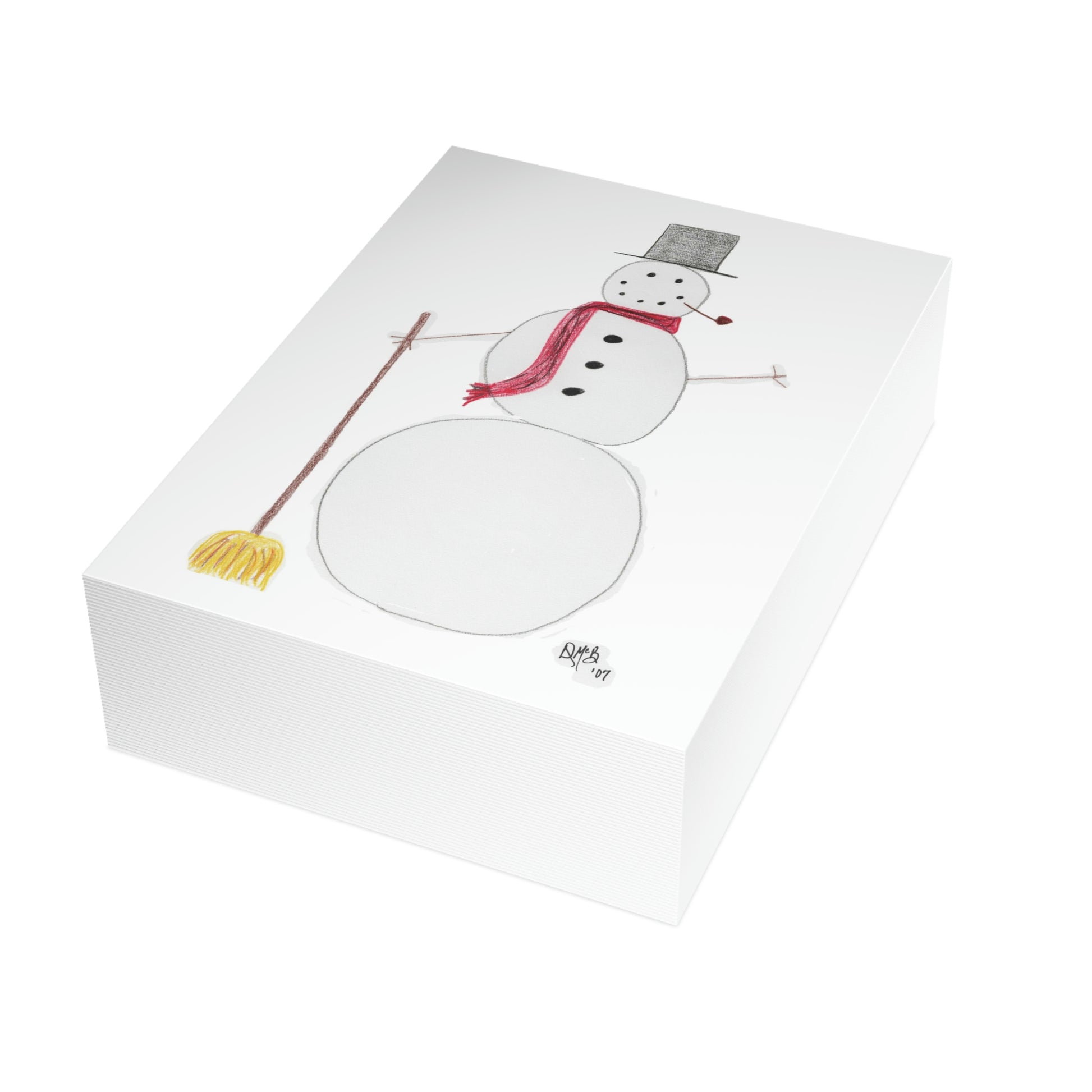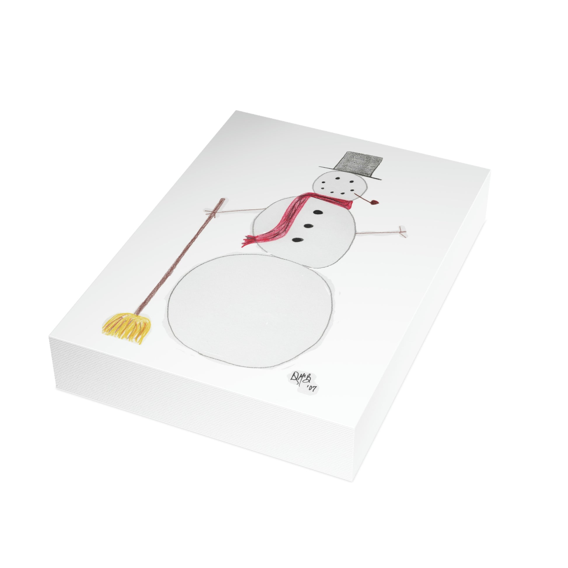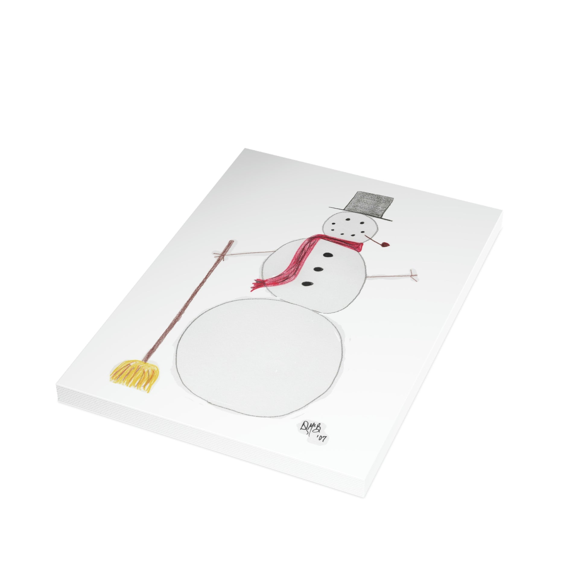 5x7 portrait greeting card – May the Spirit of the Season Warm You - A happy snowman with his red scarf, broom, pipe, and top hat smiles warmly at the recipient. His Left hand is raised in greeting. This card is a simple drawing with a simple message. Enjoy seeing the snow without the cold! Original drawing is colored pencil on paper, scanned in and placed on the card.