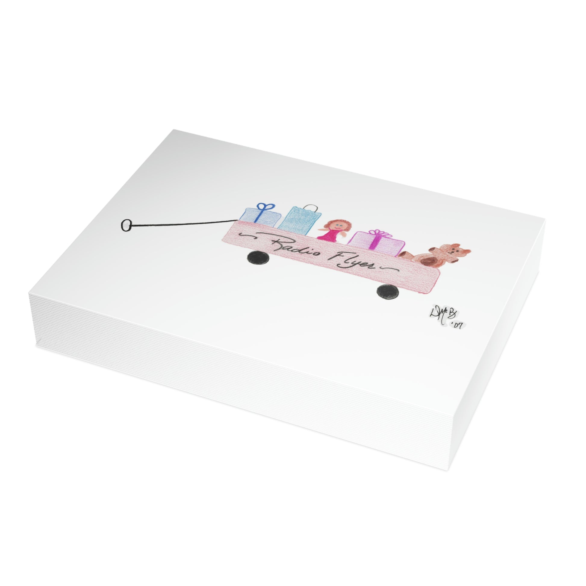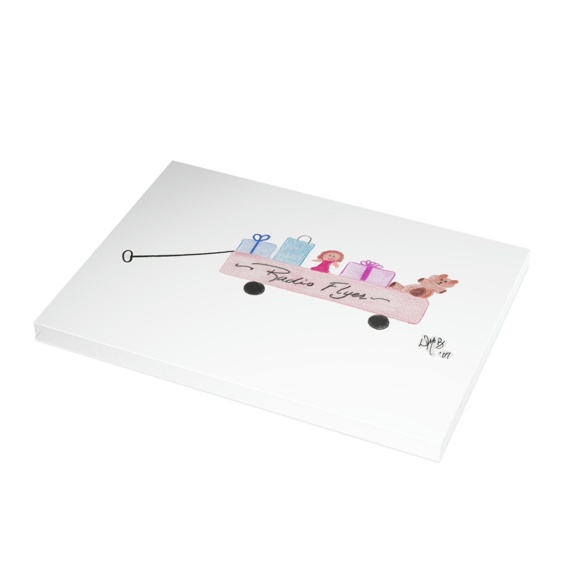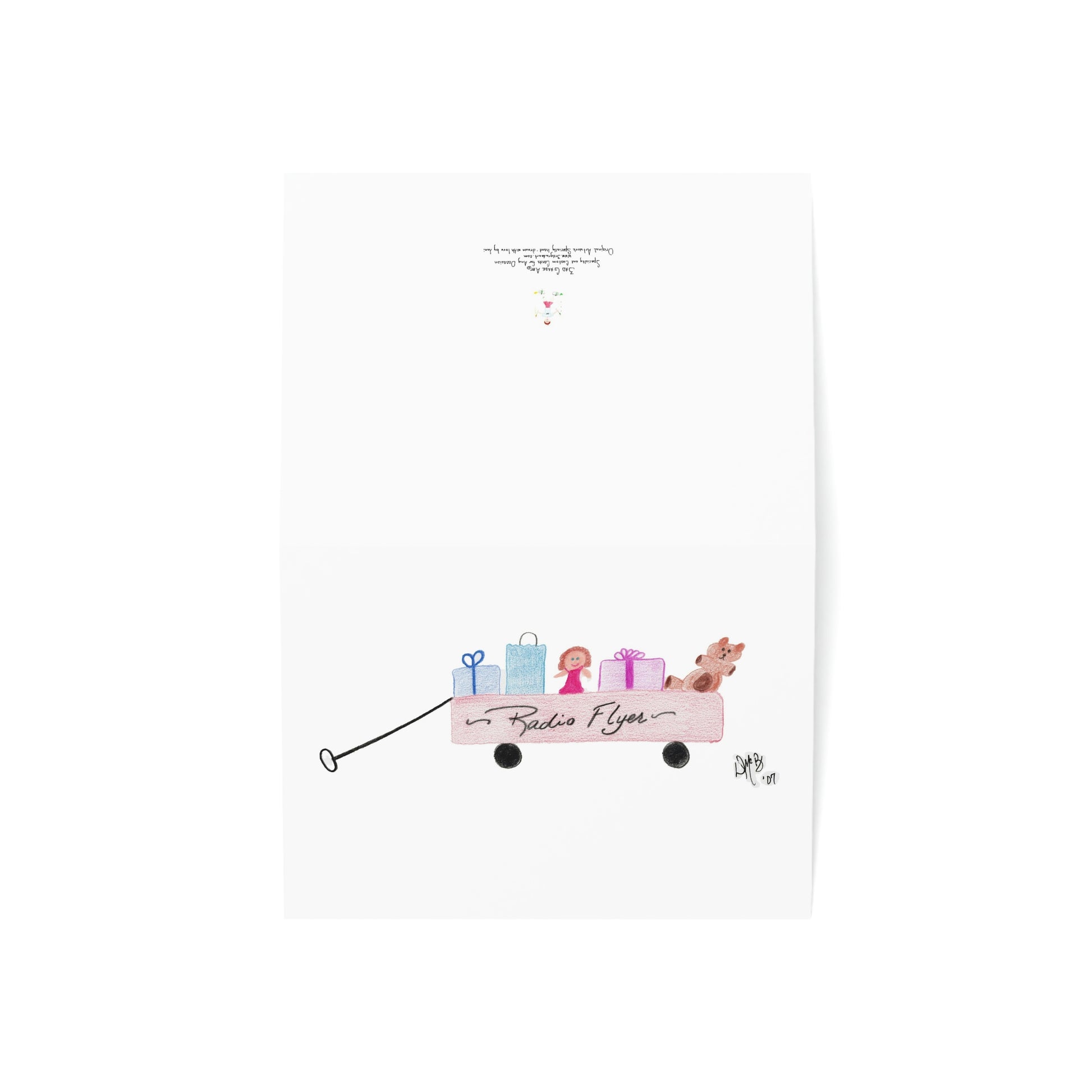 5x7 landscape greeting card – May You Receive Wagons Full of Joy - A Radio Flyer red wagon full of treasures. It's what all children dreamed of prior to the advent of video games. The teddy bear looks ready to squeeze. The dolly is just waiting for love. Revive nostalgia by sending this sweet card depicting a Christmas haul from yesteryear. Original drawing is colored pencil on paper, scanned in and placed on the card.