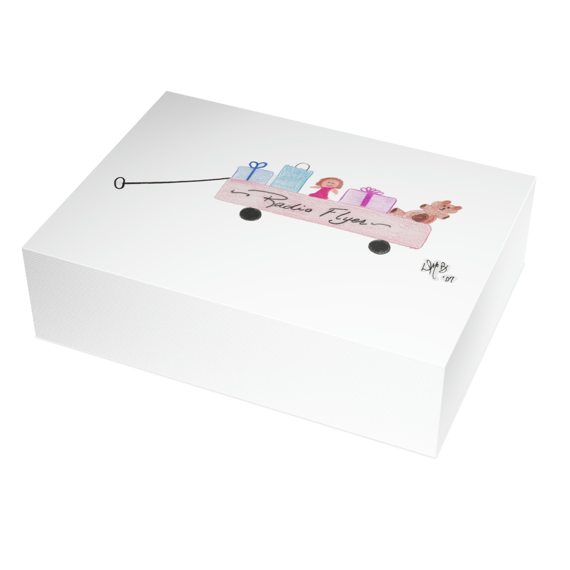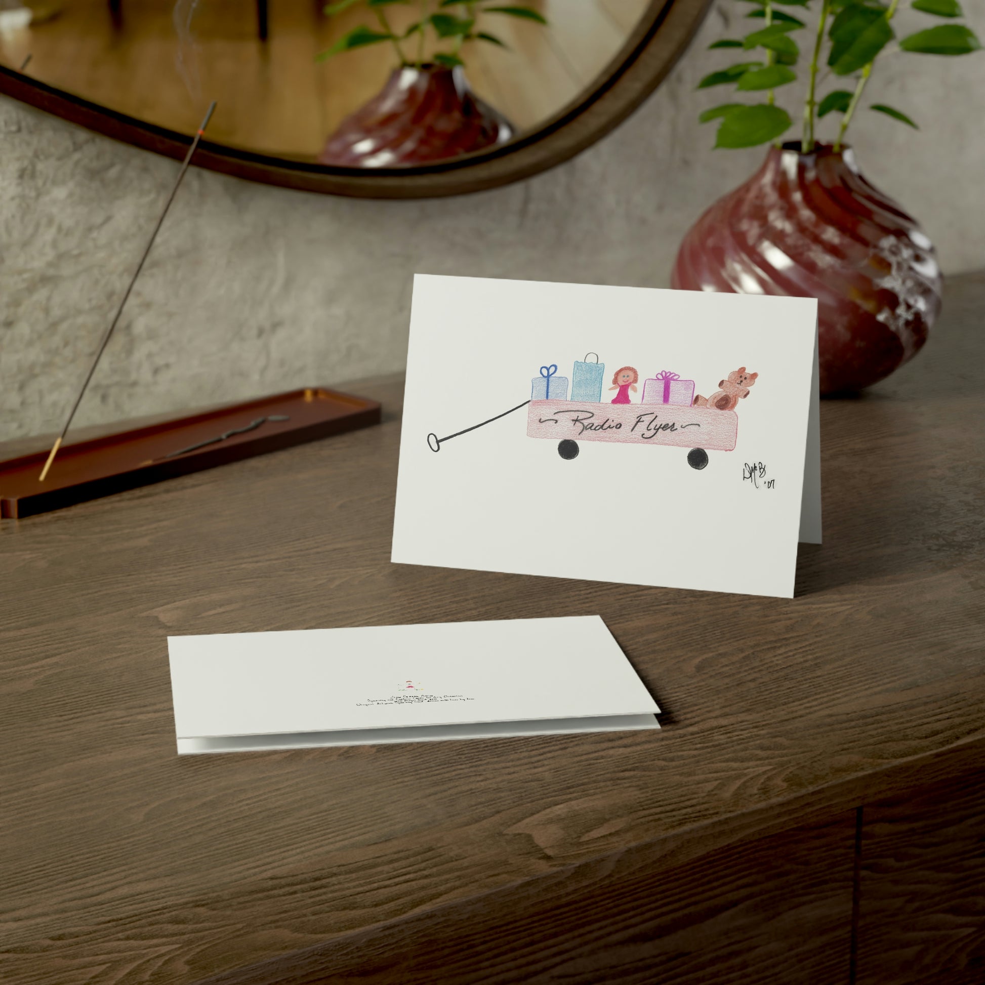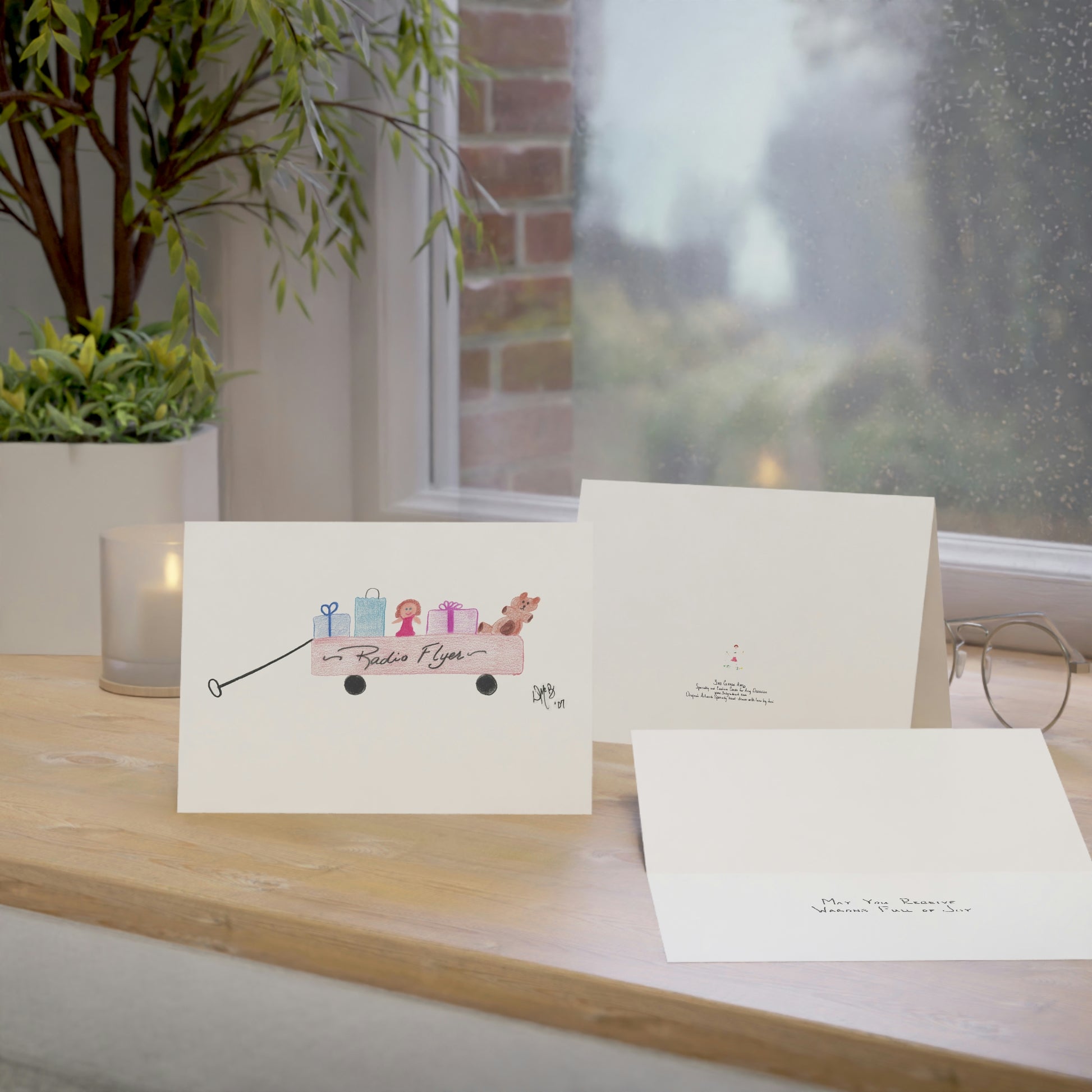 5x7 landscape greeting card – May You Receive Wagons Full of Joy - A Radio Flyer red wagon full of treasures. It's what all children dreamed of prior to the advent of video games. The teddy bear looks ready to squeeze. The dolly is just waiting for love. Revive nostalgia by sending this sweet card depicting a Christmas haul from yesteryear. Original drawing is colored pencil on paper, scanned in and placed on the card.