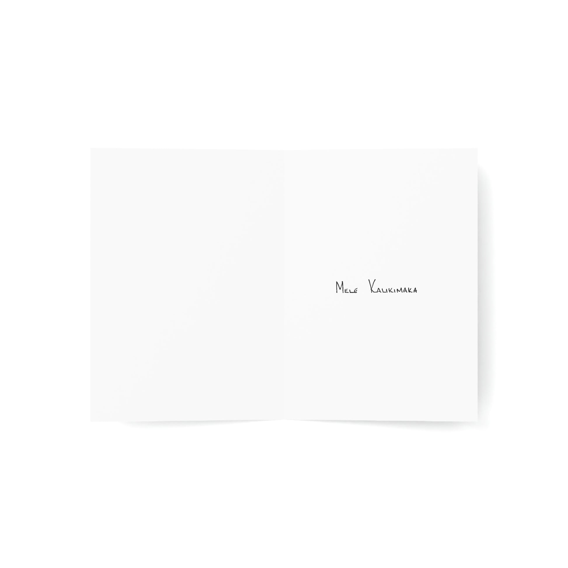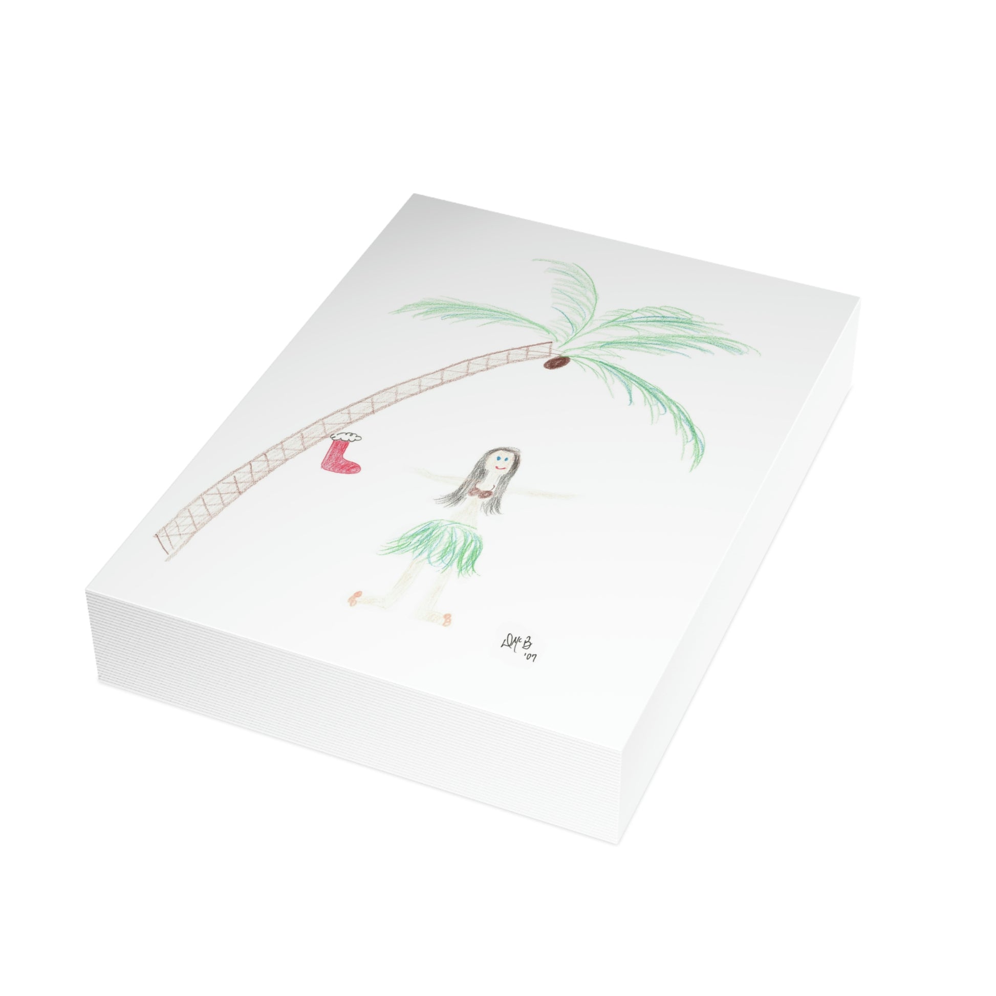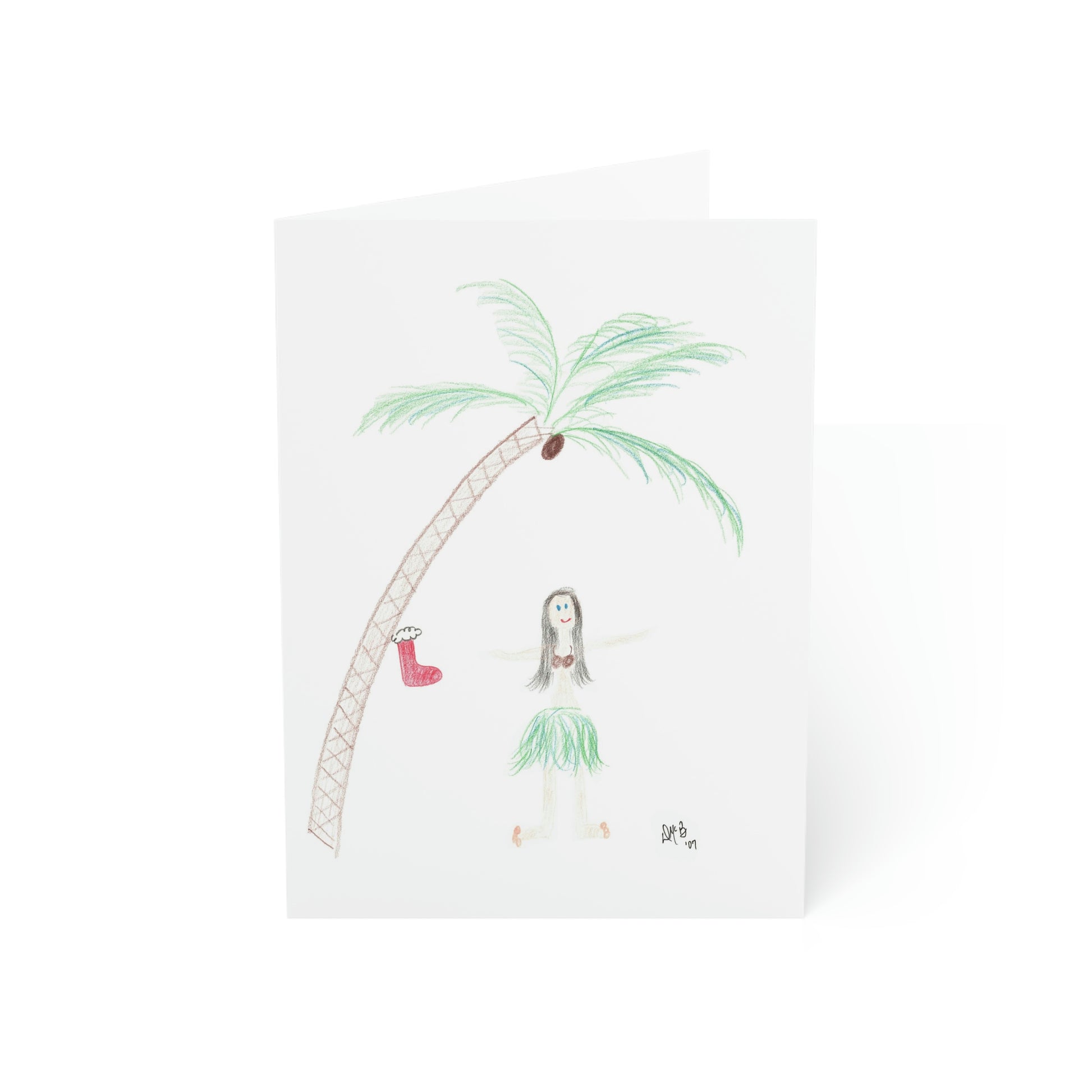 5x7 portrait greeting card – Mele Kalikimaka - A lovely little hula girl in a grass skirt and coconut bra standing under a palm tree with a stocking on it. She is just waiting for Santa to arrive to fill up that stocking! I love this card, as it reminds me of my aunt, who lived on Maui for many years. She was an incredible artist and I always admired that. We became closer the last few years prior to her passing and I'm happy for that, but I really miss her. She made beautiful cards with stamps, paints, embossing, and so many other mediums. Each one was stamped on the back with "Made with Aloha." Aloha, Aunt Juile. Haʻo au iā ʻoe. Original drawing is colored pencil on paper, scanned in and placed on the card.