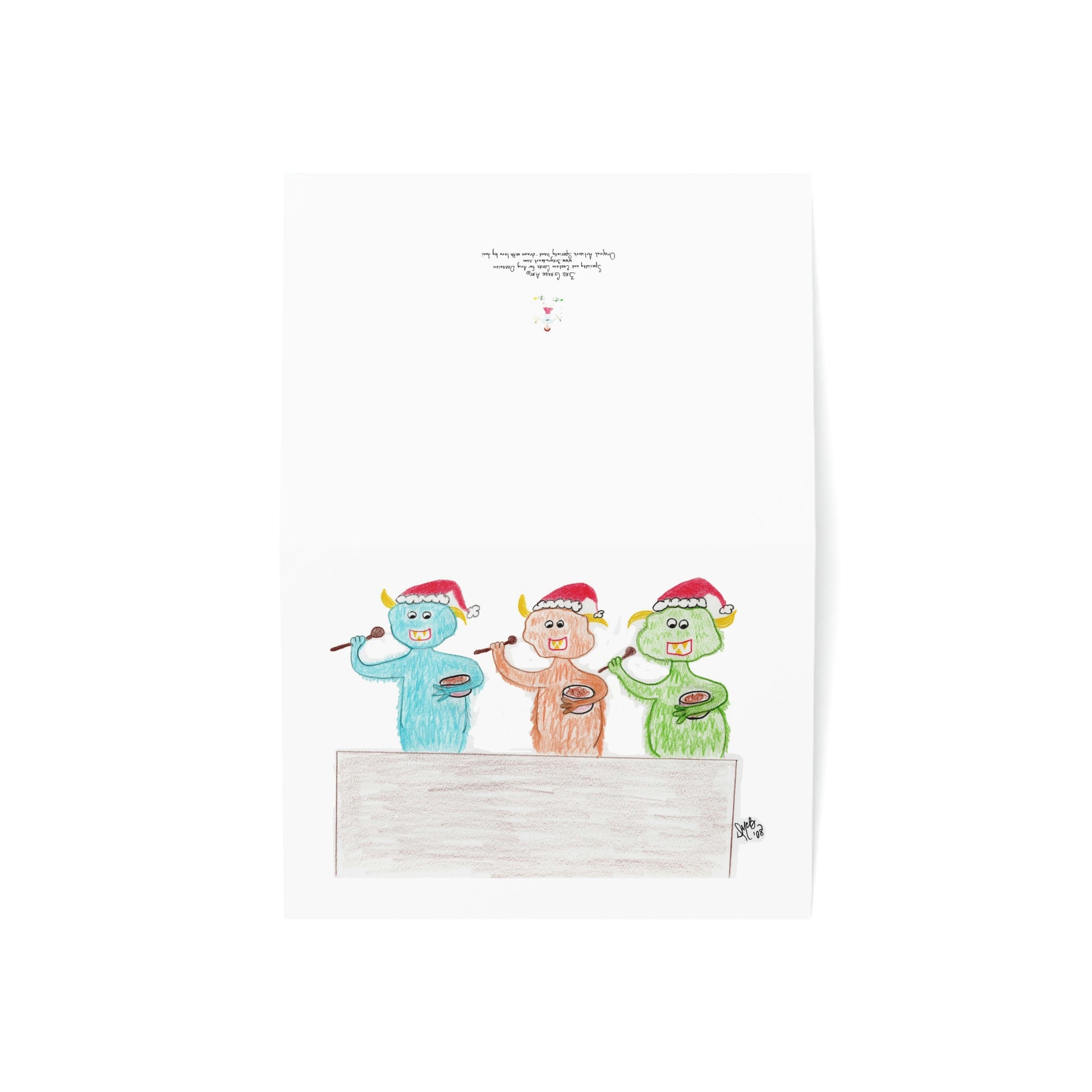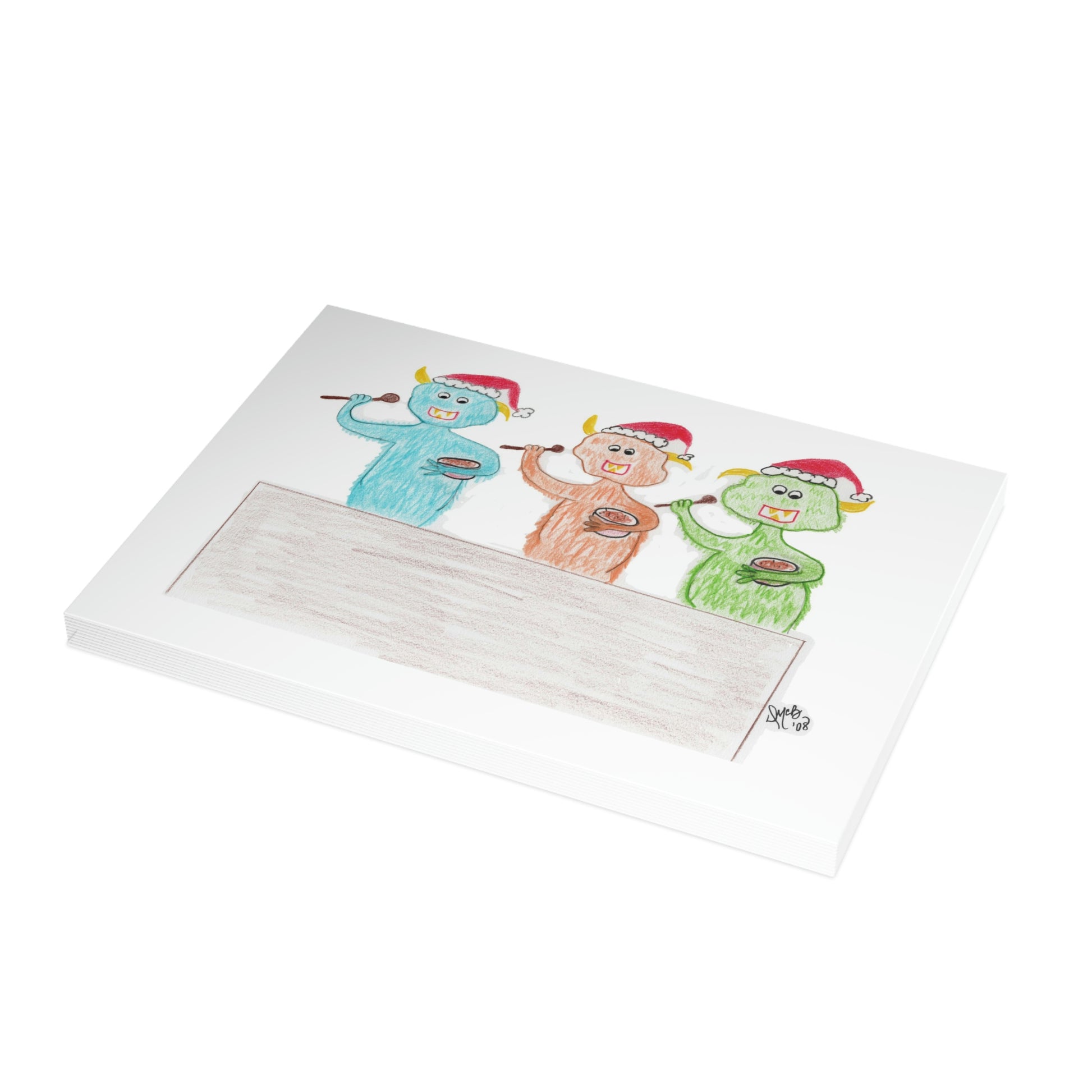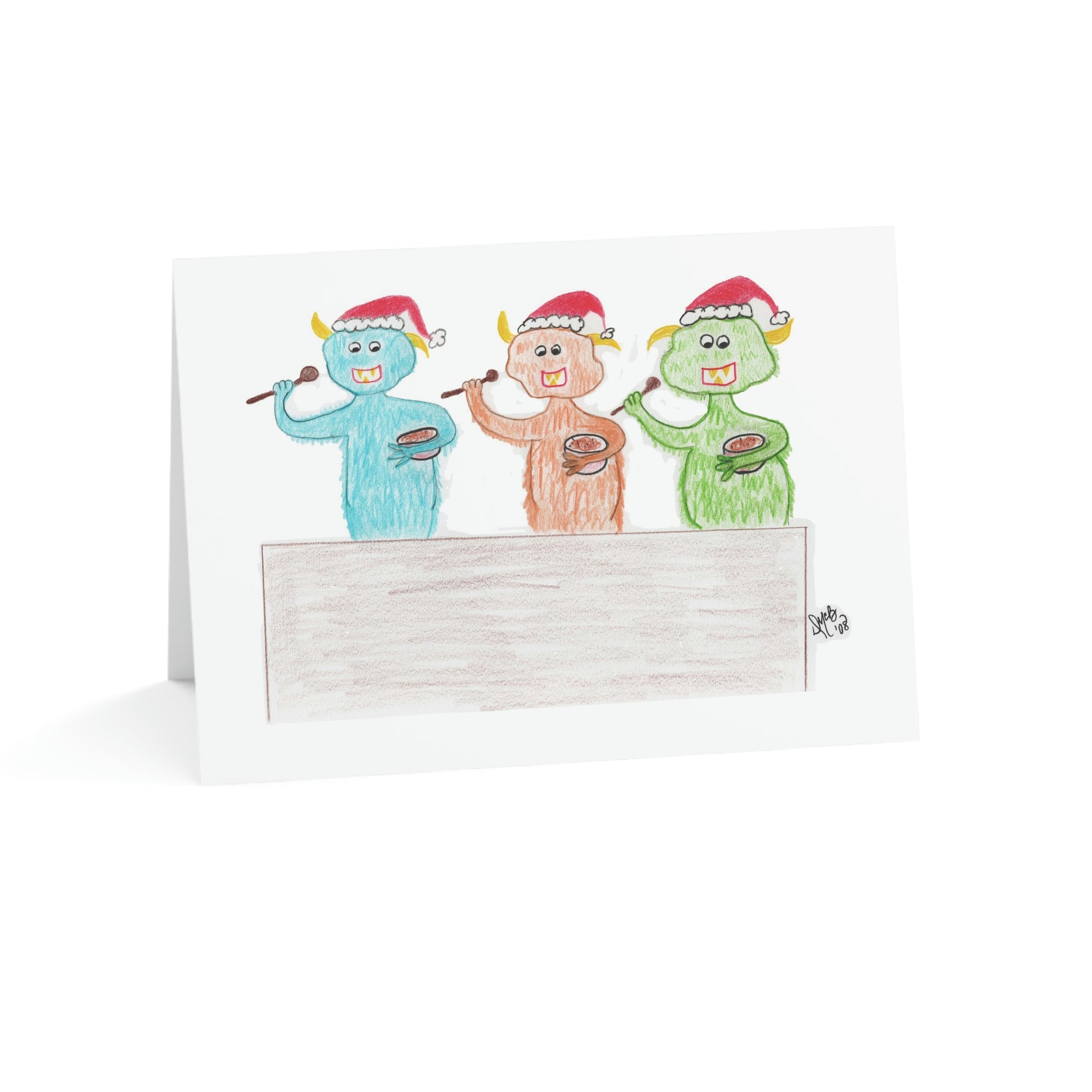5x7 landscape greeting card – Not a Creature Was Stirring - Three festive little monsters wearing Santa hats holding bowls and spoons, but they have suspended their stirring (at least long enough for the picture to be drawn). This was one of my exclusive designs for personal use, to be released to public after the season that I used it. I like this card for its vibrant colors and happy little creatures on it. Original drawing is colored pencil on paper, scanned in and placed on the card.