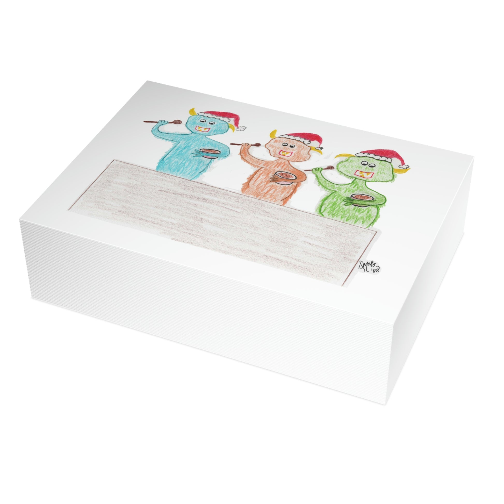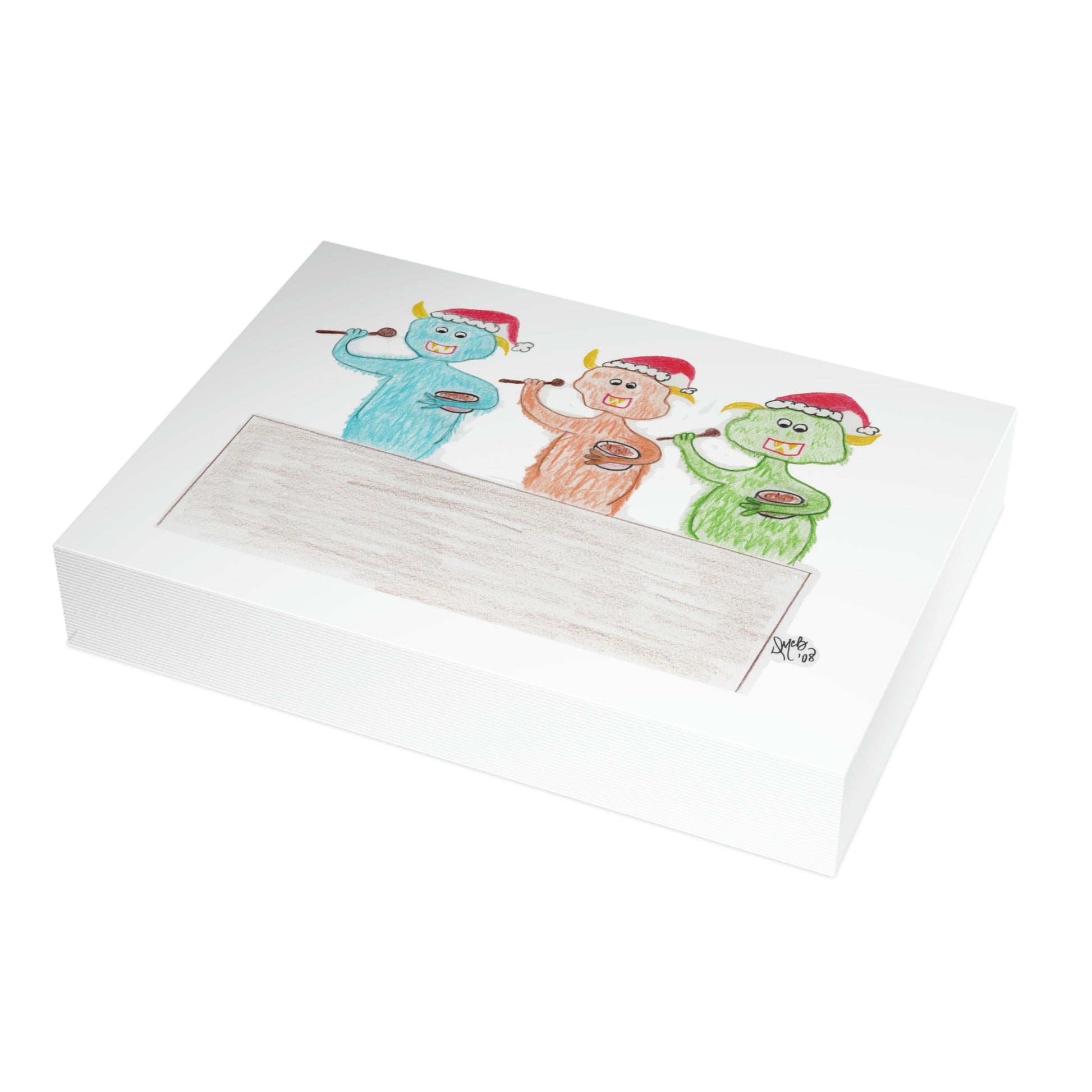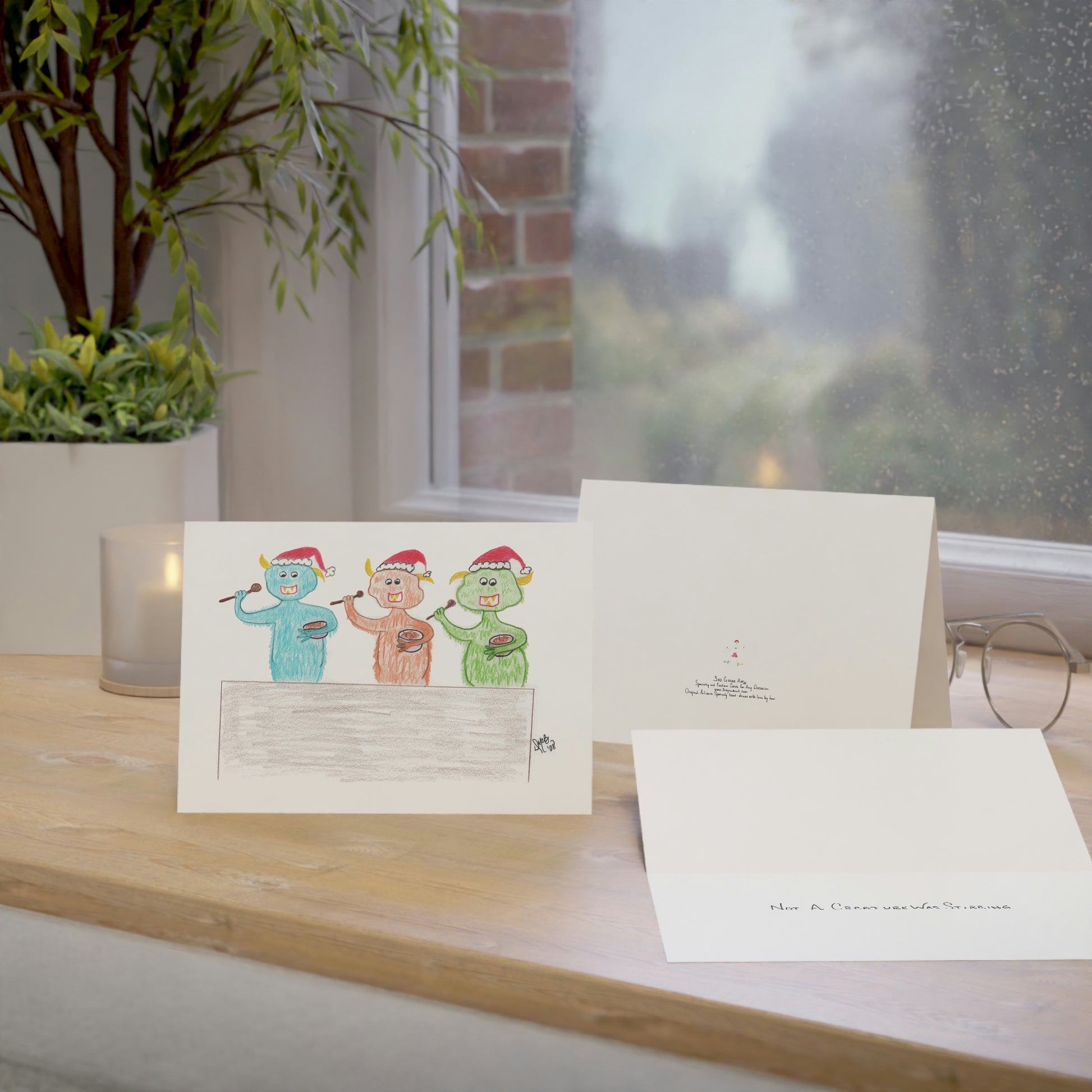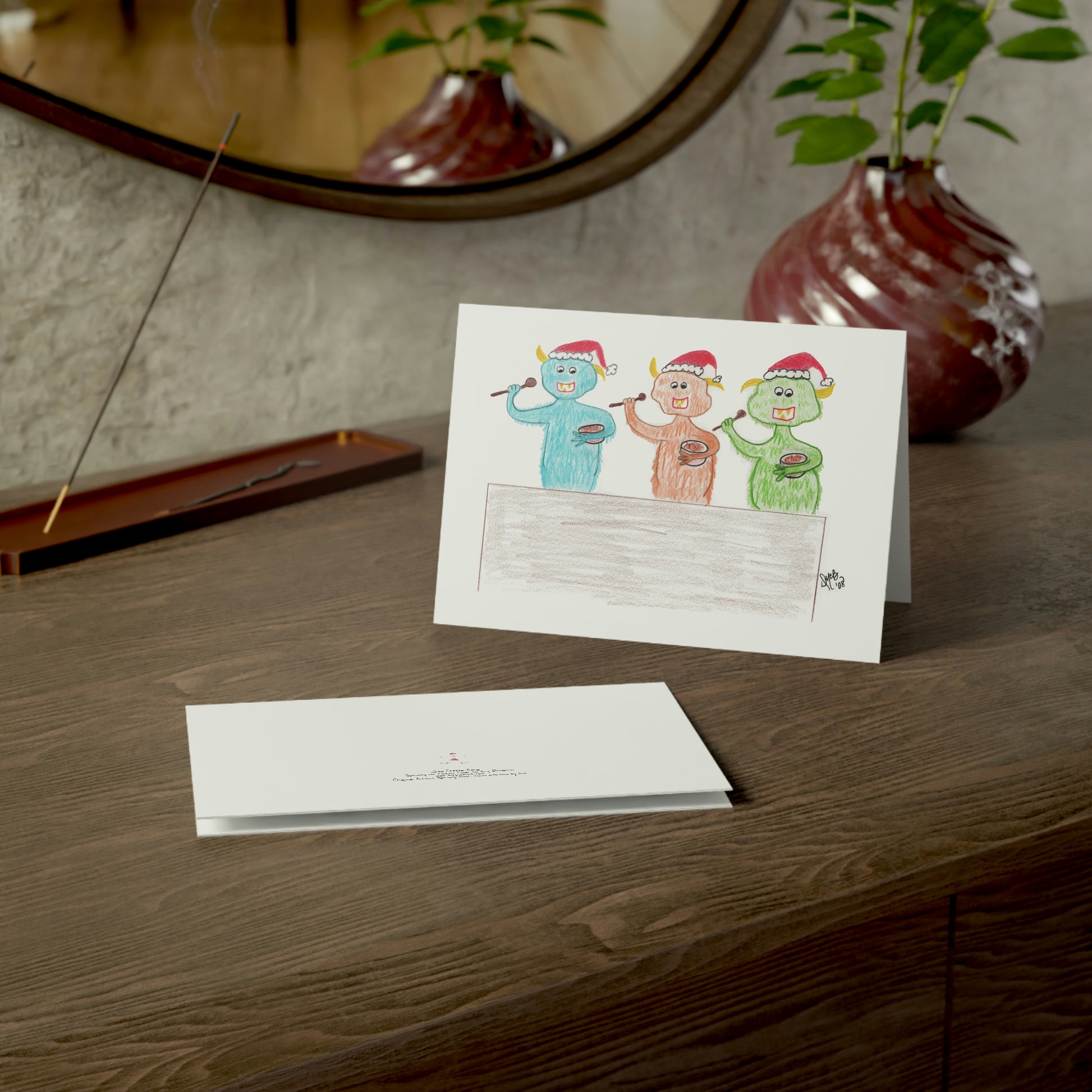 5x7 landscape greeting card – Not a Creature Was Stirring - Three festive little monsters wearing Santa hats holding bowls and spoons, but they have suspended their stirring (at least long enough for the picture to be drawn). This was one of my exclusive designs for personal use, to be released to public after the season that I used it. I like this card for its vibrant colors and happy little creatures on it. Original drawing is colored pencil on paper, scanned in and placed on the card.