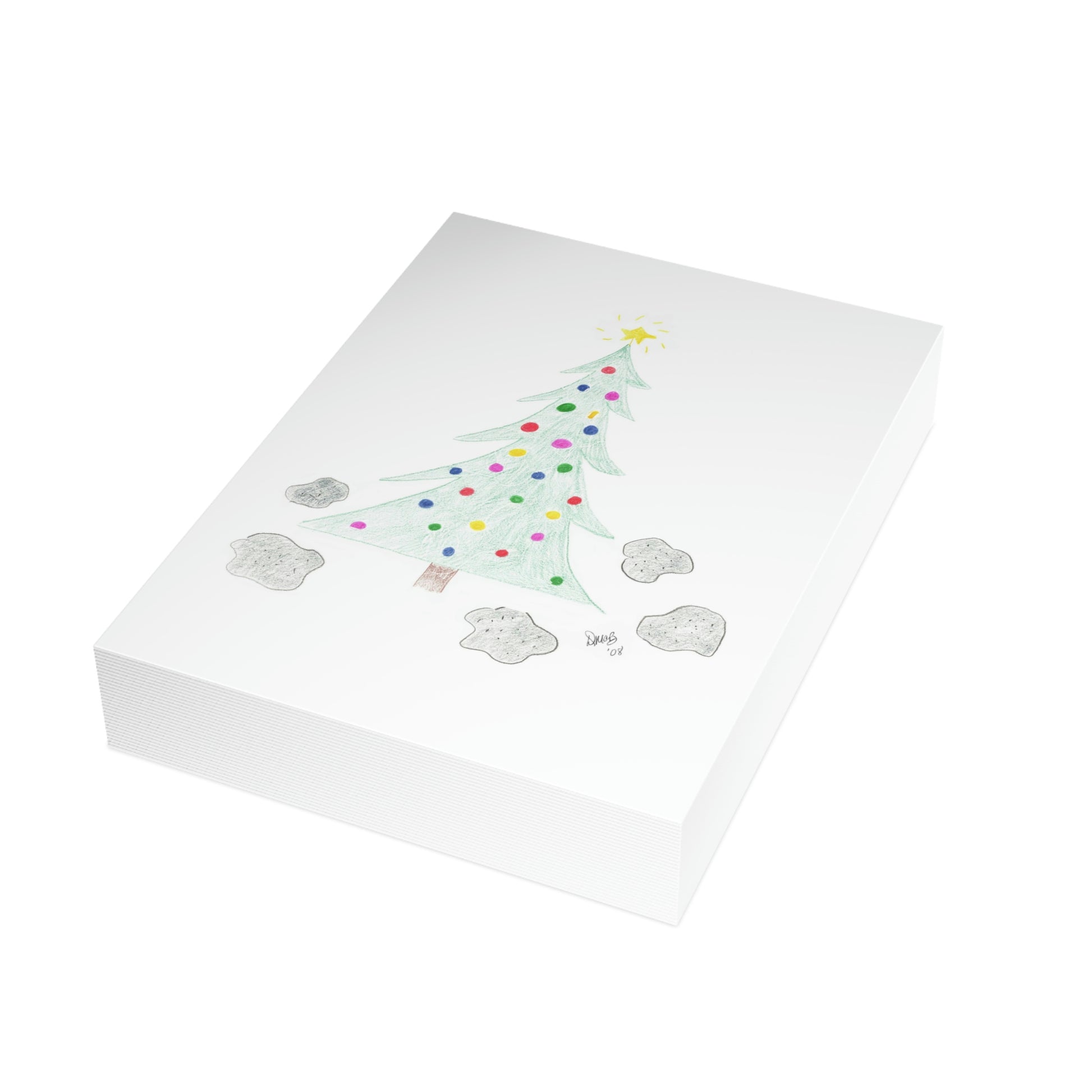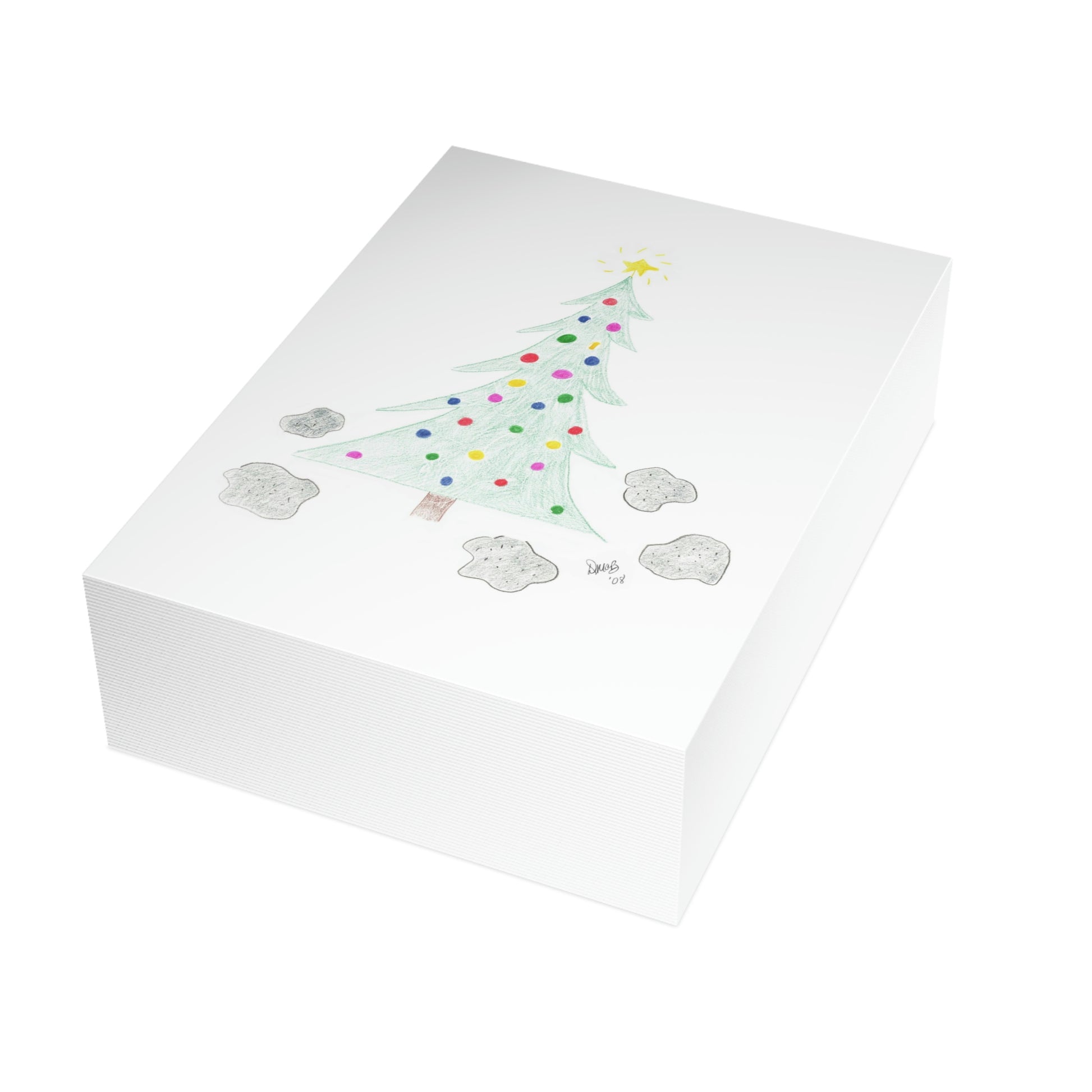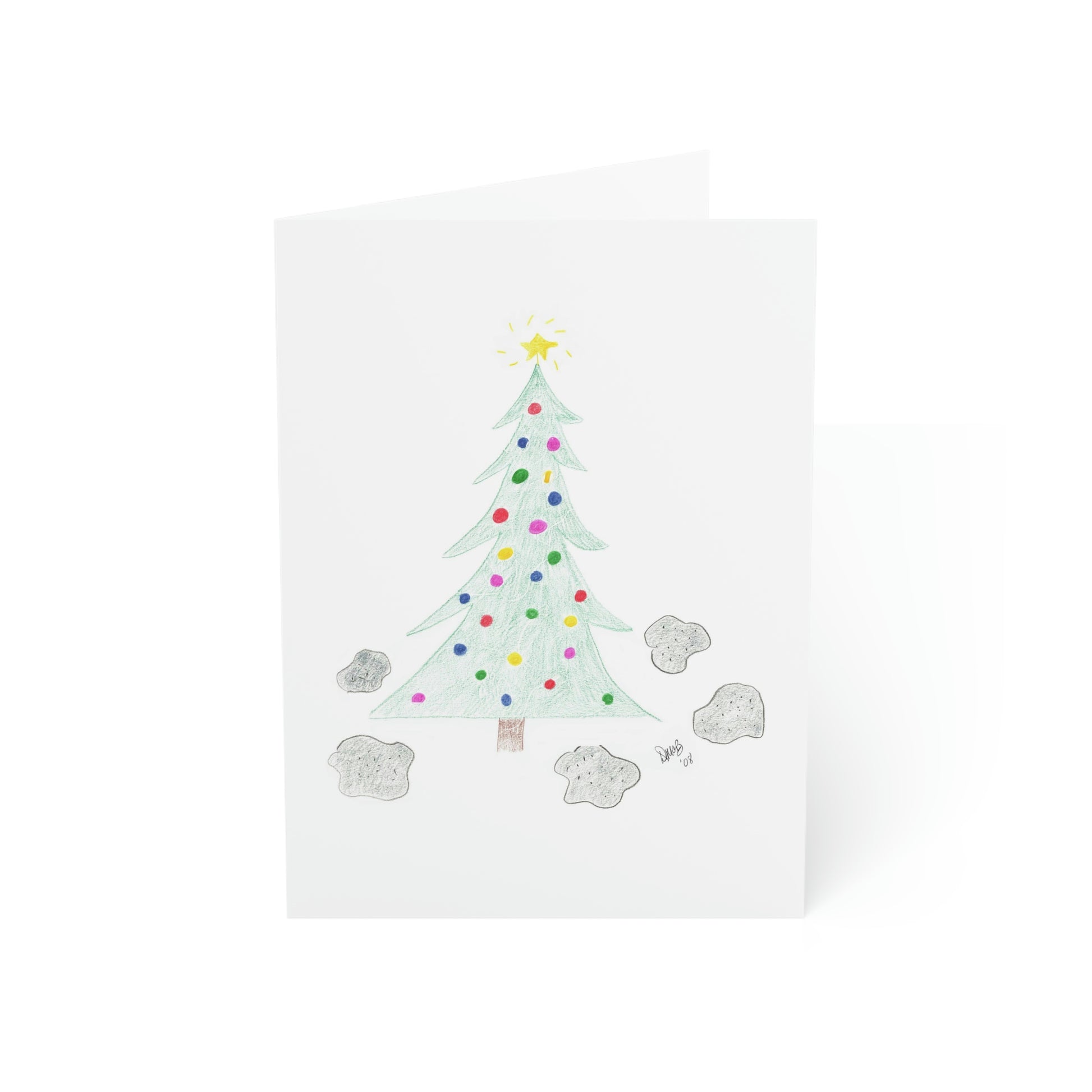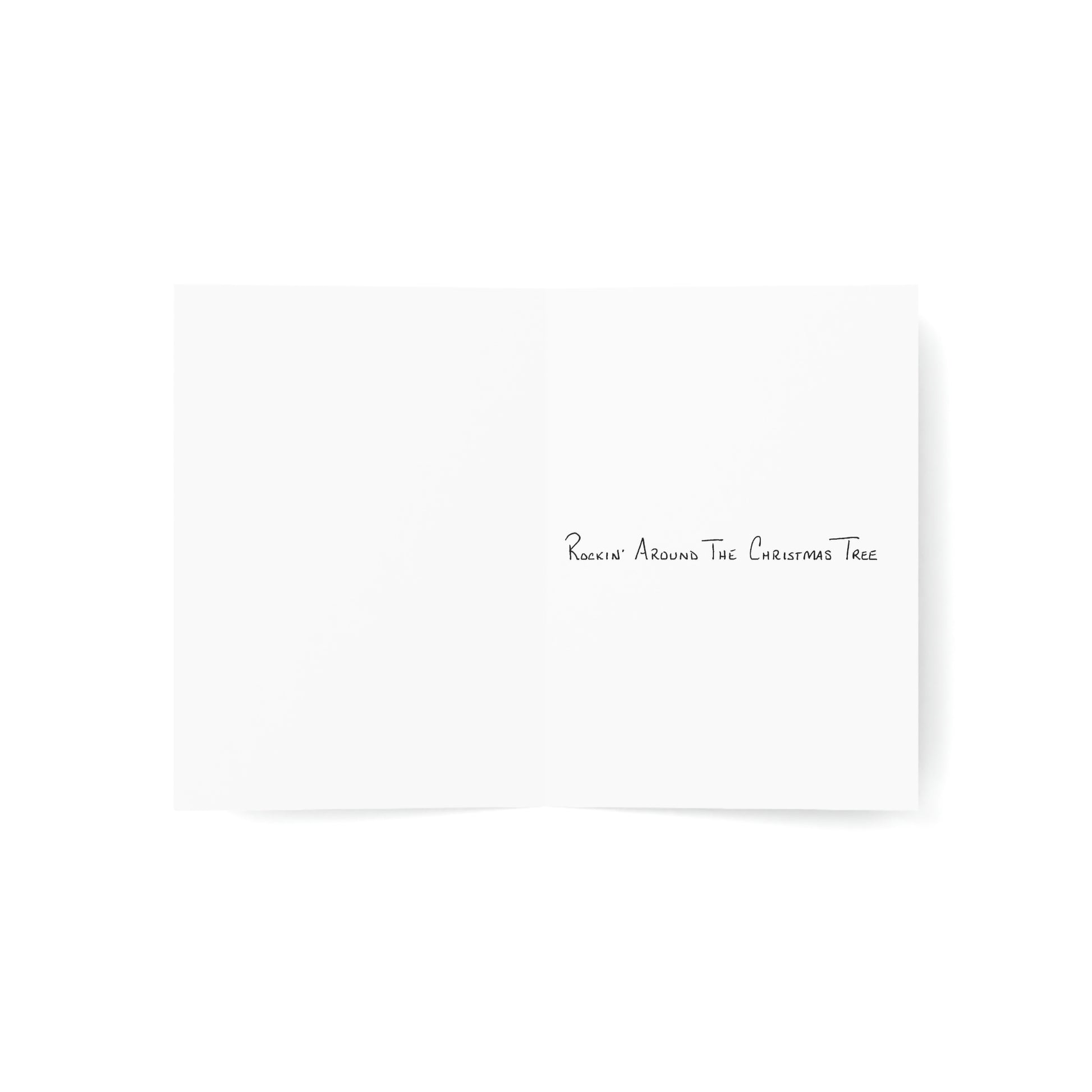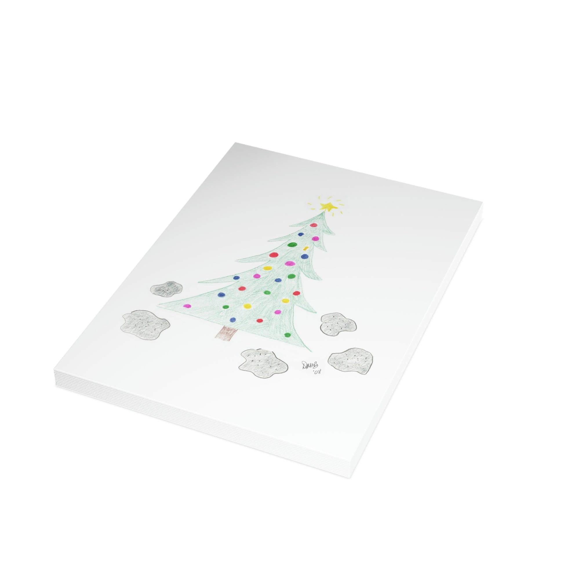 5x7 portrait greeting card – Rockin' Around the Christmas Tree - A festively decorated Christmas tree is surrounded by rocks. Simple drawing for a simple message. Suitable for anyone - Brenda Lee fans, people feeling nostalgic, rock collectors, geologists...the list is endless. Original drawing is colored pencil on paper, scanned in and placed on the card.