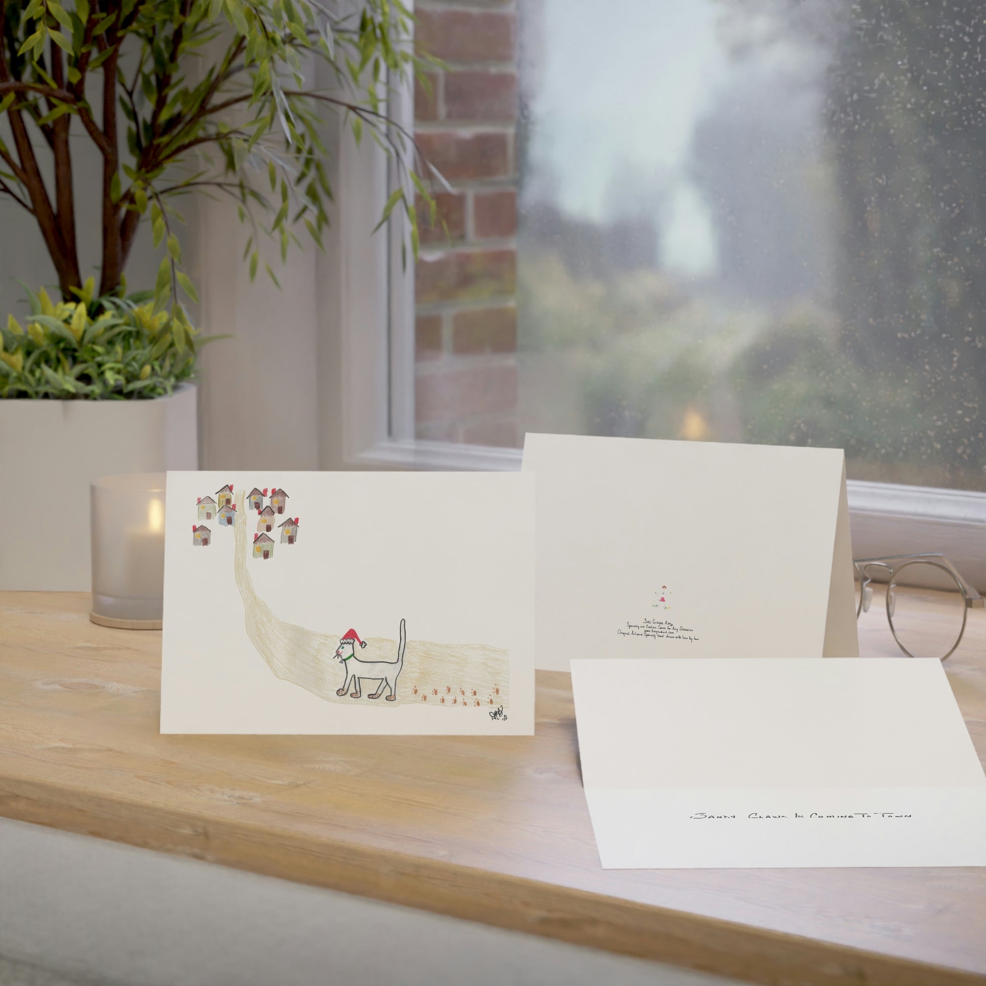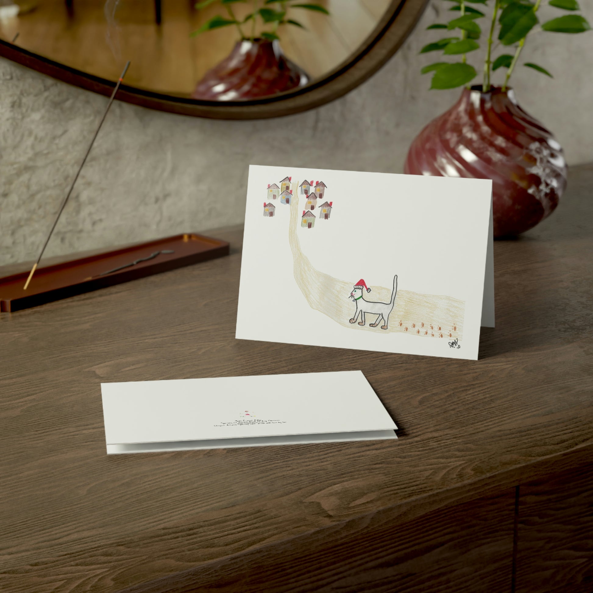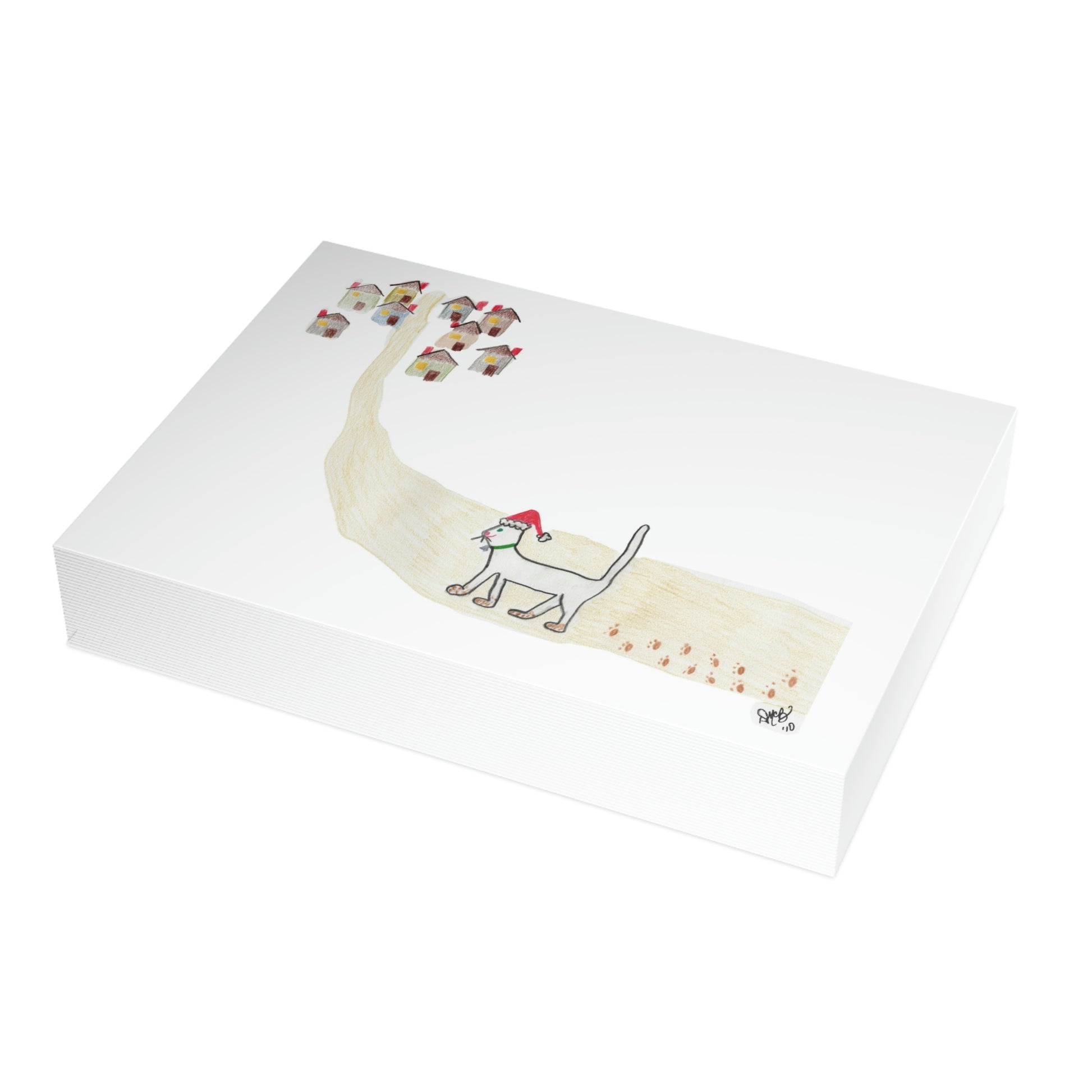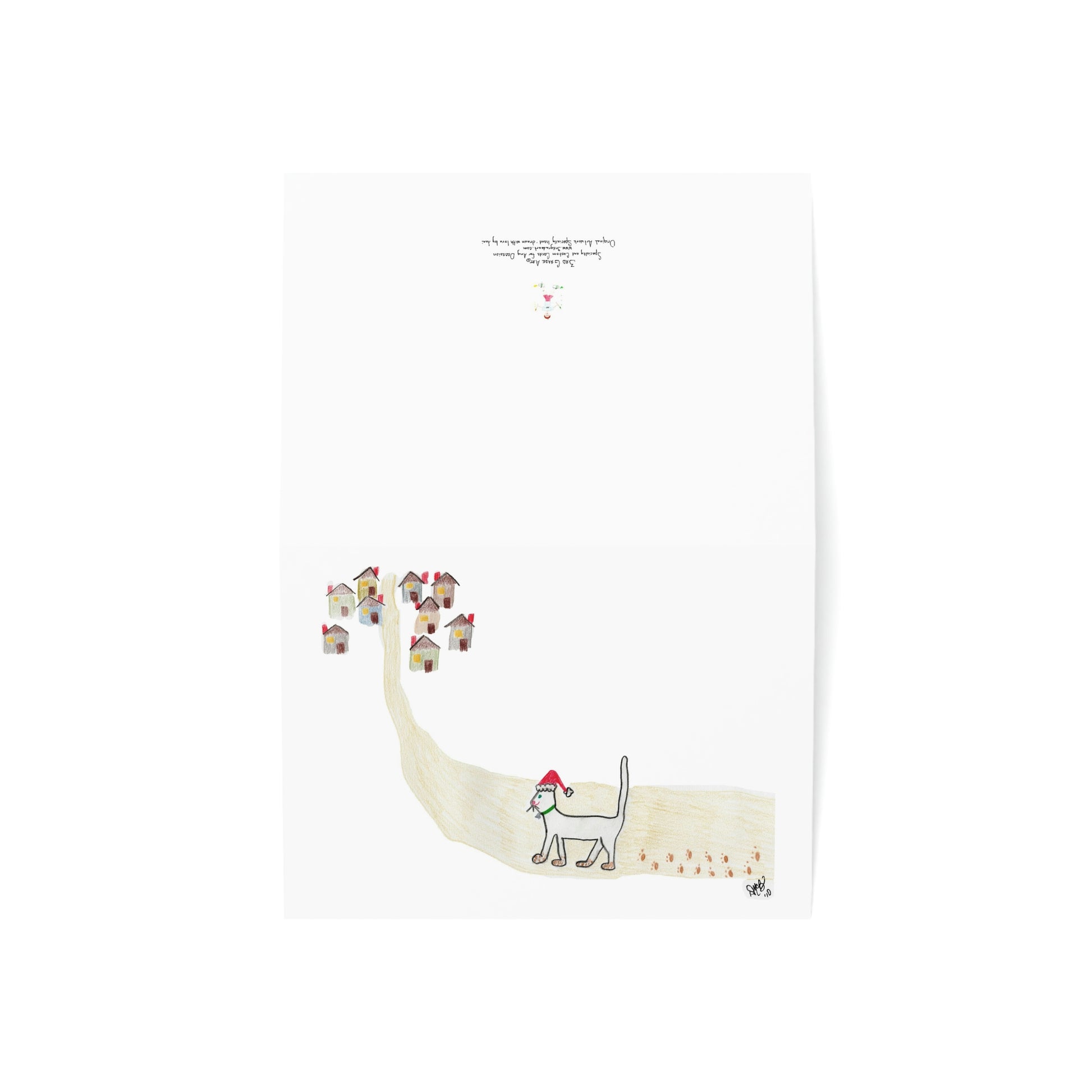 5x7 landscape greeting card – Sandy Claws is Coming to Town - A happy little cat casually strolls way to a town. He is wearing a Santa hat and has sandy little feet, leaving paw prints in his wake. This was one of my cards produced for personal use and released to public at a later time. I really like this one; the little kitty is so happy and cute, and seems to not have a care in the world. And he's probably thinking about all the dirt/sand he can track into your home, because let's face it - cats are evil. Original drawing is colored pencil on paper, scanned in and placed on the card.