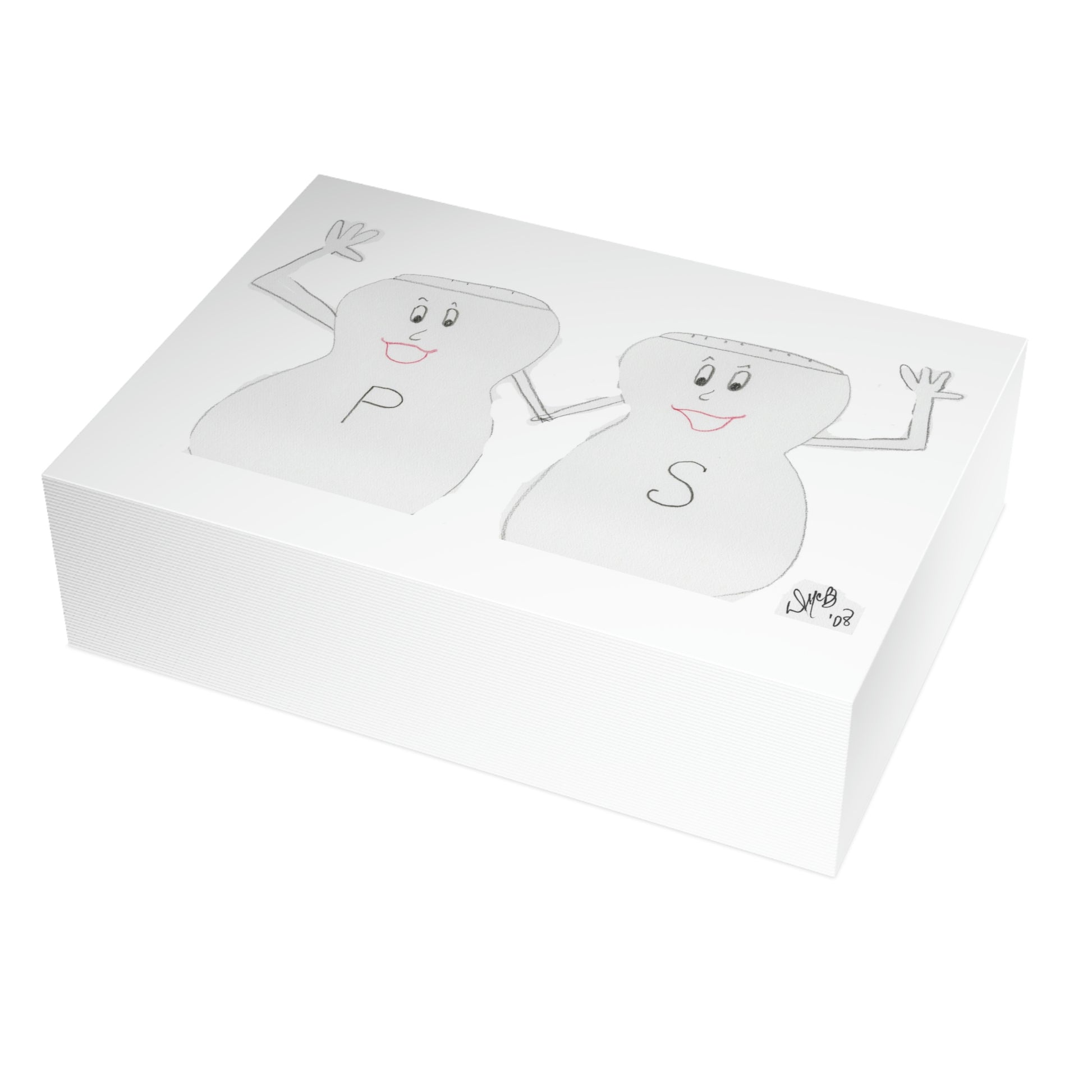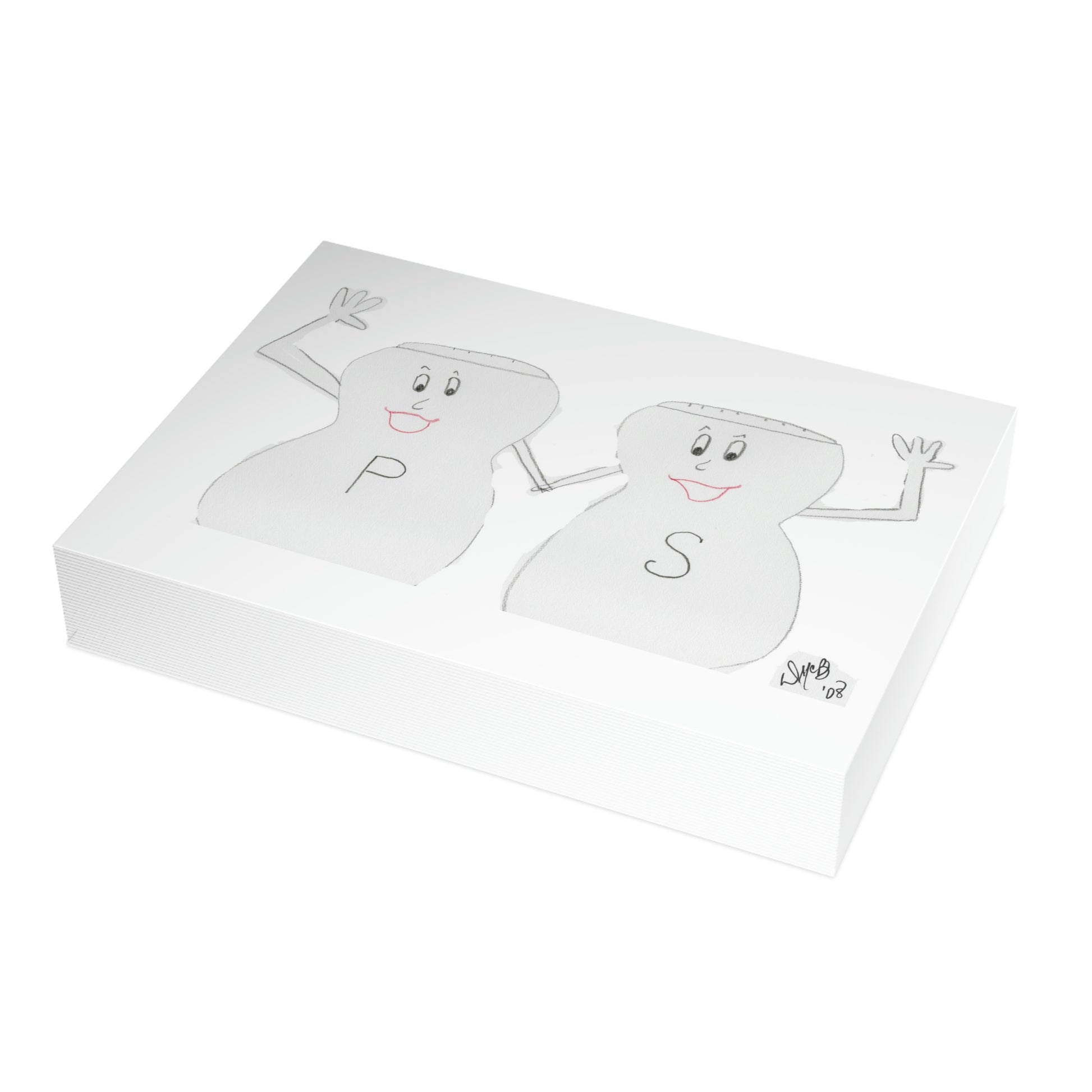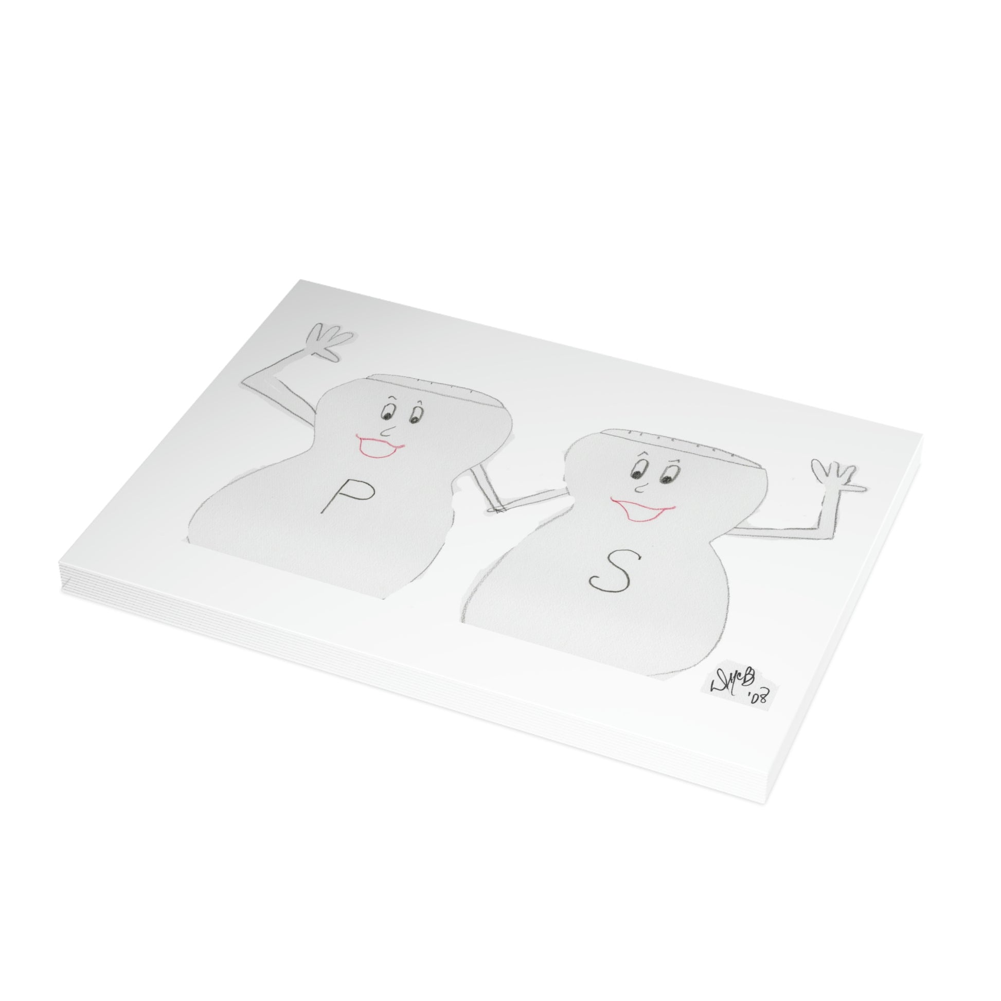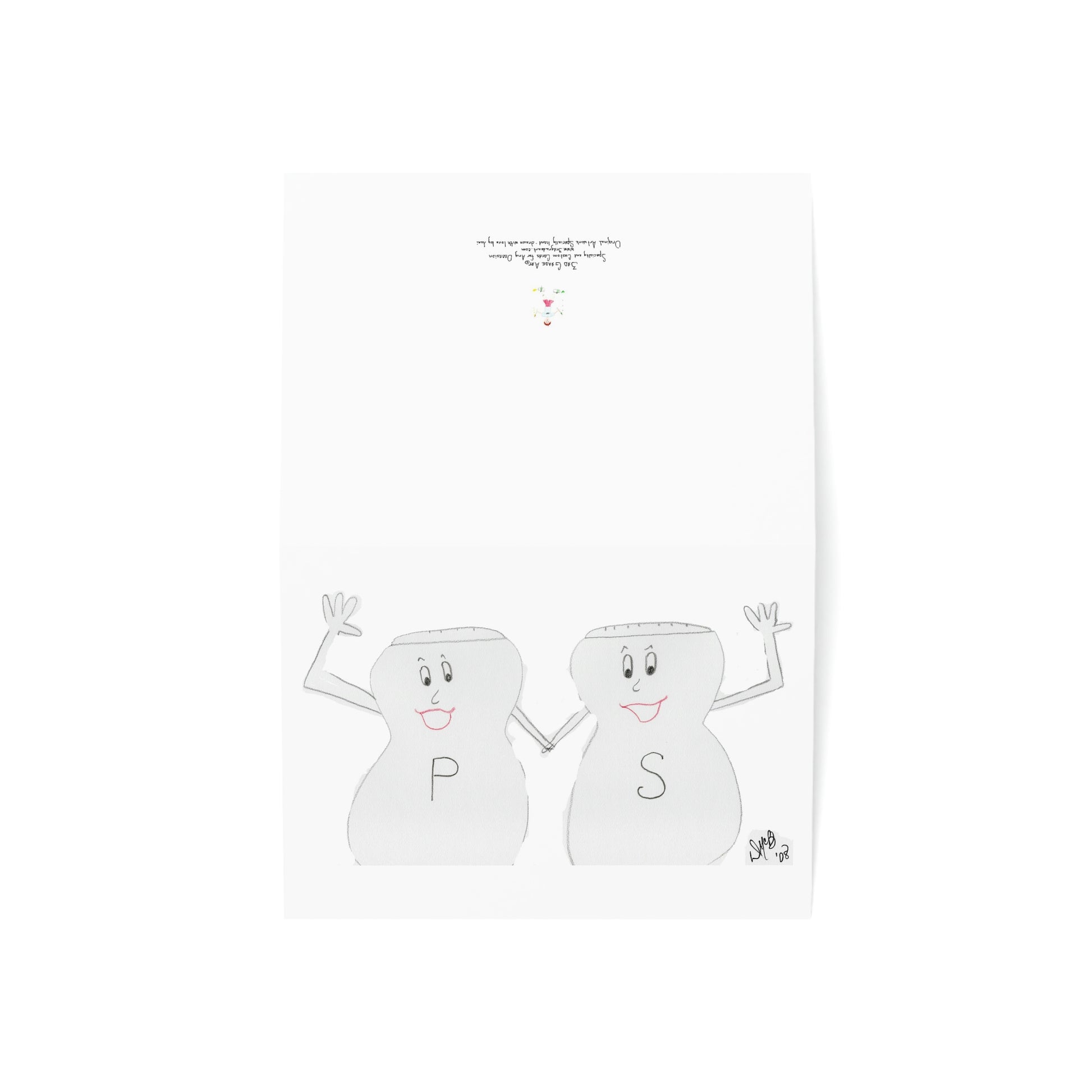 5x7 landscape greeting card – Season's Greetings - A cute little pair of Salt & Pepper shakers giving a friendly waive. What a nice greeting from the seasonings! The happy pair is holding hands and enthusiastically waiving - to wish one well during the holiday season. Original drawing is colored pencil on paper, scanned in and placed on the card.