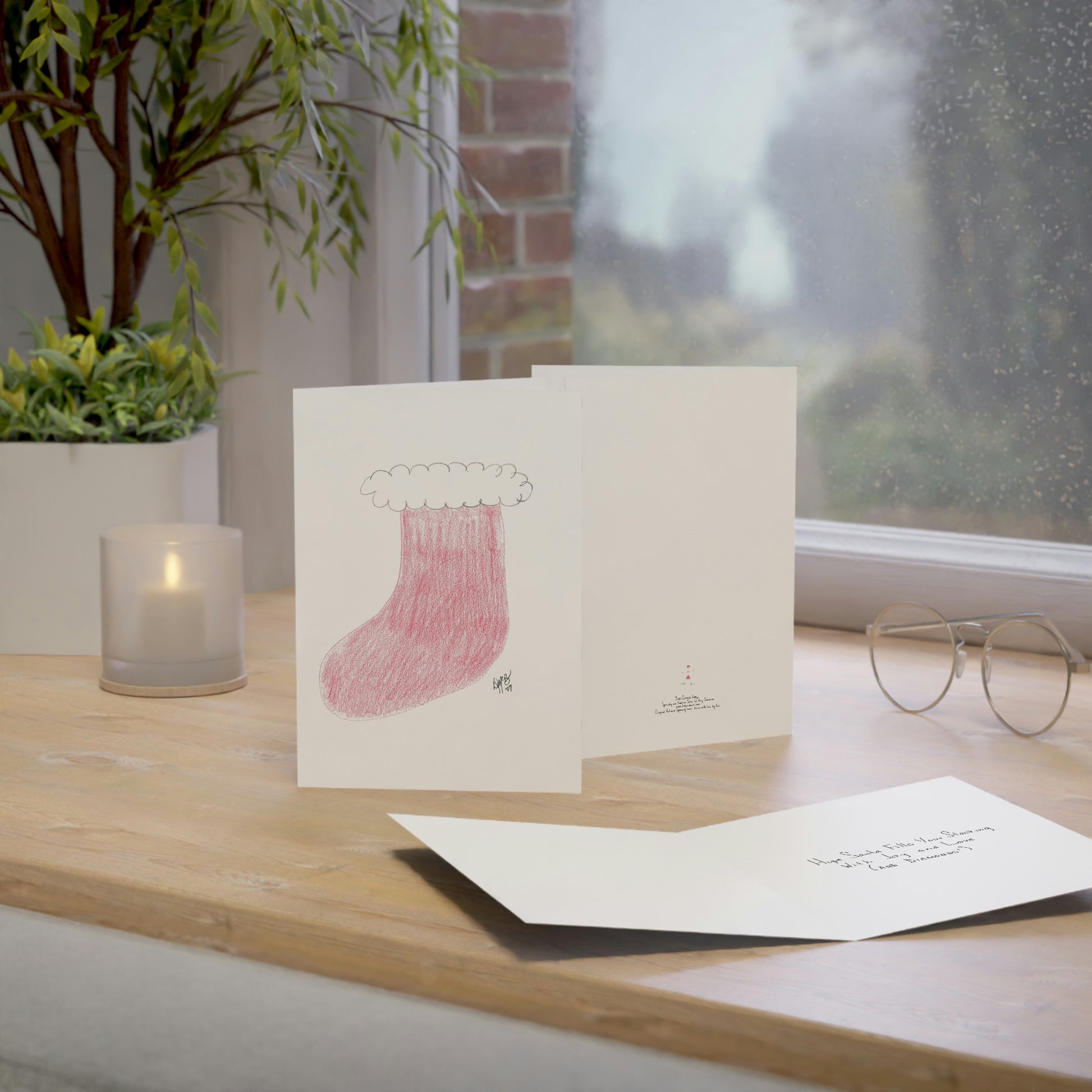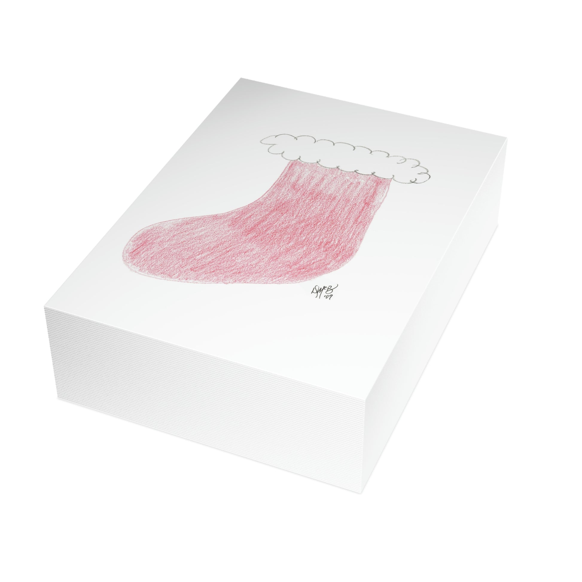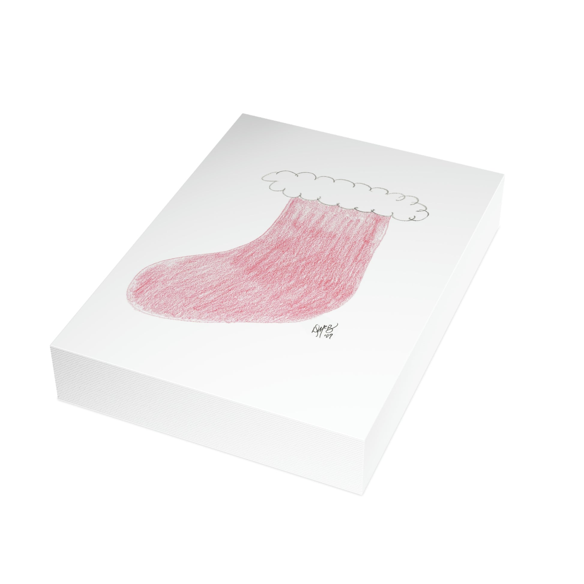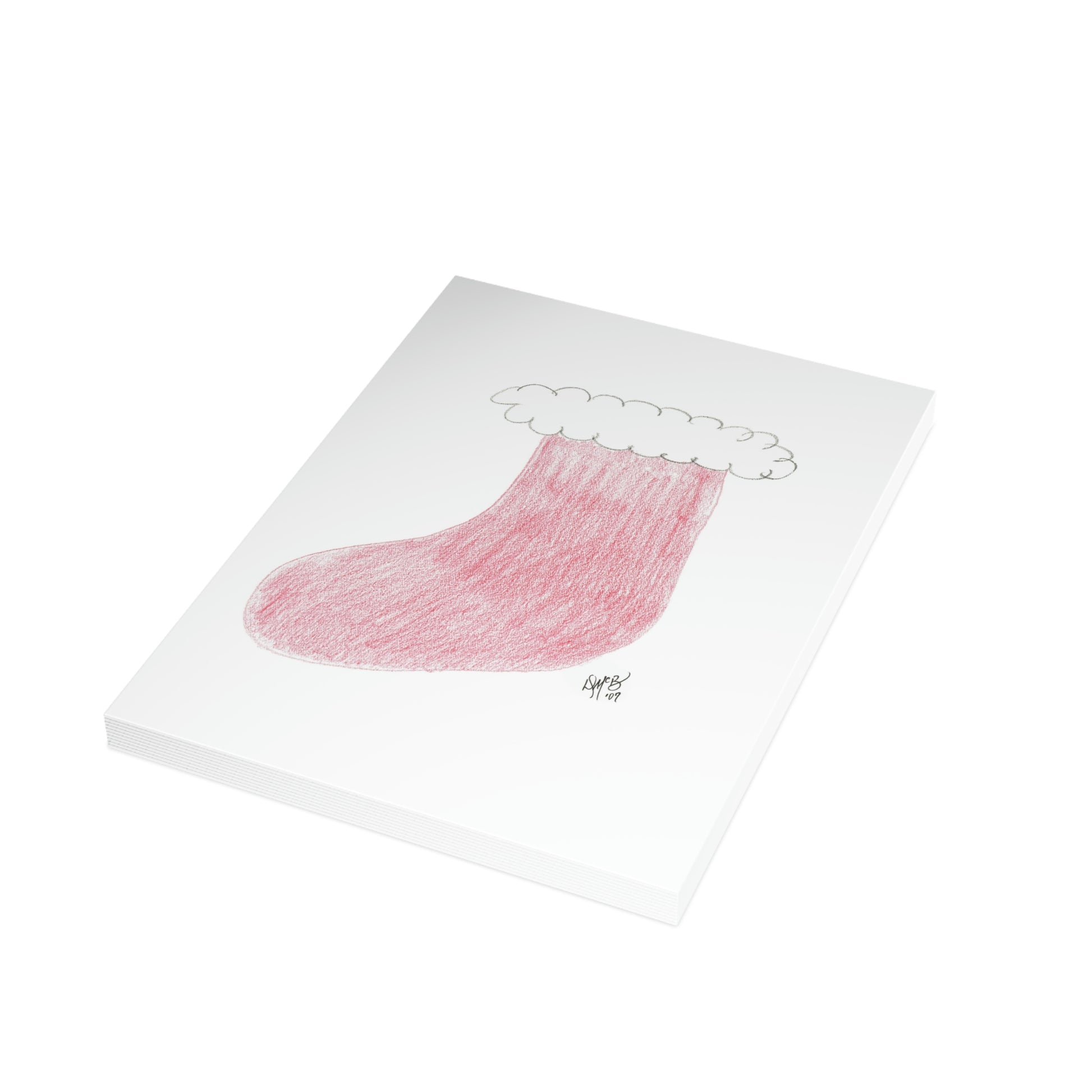 5x7 portrait greeting card – Hope Santa Fills Your Stocking With Joy and Love (And Diamonds) - a red Christmas stocking with white fluffy trim. It conveys the hope that in the morning it will be filled with awesome loot. What's the best thing you ever got in your stocking? What's the worst? This card invokes reminiscence of happy times, hope, anticipation, magic, and belief in Santa. Original drawing is colored pencil on paper, scanned in and placed on the card.