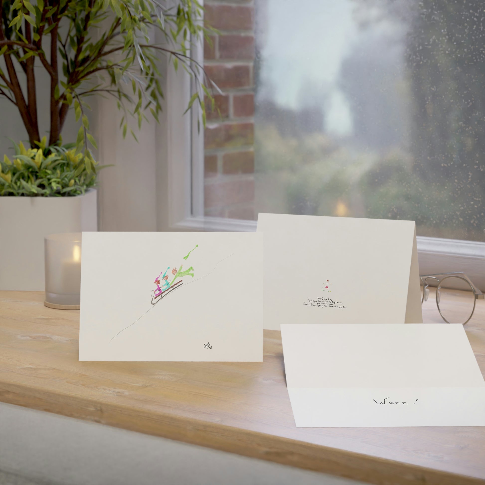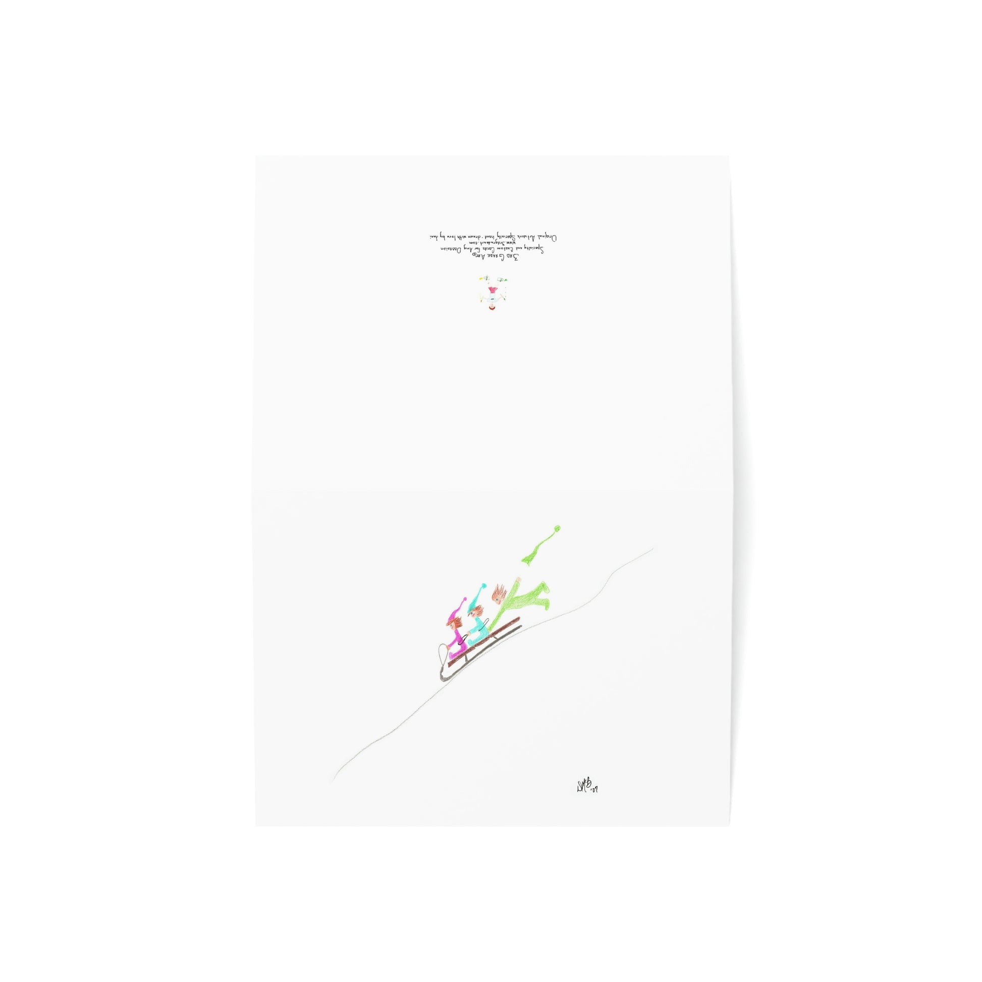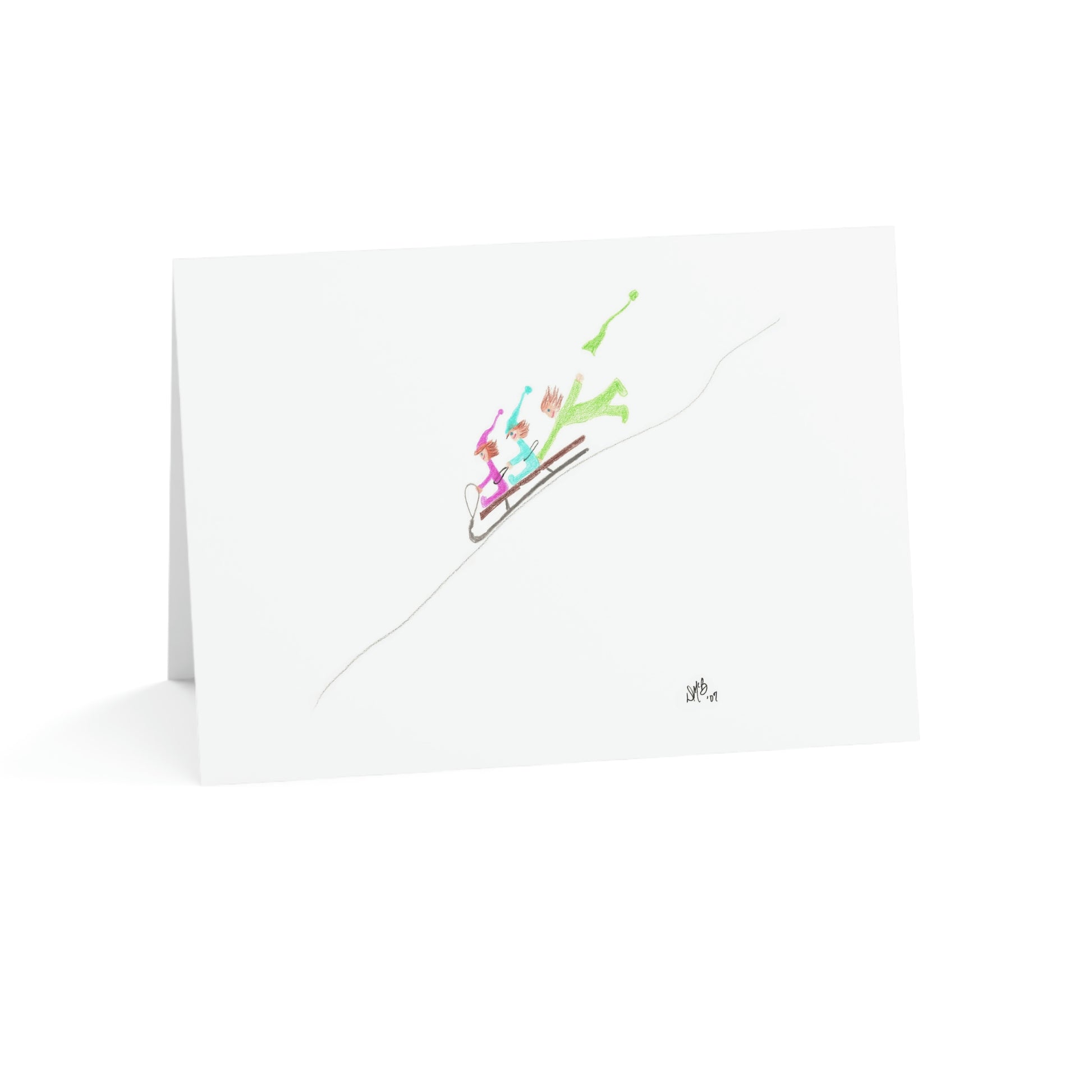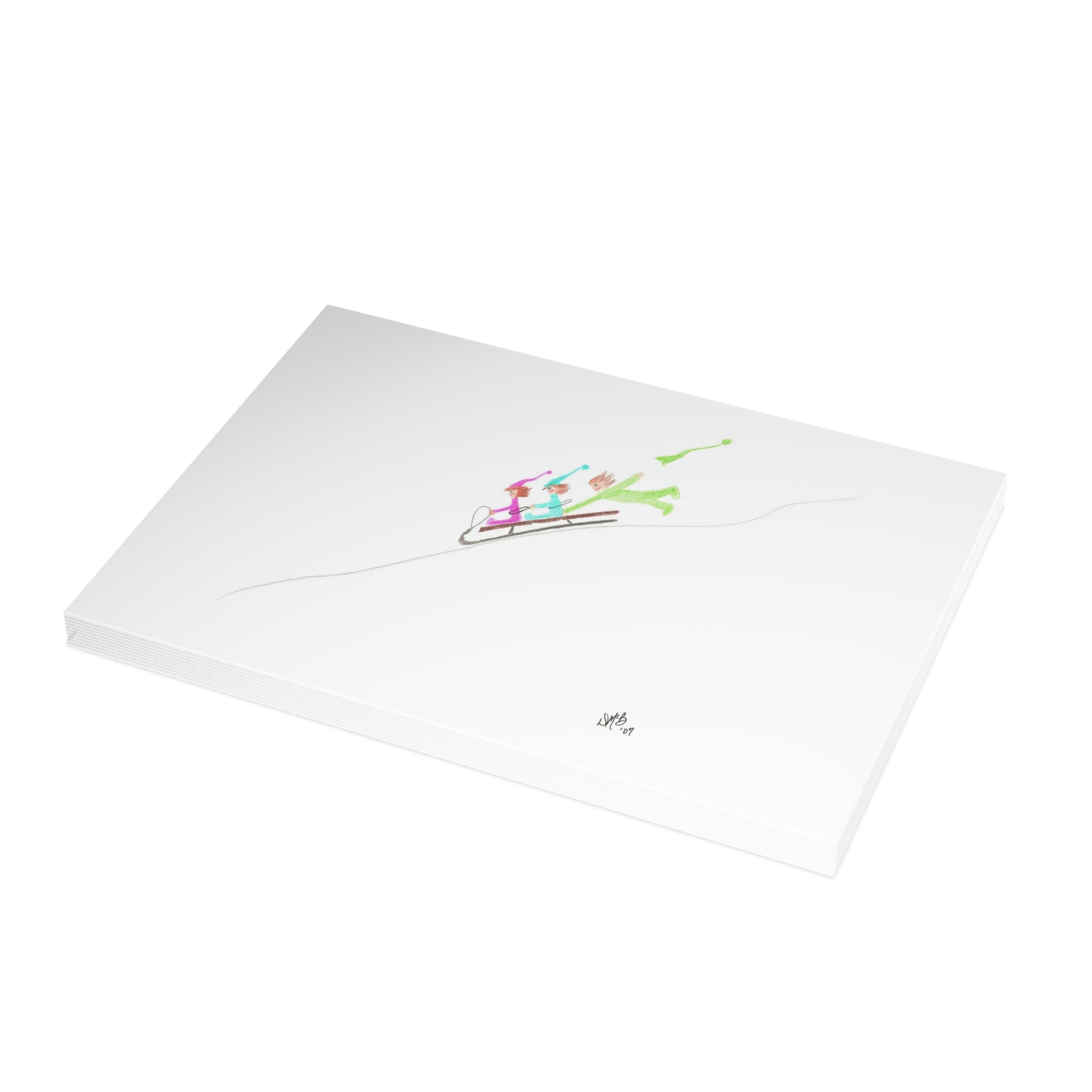 5x7 landscape greeting card – Whee! - Three children careening down a snowy slope on a sled - one flying off the back, holding onto the middle one. His/her stocking cap is flying off into the wind. This is my mom's favorite card of all that I have ever drawn, so it holds a special place in my heart. Simplicity and vibrant colors look great on a white background. Original drawing is colored pencil on paper, scanned in and placed on the card.