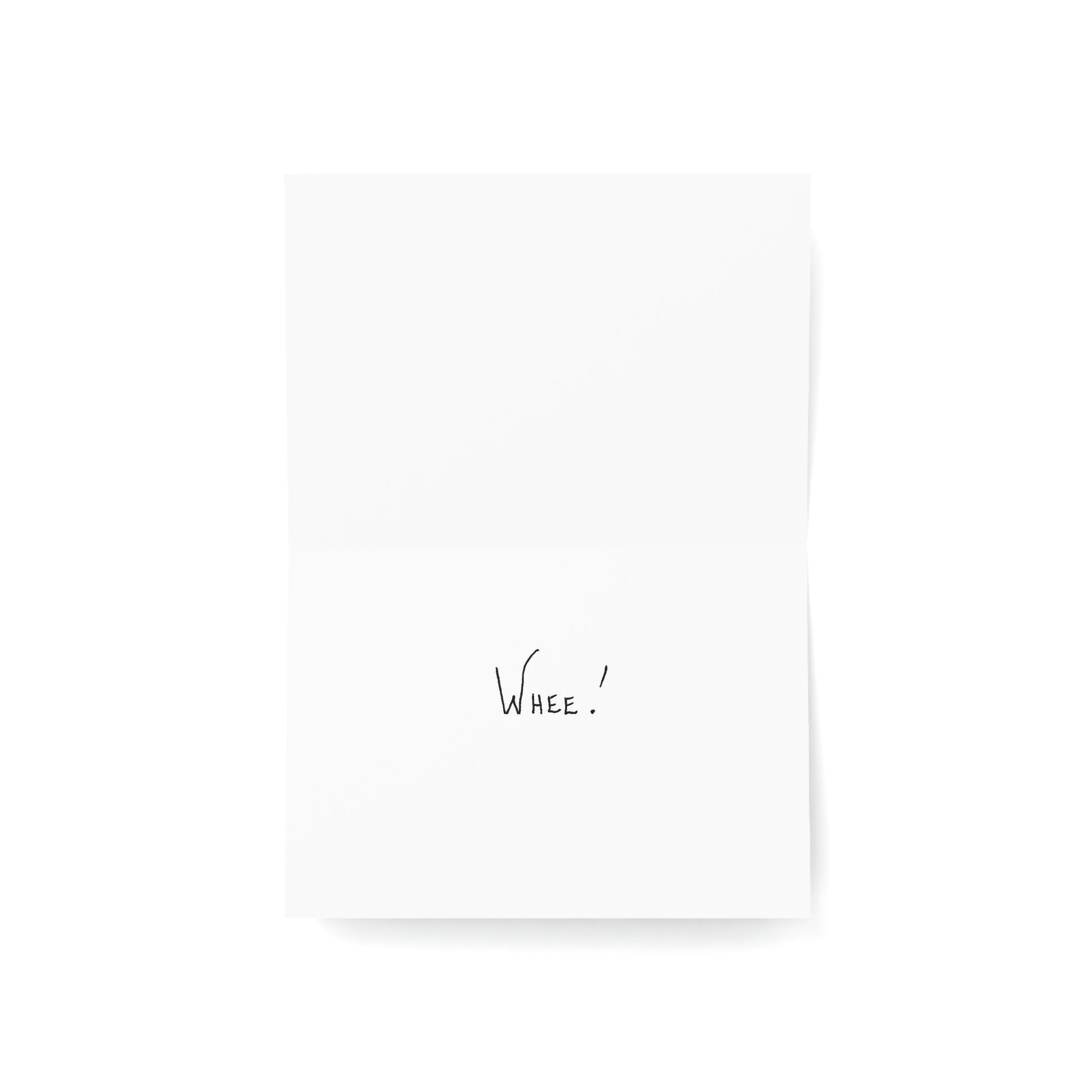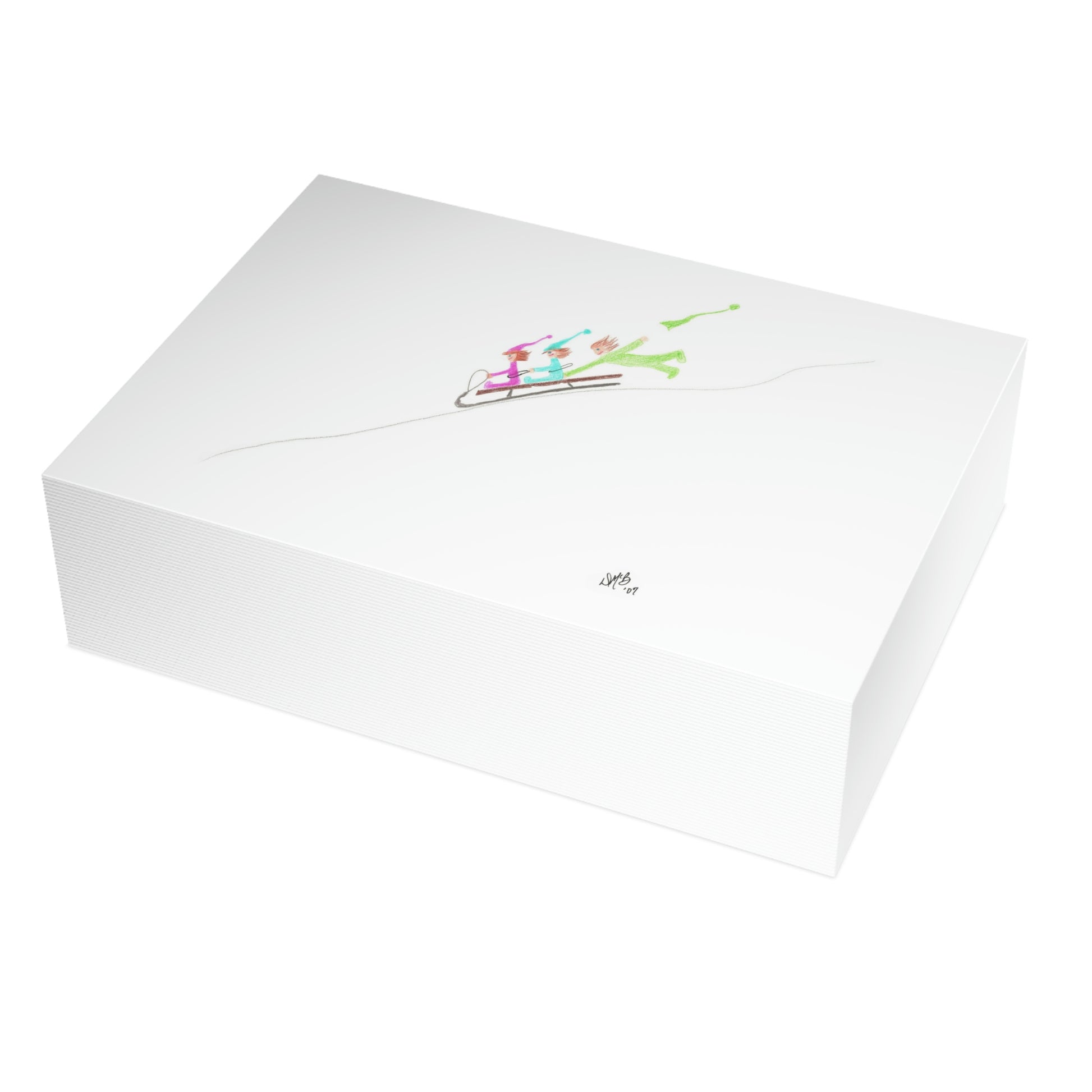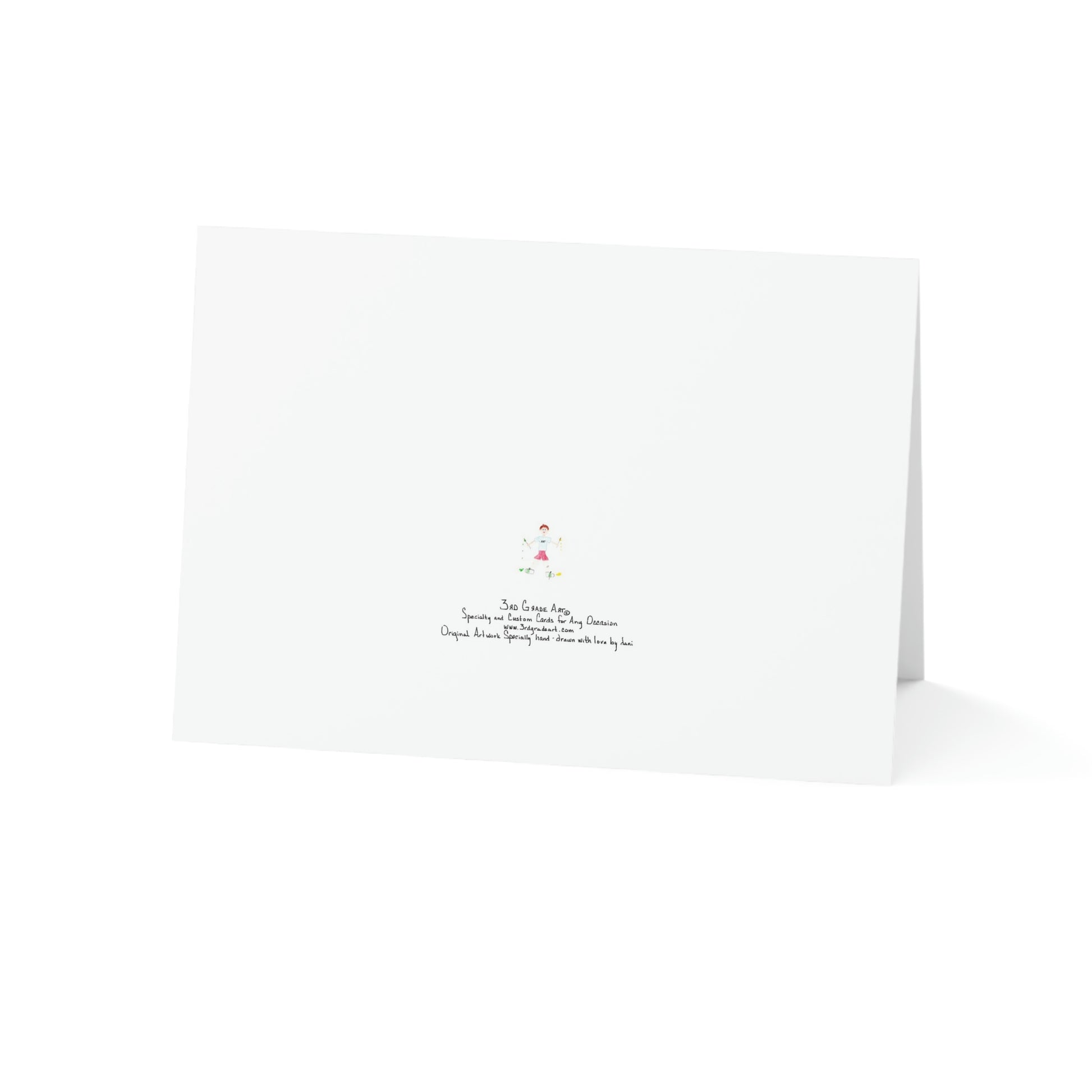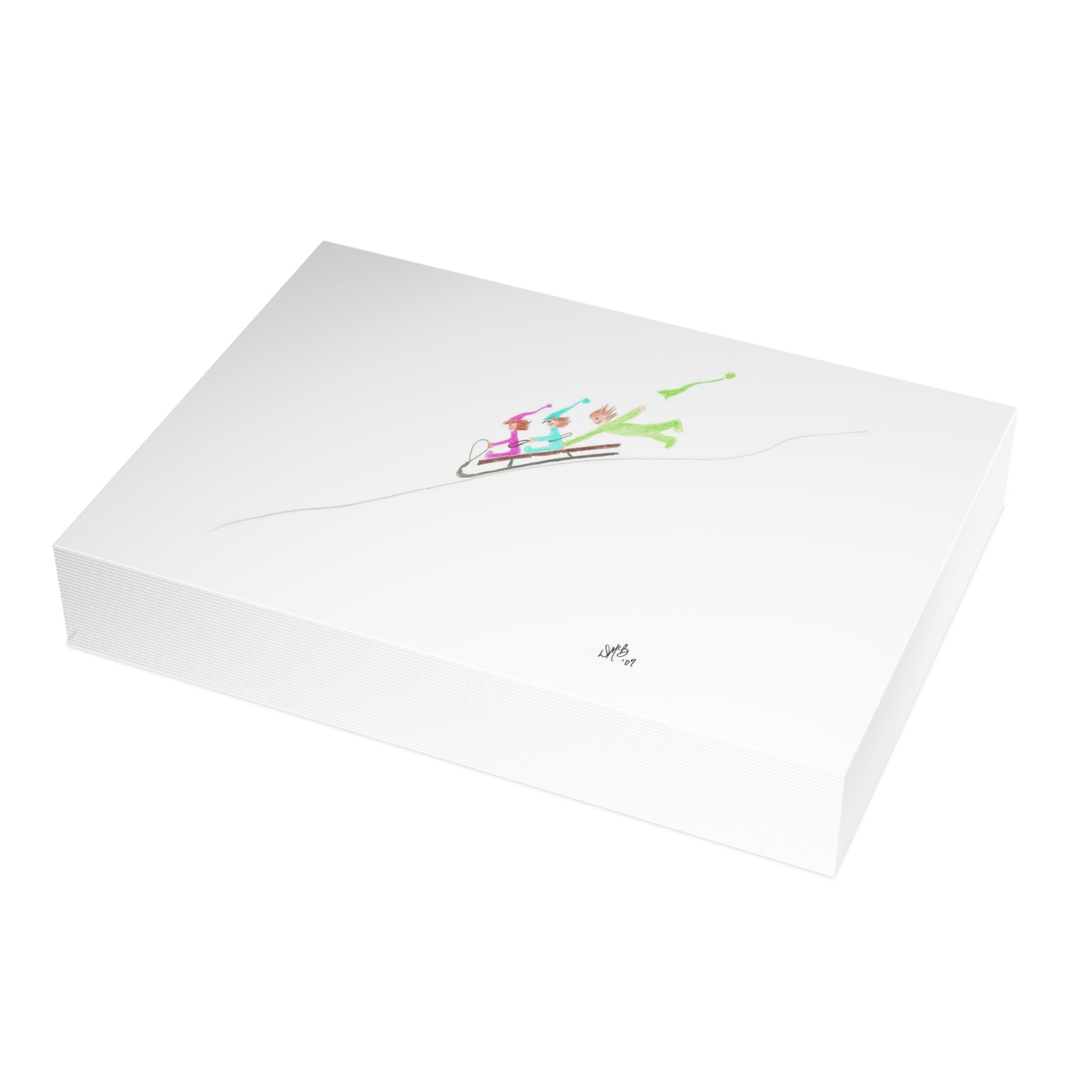 5x7 landscape greeting card – Whee! - Three children careening down a snowy slope on a sled - one flying off the back, holding onto the middle one. His/her stocking cap is flying off into the wind. This is my mom's favorite card of all that I have ever drawn, so it holds a special place in my heart. Simplicity and vibrant colors look great on a white background. Original drawing is colored pencil on paper, scanned in and placed on the card.
