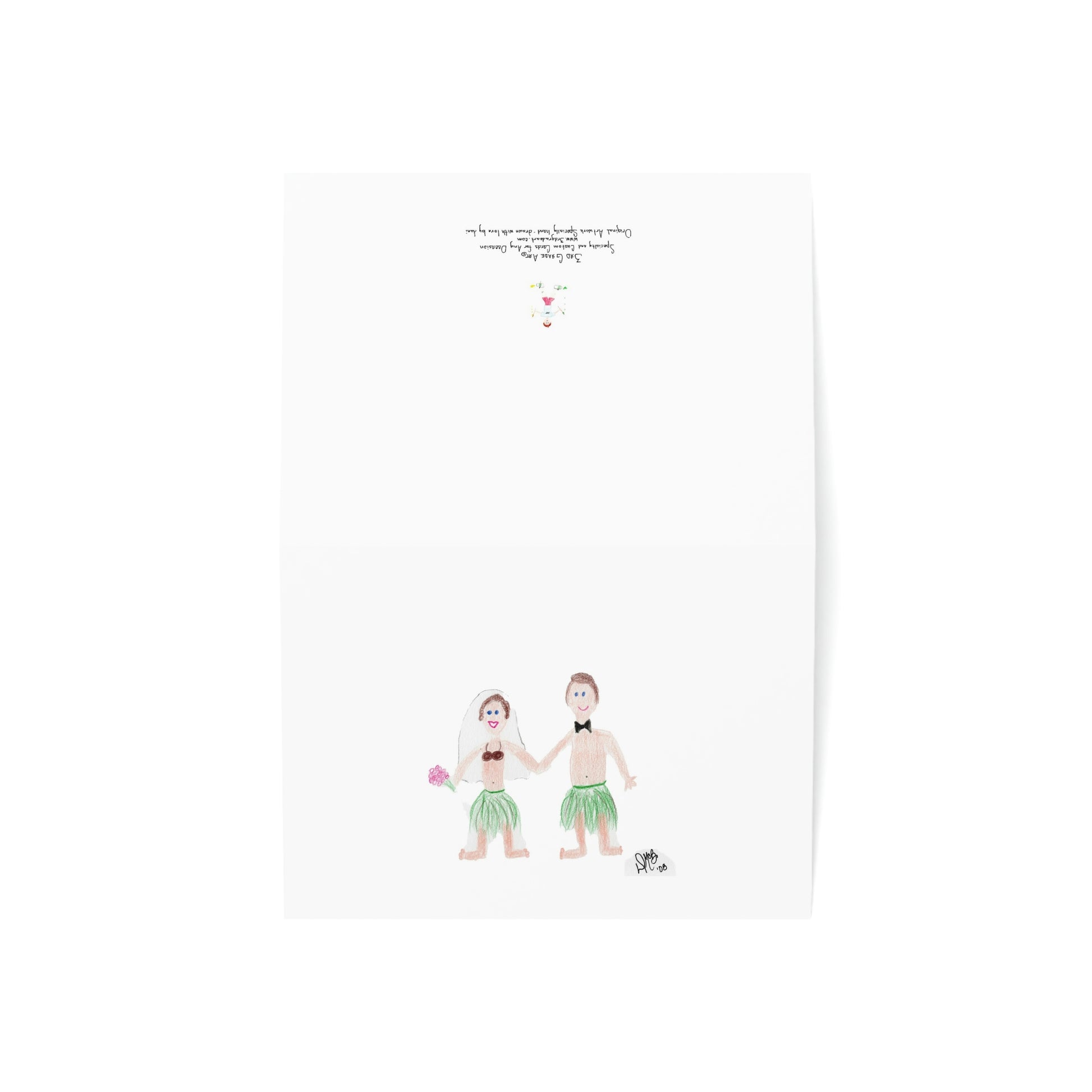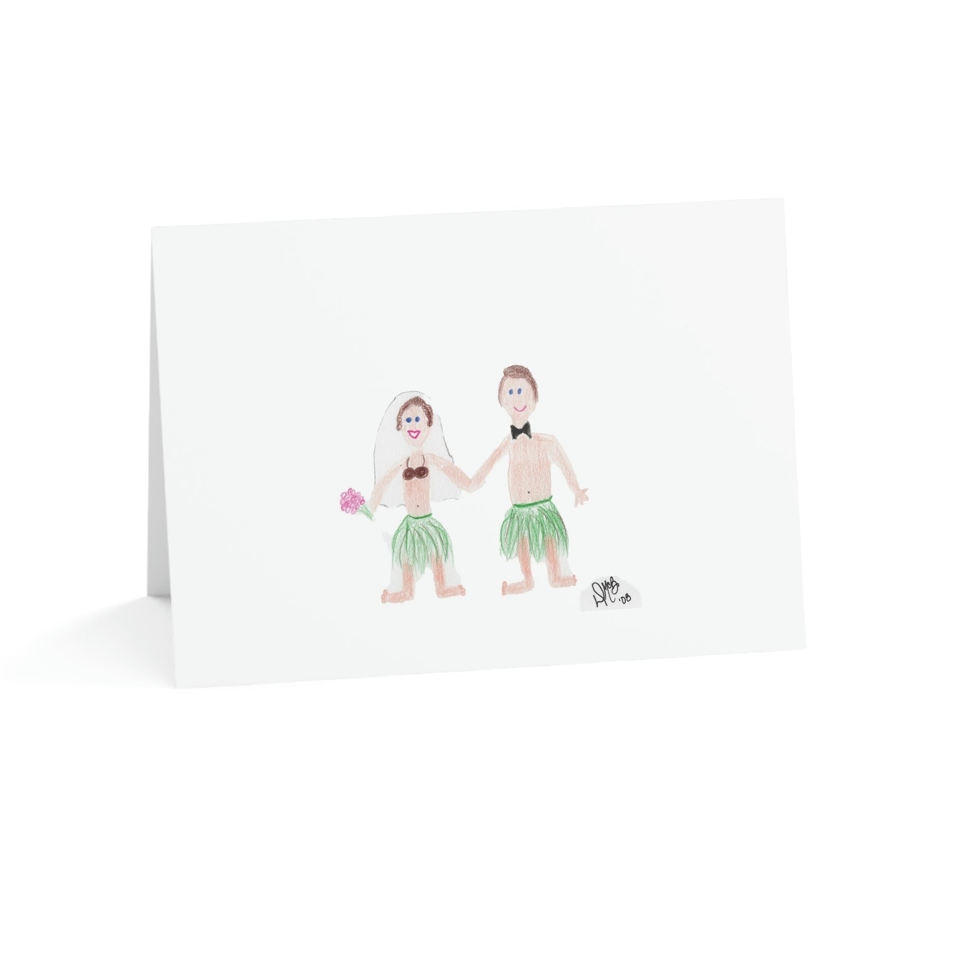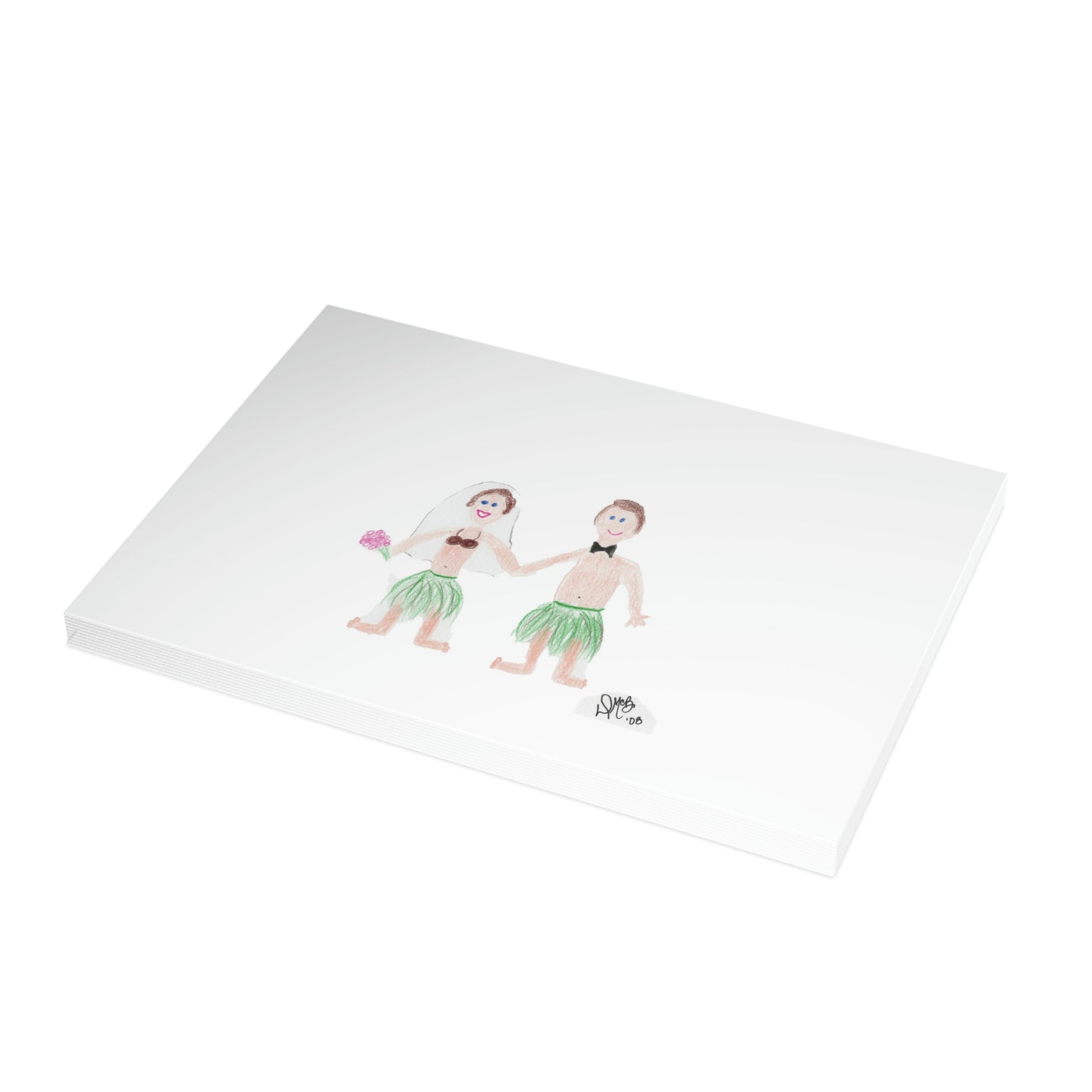 5x7 landscape greeting card – Congratulations on Getting Maui'd - a couple on a beach in grass skirts, the woman in a veil and coconut bra with a bouquet, the man wearing a bow tie. Send a congratulatory message to anyone getting married, whether on Maui or not. It's a fun way to express good luck to the happy couple! Original drawing is colored pencil on paper, scanned in and placed on the card.