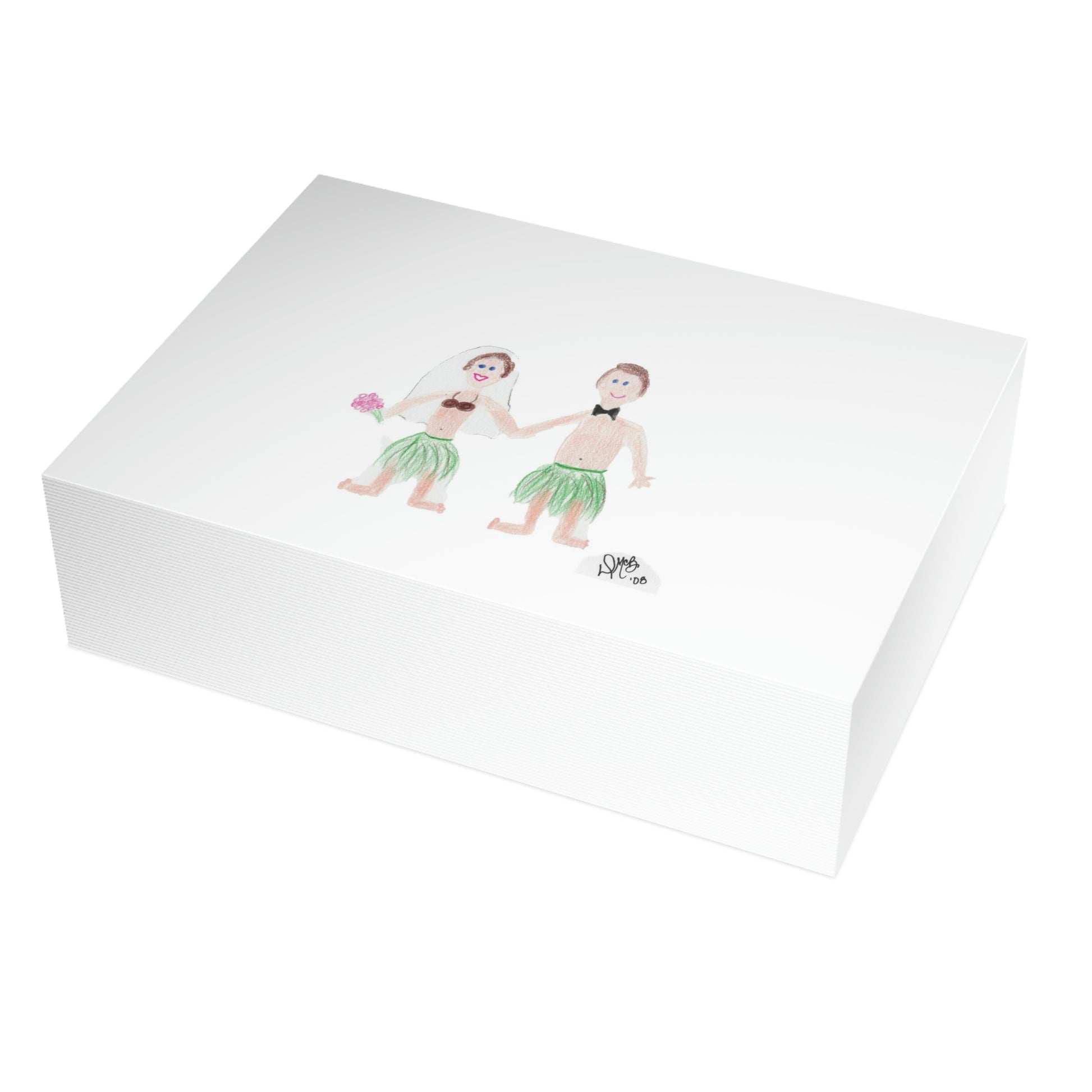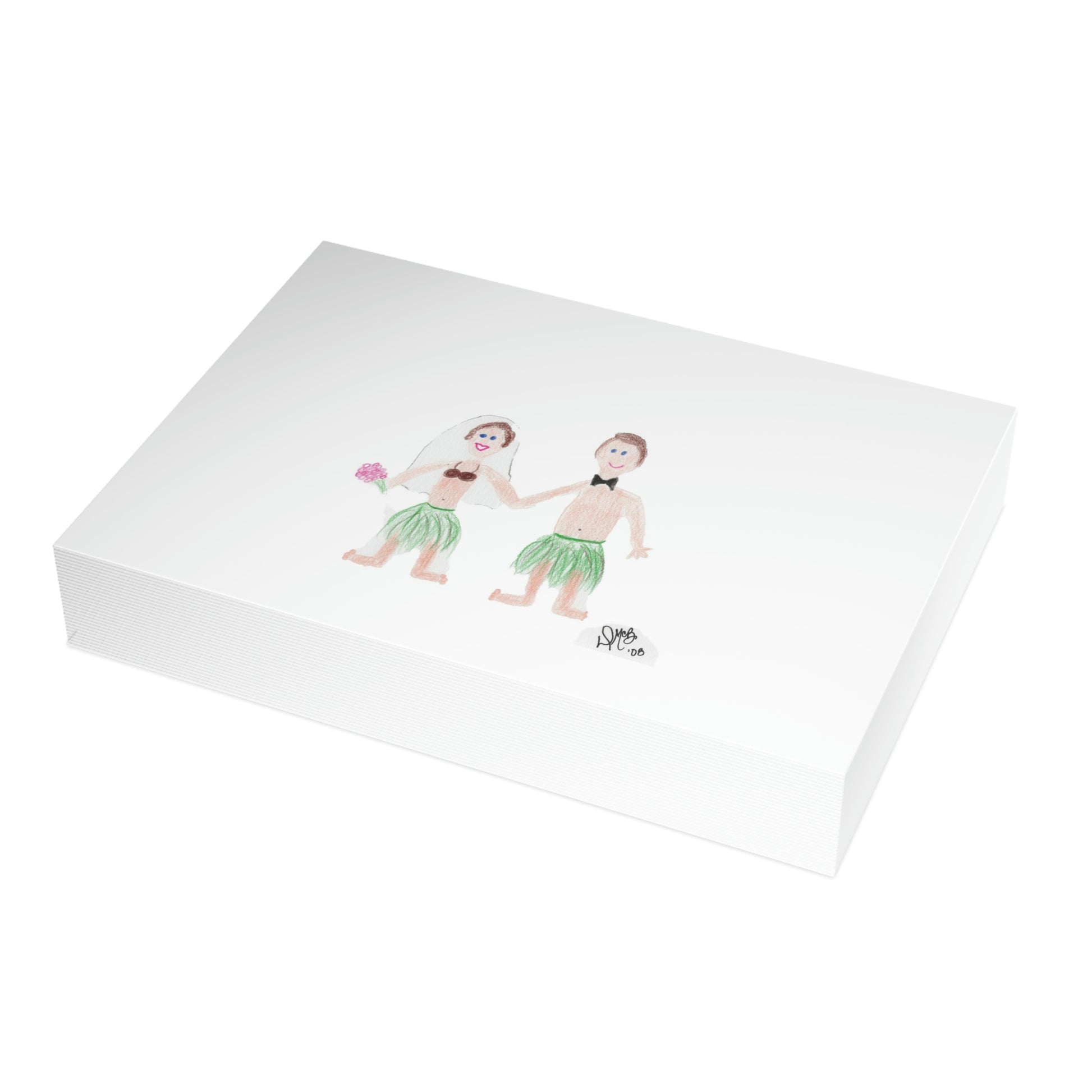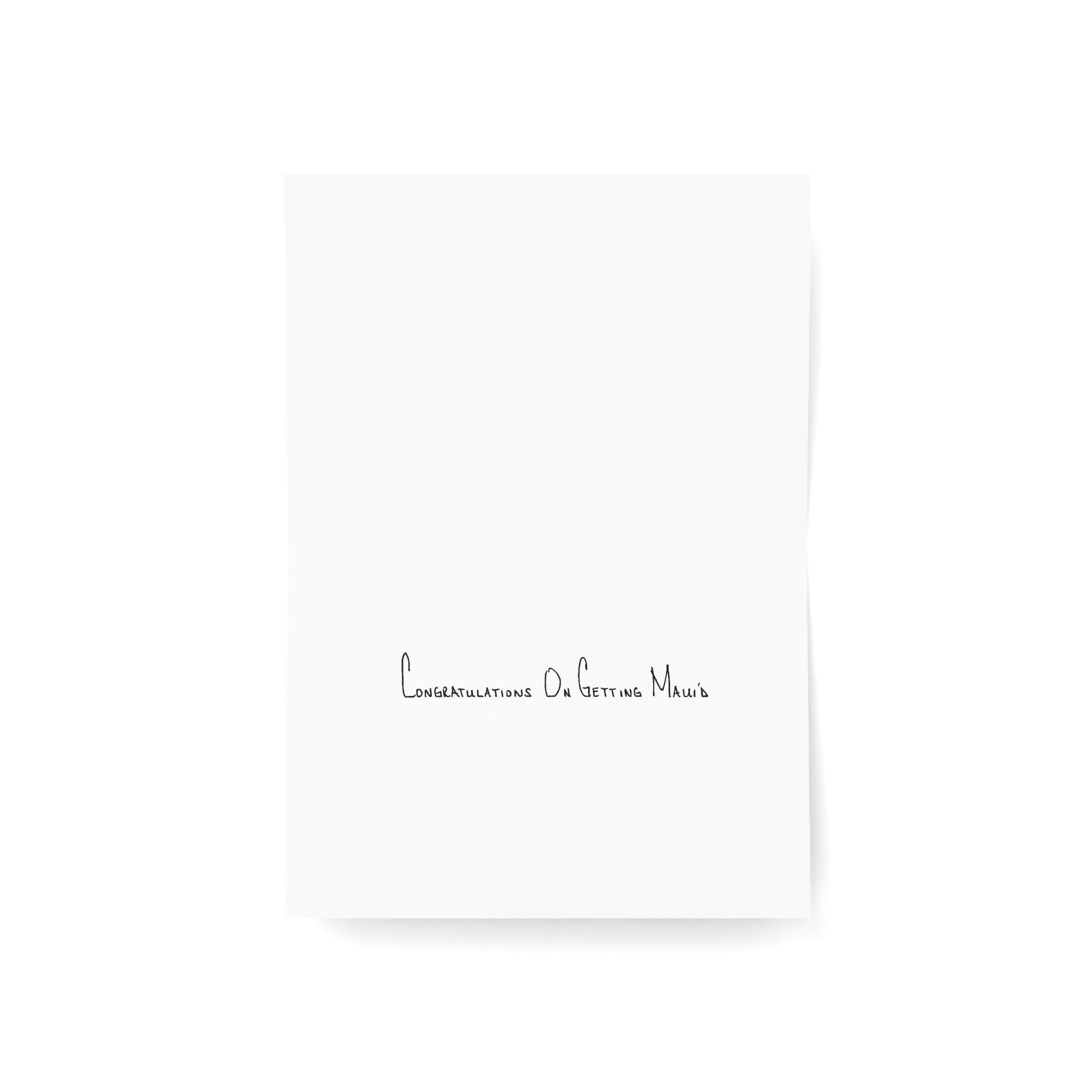 5x7 landscape greeting card – Congratulations on Getting Maui'd - a couple on a beach in grass skirts, the woman in a veil and coconut bra with a bouquet, the man wearing a bow tie. Send a congratulatory message to anyone getting married, whether on Maui or not. It's a fun way to express good luck to the happy couple! Original drawing is colored pencil on paper, scanned in and placed on the card.