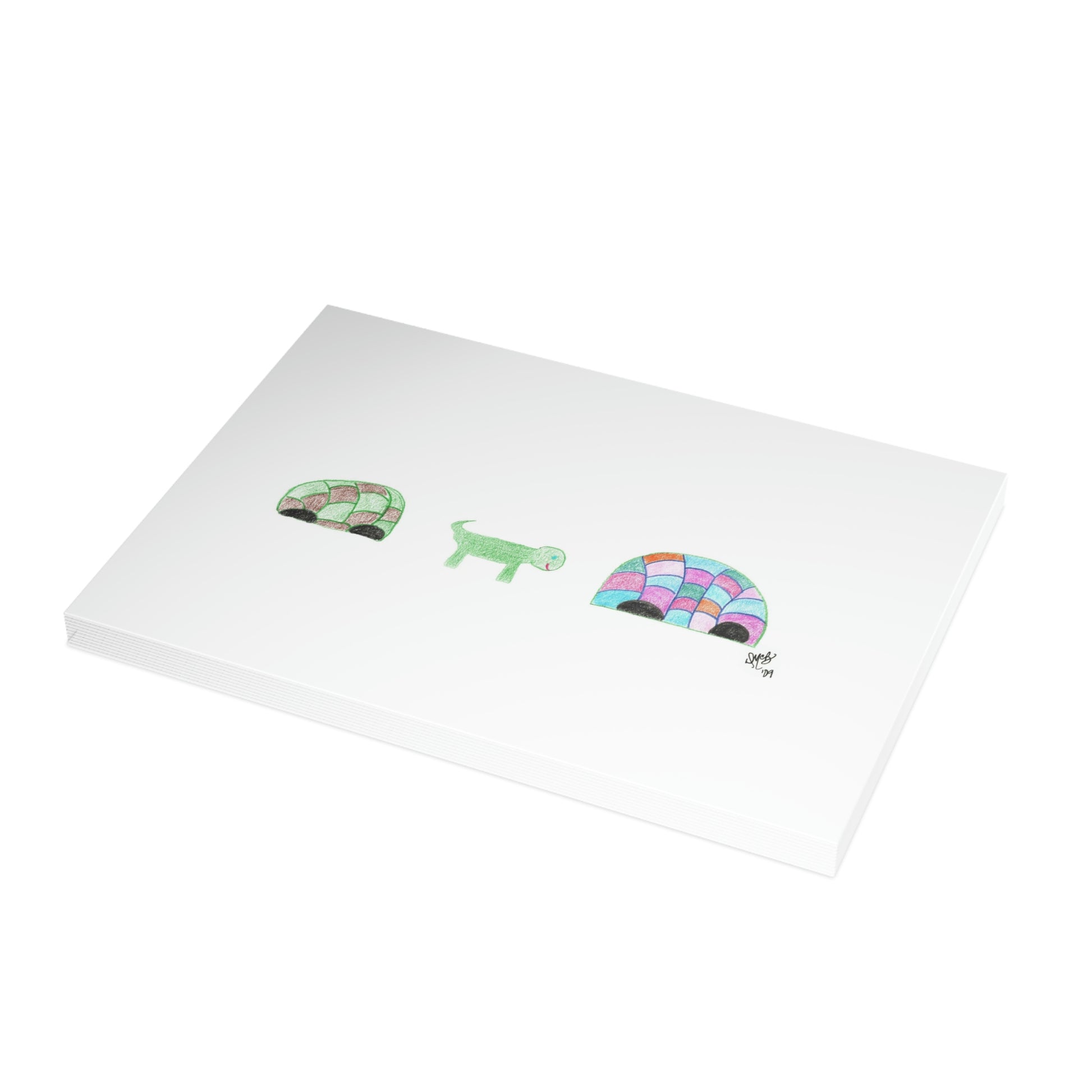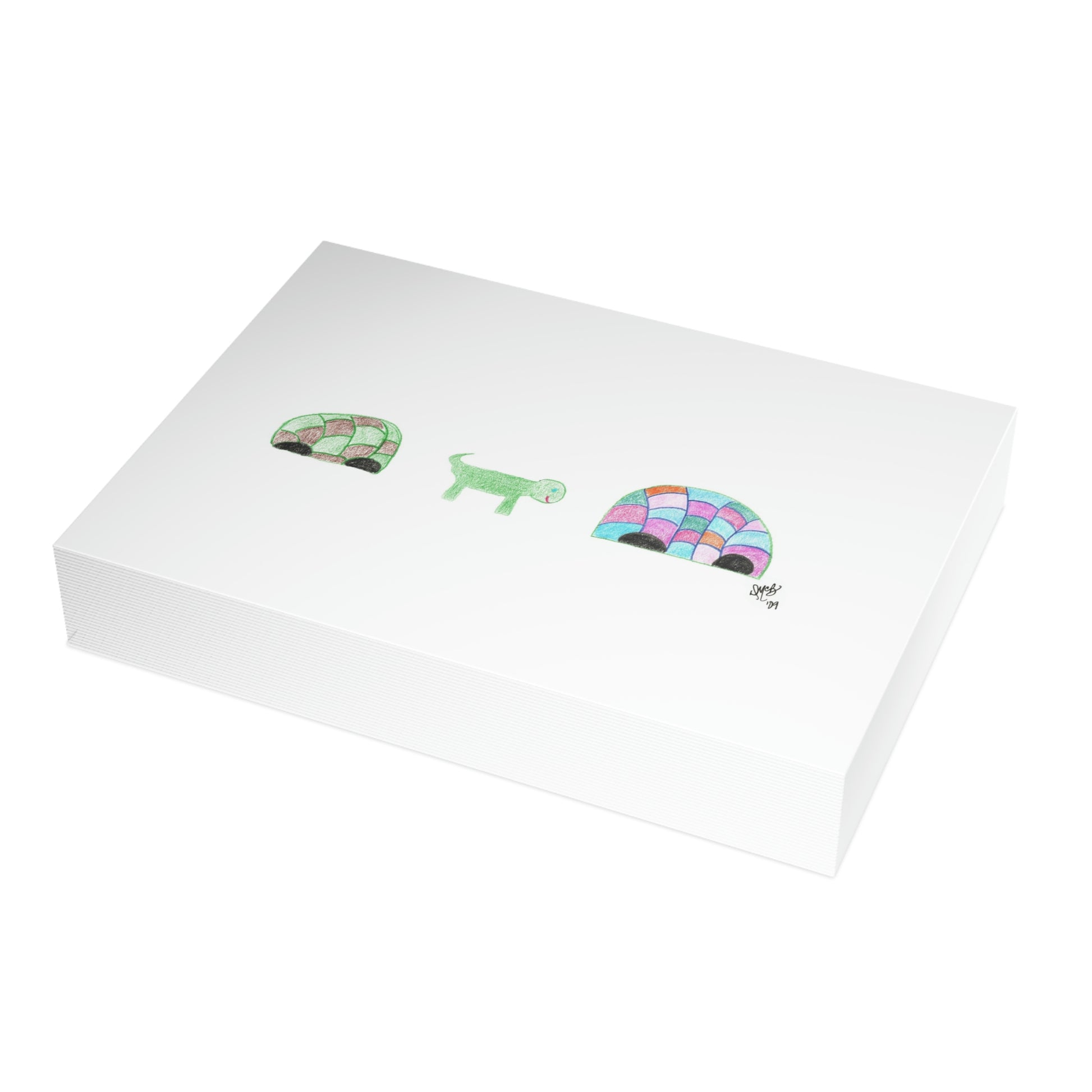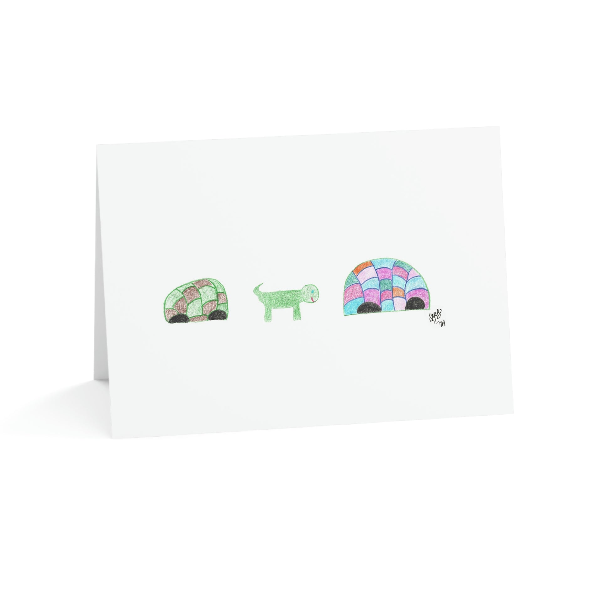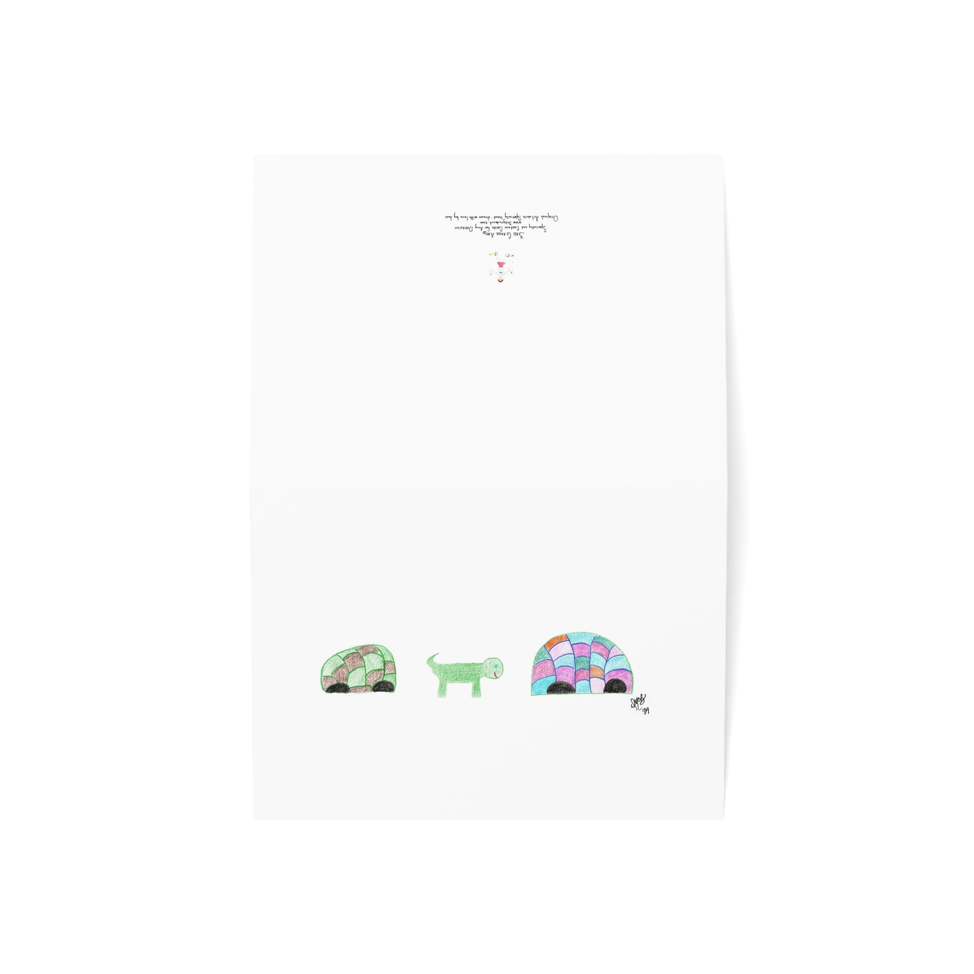 5x7 landscape greeting card – Congratulations on Your New Home - A happy little tortoise makes his way to his new, larger, more colorful shell. (I know tortoises don't do this - just go with it). Wish someone congratulations/happy house warming in a cute and creative way! Original drawing is colored pencil on paper, scanned in and placed on the card.