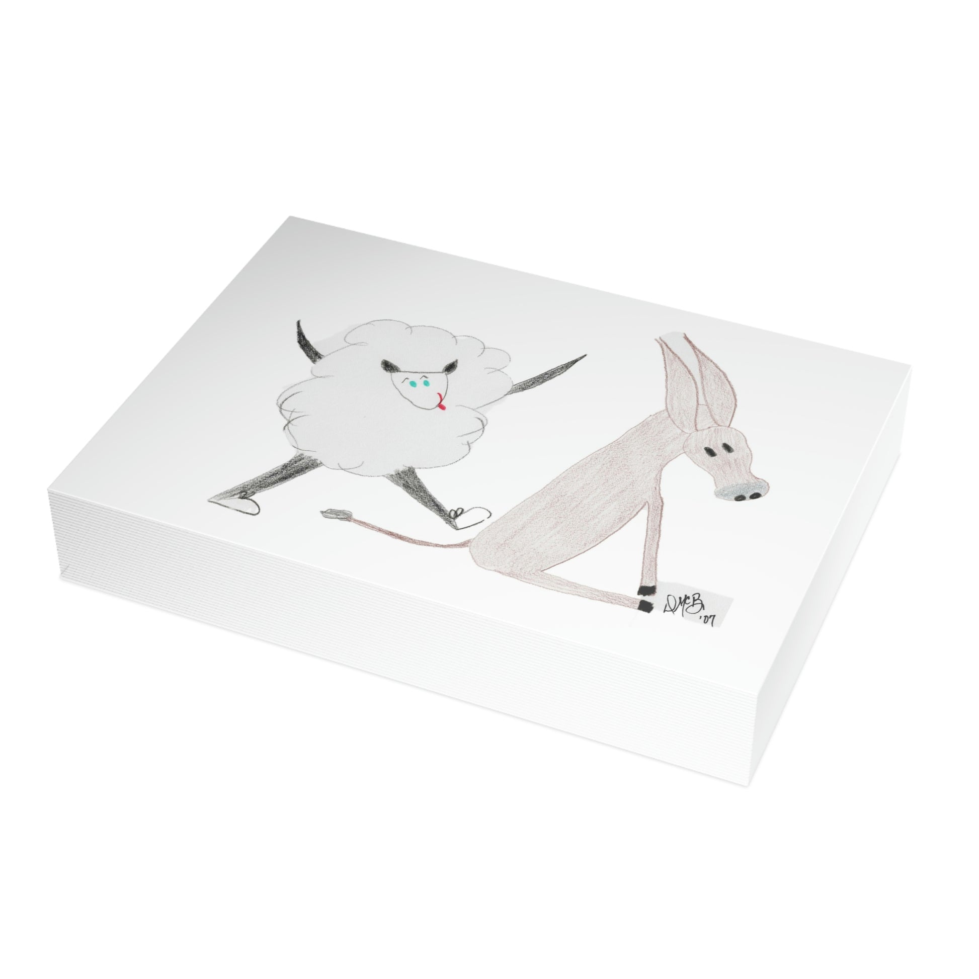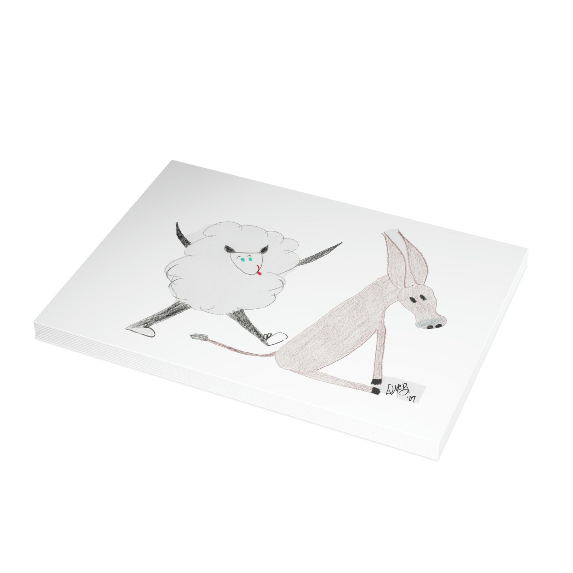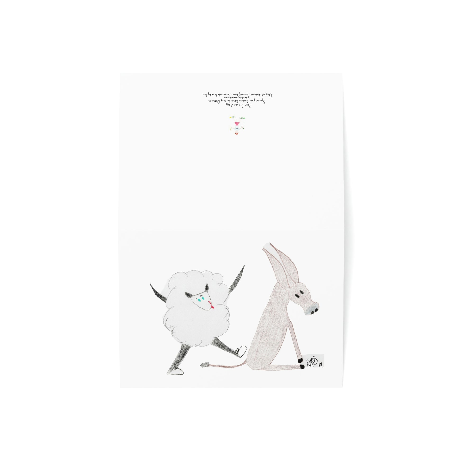 5x7 landscape greeting card – Ewe Kick Ass - a sheep is winding up (note the concentration - the tongue is sticking out) to give an oblivious donkey a swift kick in the ass. Give someone the acknowledgement they deserve - the ol' atta boy - the "you rock" - the way to go! They deserve it! You may want to buy several of these; the people around you all kick ass. They are rock stars and need to know it. Original drawing is colored pencil on paper, scanned in and placed on the card.