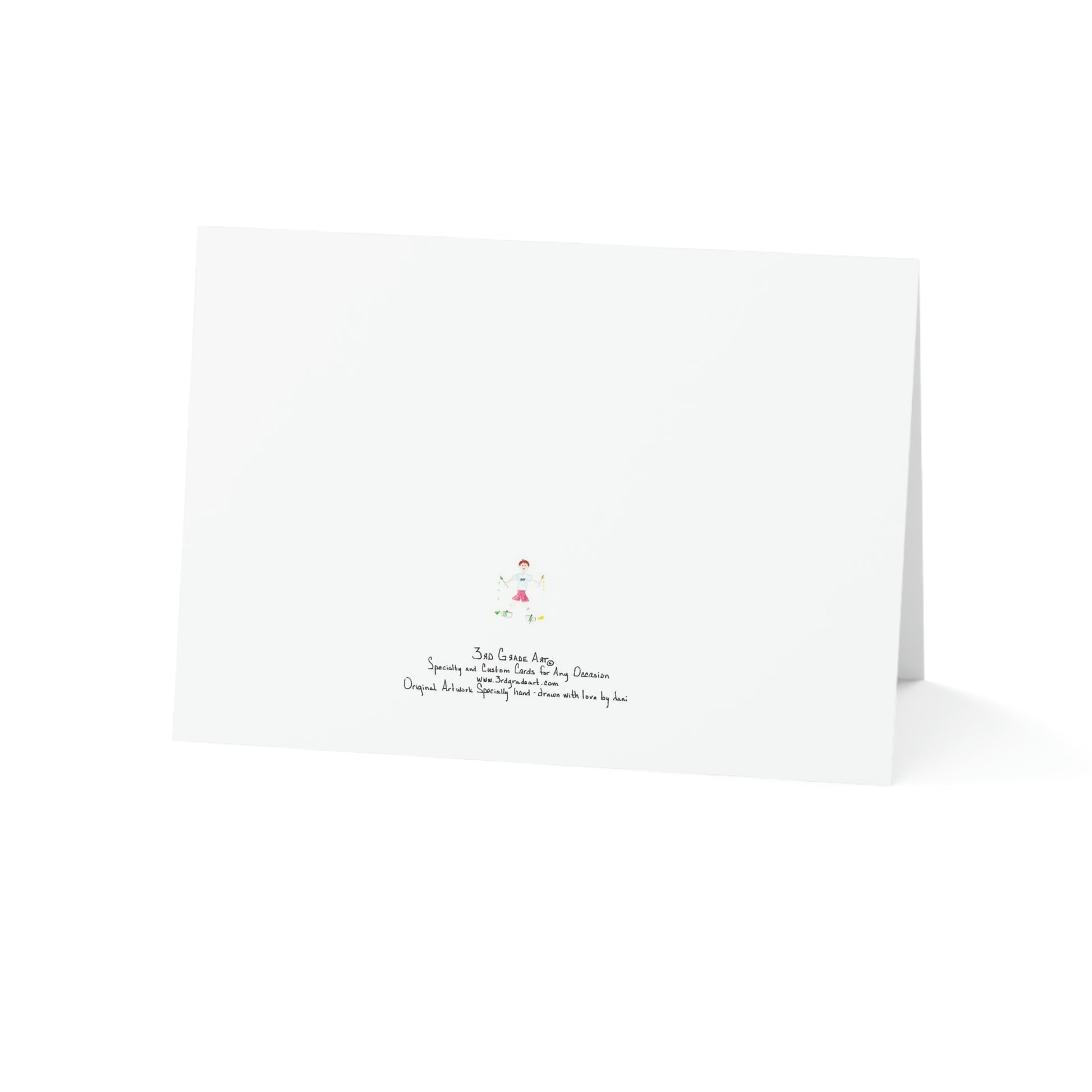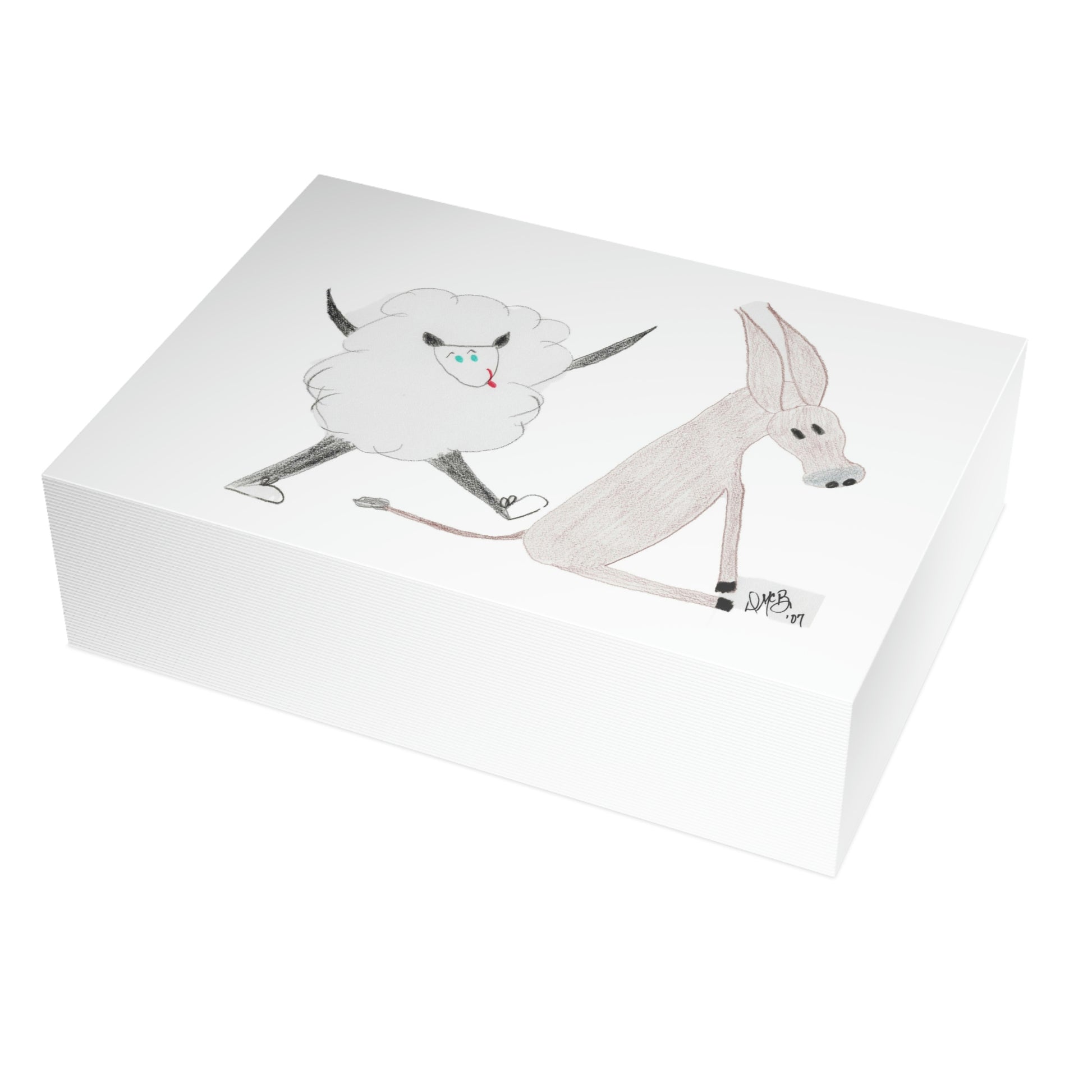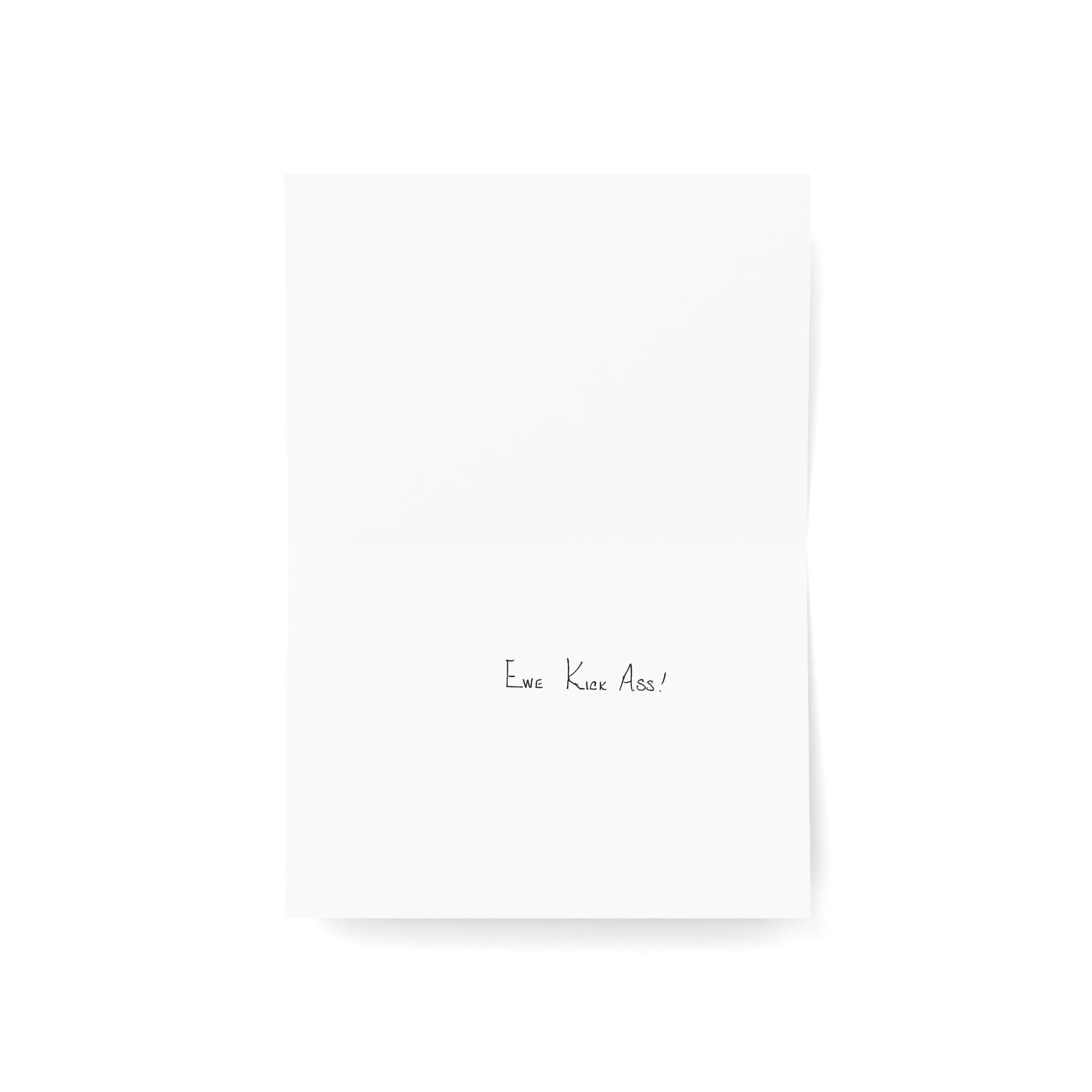 5x7 landscape greeting card – Ewe Kick Ass - a sheep is winding up (note the concentration - the tongue is sticking out) to give an oblivious donkey a swift kick in the ass. Give someone the acknowledgement they deserve - the ol' atta boy - the "you rock" - the way to go! They deserve it! You may want to buy several of these; the people around you all kick ass. They are rock stars and need to know it. Original drawing is colored pencil on paper, scanned in and placed on the card.