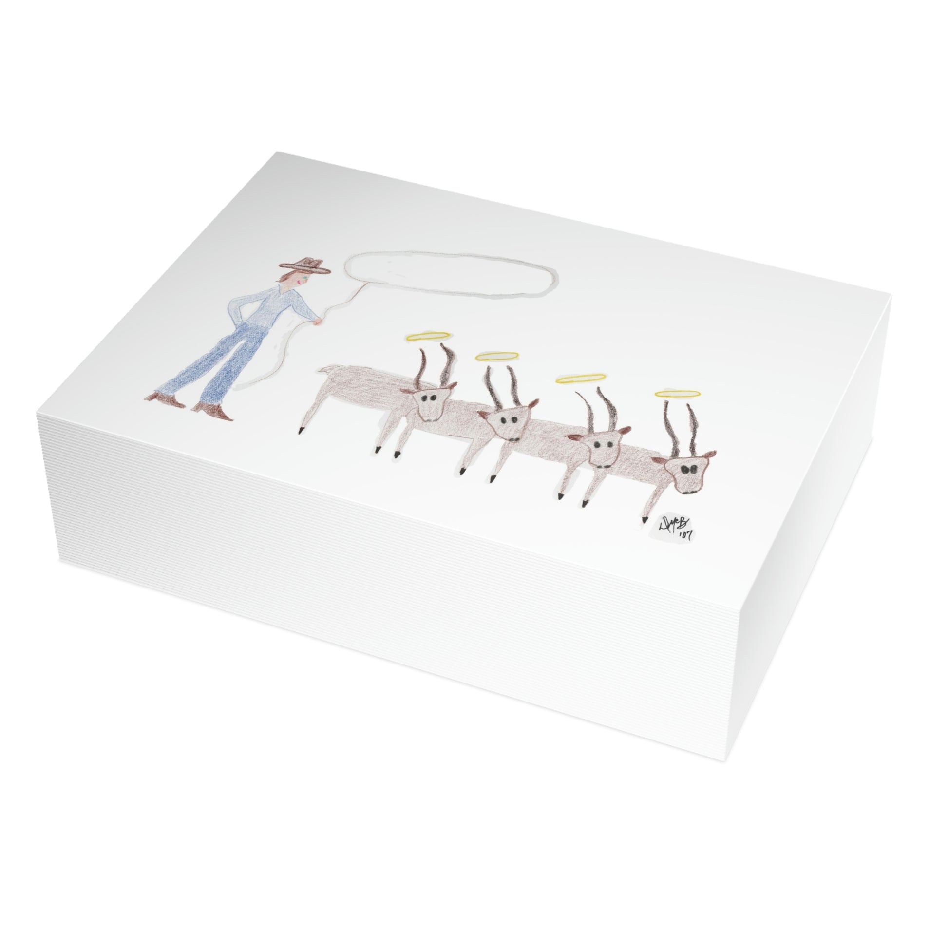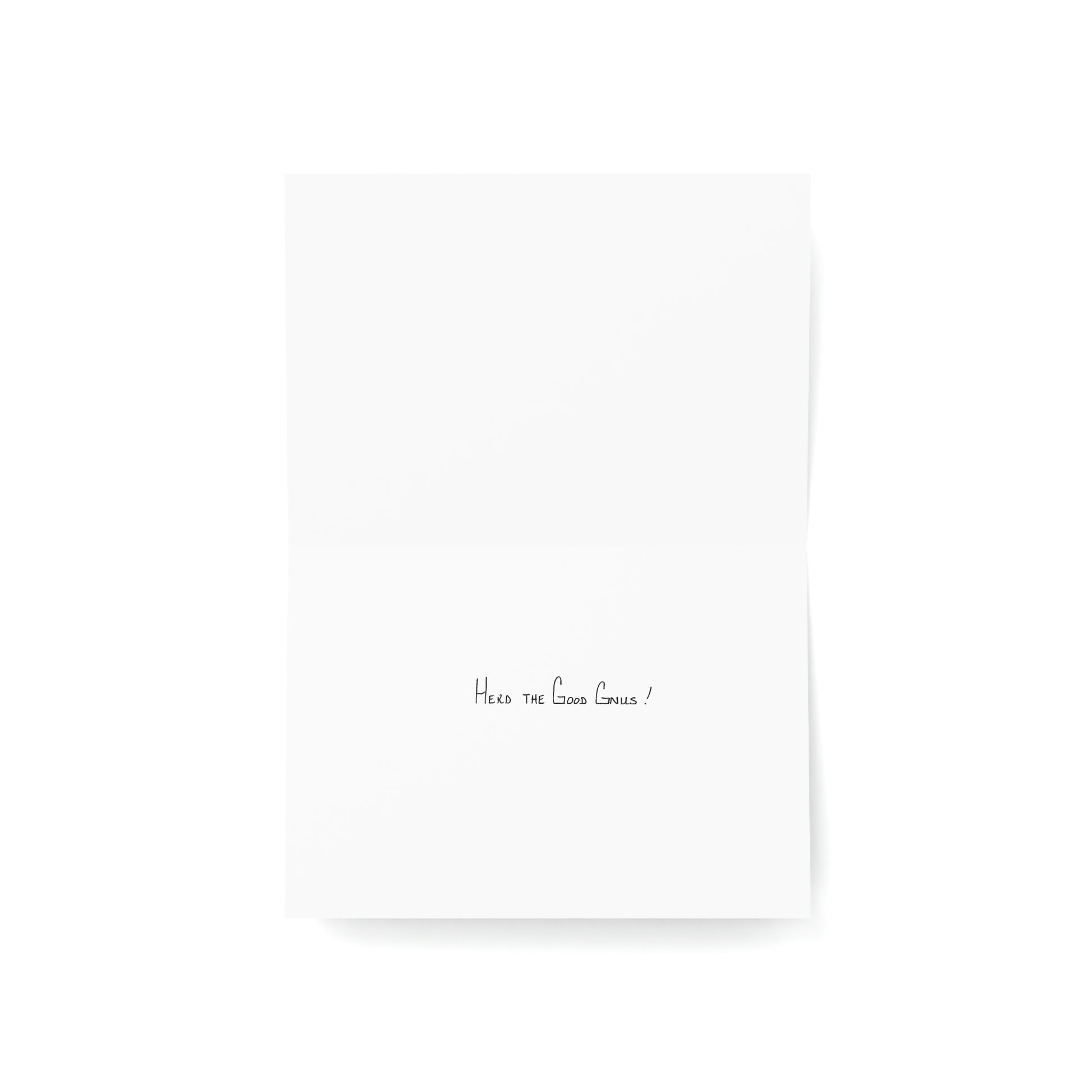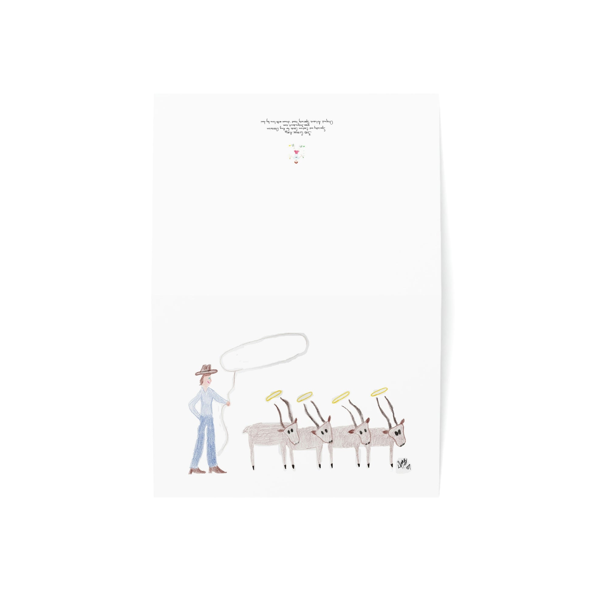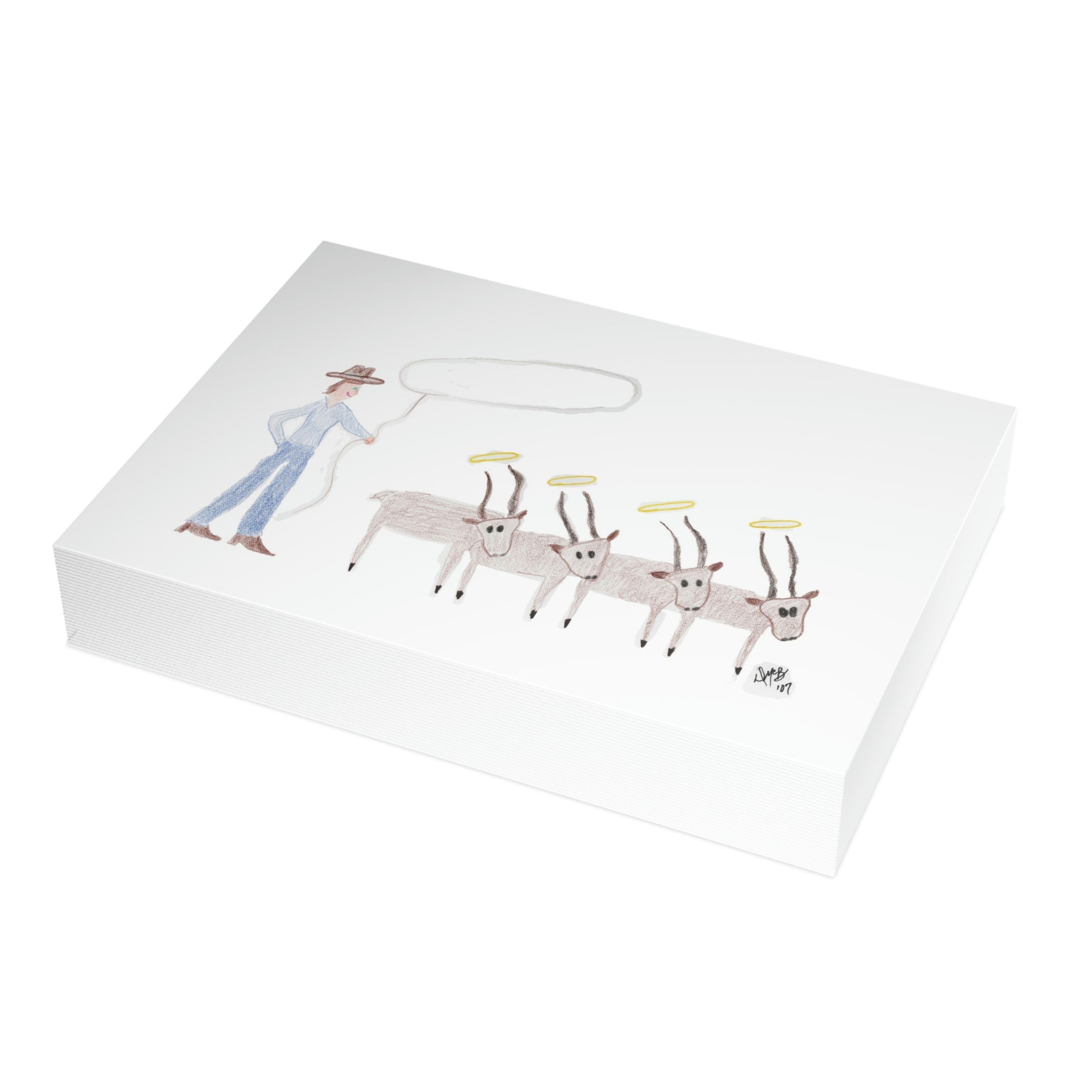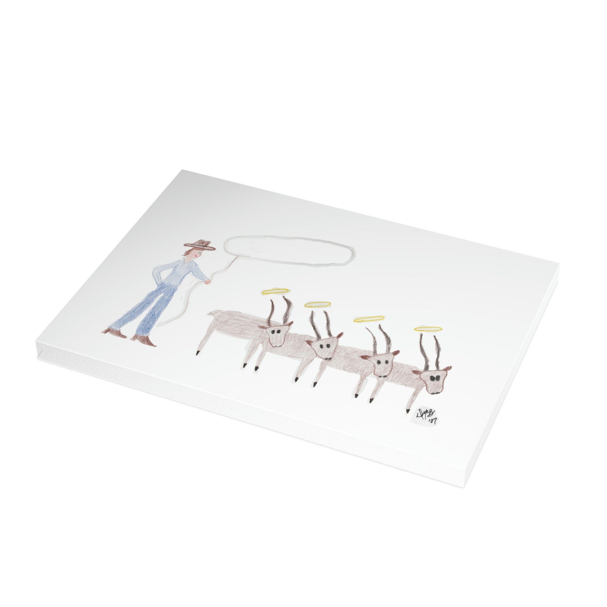 5x7 landscape greeting card – Herd the Good Gnus - A wrangler herding gnus with halos - wish someone congratulations with an offbeat sentiment that may take a moment to "get". The longer it takes for the message to sink in, the more pleasure you will have watching them try to work it out. Win-Win! Original drawing is colored pencil on paper, scanned in and placed on the card.