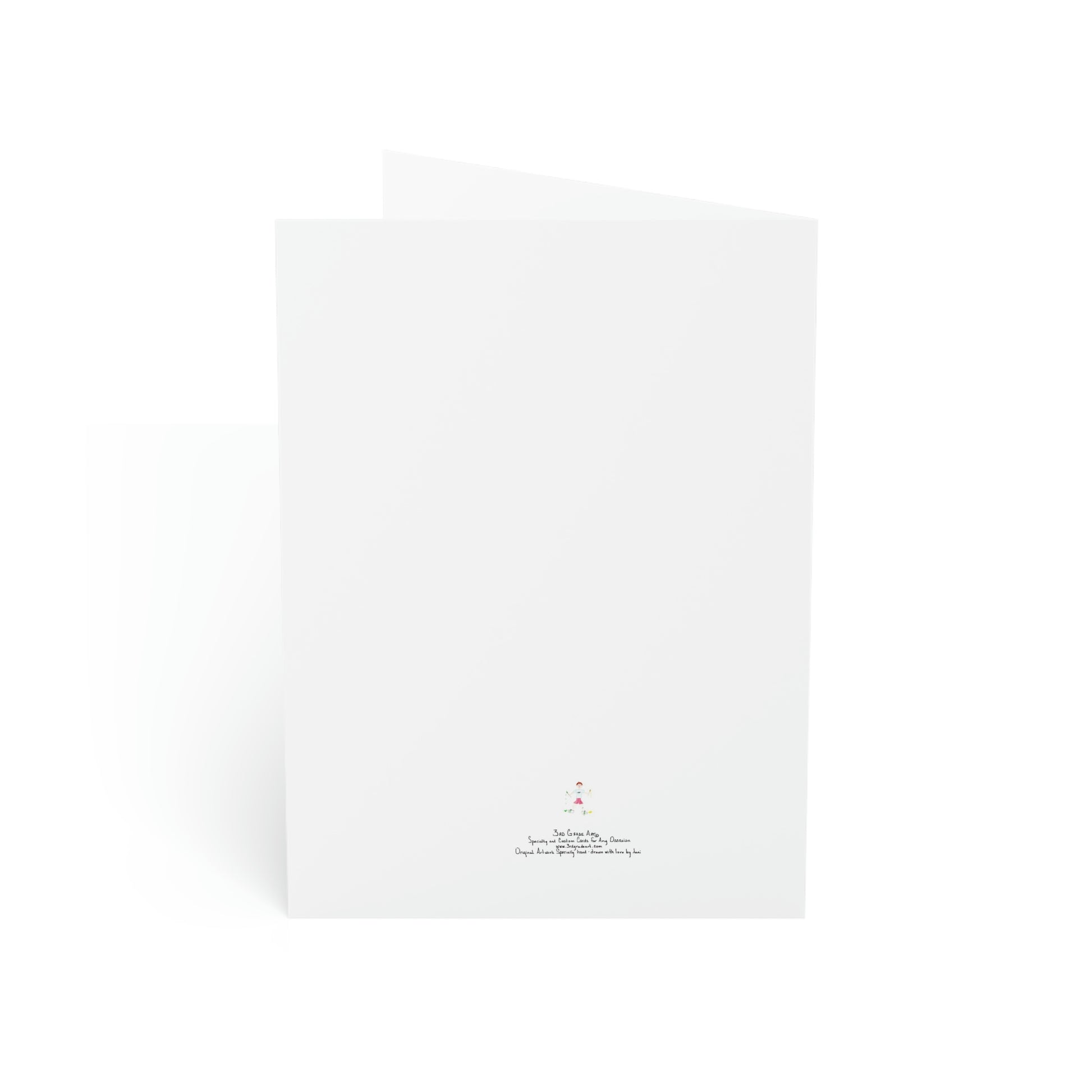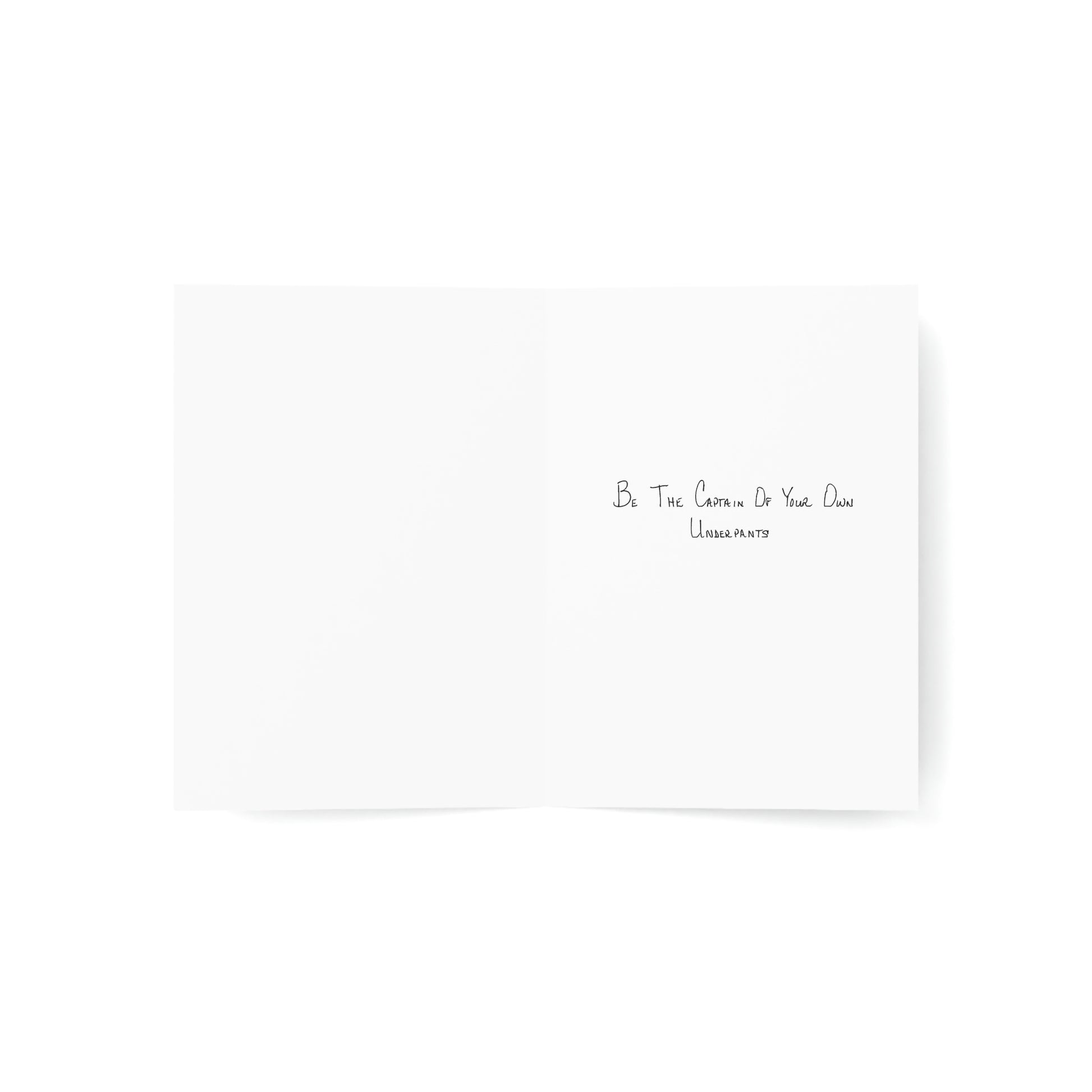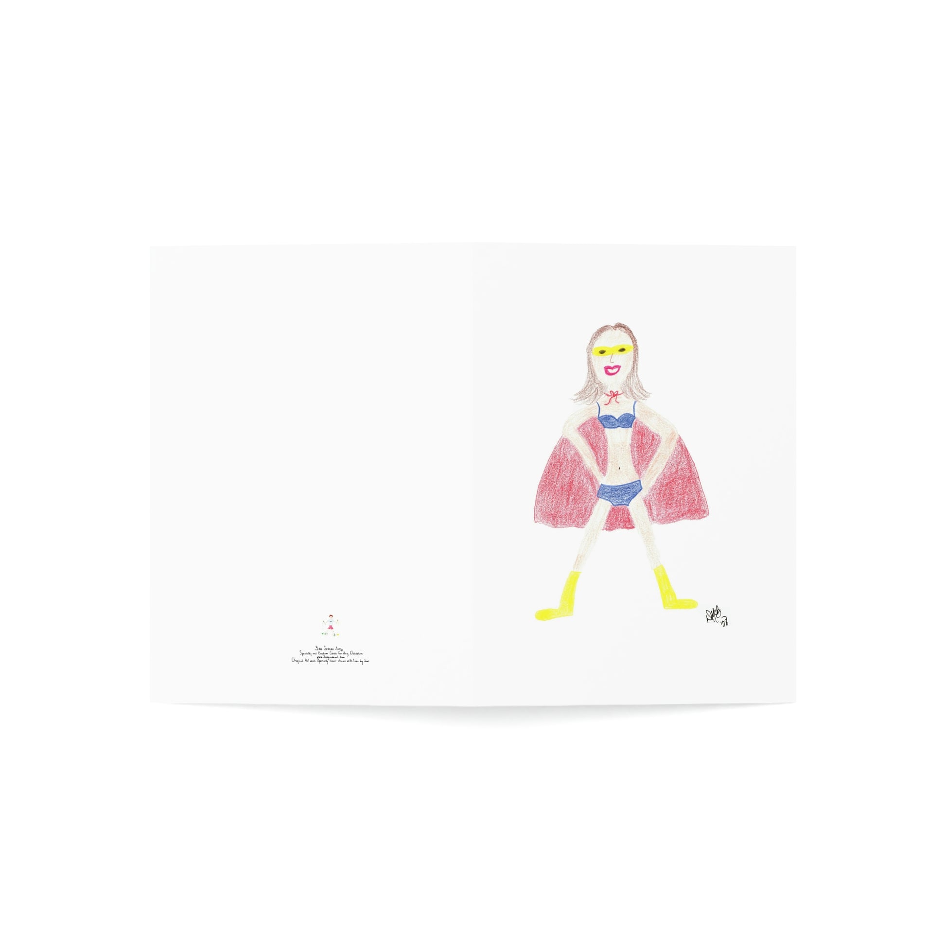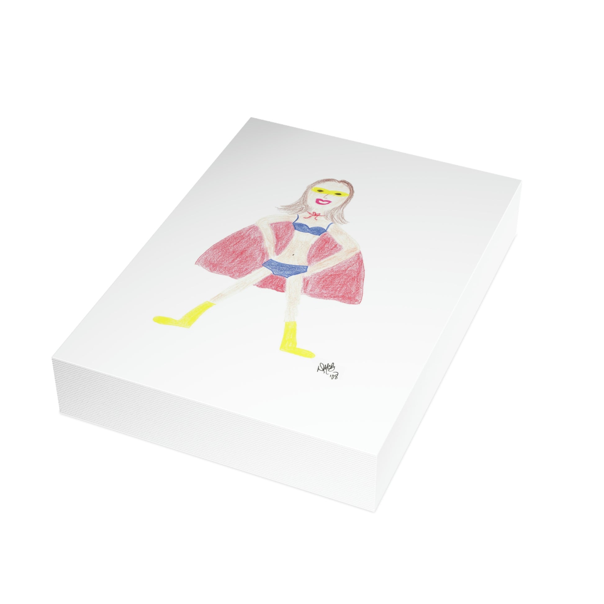 5x7 portrait greeting card – Be the Captain of Your Own Underpants - a female "superhero" in red, yellow and blue; complete with boots, cape, eye mask, and undies - striking a very triumphant pose. She is asserting her confidence and showing the world she can do anything. She can take whatever you throw at her (except for maybe hot bacon grease). Show your girlies they are invincible and can overcome obstacles. Encourage them be great. Original drawing is colored pencil on paper, scanned in and placed on the card.