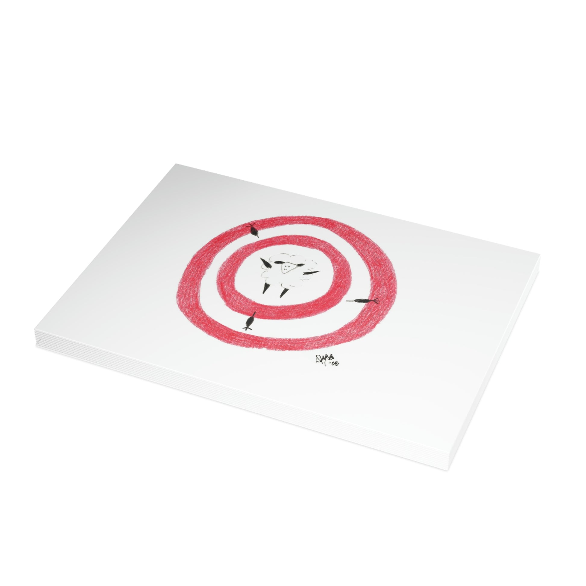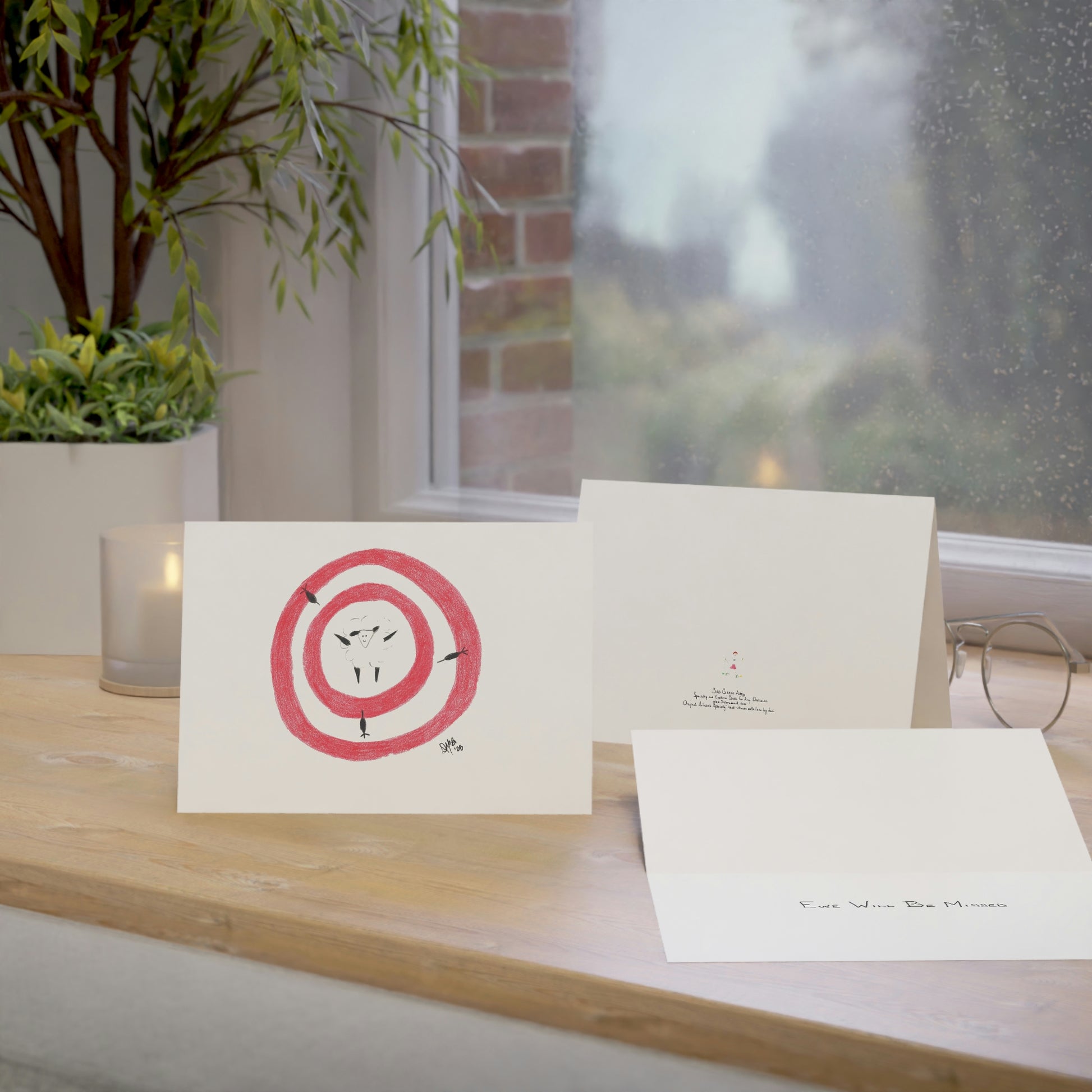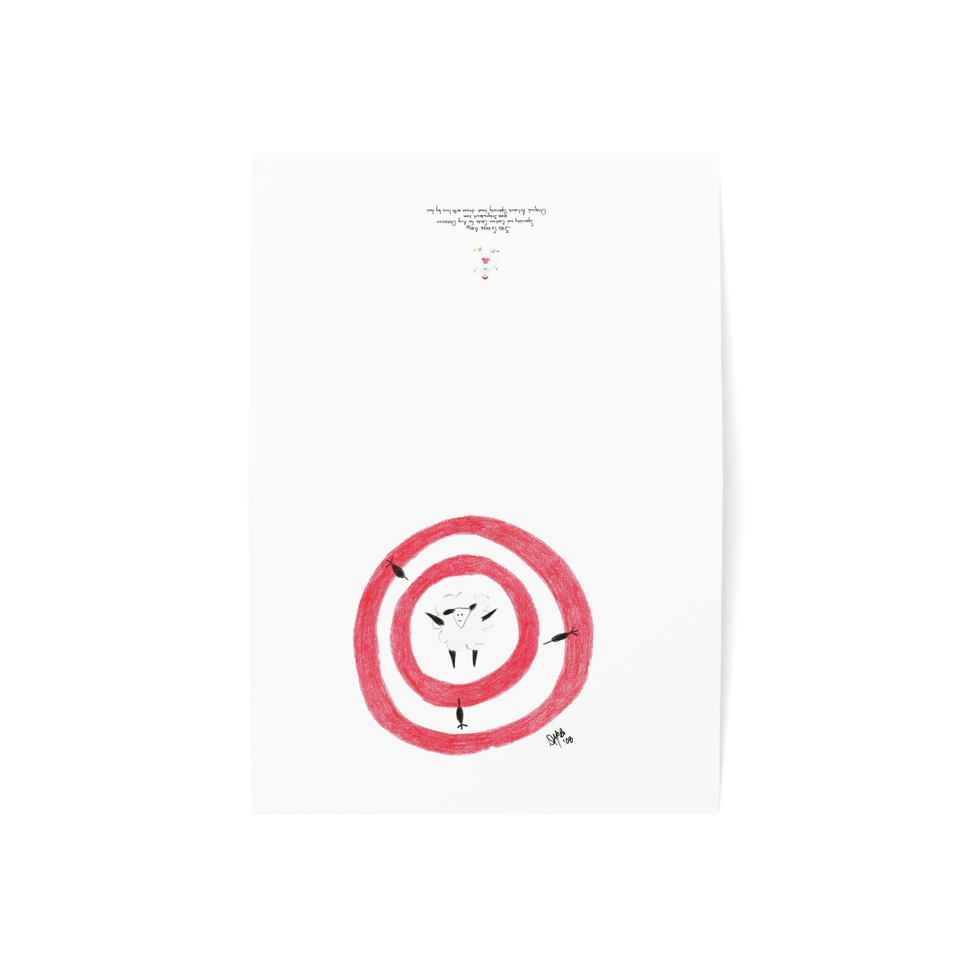 5x7 landscape greeting card – Ewe Will be Missed - A sheep on a dart board with the darts missing it. Great retirement card, or to give a coworker that is moving on in life to a different position or job. Also good for someone moving away. If you're more nefarious, feel free to use it as a breakup card. I won't judge. The person being dumped may, though. Original drawing is colored pencil on paper, scanned in and placed on the card.