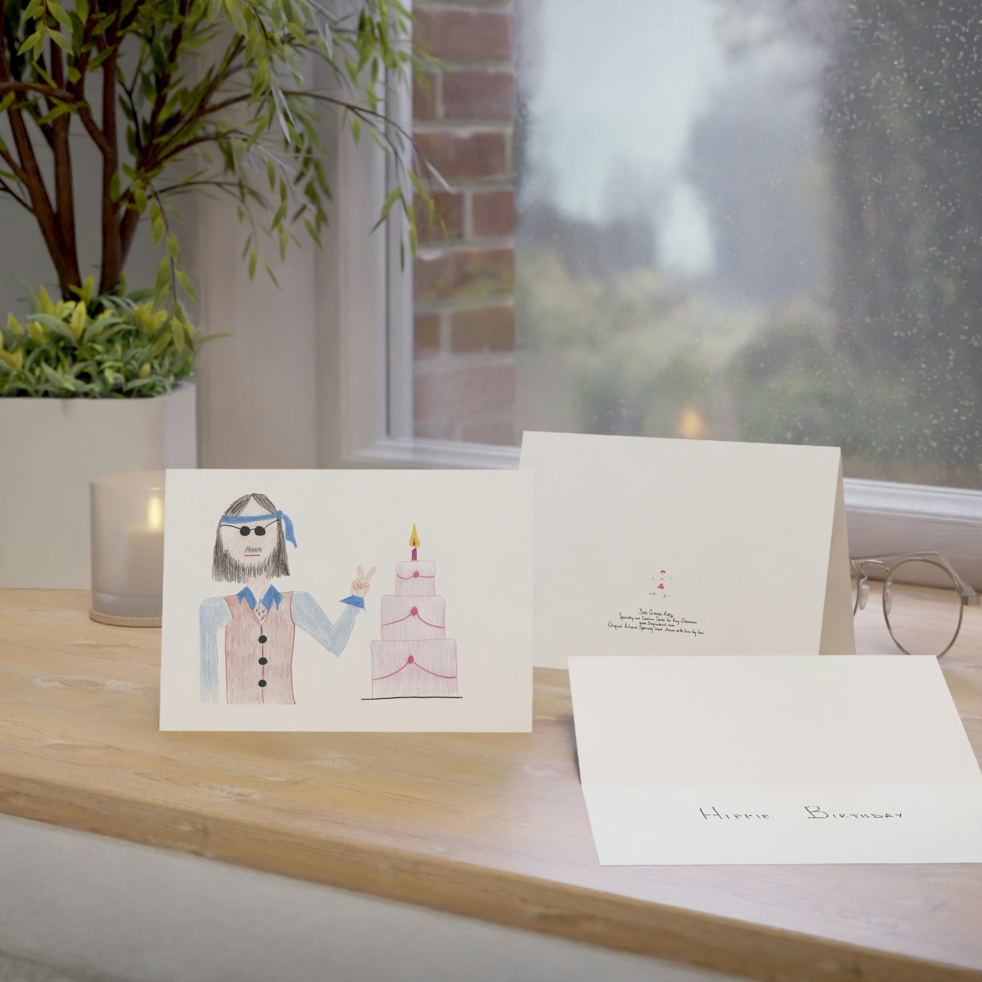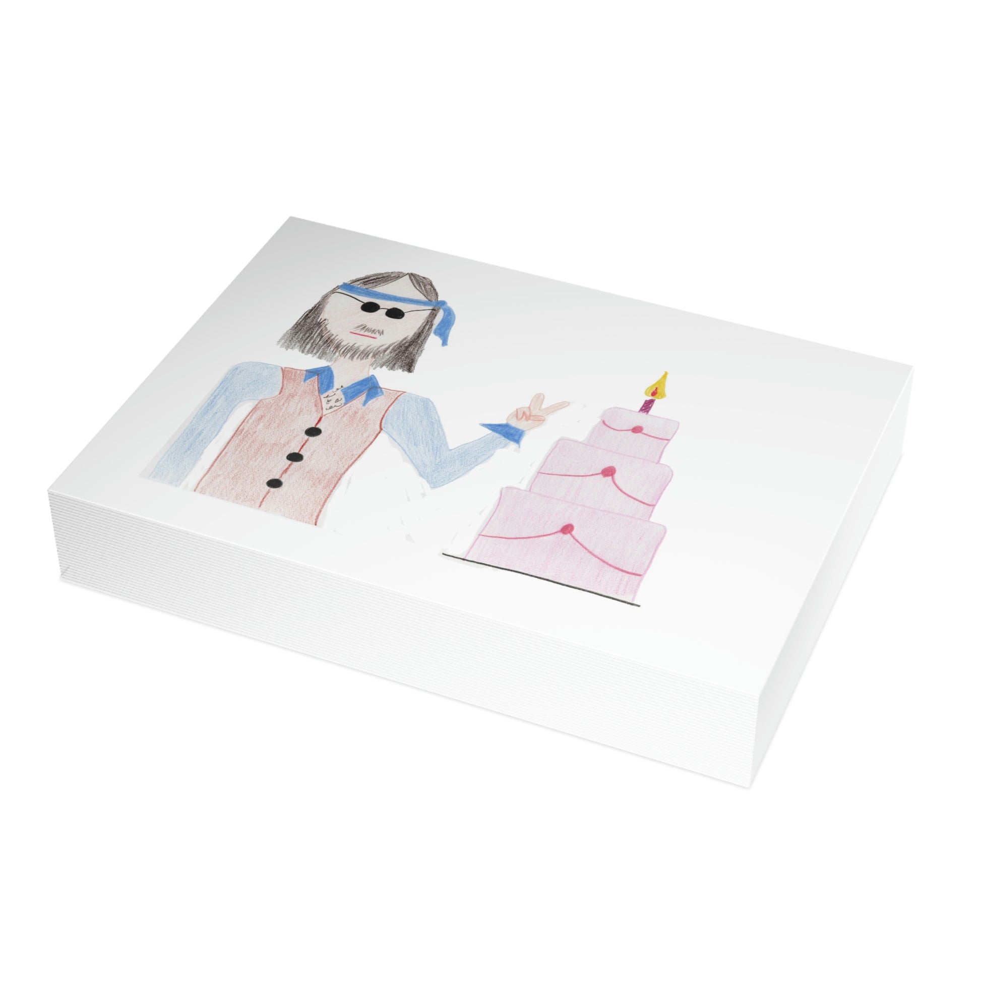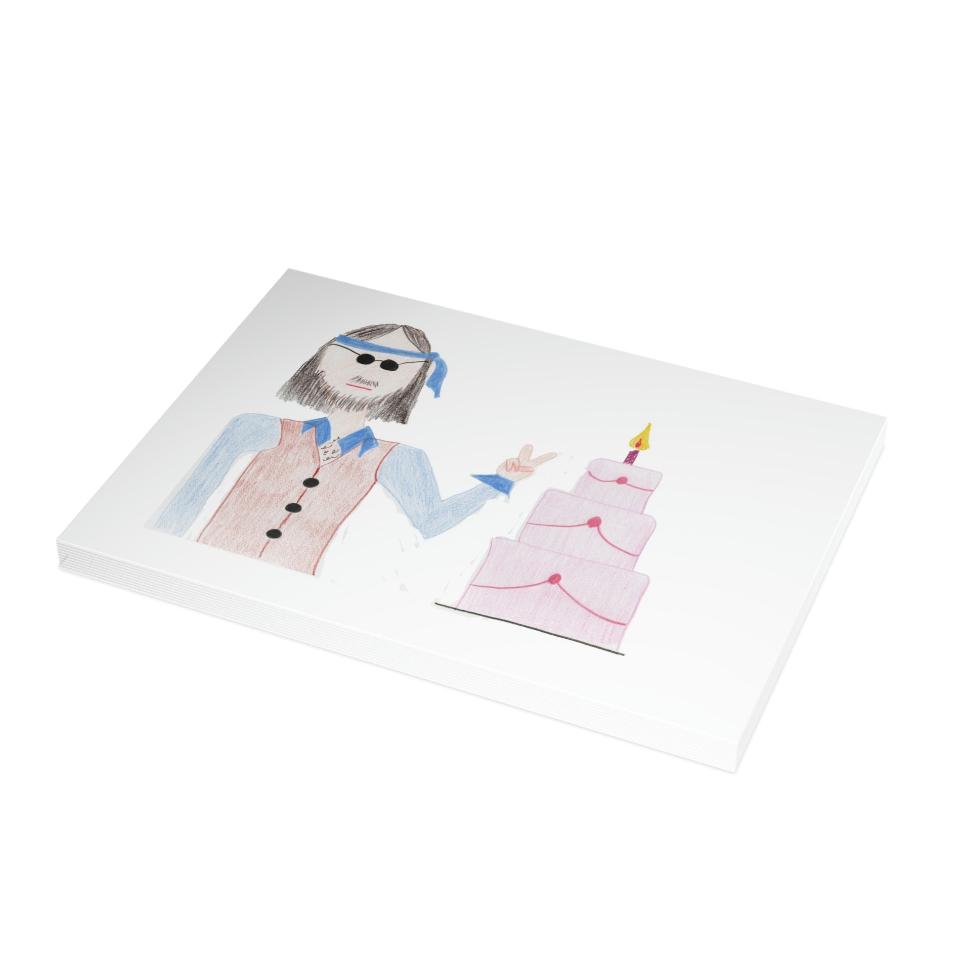 5x7 landscape greeting card – Hippie Birthday - A hippie giving a peace sign standing next to a large layer cake. I like the incongruity of a hippie (usually a humble minimalist type) standing next to this giant audacious pink cake. The cake is obnoxiously big and overstated. At least there will be enough to share with his commune! Original drawing is colored pencil on paper, scanned in and placed on the card.
