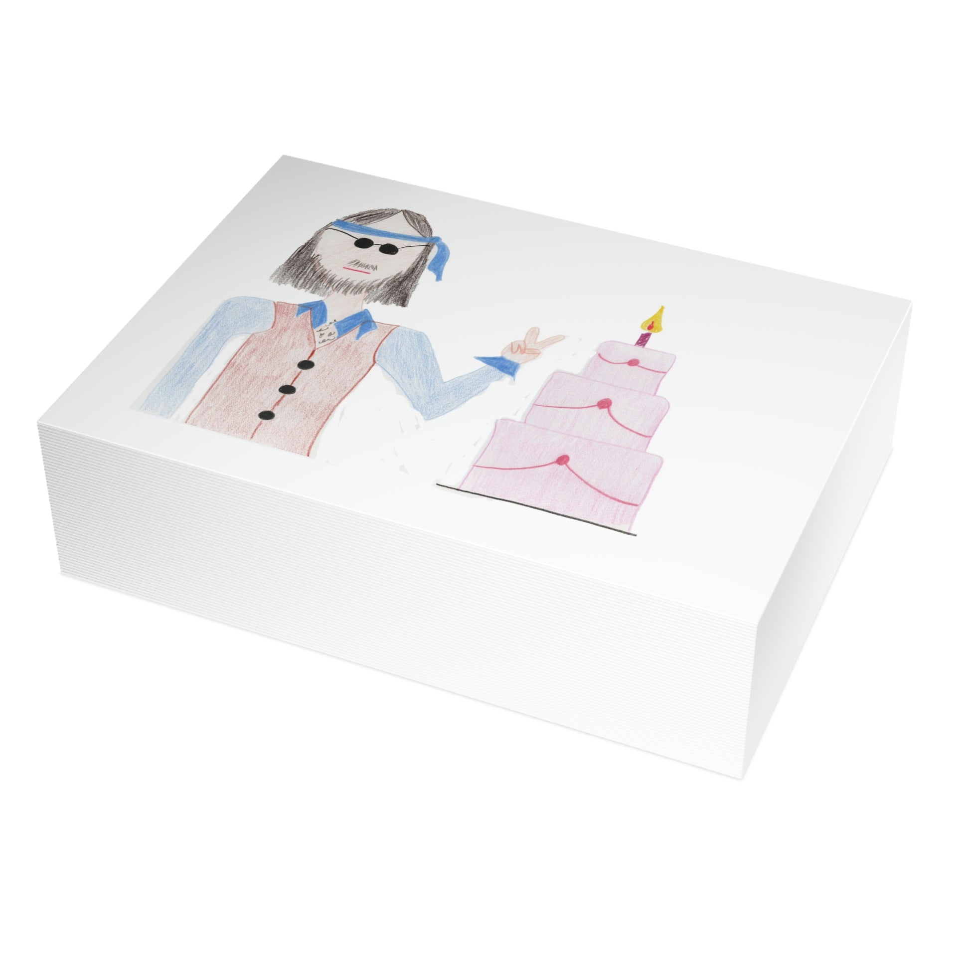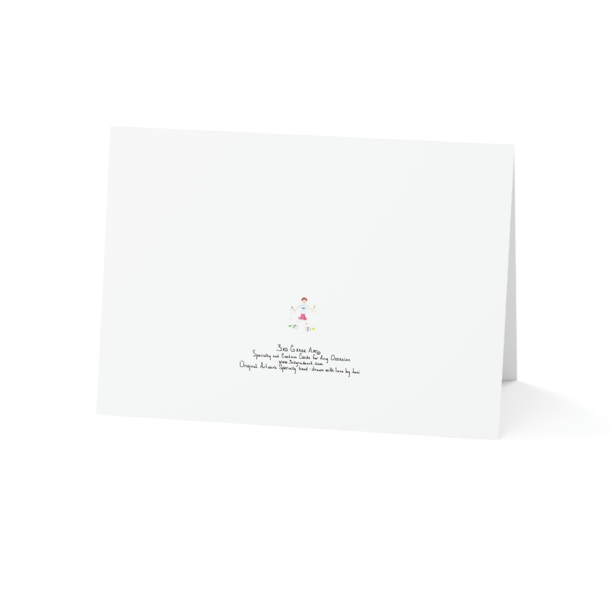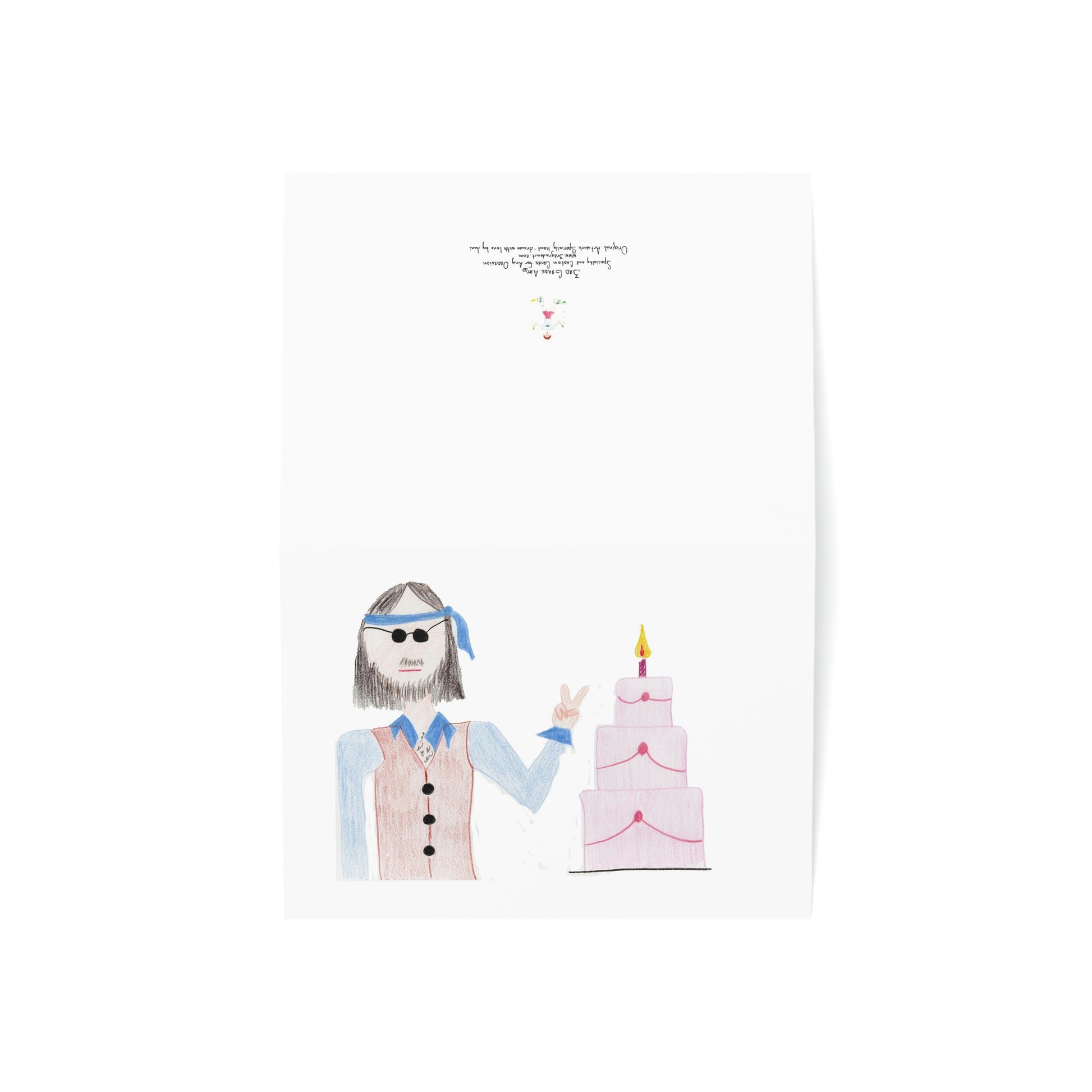 5x7 landscape greeting card – Hippie Birthday - A hippie giving a peace sign standing next to a large layer cake. I like the incongruity of a hippie (usually a humble minimalist type) standing next to this giant audacious pink cake. The cake is obnoxiously big and overstated. At least there will be enough to share with his commune! Original drawing is colored pencil on paper, scanned in and placed on the card.