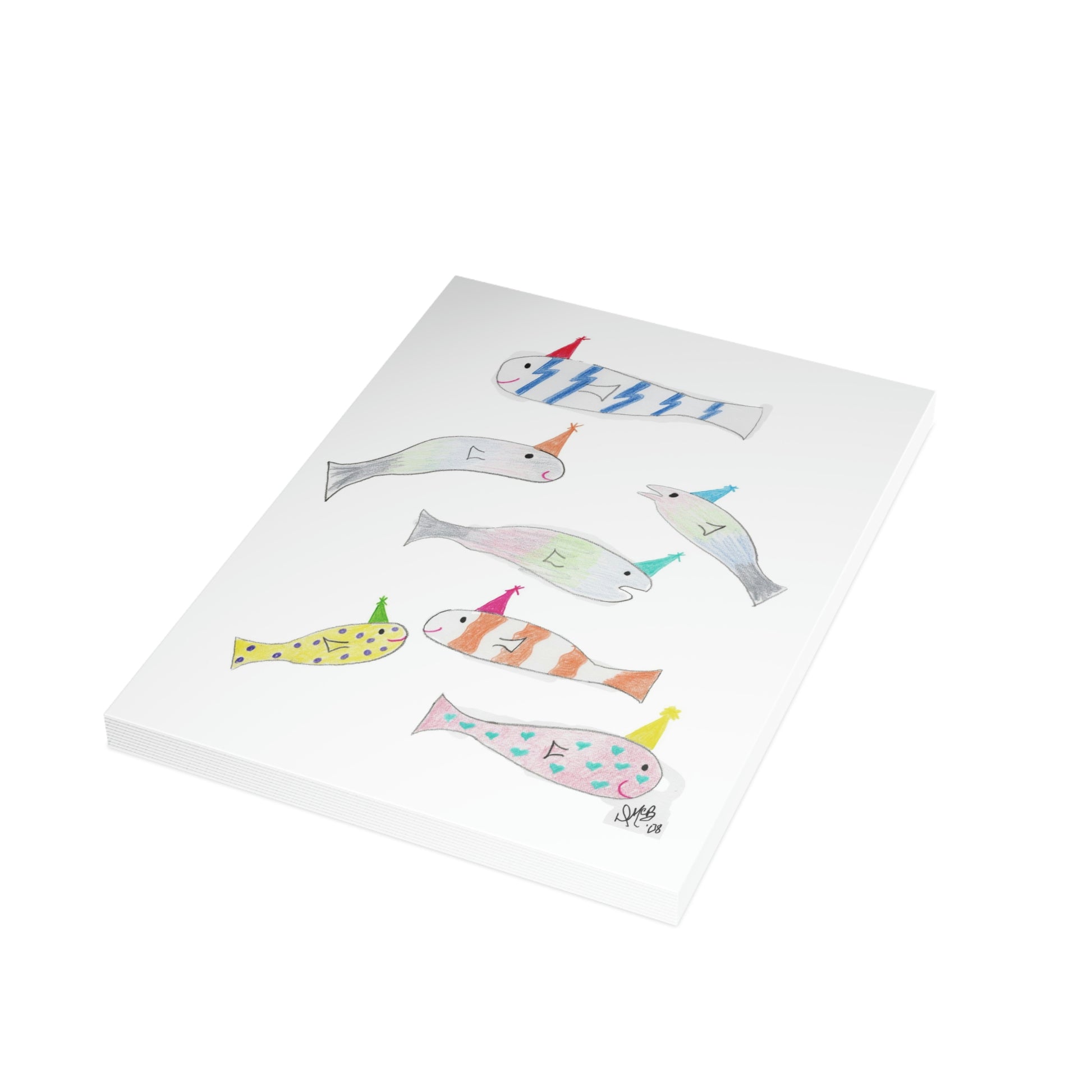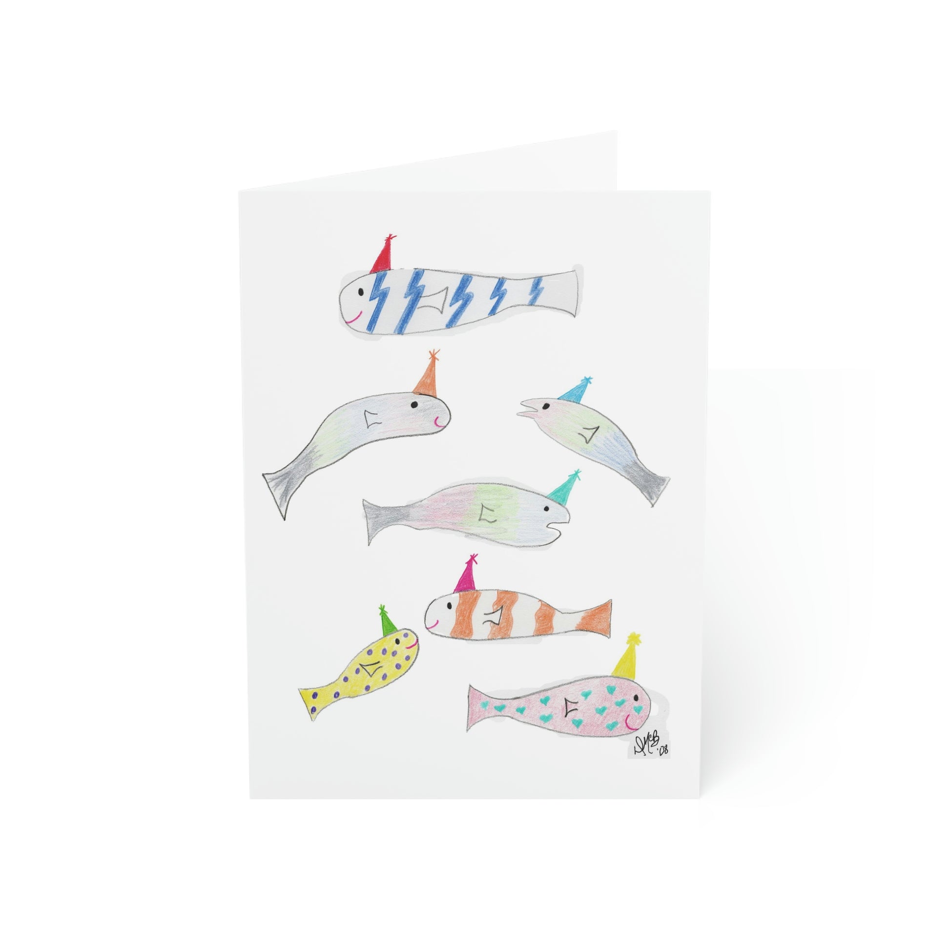 5x7 portrait greeting card – Many Birthday Fishes to You - Several whimsical fish wearing party hats adorn this card. They are all smiling and so happy to be sending their well-wishes to the recipient. Original drawing is colored pencil on paper, scanned in and placed on the card.