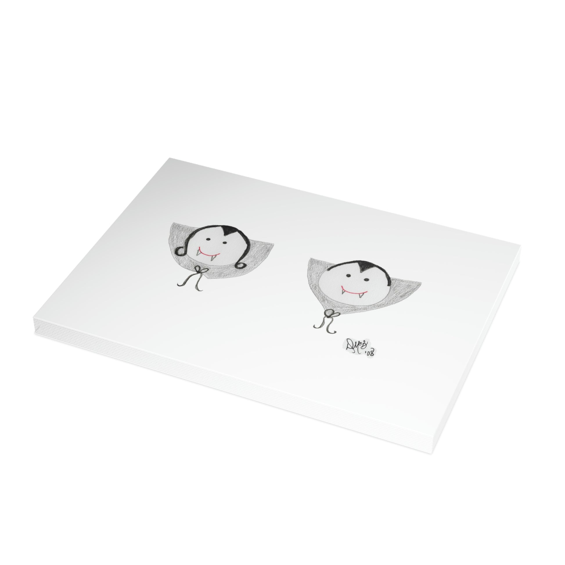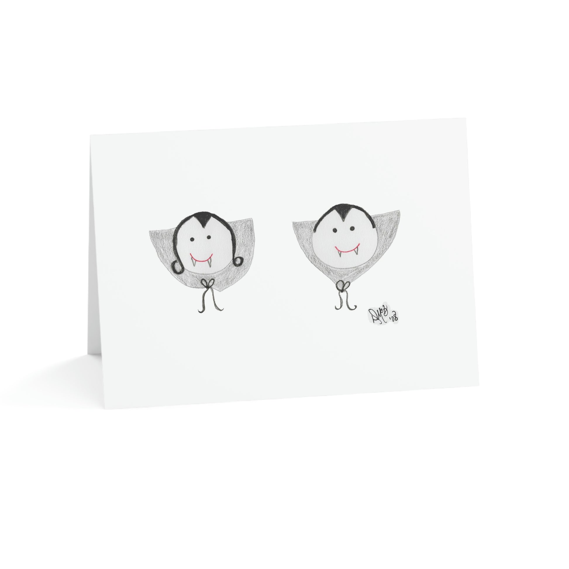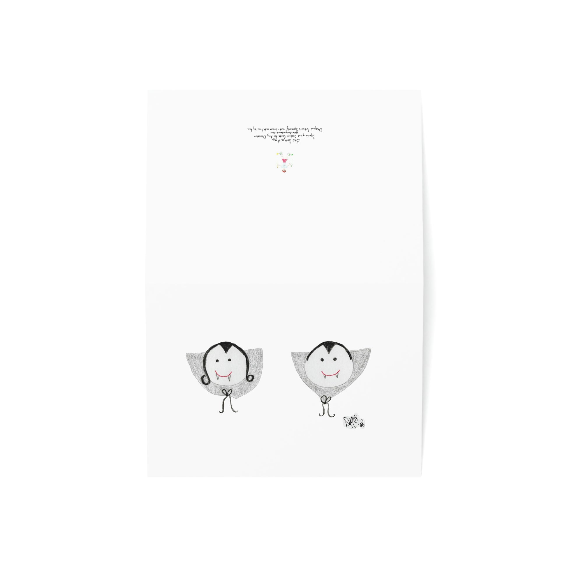 5x7 landscape greeting card – We Suck. Sorry We Missed Your Birthday - A pair of vampires on the front of the card apologizing for sending a belated card. What could be better to show contrition? Certainly there is nothing as remorseful as a vampire with all of their warm and fuzzy feelings! Your recipient will go batty with glee when they get this card! Original drawing is colored pencil on paper, scanned in and placed on the card.