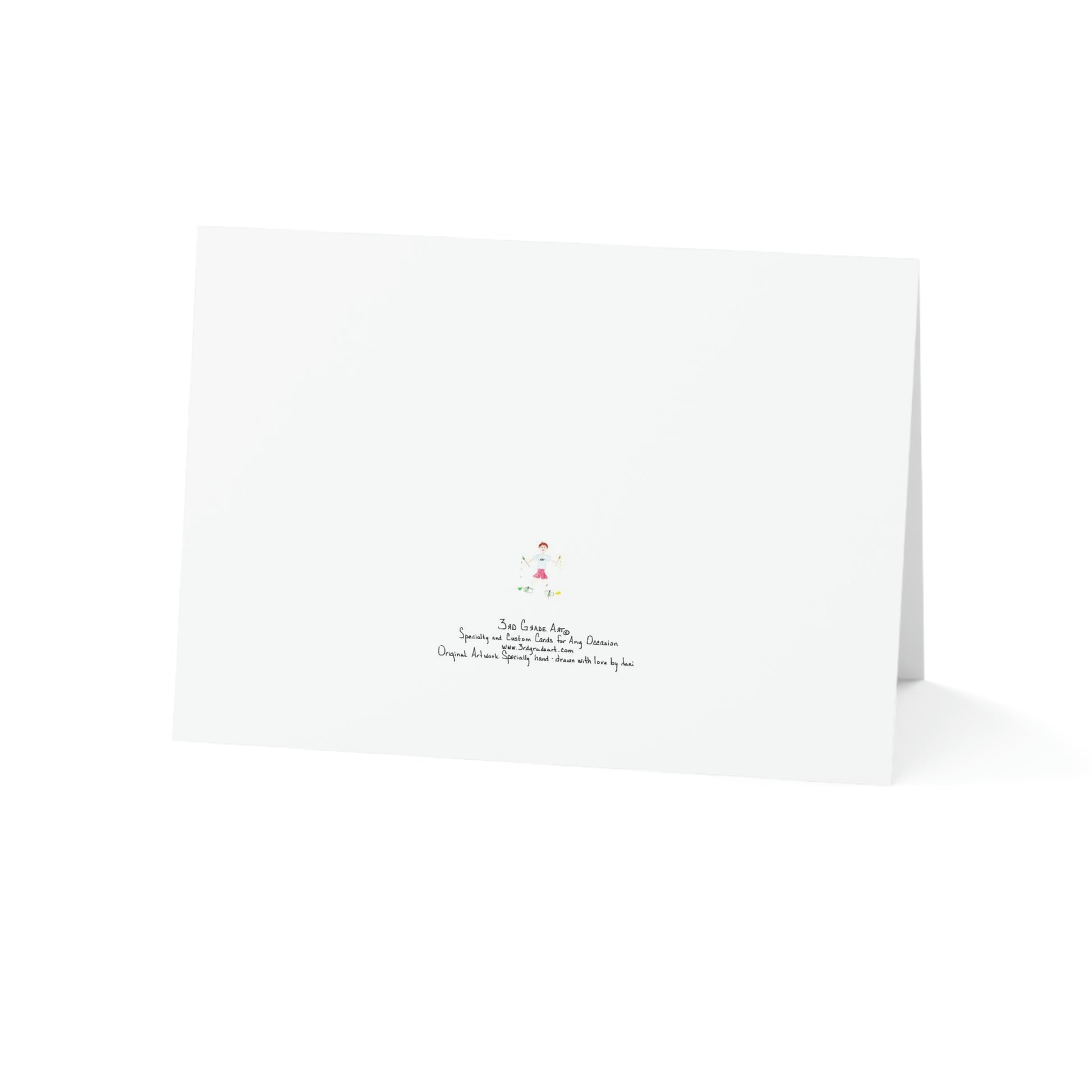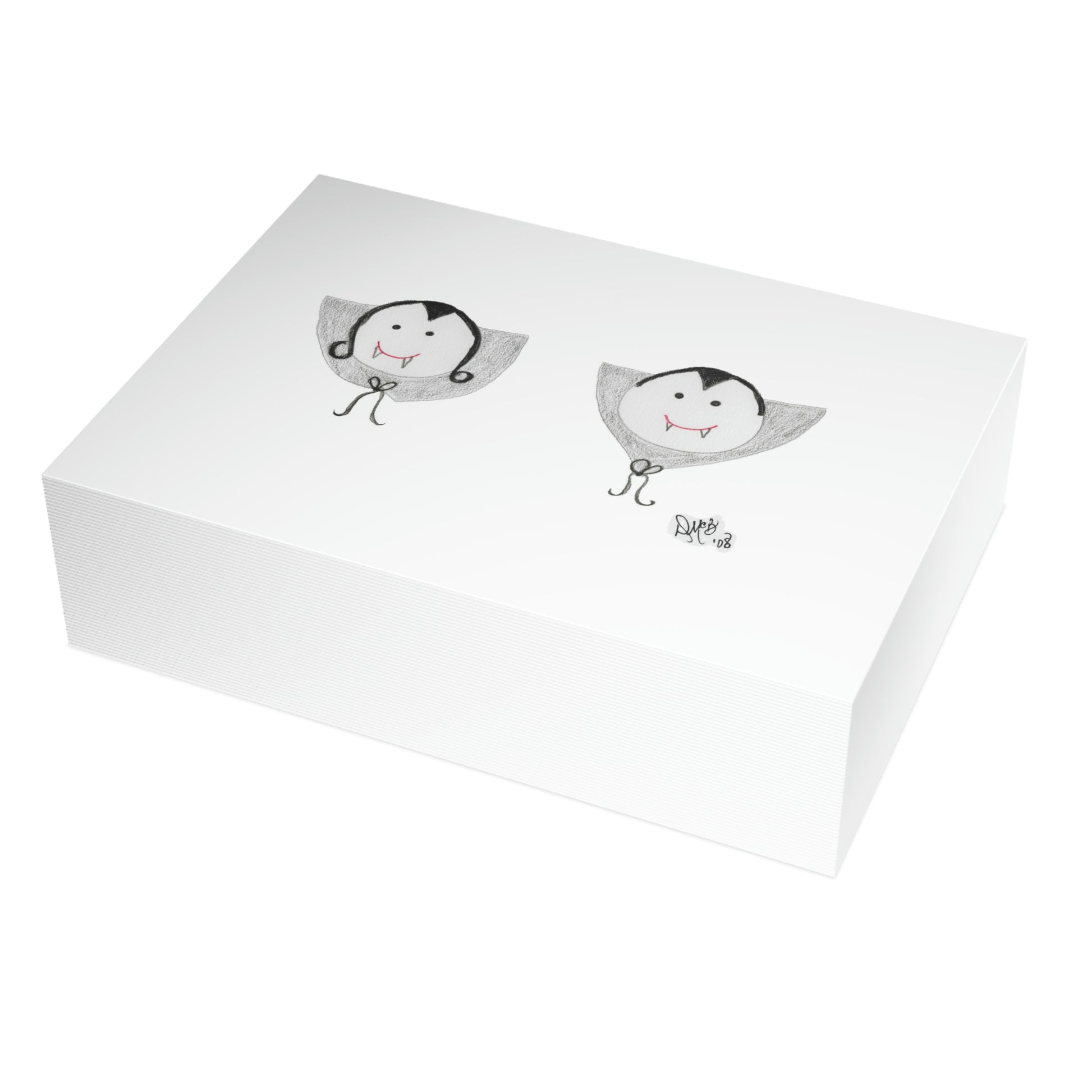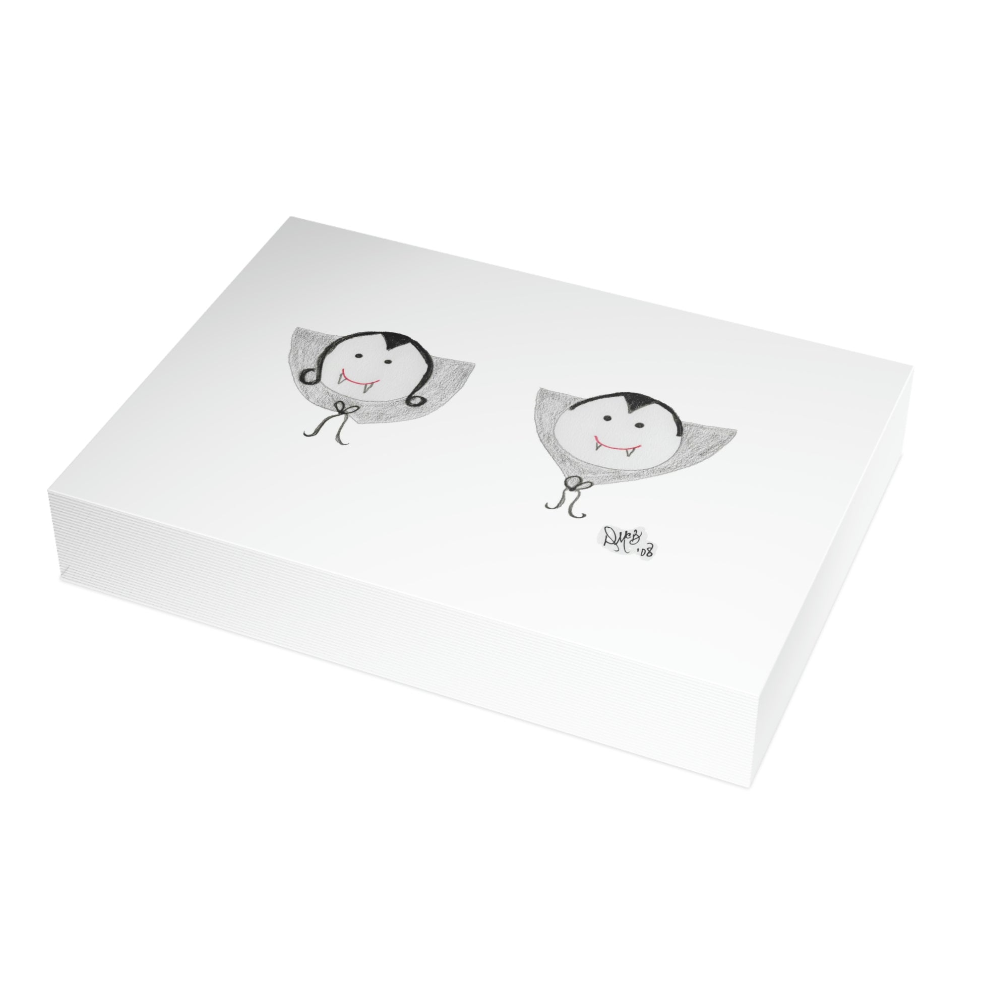 5x7 landscape greeting card – We Suck. Sorry We Missed Your Birthday - A pair of vampires on the front of the card apologizing for sending a belated card. What could be better to show contrition? Certainly there is nothing as remorseful as a vampire with all of their warm and fuzzy feelings! Your recipient will go batty with glee when they get this card! Original drawing is colored pencil on paper, scanned in and placed on the card.