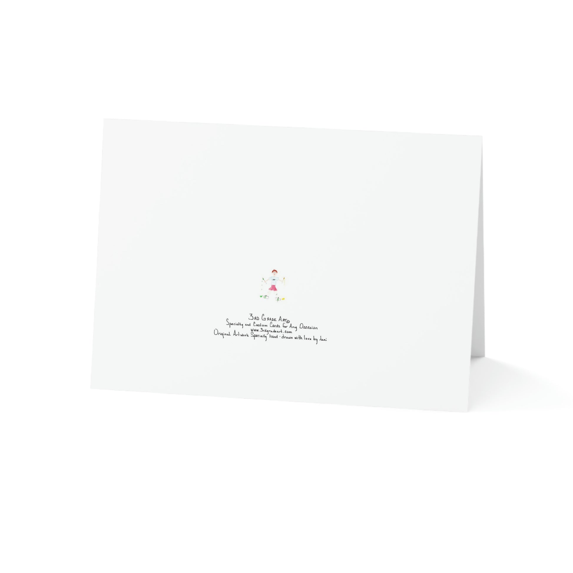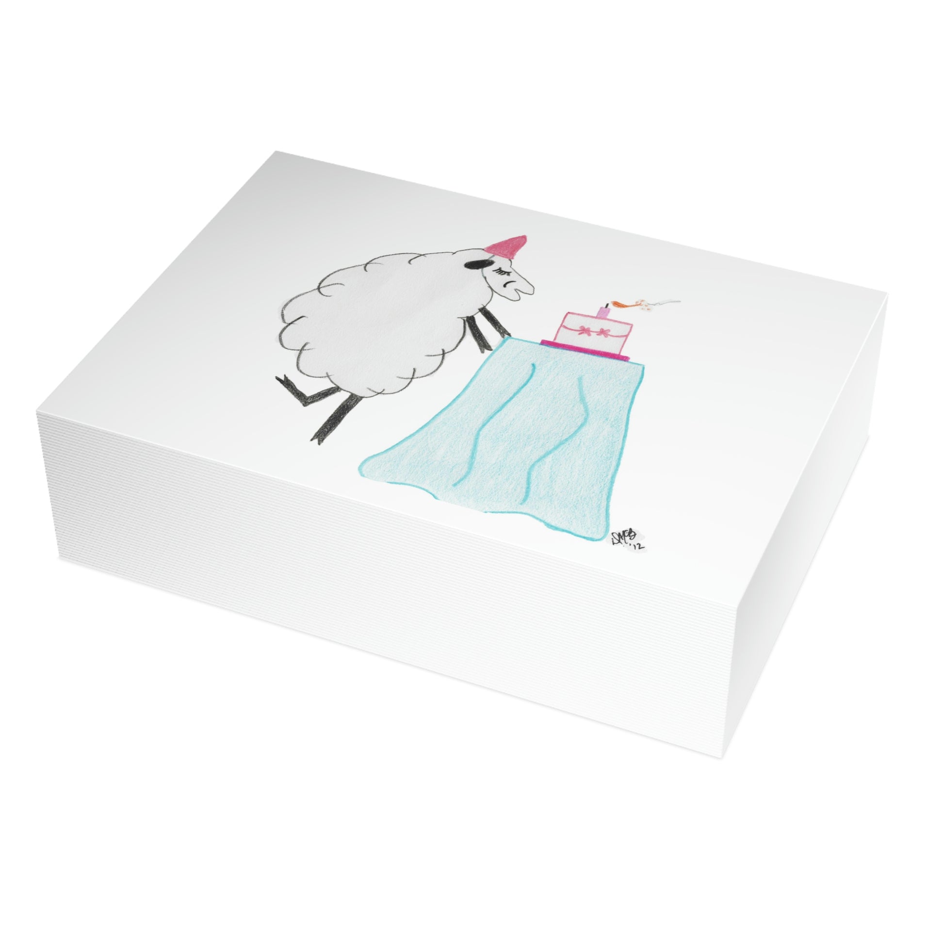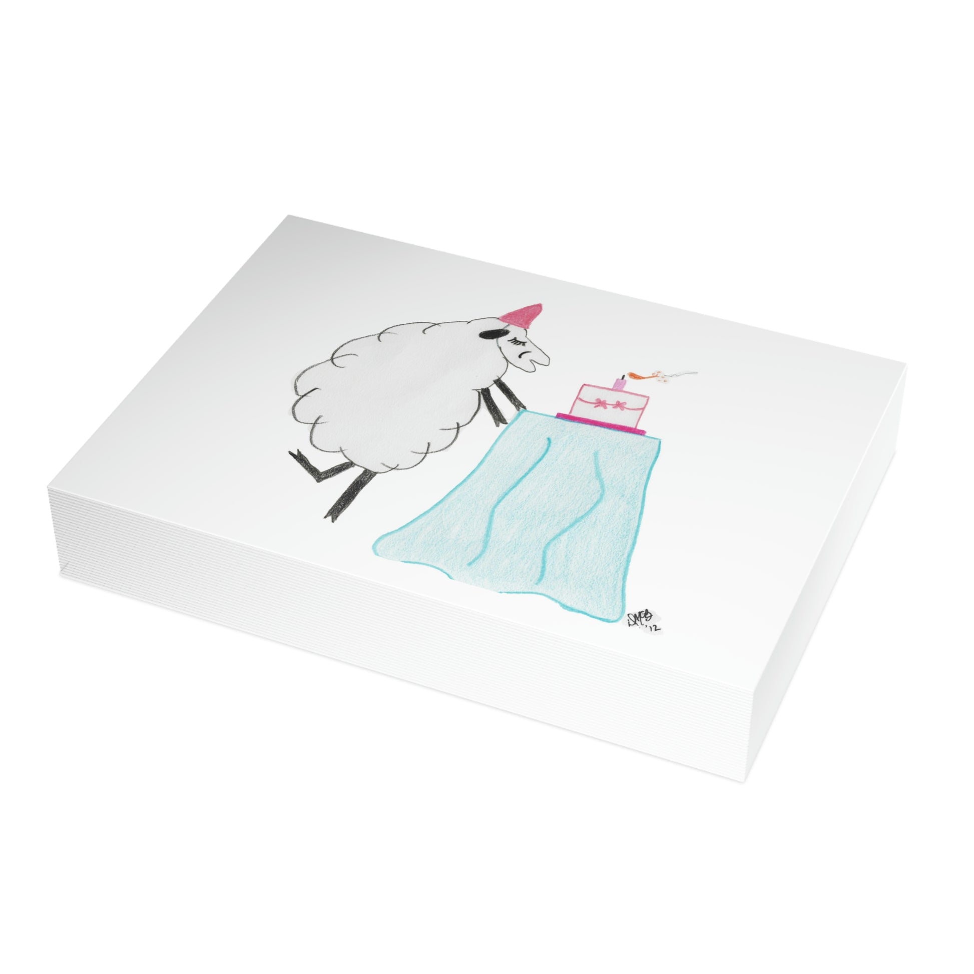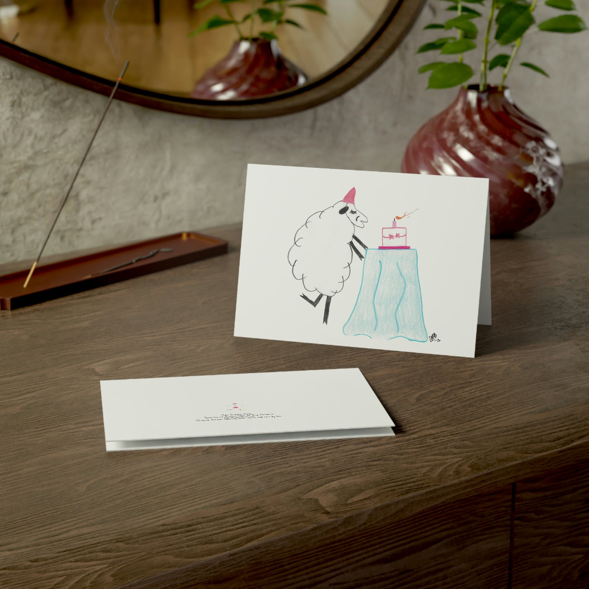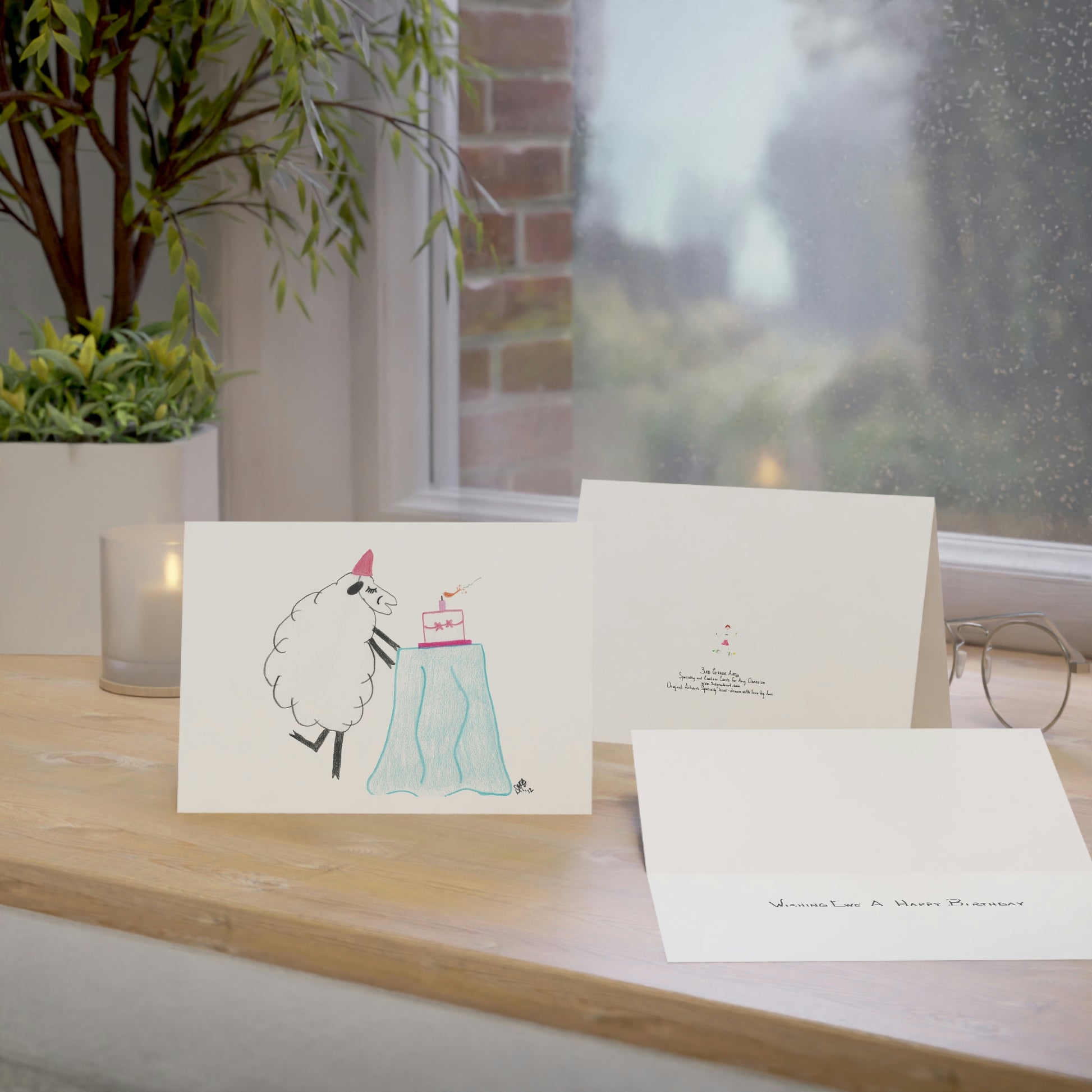 5x7 landscape greeting card - Wishing Ewe a Happy Birthday - Sheep leaning in to blow out the candle on a cake. The sheep is wearing a birthday hat, and has his/her eyes closed, clearly wishing for their hearts' desire. This is one of my favorite designs. I love sheep. I love using "ewe" instead of "you". I also love to use different/quirky ways of saying something and/or using actions to depict a scene. I hope you love this card! Original drawing is colored pencil on paper, scanned in and placed on the card.