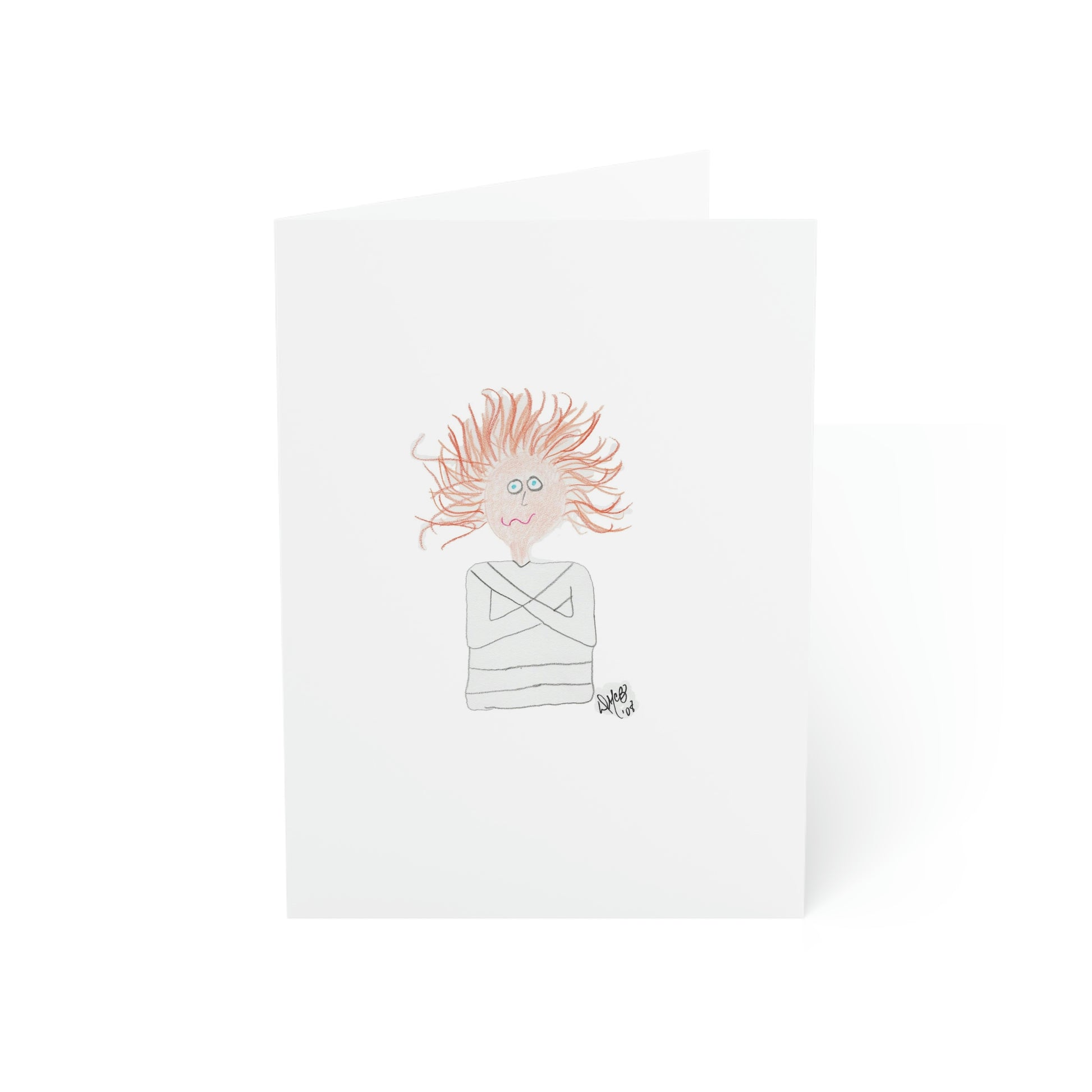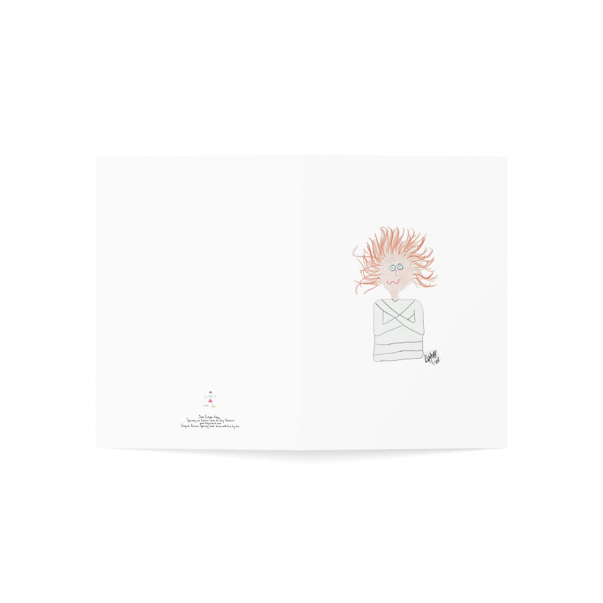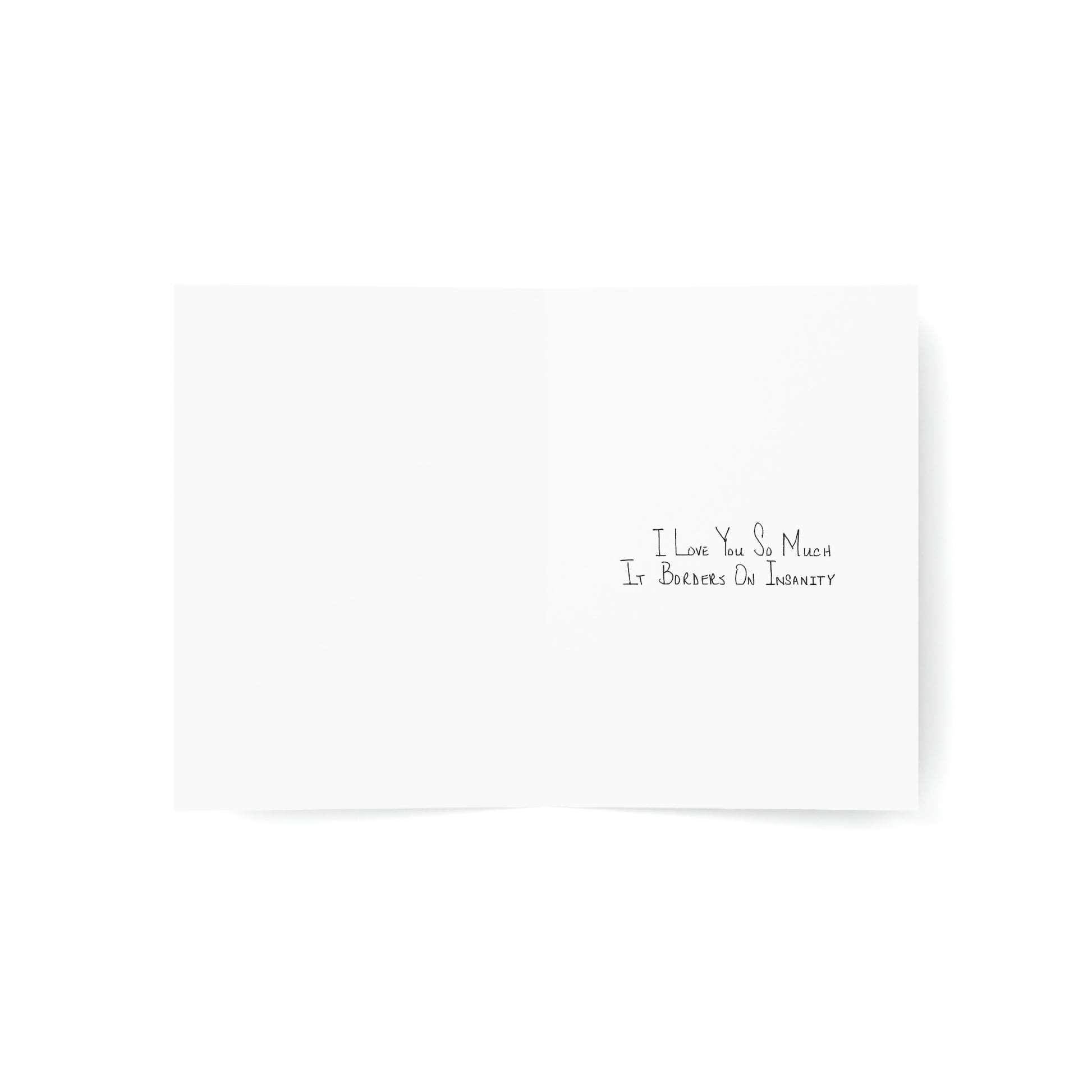 5x7 portrait greeting card - I Love You So Much it Borders on Insanity - person in a straight jacket with hair standing on end and dazed look. Anyone who has fallen deeply in love knows - love is crazy. And it sometimes makes us a little crazy too. Original drawing is colored pencil on paper, scanned in and placed on the card.