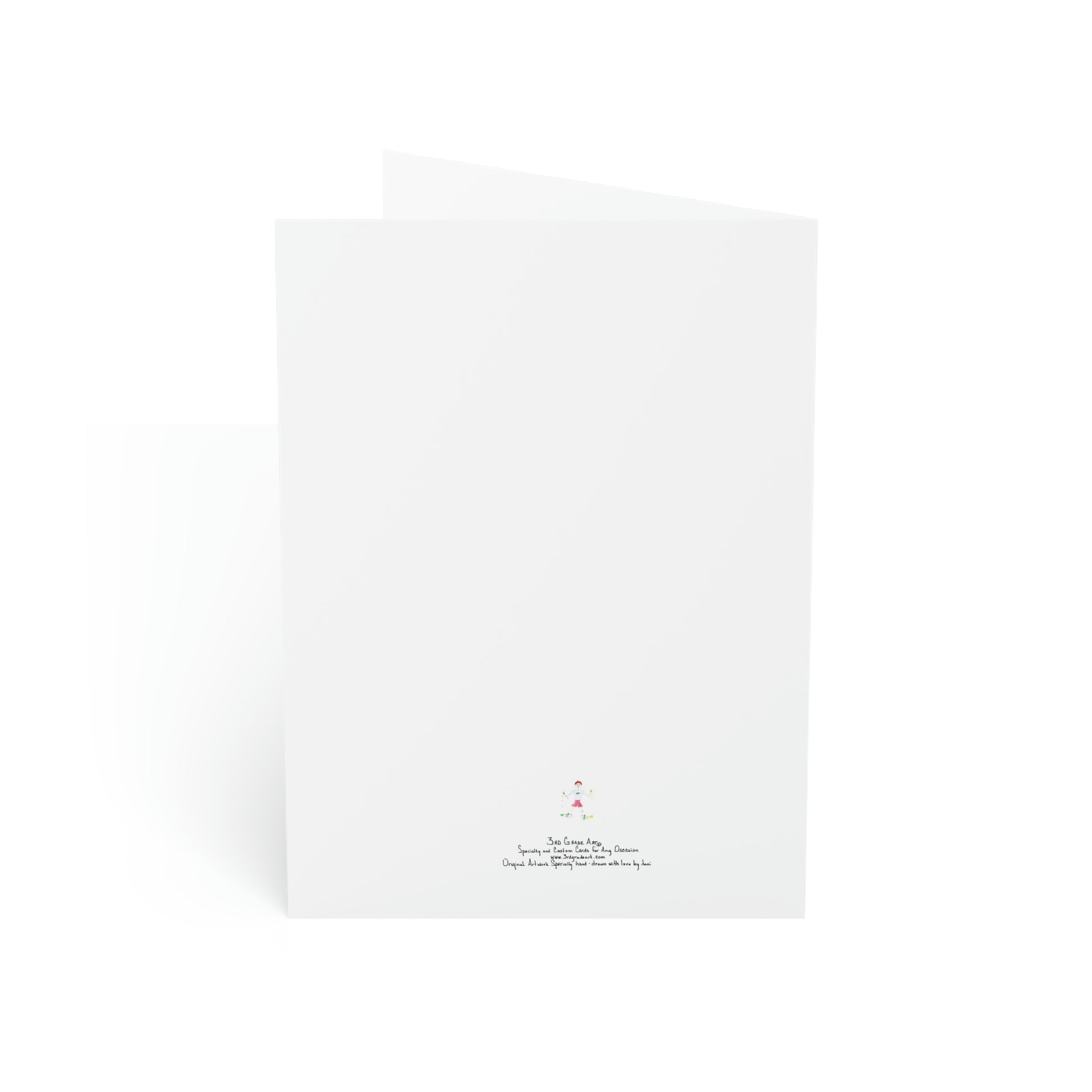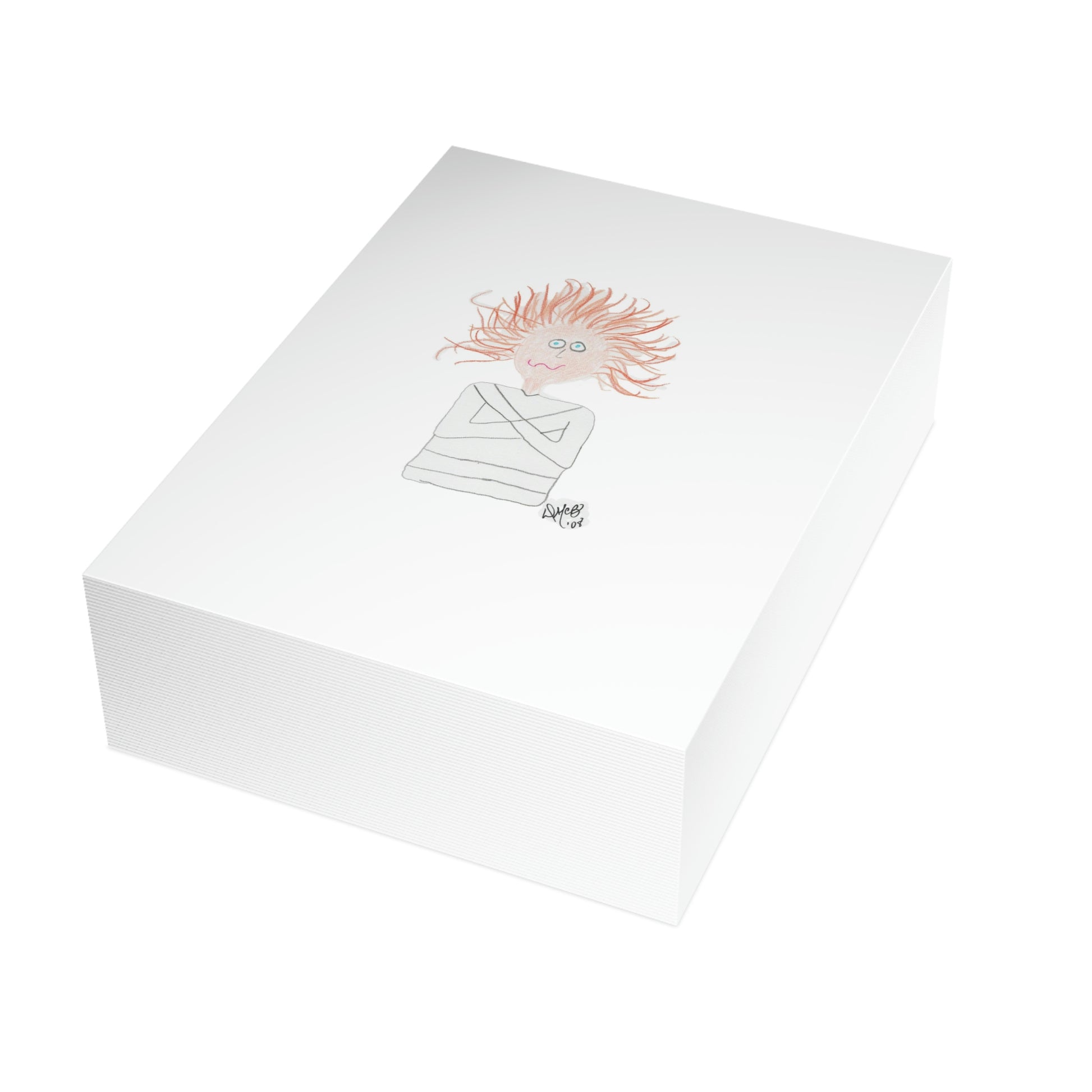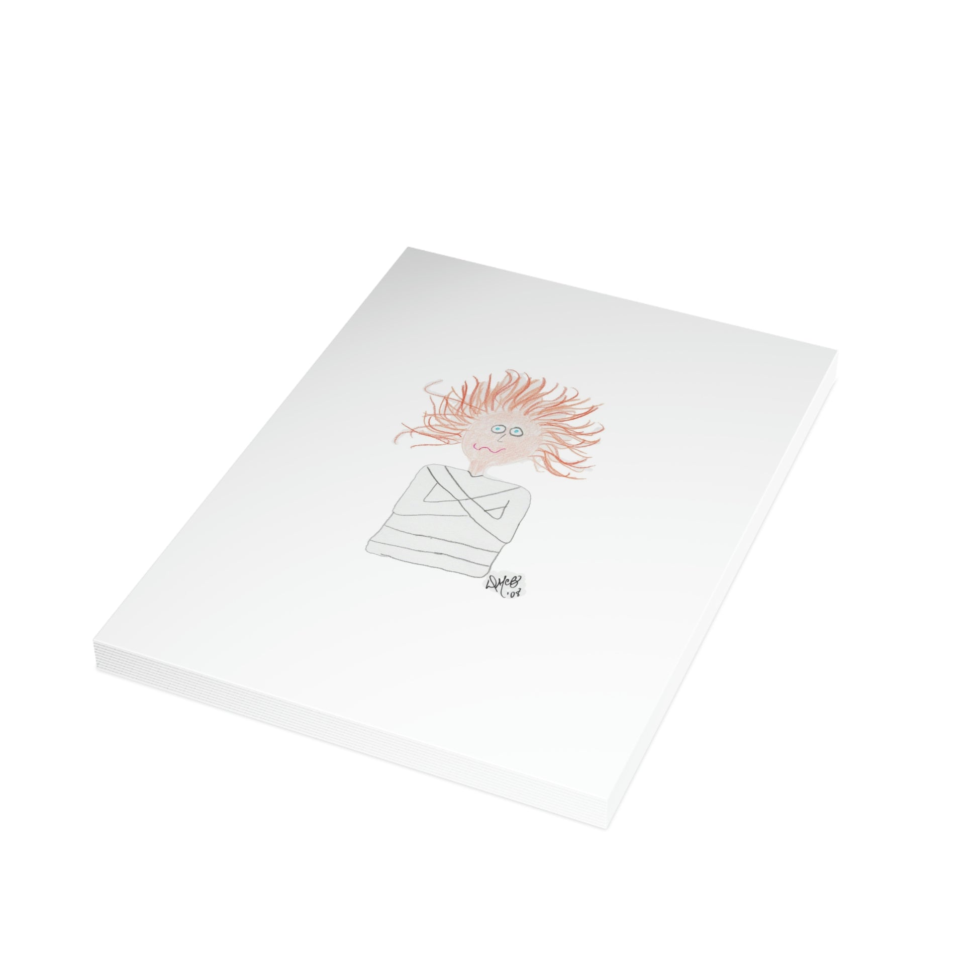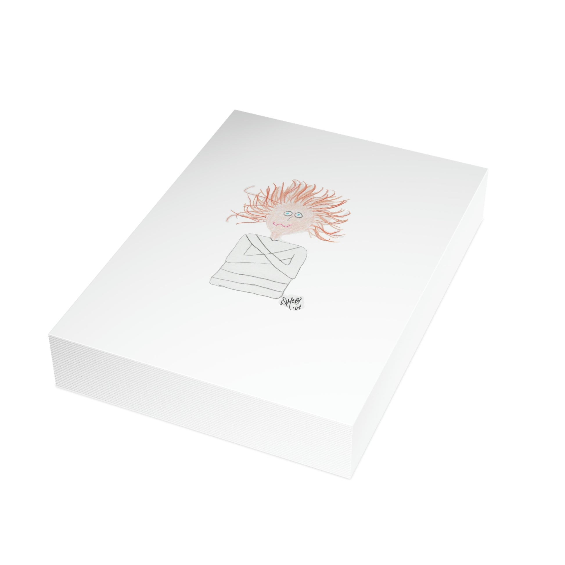 5x7 portrait greeting card - I Love You So Much it Borders on Insanity - person in a straight jacket with hair standing on end and dazed look. Anyone who has fallen deeply in love knows - love is crazy. And it sometimes makes us a little crazy too. Original drawing is colored pencil on paper, scanned in and placed on the card.