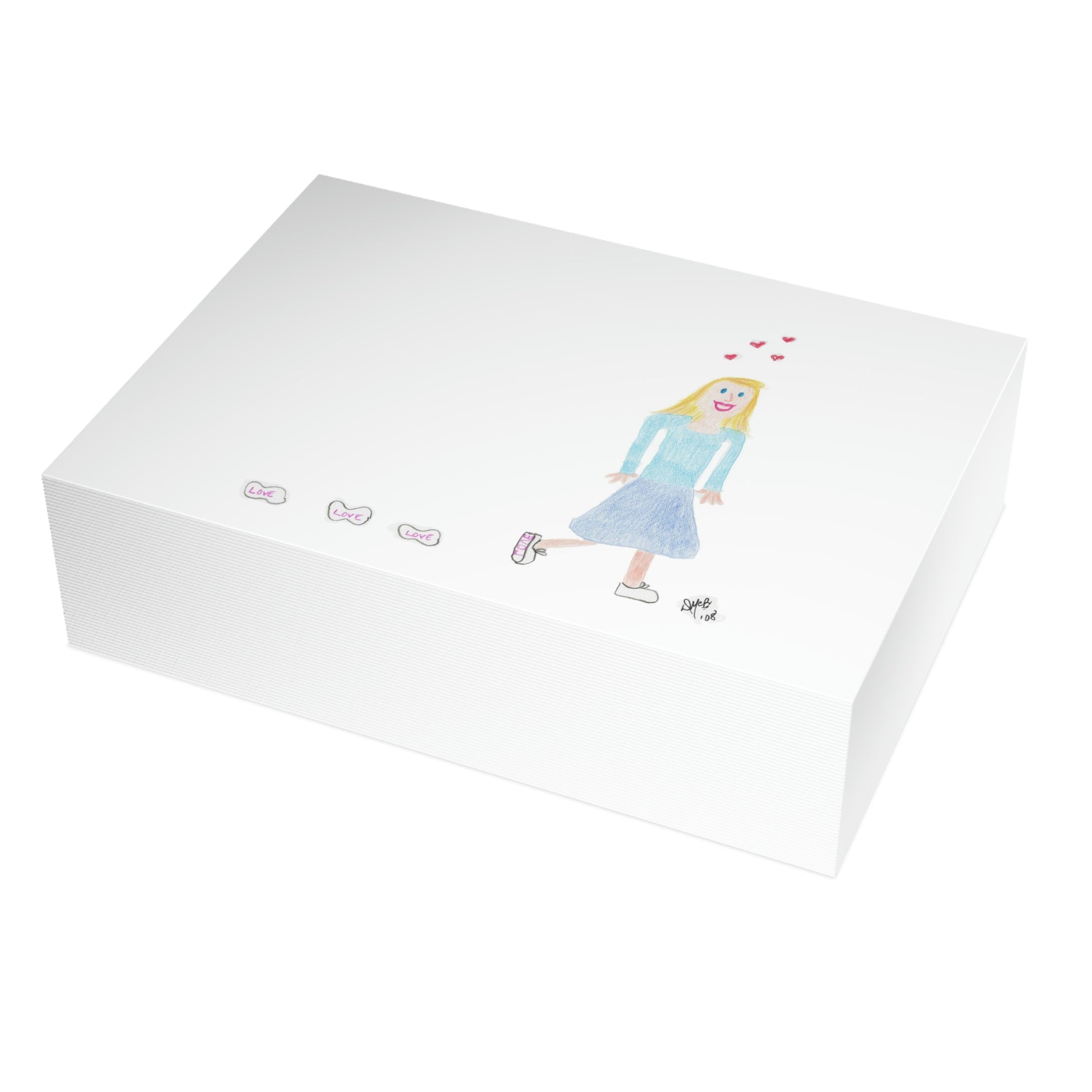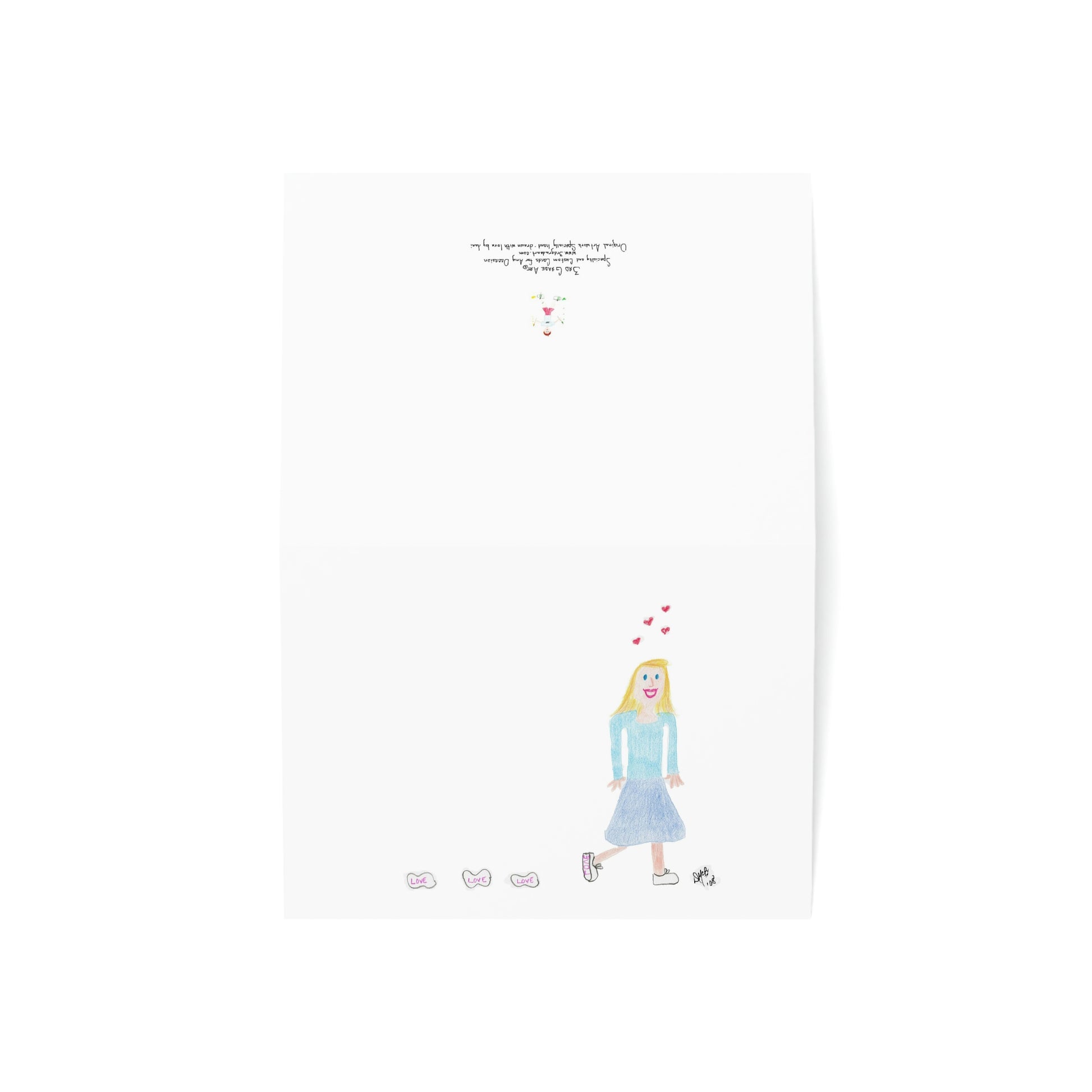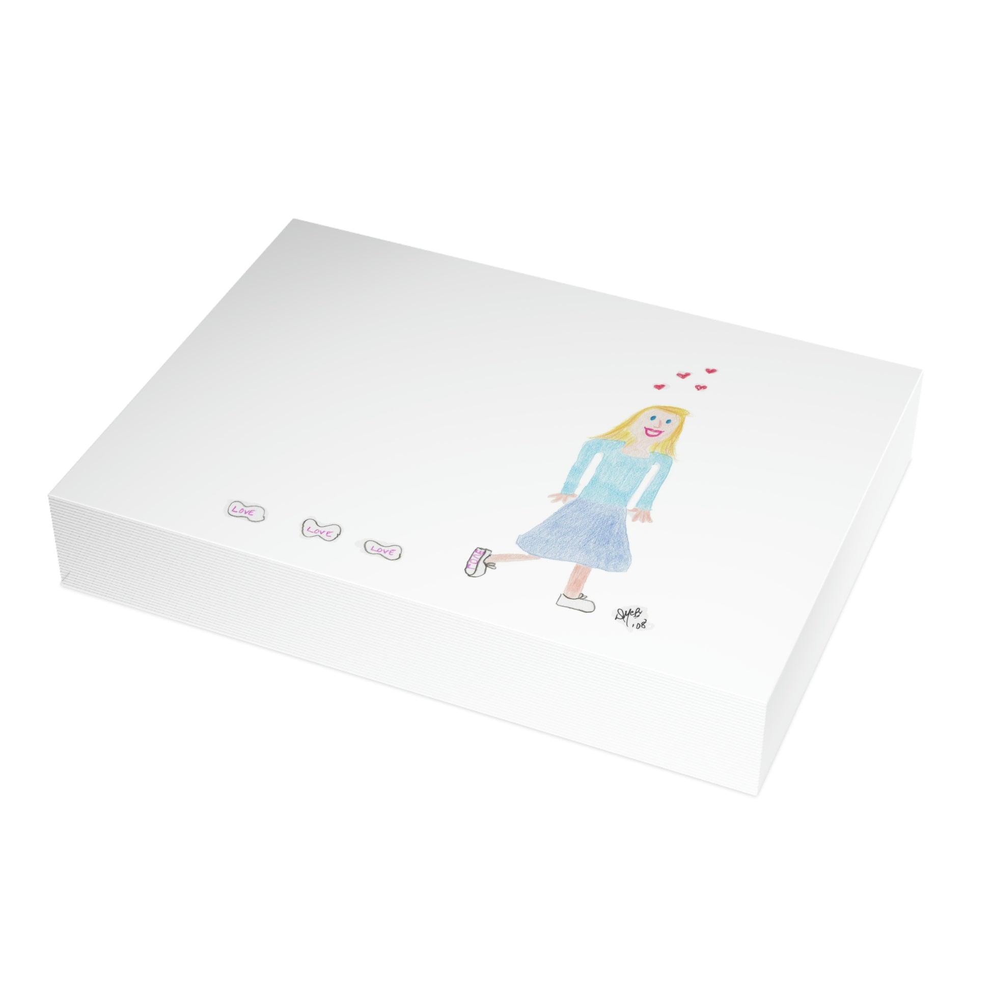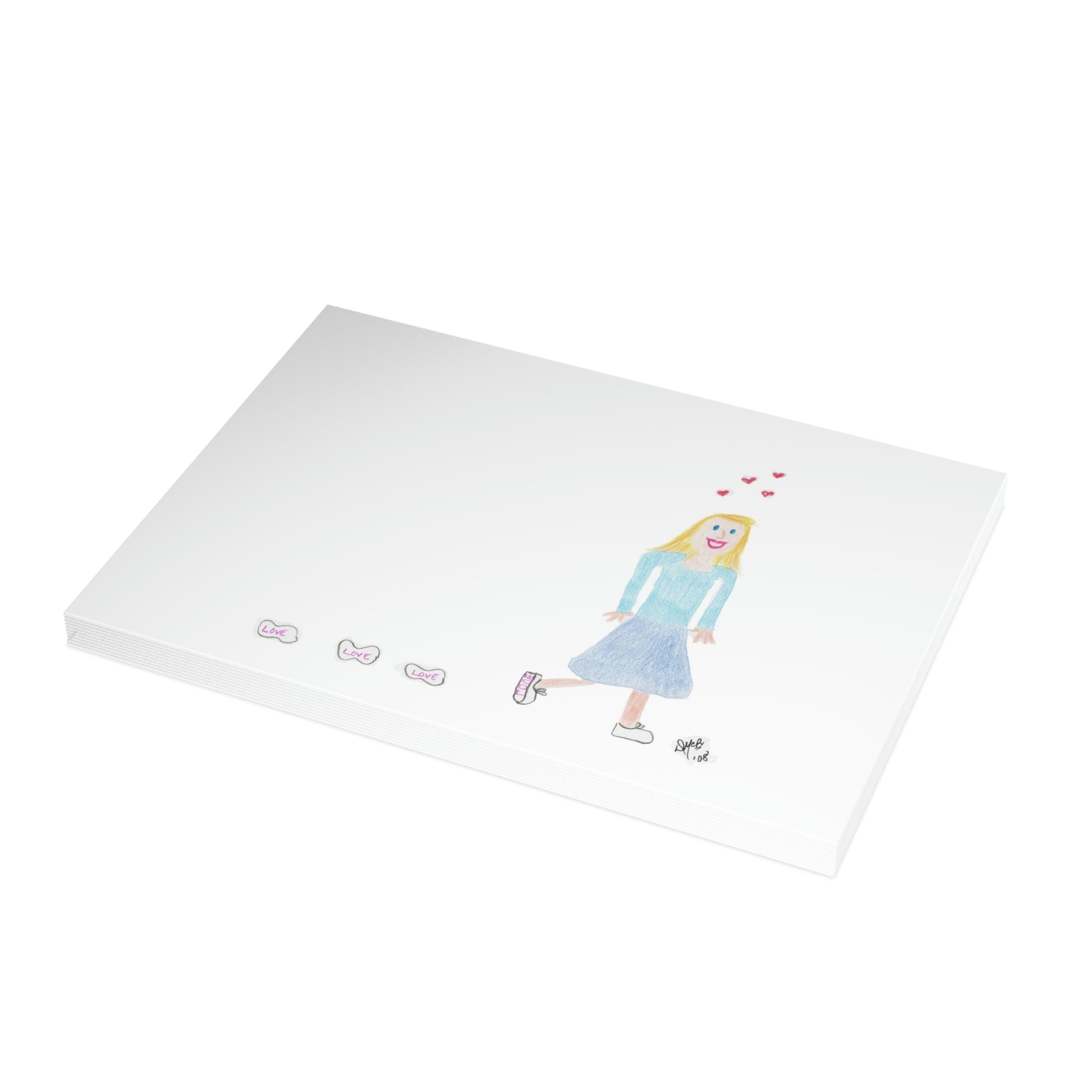 5x7 landscape greeting card - Looks Like You Stepped in Love - Girl walking and leaving "love" footprints as she goes. I enjoy coming up with new and different ways of saying things and depicting different sentiments! Original drawing is colored pencil on paper, scanned in and placed on the card. Can be used for Valentine's Day, general greeting for a friend, etc.