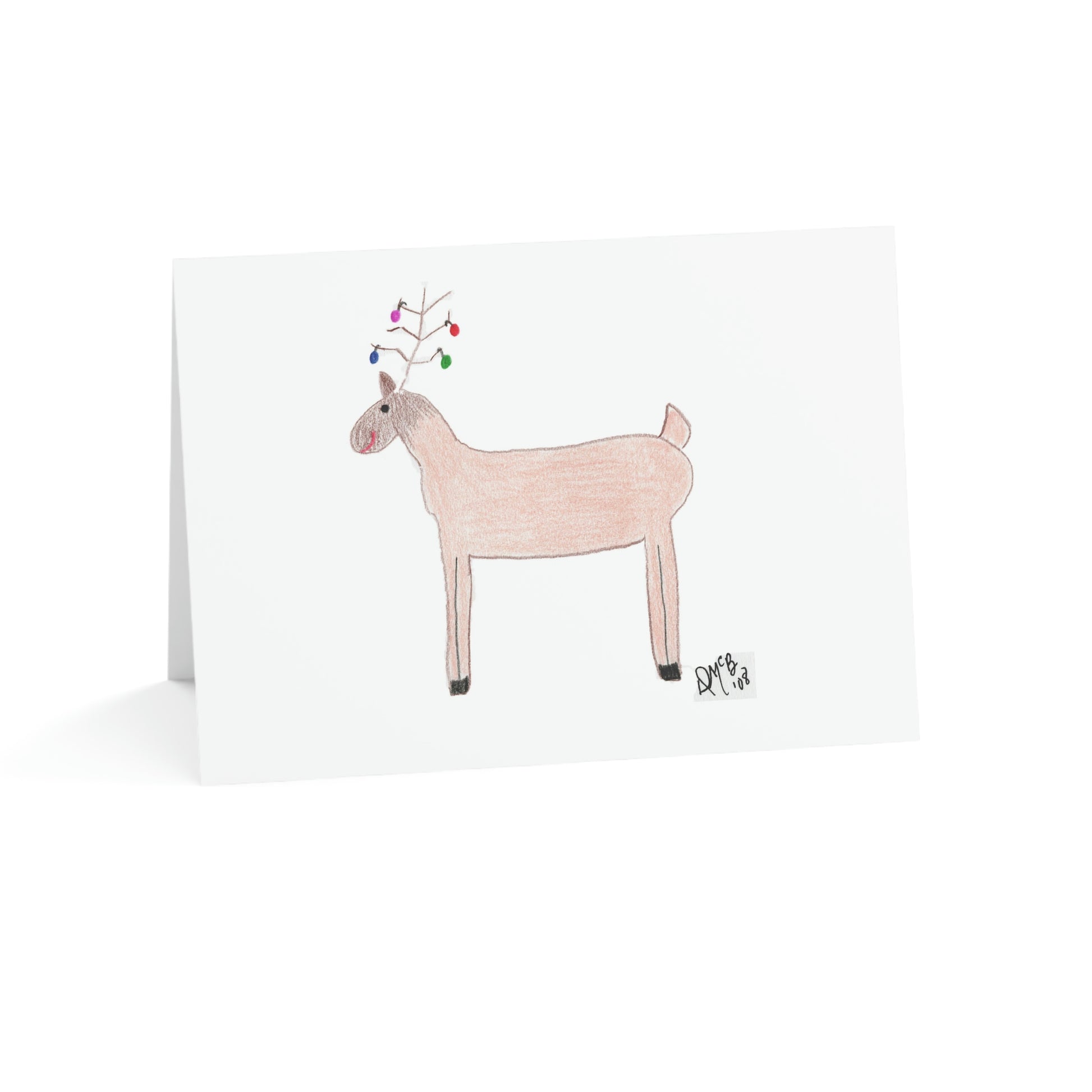 5x7 landscape greeting card – Happy Nude Deer - A Deer that has no fur on it except for the head, adorned with ornaments on its antlers. And it's smiling, so it is in fact, happy. It apparently embraced the lifestyle and has no problem showing it. Original drawing is colored pencil on paper, scanned in and placed on the card.