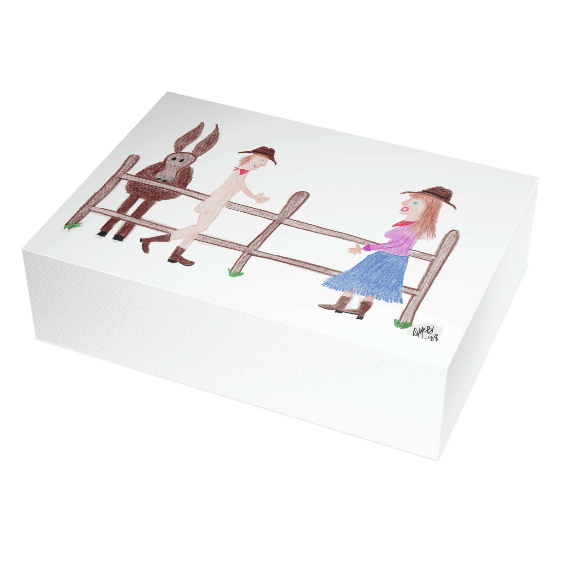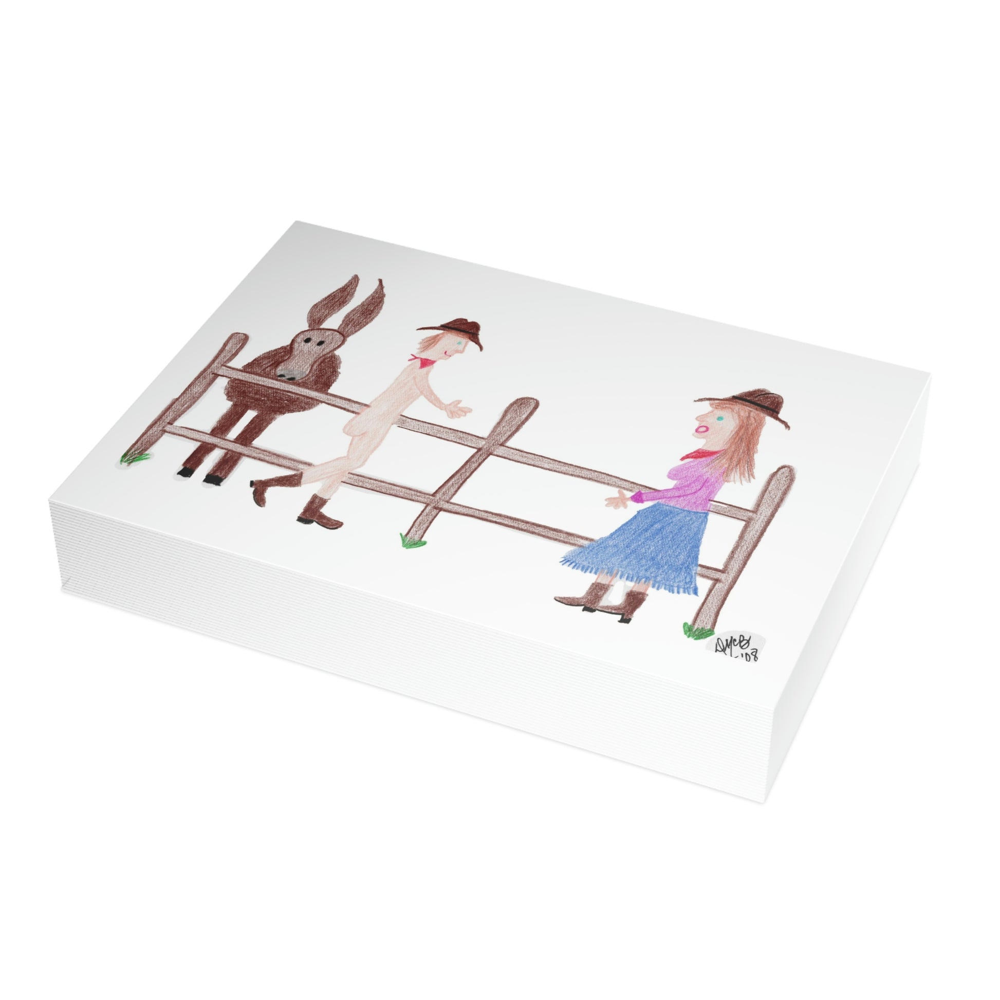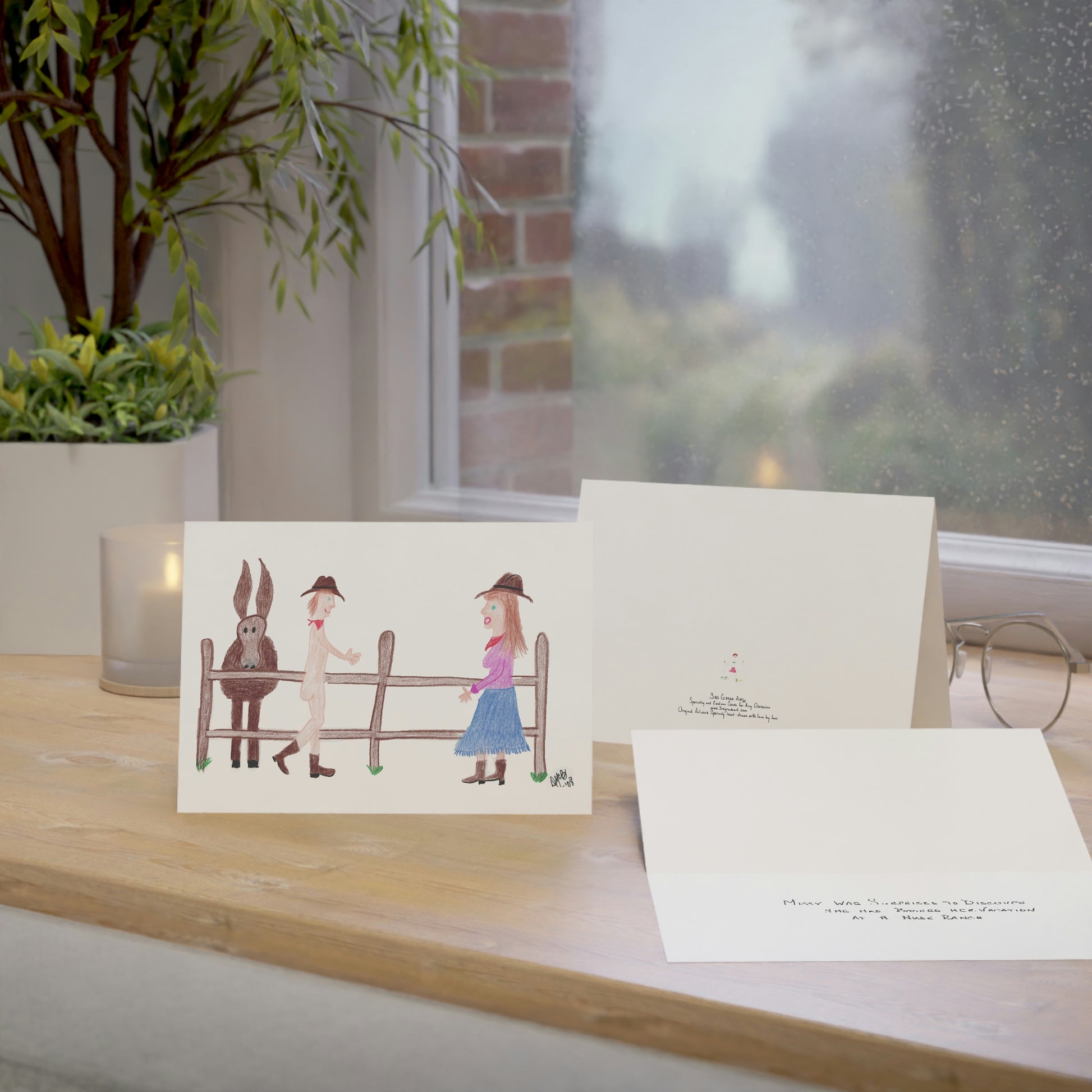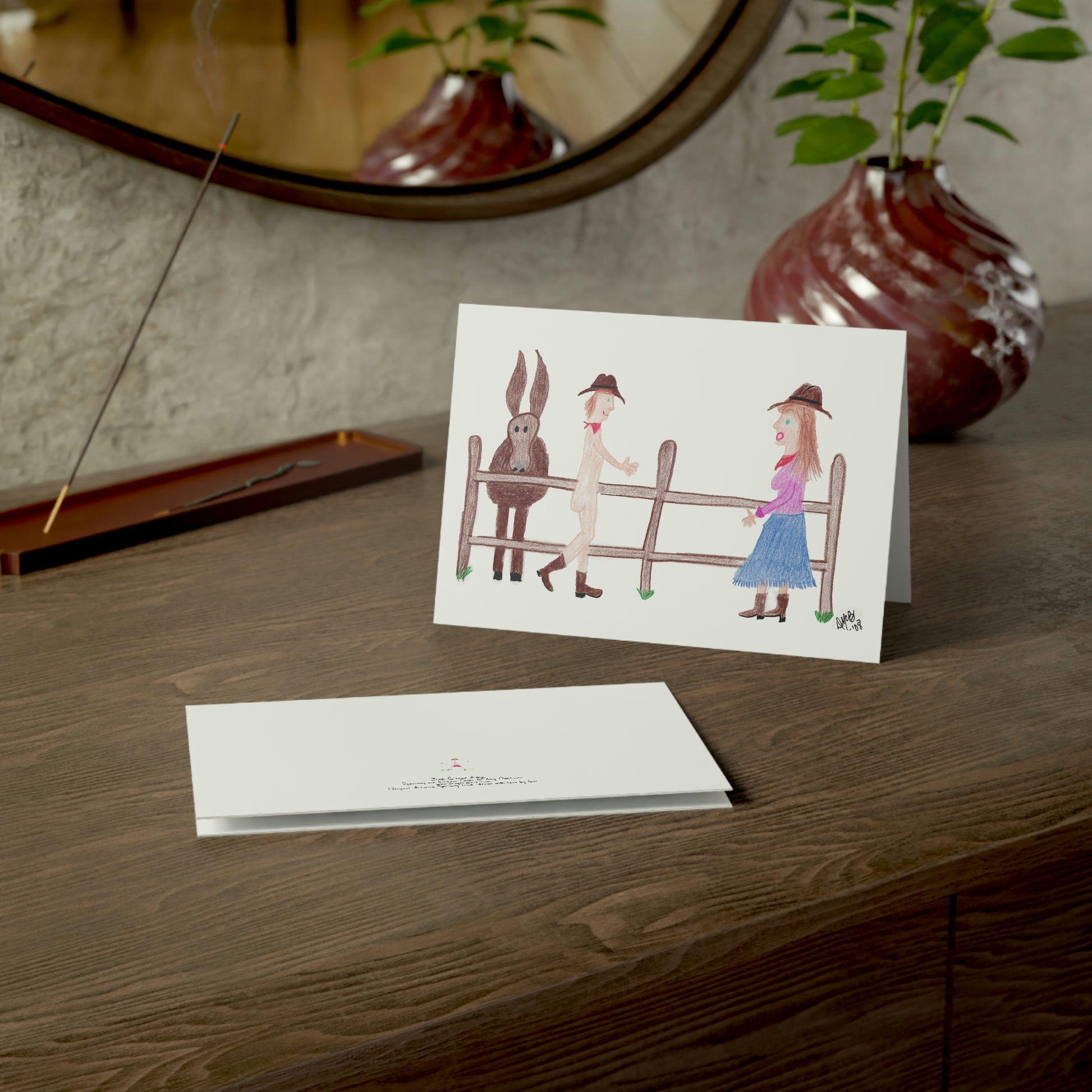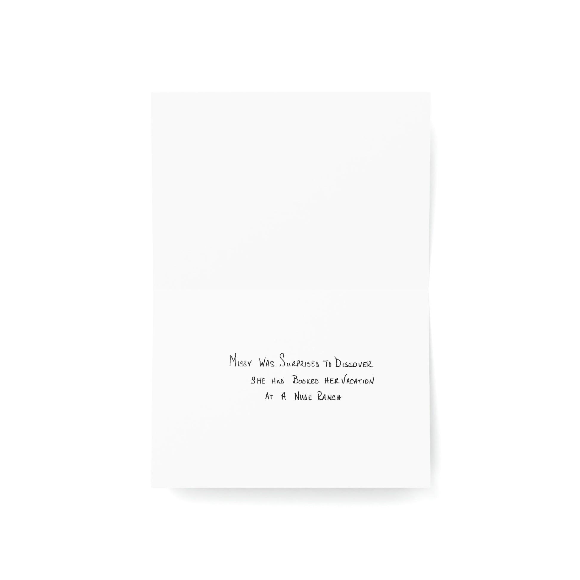 5x7 landscape greeting card – Missy Was Surprised She Booked Her Vacation at a Nude Ranch - split rail fence with a donkey behind it, watching the drama unfold as Missy, in her cliche fringed skirt, boots, cowgirl hat and spiffy blouse, gets greeted by a dude in the nude. He is wearing boots, a hat, a neckerchief, and nothing else. Oh, the perils of booking vacations on your phone...the words "dude" and "nude" look extremely similar on a four inch screen. From now on, she will book on her laptop - unless she decides to embrace the lifestyle! This is the card to send out for no particular reason, just to make someone giggle. Original drawing is colored pencil on paper, scanned in and placed on the card.