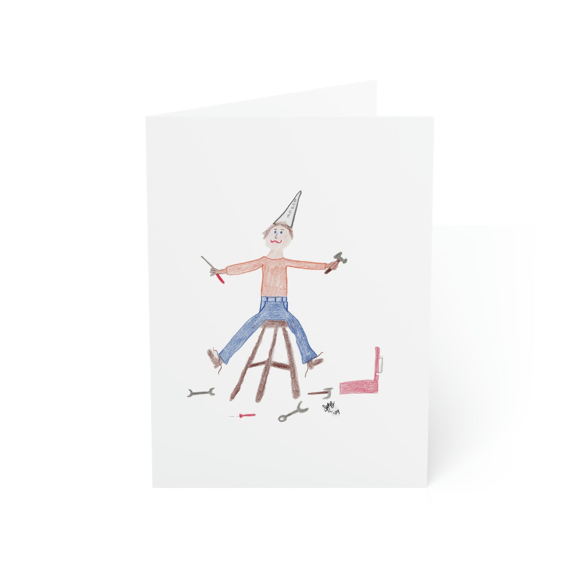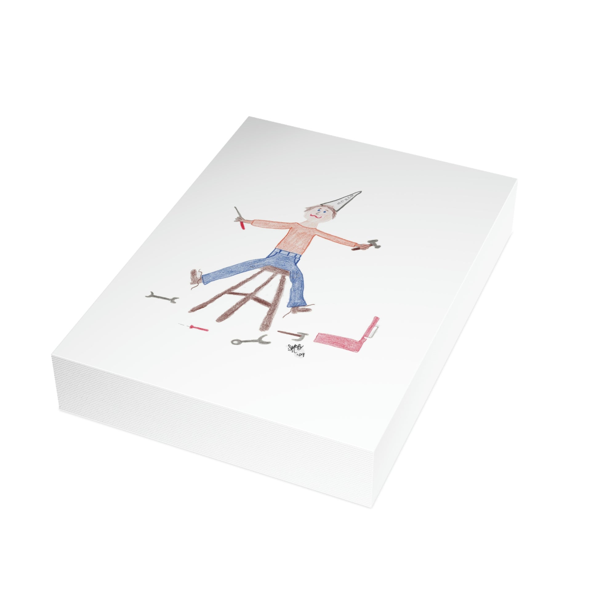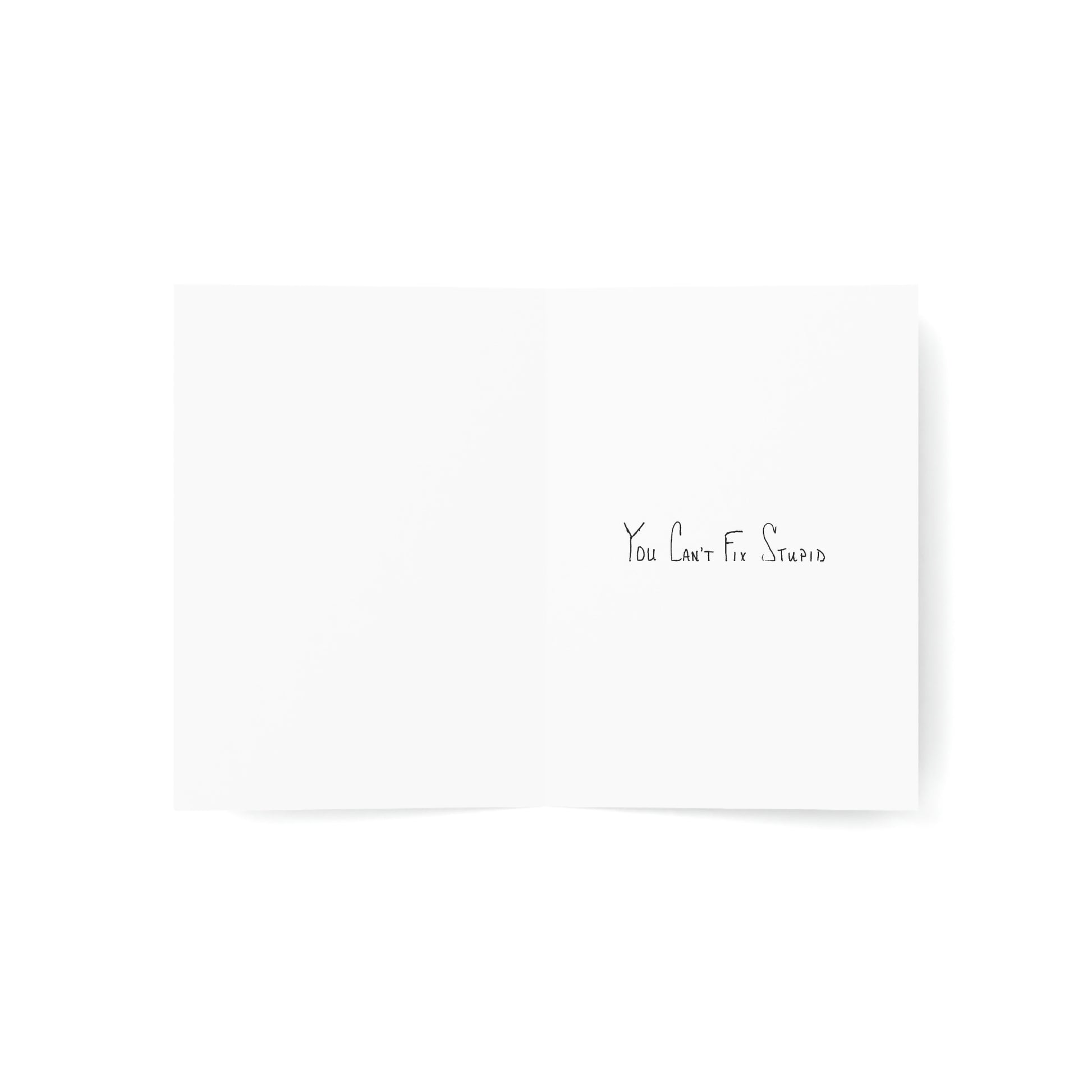5x7 portrait greeting card – You Can't Fix Stupid - A male wearing a dunce cap with tools strewn about - as though he's trying to "fix" his stupid mistakes. Another great card when someone is frustrated with bureaucracy, red tape, job politics, or life in general. Show your support to your frustrated friend since they (probably) took the time to vent to you and commiserate. Your camaraderie will be appreciated. Original drawing is colored pencil on paper, scanned in and placed on the card.