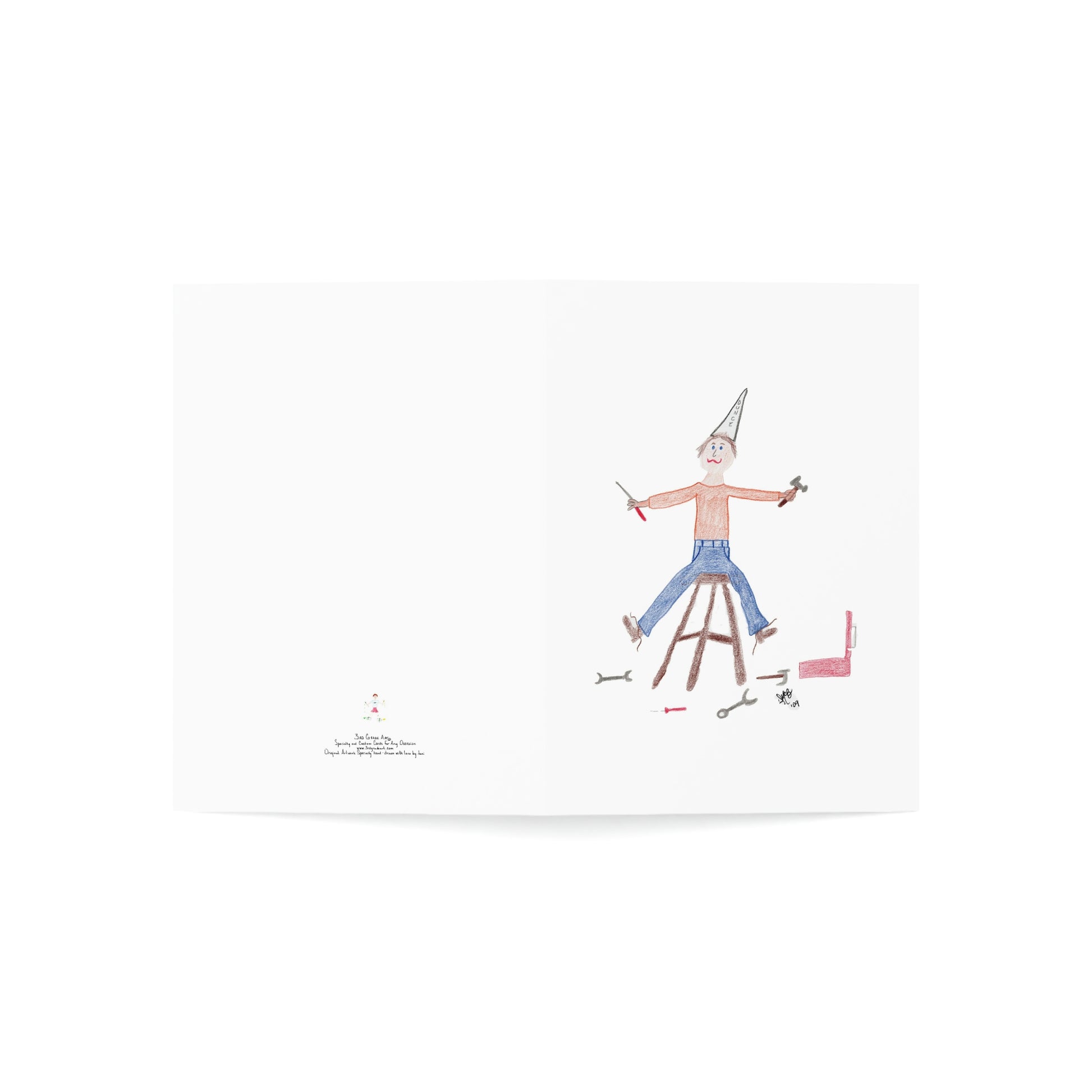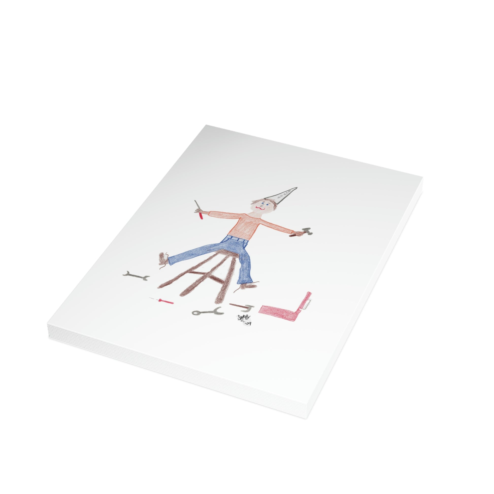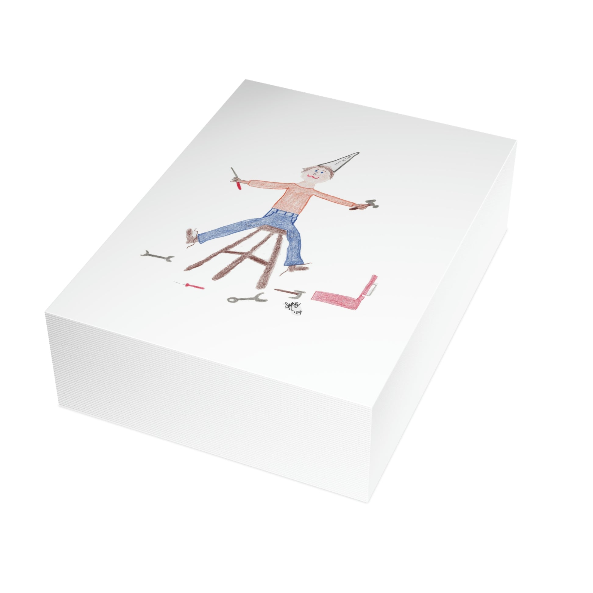 5x7 portrait greeting card – You Can't Fix Stupid - A male wearing a dunce cap with tools strewn about - as though he's trying to "fix" his stupid mistakes. Another great card when someone is frustrated with bureaucracy, red tape, job politics, or life in general. Show your support to your frustrated friend since they (probably) took the time to vent to you and commiserate. Your camaraderie will be appreciated. Original drawing is colored pencil on paper, scanned in and placed on the card.