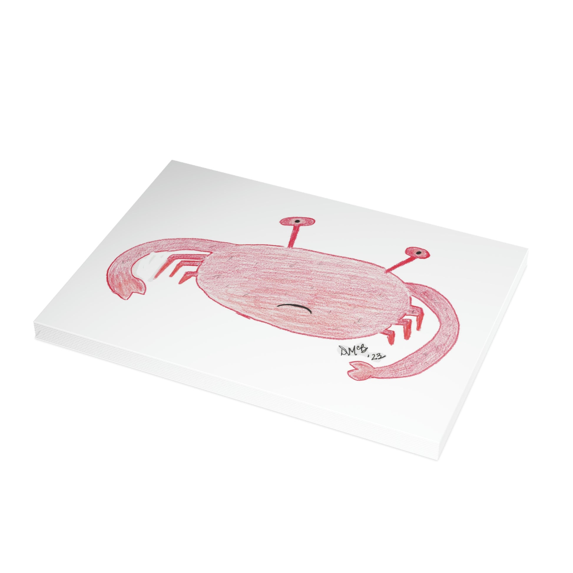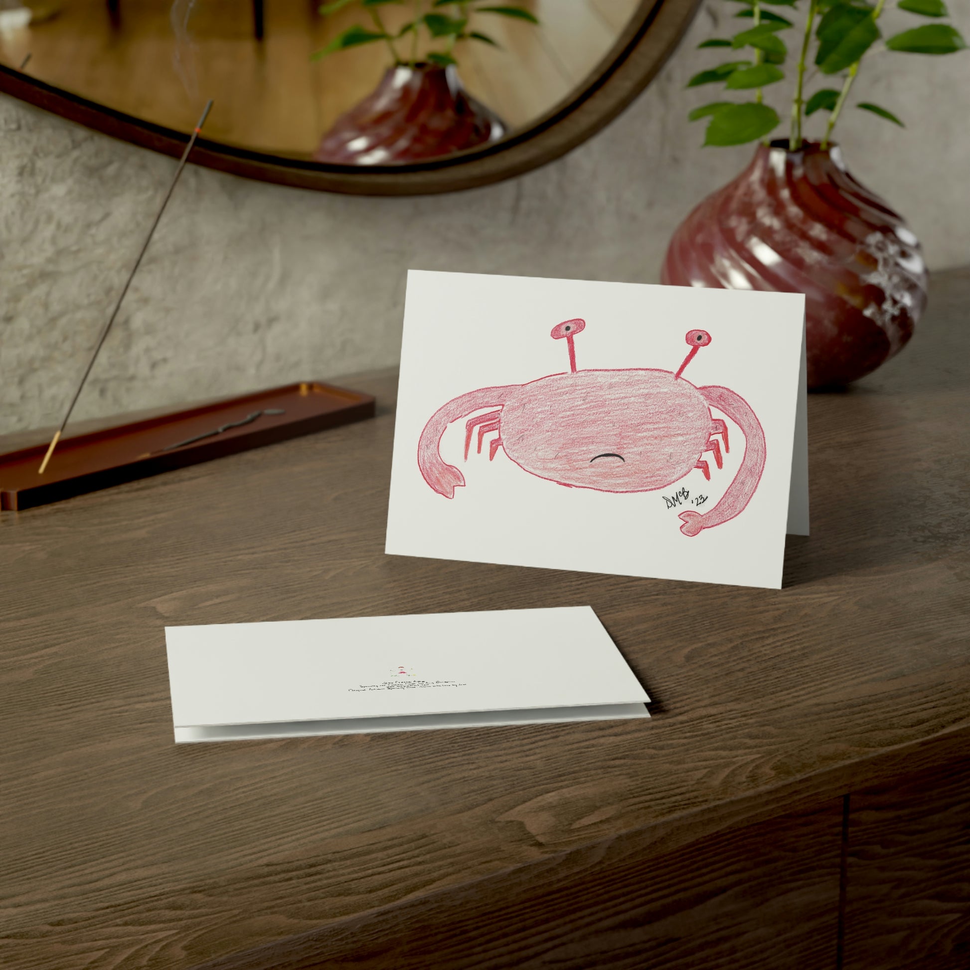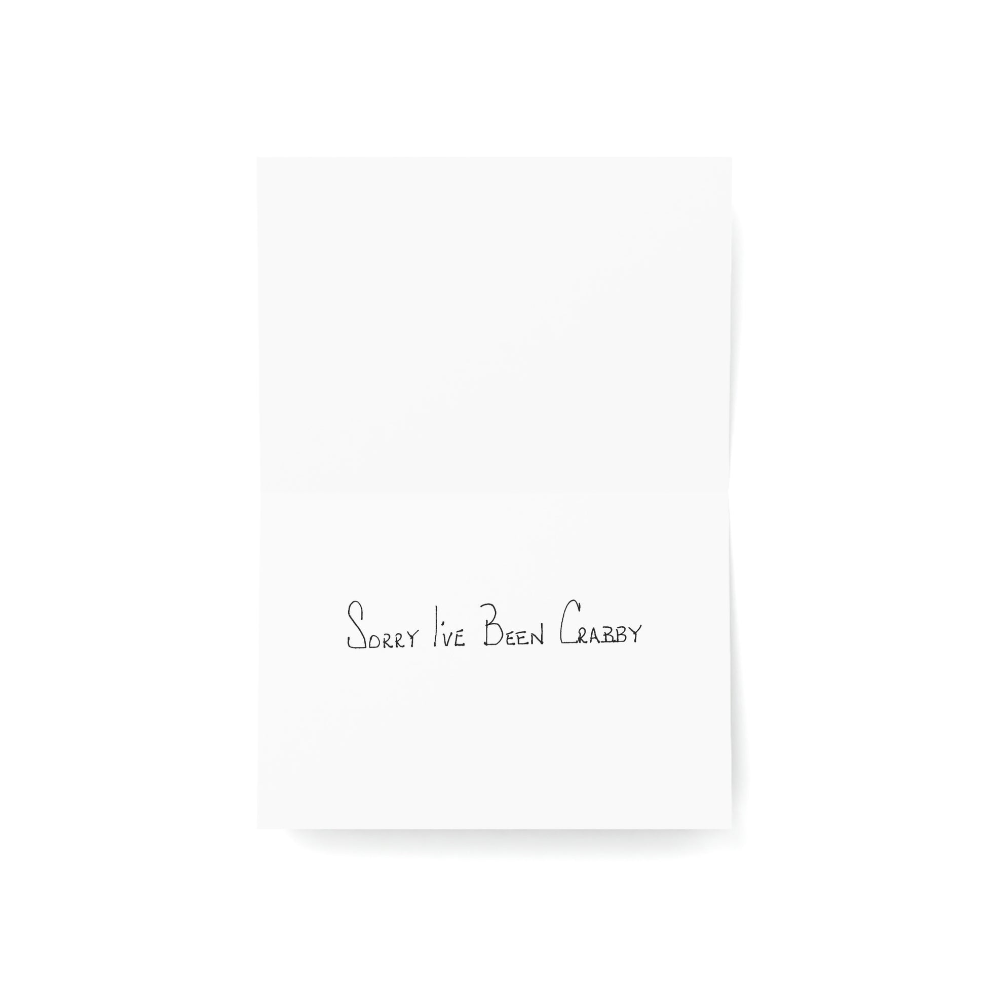 5x7 landscape greeting card – Sorry I've Been Crabby - A grumpy little crab graces the front of this card. He's clearly displeased with something (probably mostly himself). Send this to someone who needs a little explanation of why you've been distant, sullen, or downright crabby. Original drawing is colored pencil on paper, scanned in and placed on the card.