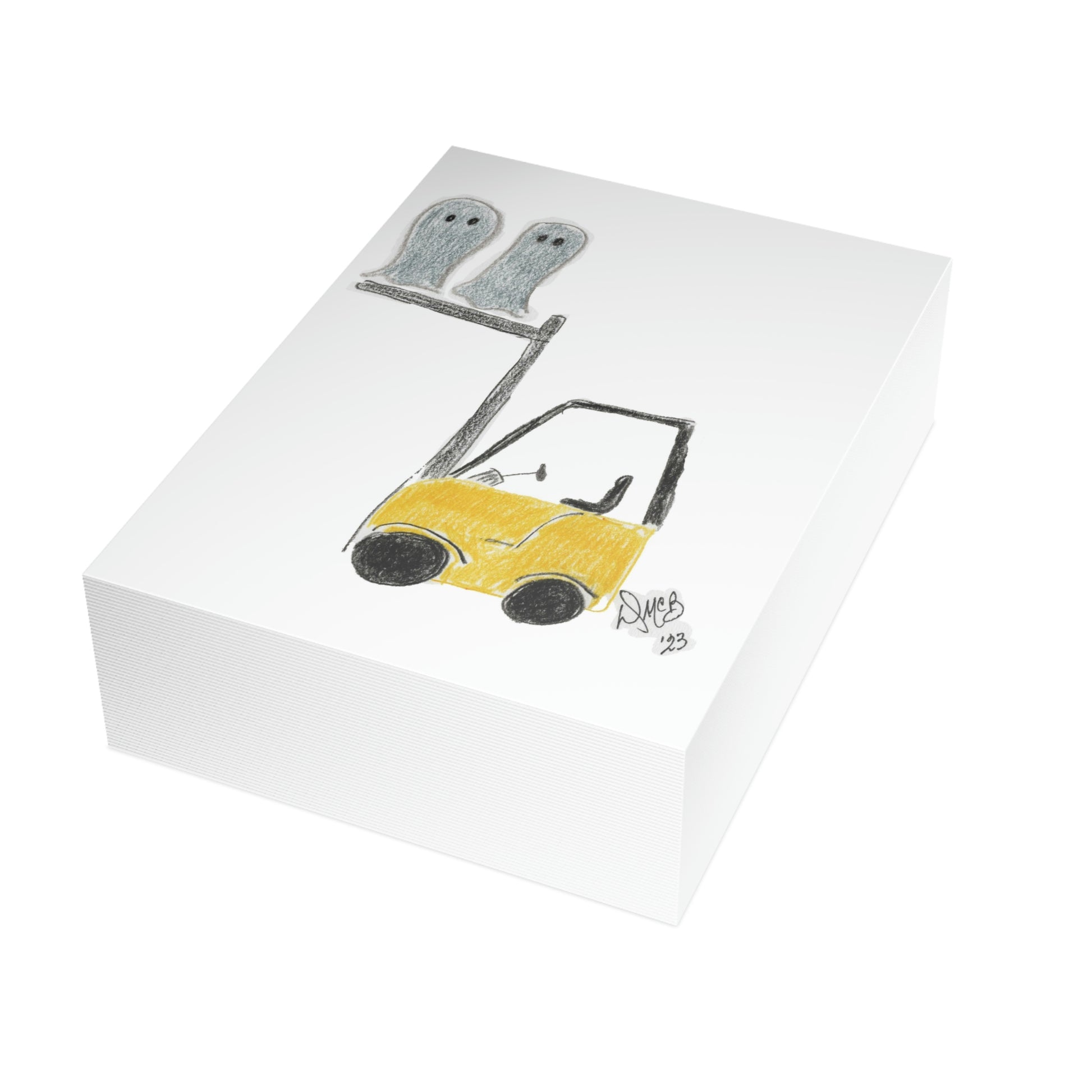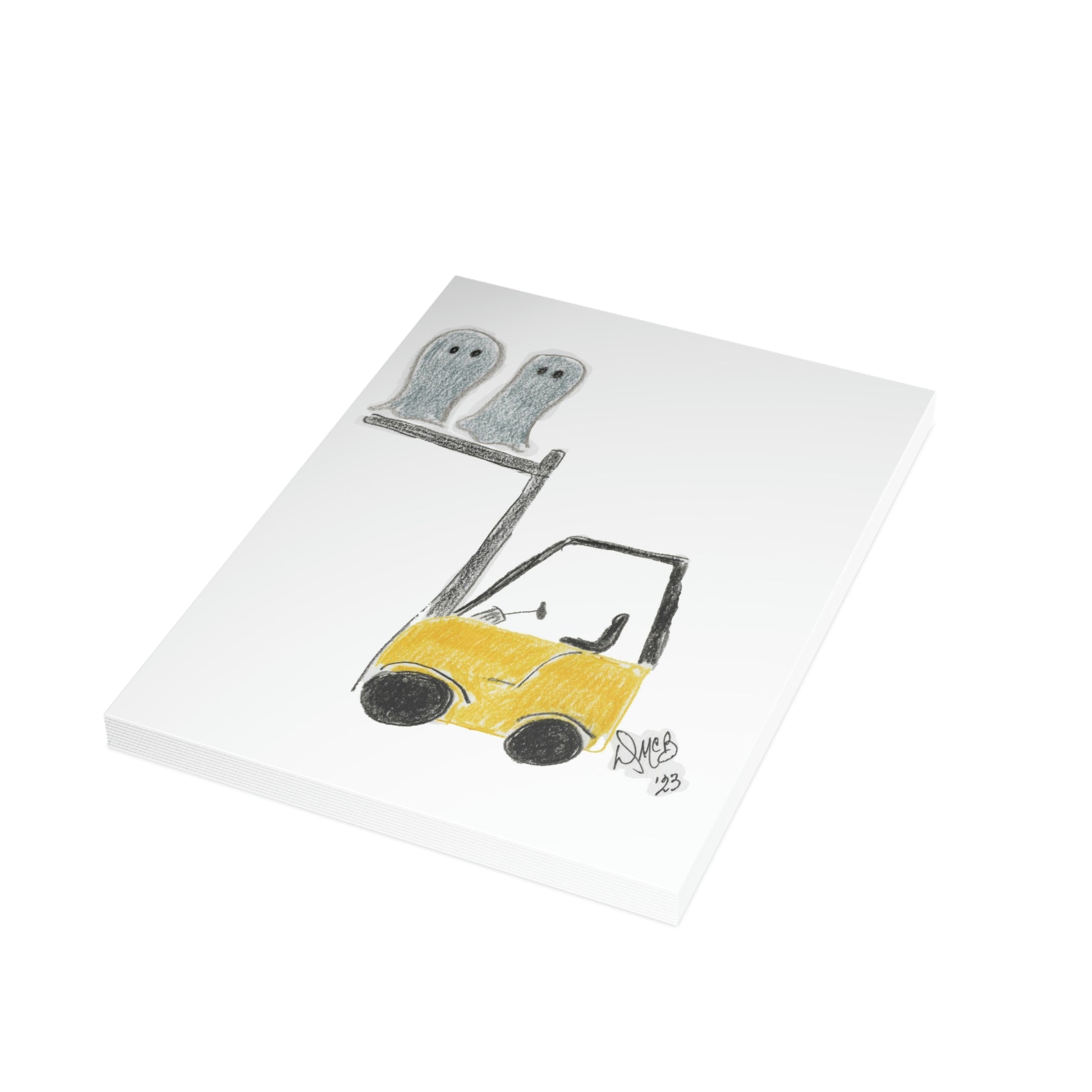 5x7 portrait greeting card – Hope this Card Lifts Your Spirits - A yellow forklift elevates a couple of little ghosts. We all need a little support and encouragement once in a while. This card will express your care of the person who may be down in the mouth. They will appreciate the pick-me-up! Original drawing is colored pencil on paper, scanned in and placed on the card.