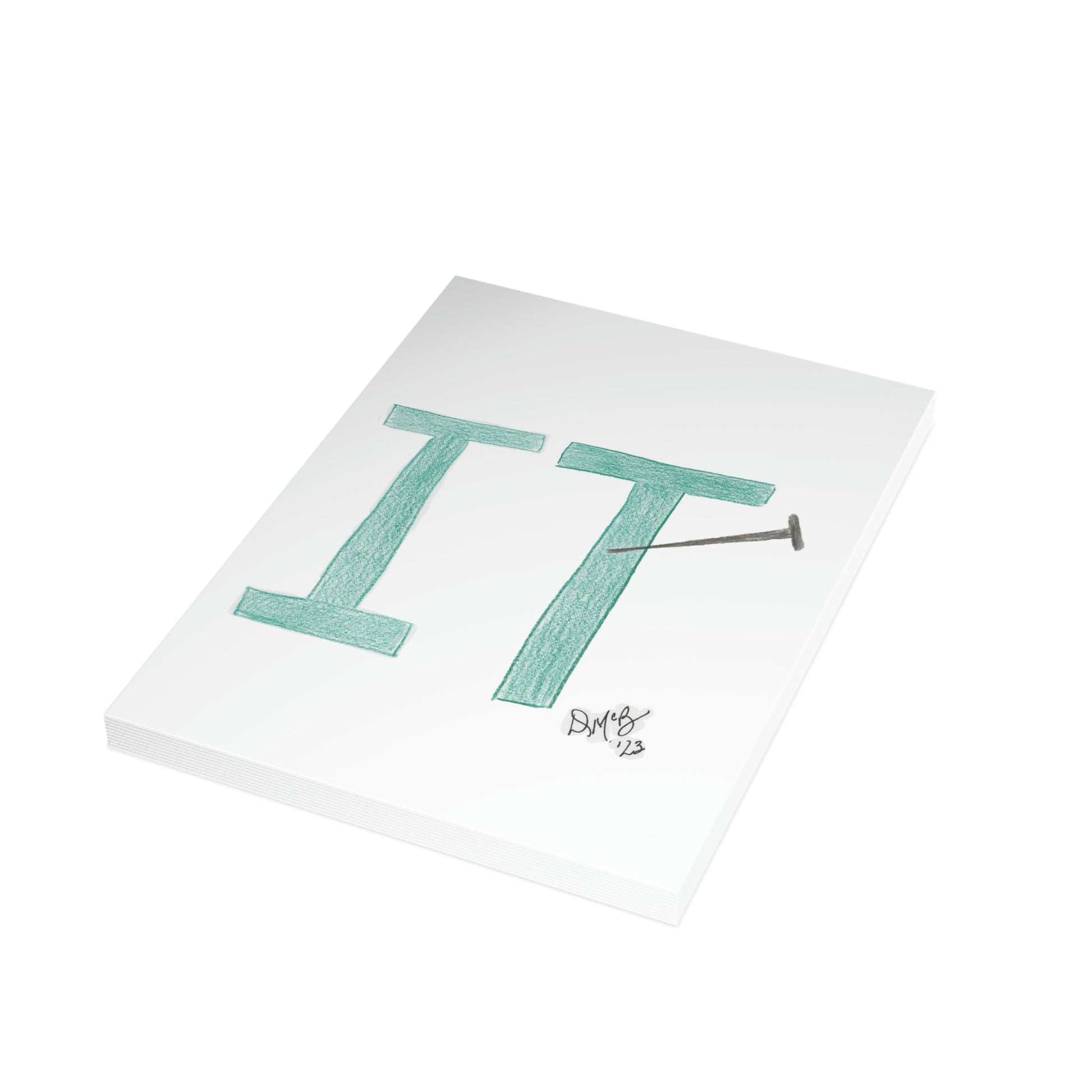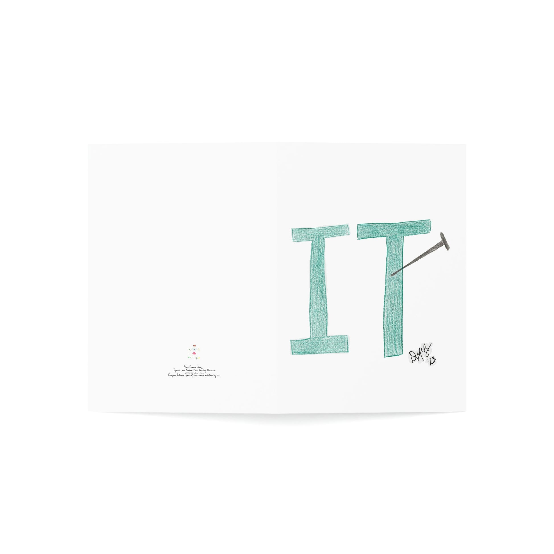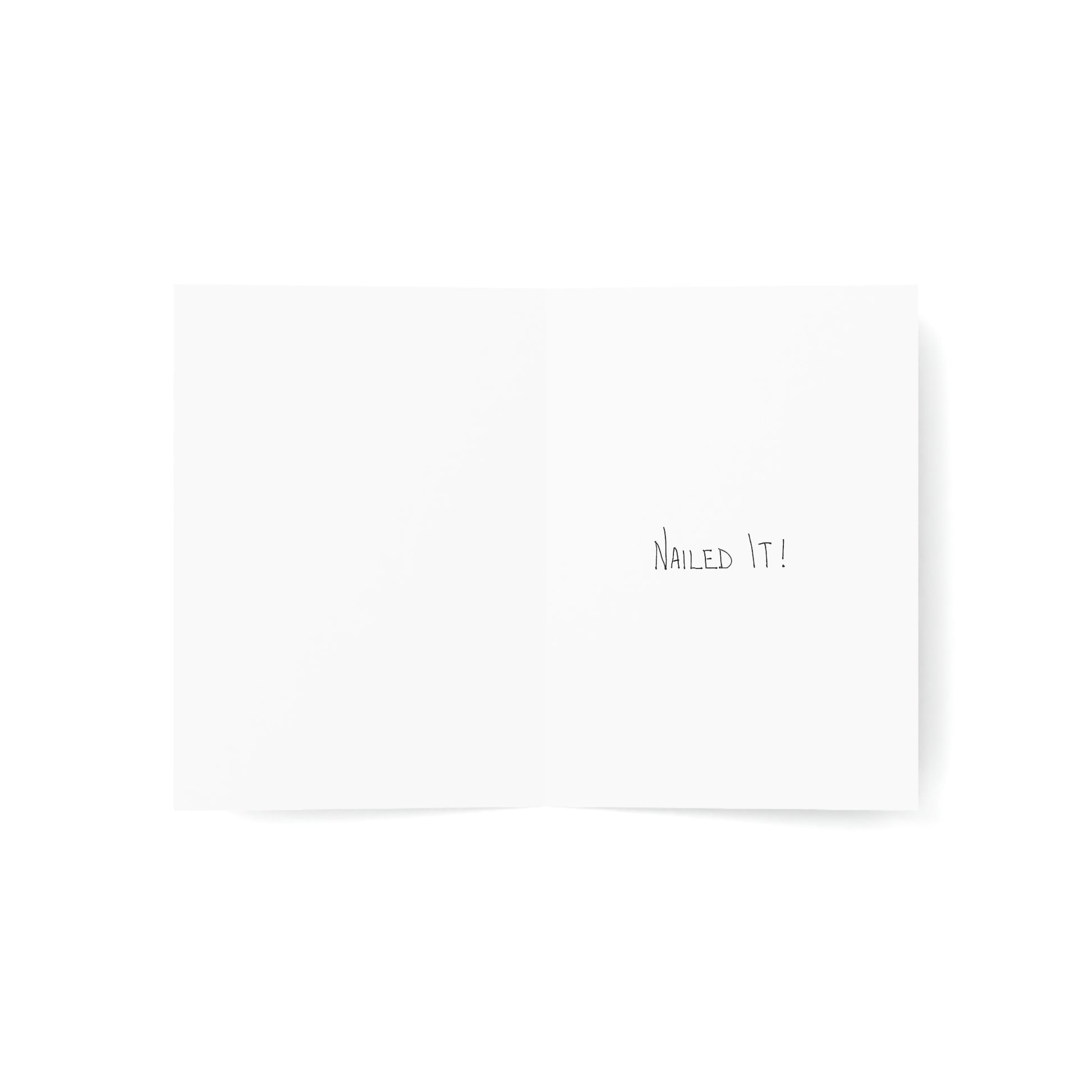 5x7 portrait greeting card – Nailed It! - This card has "it" with a nail embedded into it. Send this card to someone who has done a good job and needs an "attaboy" or "attagirl" - they will appreciate the recognition and kudos. Original drawing is colored pencil on paper, scanned in and placed on the card.