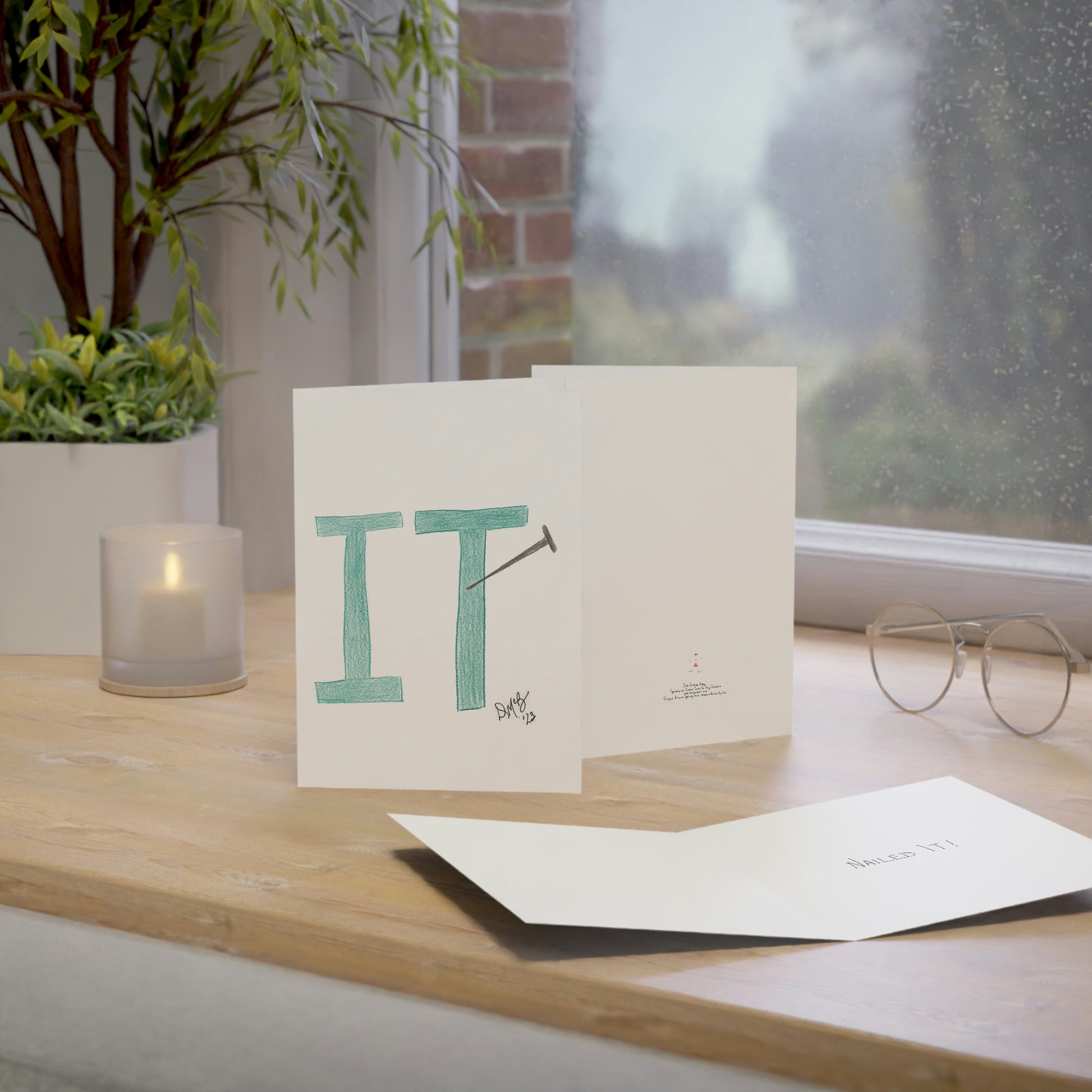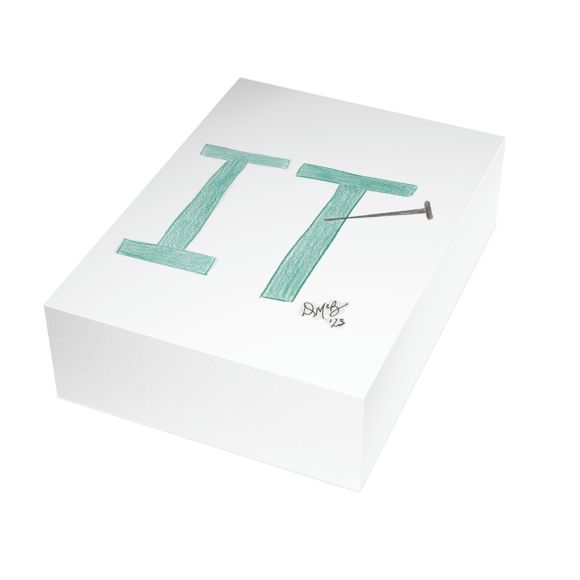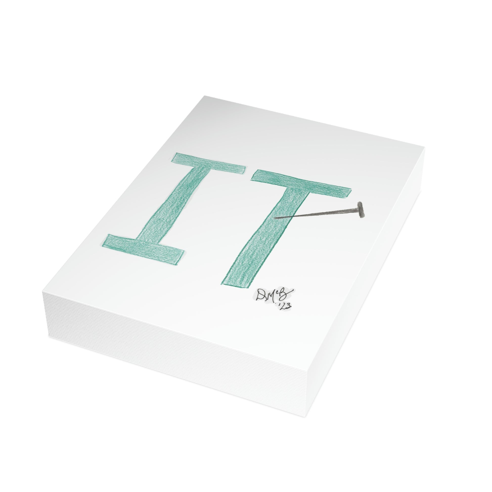 5x7 portrait greeting card – Nailed It! - This card has "it" with a nail embedded into it. Send this card to someone who has done a good job and needs an "attaboy" or "attagirl" - they will appreciate the recognition and kudos. Original drawing is colored pencil on paper, scanned in and placed on the card.