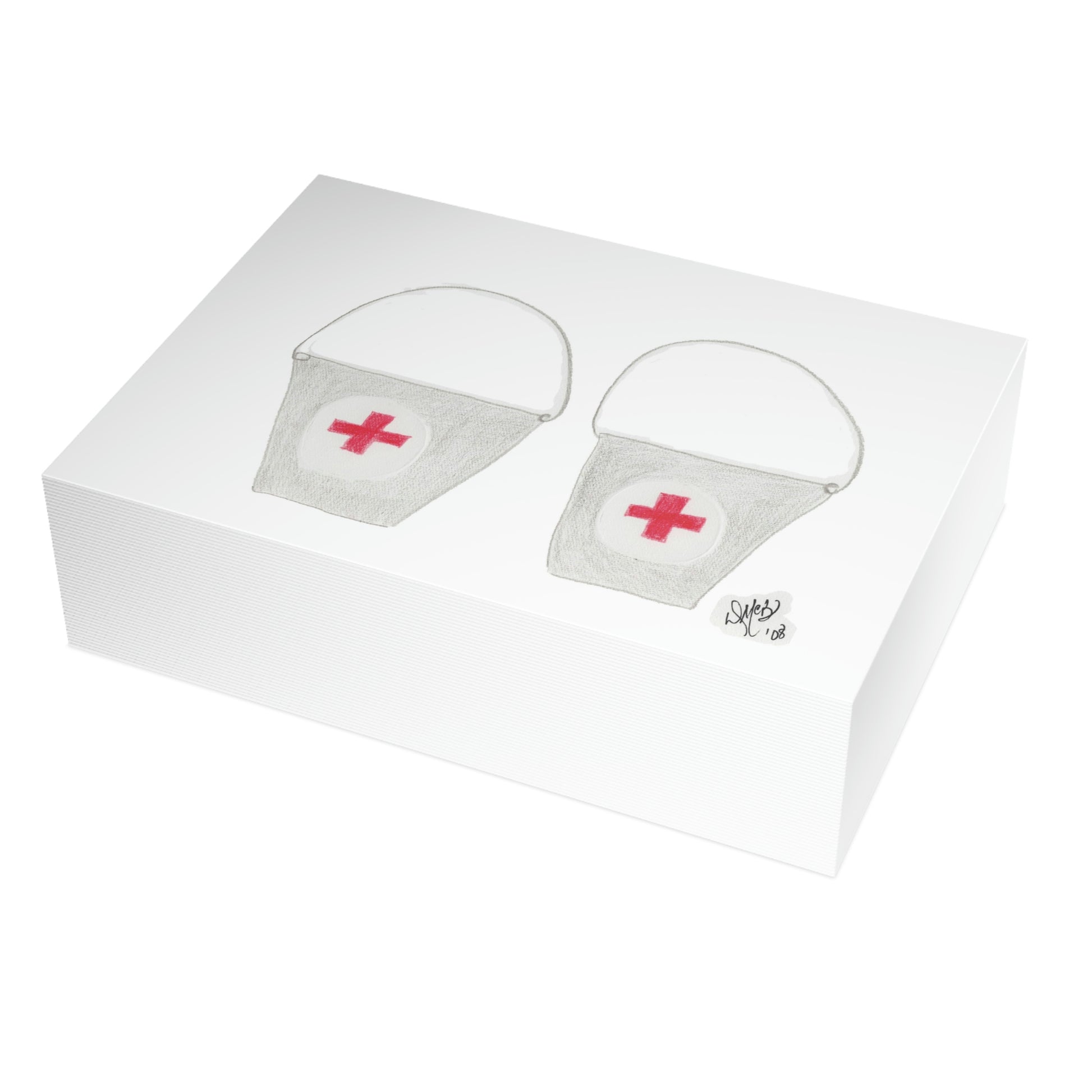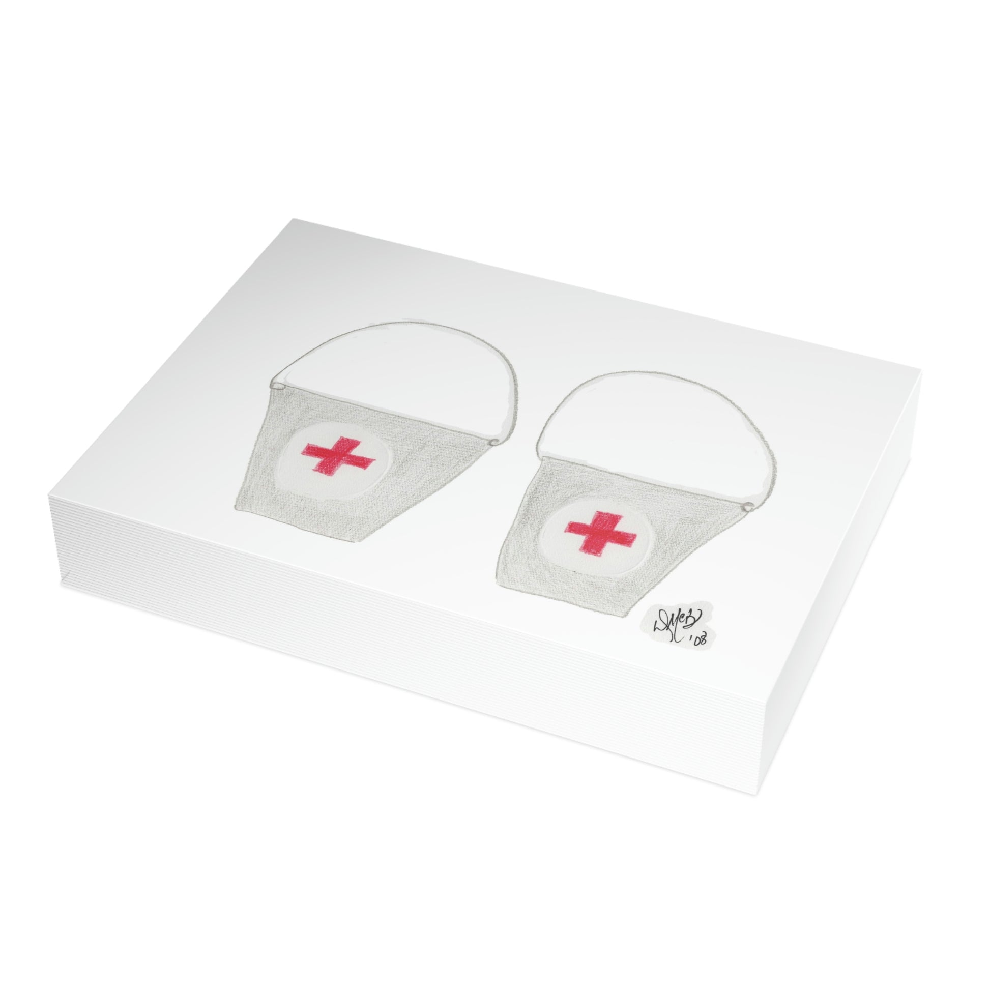 5x7 landscape greeting card - Mercy Buckets - Two buckets with red crosses on them. When I drew this I didn't have a smart phone to check the spelling of merci beaucoup, but then that wouldn't fit with the bucket theme, now would it? In actuality I lifted "Mercy Buckets" from a movie (Better off Dead) - the drawing is all me. Say thanks in a fashionable way - the recipient will think you are multi lingual! Original drawing is colored pencil on paper, scanned in and placed on the card.