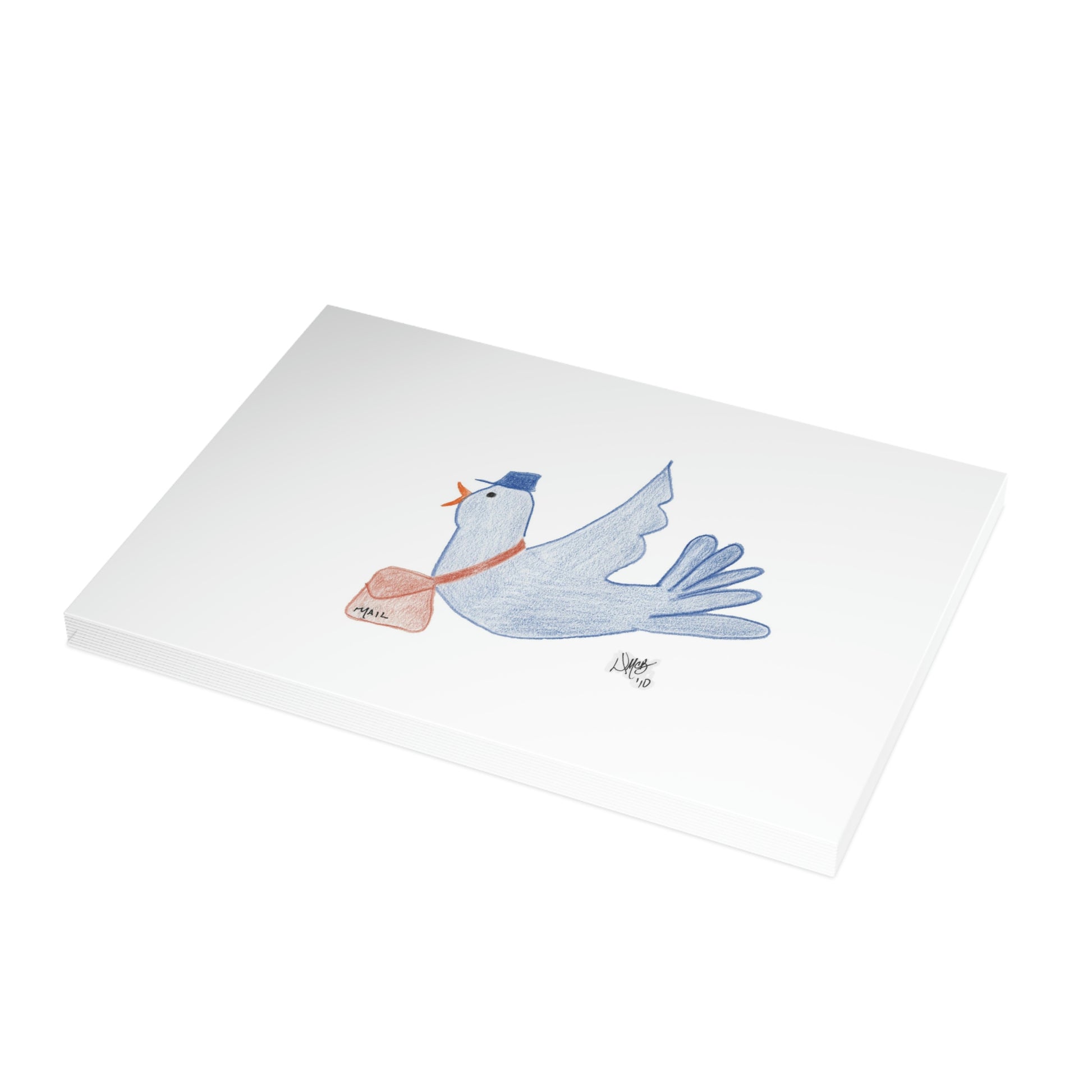 5x7 landscape greeting card – Just Dropping by to Say Hello - Blue bird with mail bag and mail carrier hat flying to deliver a message of cheer. This sweet guy wants to ensure the recipient's day is brightened by a little visit, and who wouldn't welcome the bluebird of happiness? Original drawing is colored pencil on paper, scanned in and placed on the card.