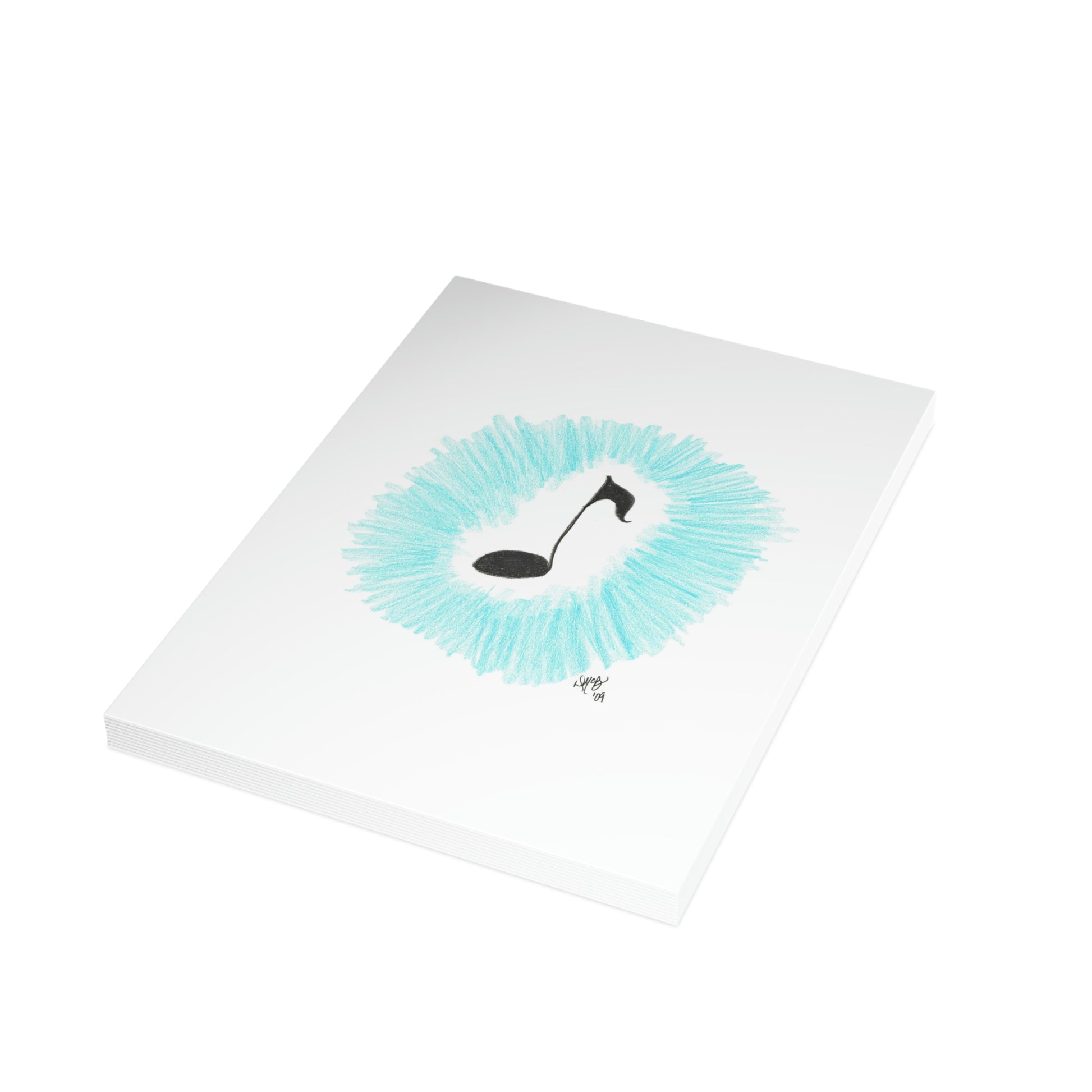 5x7 portrait greeting card – Just a Note Out of the Blue - a music note emerging from a field of blue. This card was a commission that was commissioned along with some other "nice" cards to send to an elderly woman just to say "hello." It's a very simple drawing, with a nice message. Original drawing is colored pencil on paper, scanned in and placed on the card.
